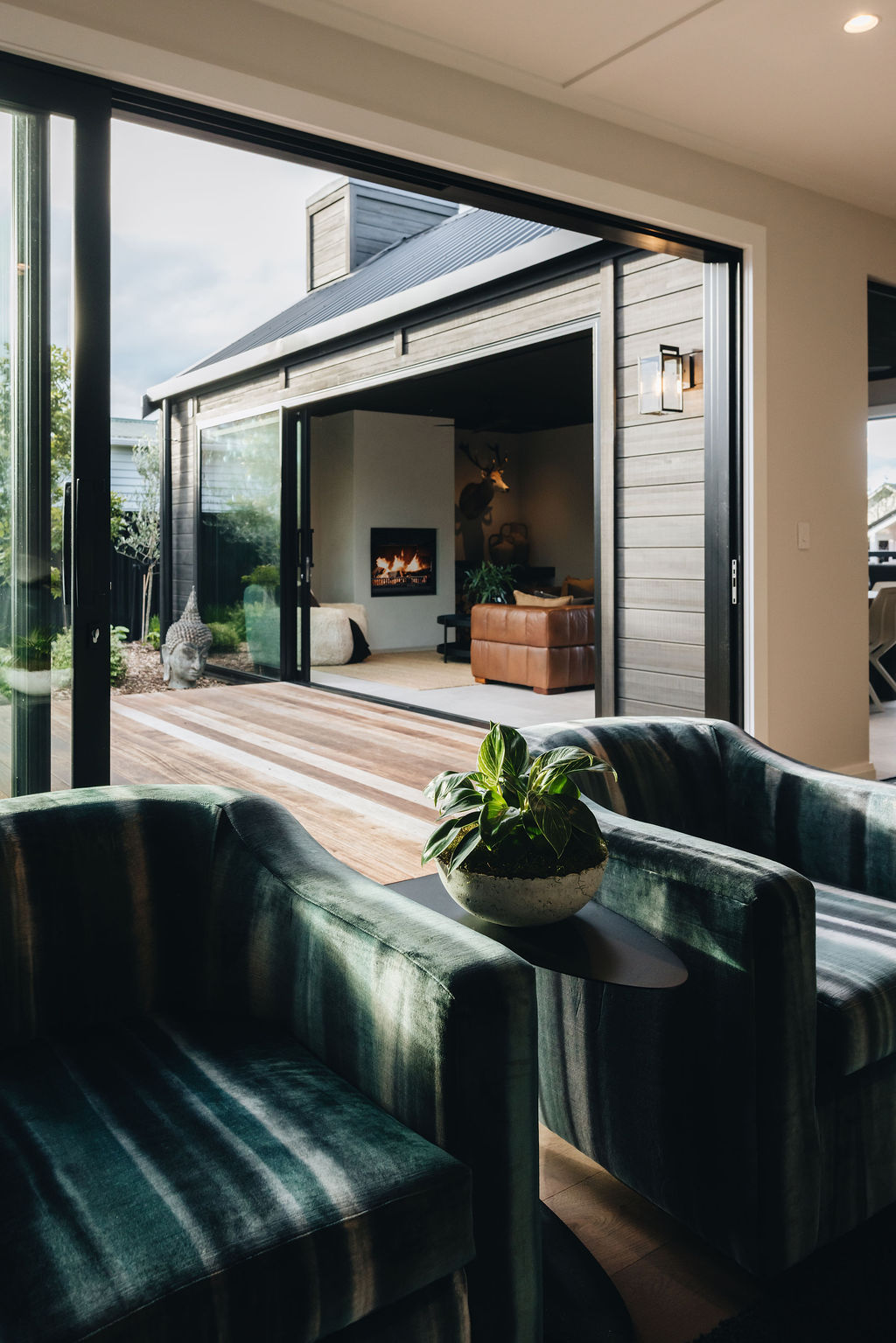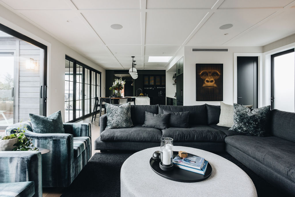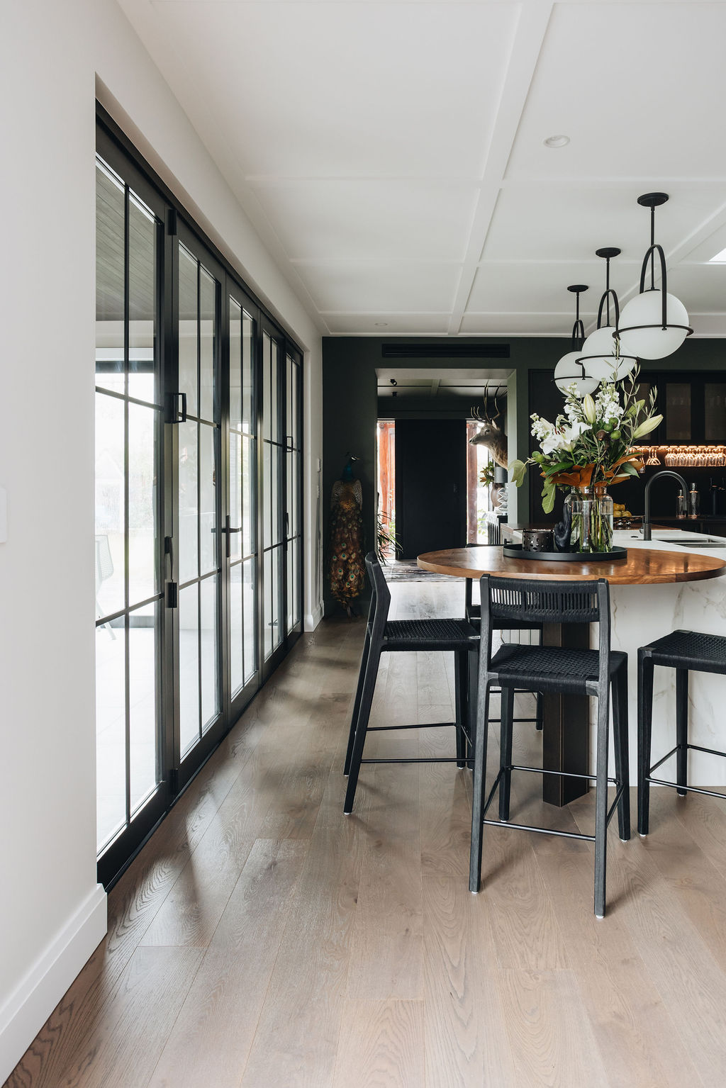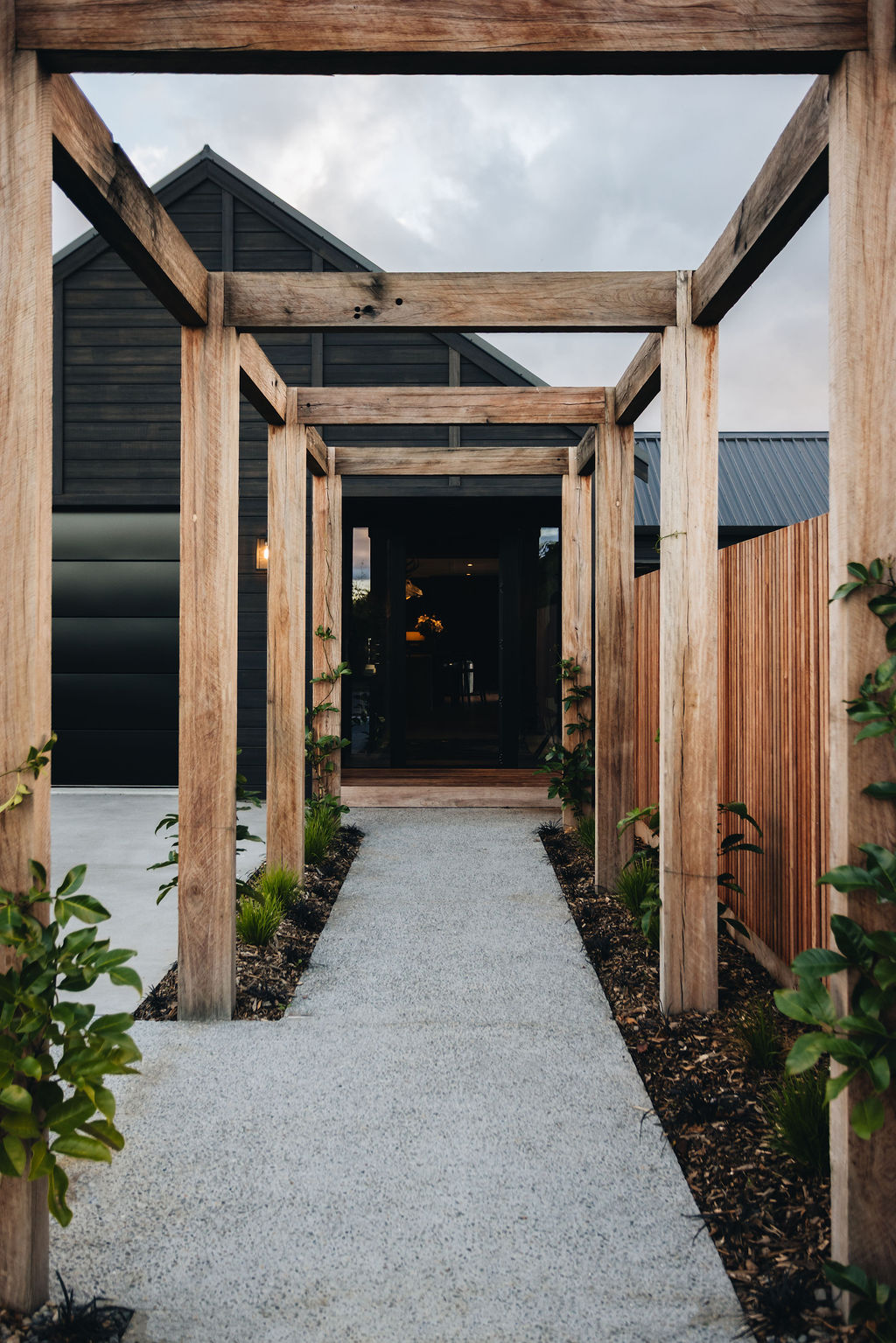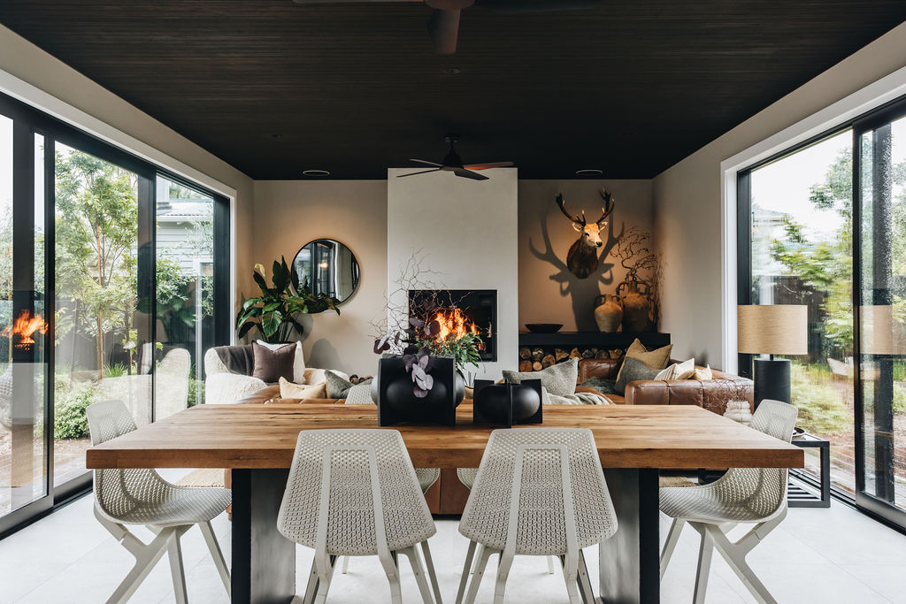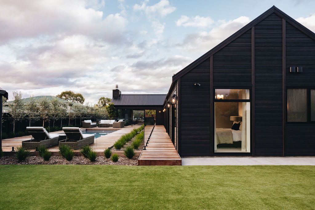 A dark, handsome stranger has arrived in town. The 274sqm three-bedroom home instantly catches the eye with its charcoal shiplap cladding, black roof and joinery, and contrasting hardwood entry pergola. The interior and outdoor living spaces are no less impressive. The house unfolds along the site, with a covered terrace extending at a right angle from the kitchen — each living space is sun-drenched and filled with light. From the moment you enter, there’s a distinct feeling of luxury lodge. It starts in the lobby with a mounted stag head on a sage-coloured feature wall. Turn right and you’re in the terrace room with its dark tongue-and-groove ceiling, fireplace and sliders that open to decking and a lawn on one side and a heated pool on the other.