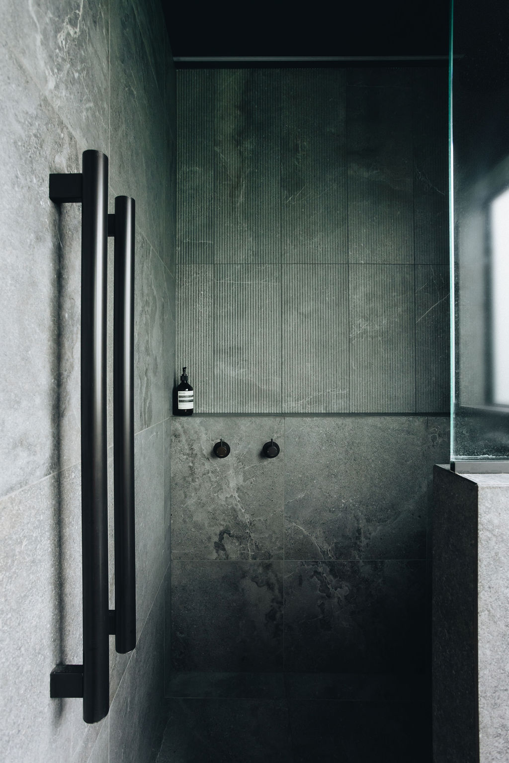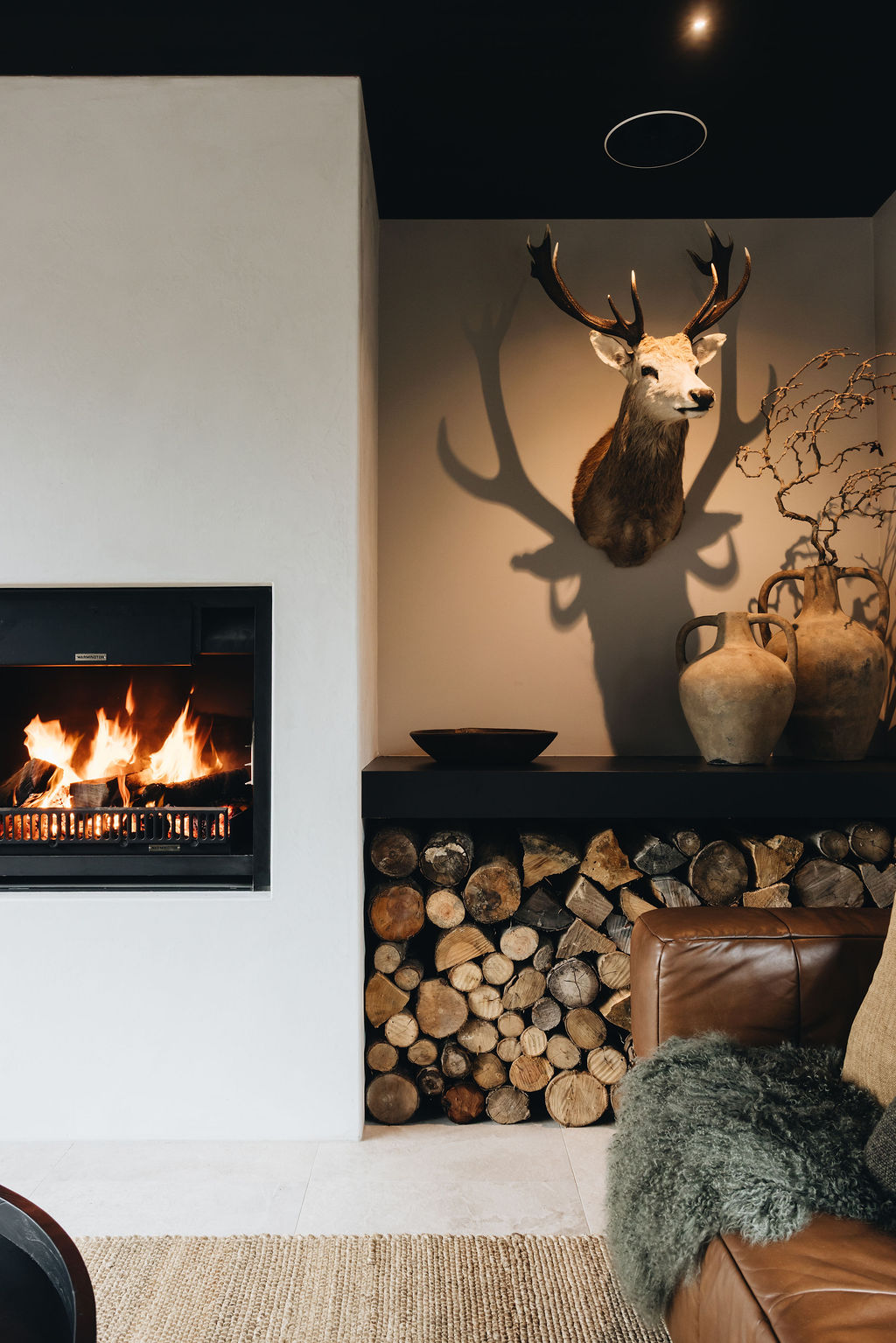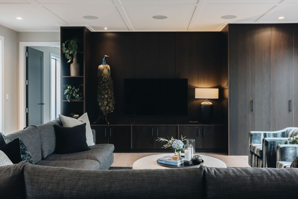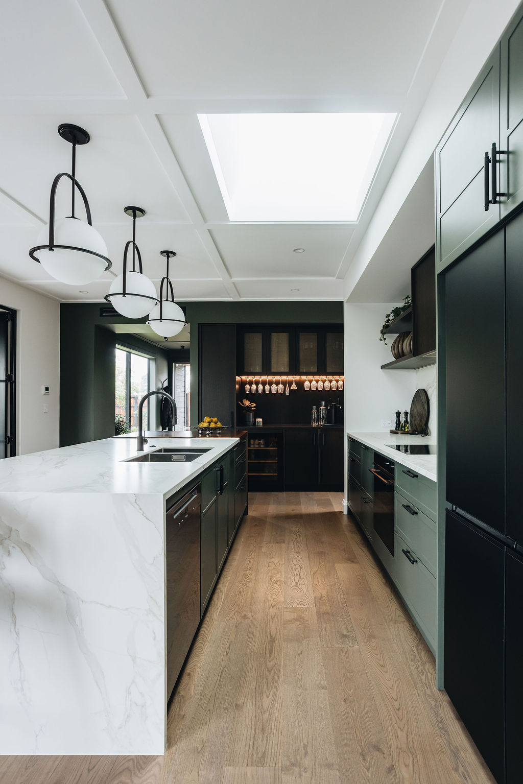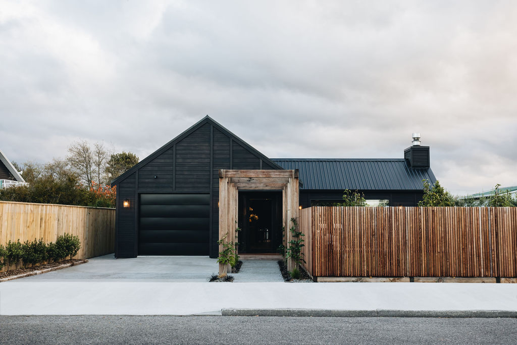 A dark, handsome stranger has arrived in town. The 274sqm three-bedroom home instantly catches the eye with its charcoal shiplap cladding, black roof and joinery, and contrasting hardwood entry pergola. The interior and outdoor living spaces are no less impressive. The house unfolds along the site, with a covered terrace extending at a right angle from the kitchen — each living space is sun-drenched and filled with light. From the moment you enter, there’s a distinct feeling of luxury lodge. It starts in the lobby with a mounted stag head on a sage-coloured feature wall. Turn right and you’re in the terrace room with its dark tongue-and-groove ceiling, fireplace and sliders that open to decking and a lawn on one side and a heated pool on the other.