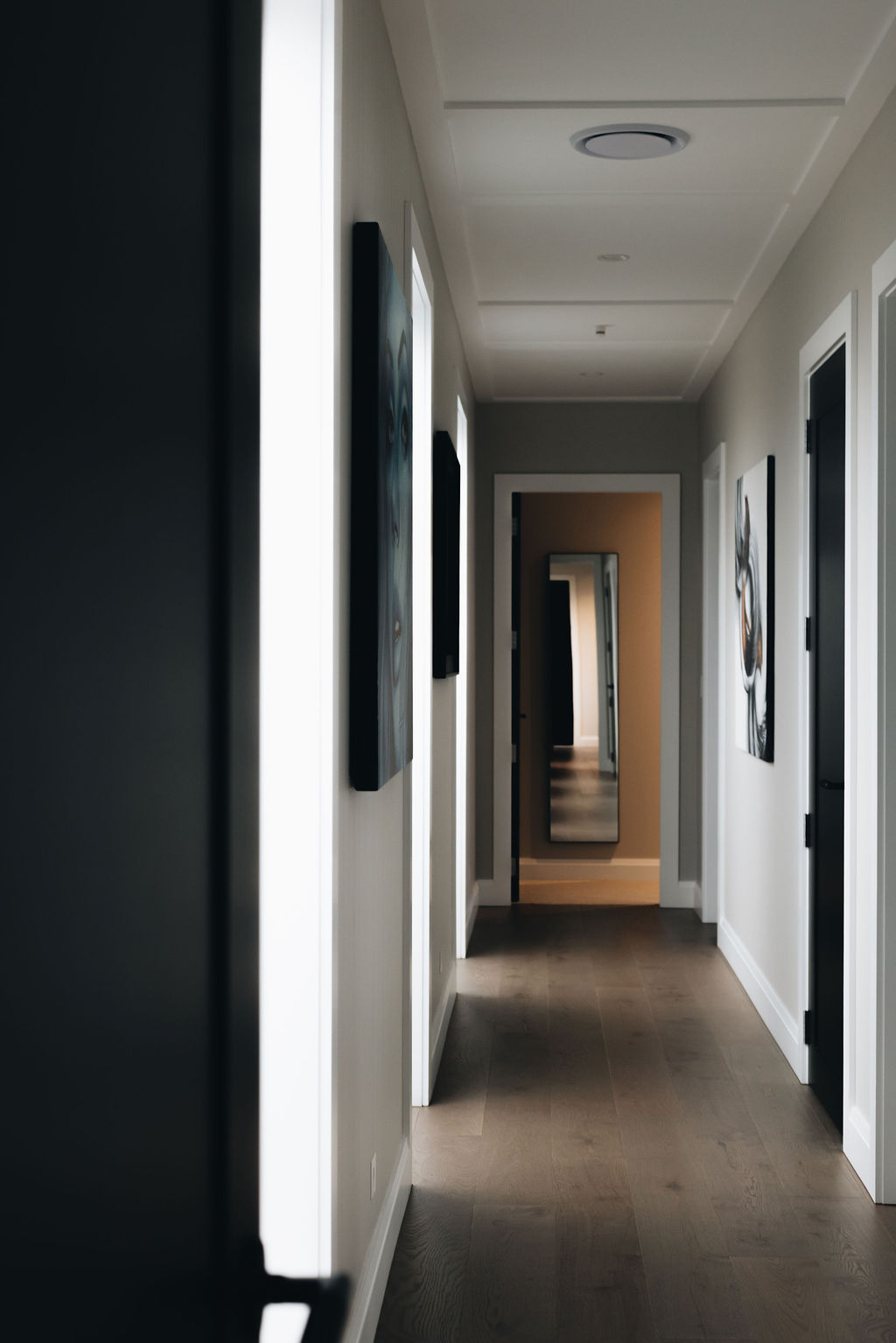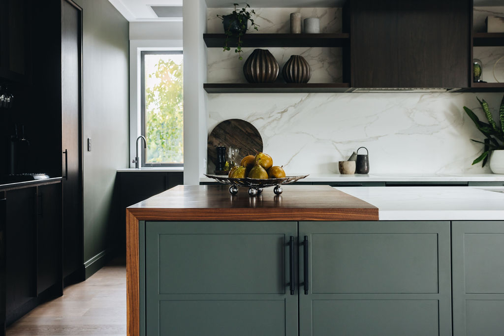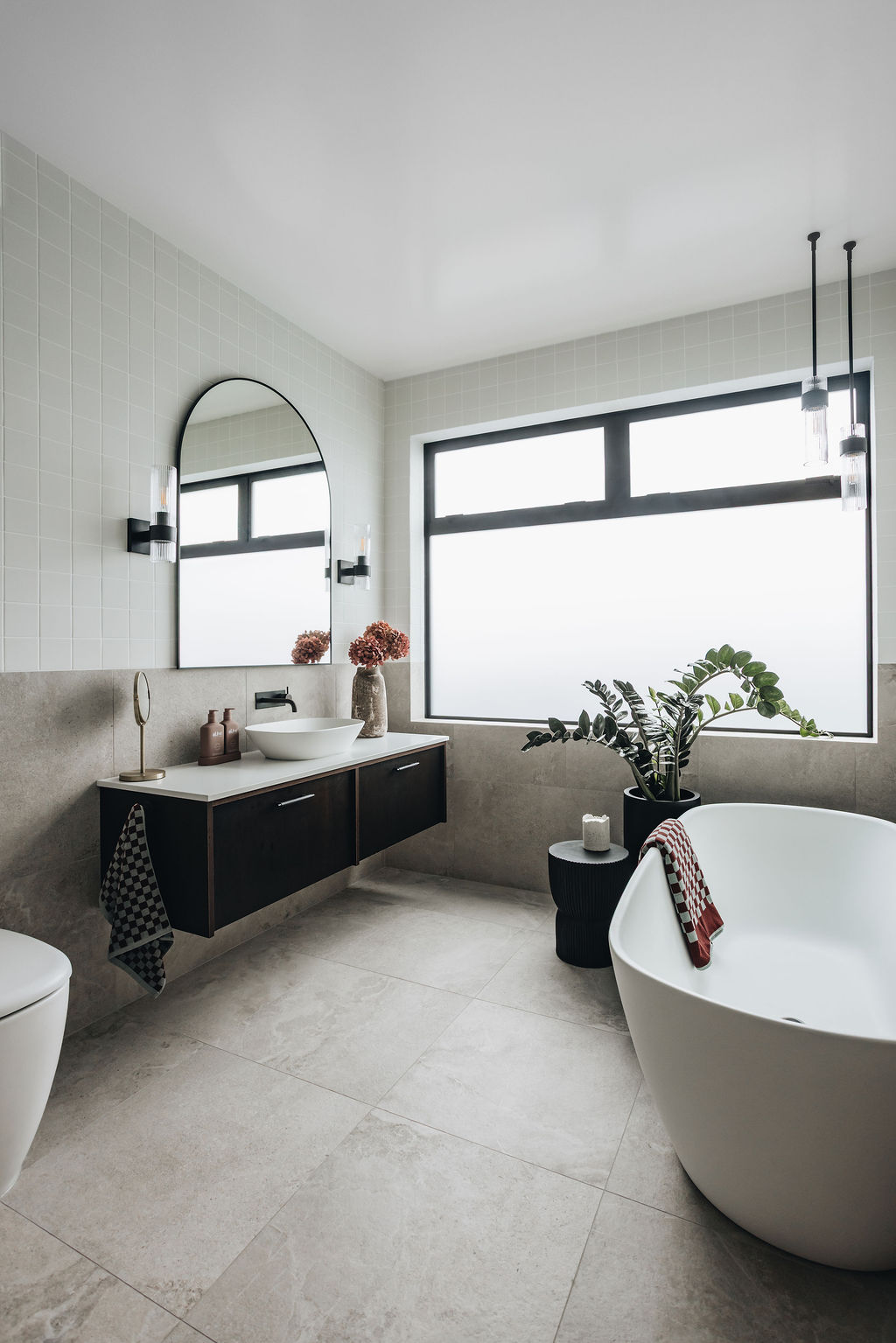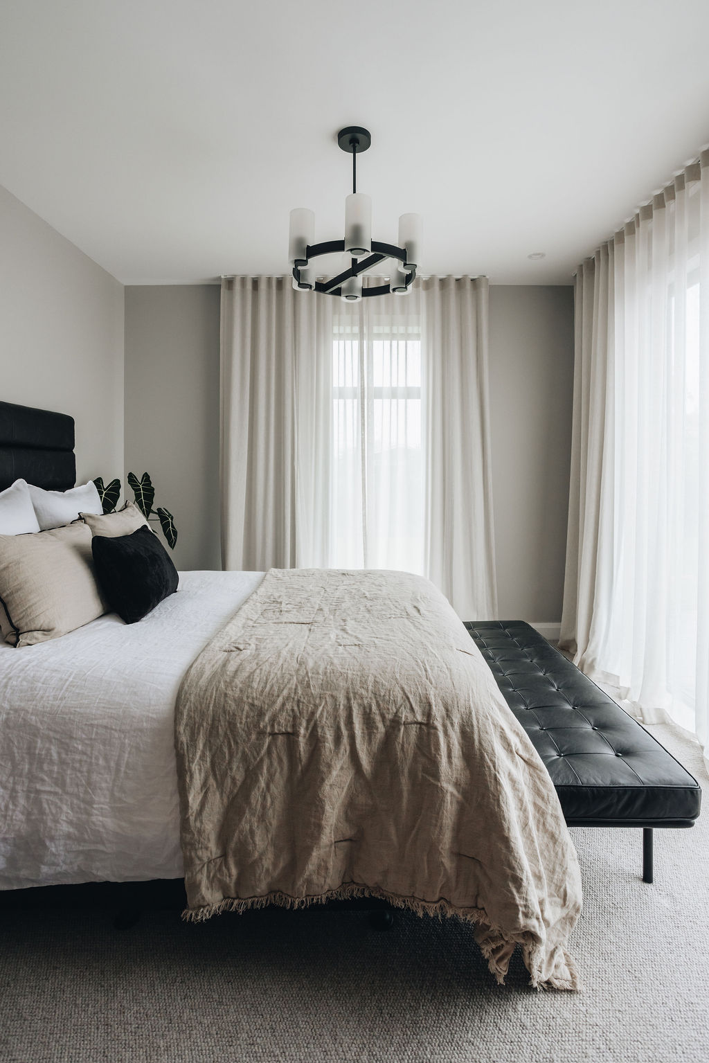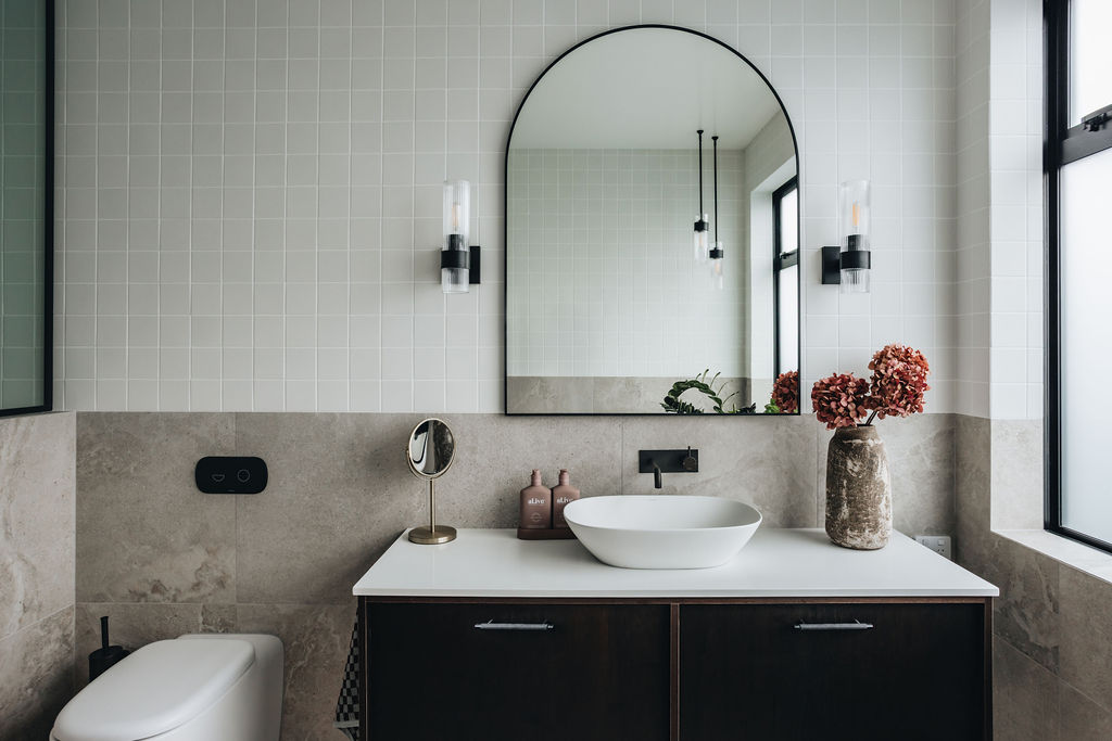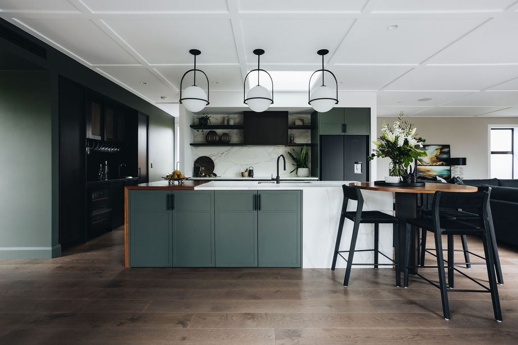 A dark, handsome stranger has arrived in town. The 274sqm three-bedroom home instantly catches the eye with its charcoal shiplap cladding, black roof and joinery, and contrasting hardwood entry pergola. The interior and outdoor living spaces are no less impressive. The house unfolds along the site, with a covered terrace extending at a right angle from the kitchen — each living space is sun-drenched and filled with light. From the moment you enter, there’s a distinct feeling of luxury lodge. It starts in the lobby with a mounted stag head on a sage-coloured feature wall. Turn right and you’re in the terrace room with its dark tongue-and-groove ceiling, fireplace and sliders that open to decking and a lawn on one side and a heated pool on the other.