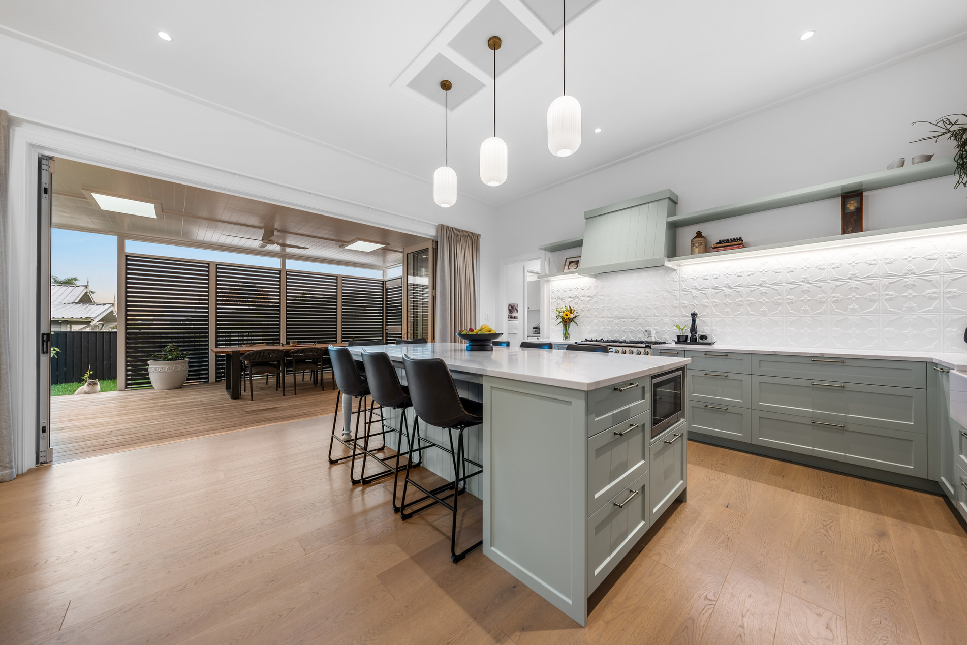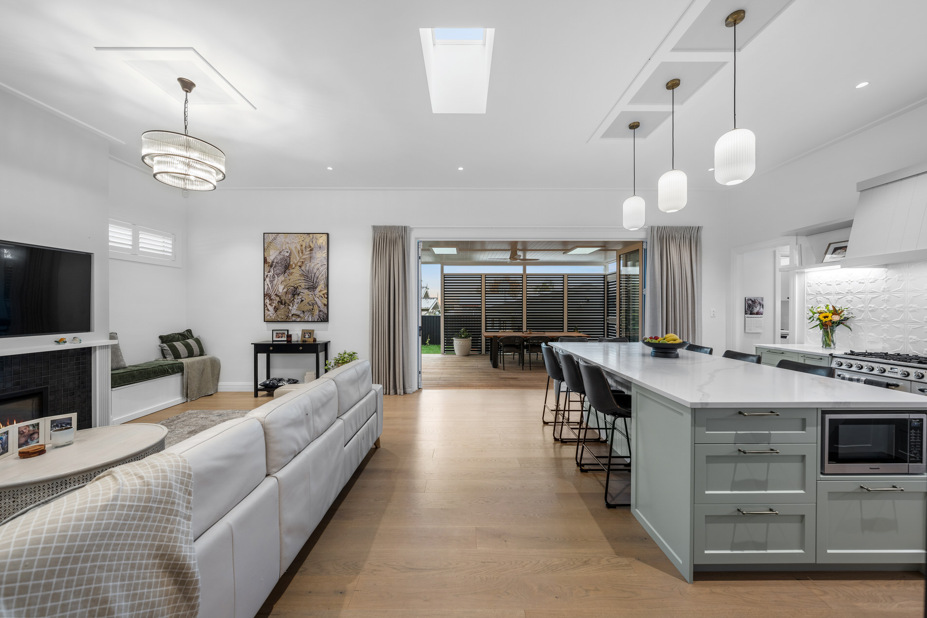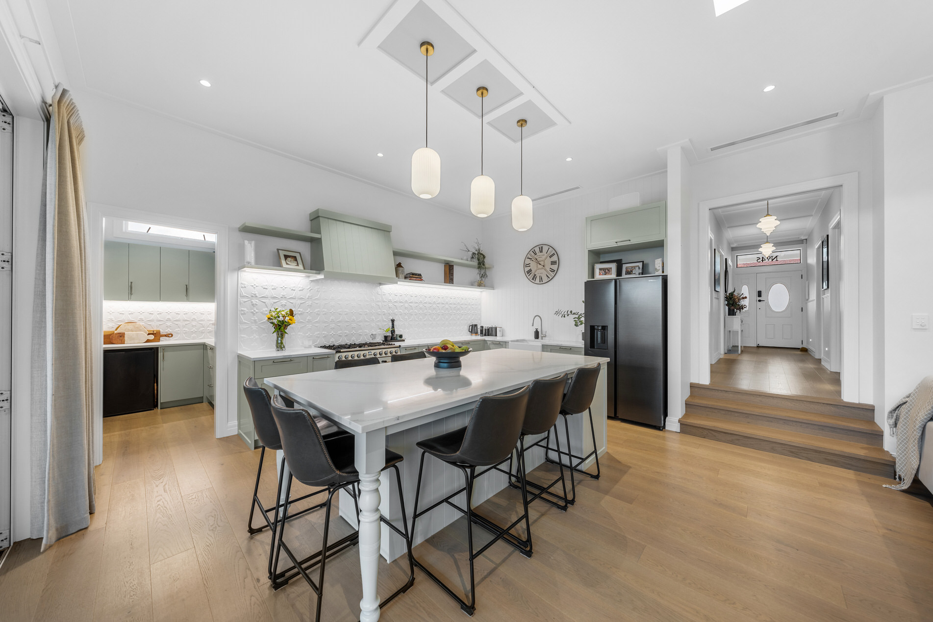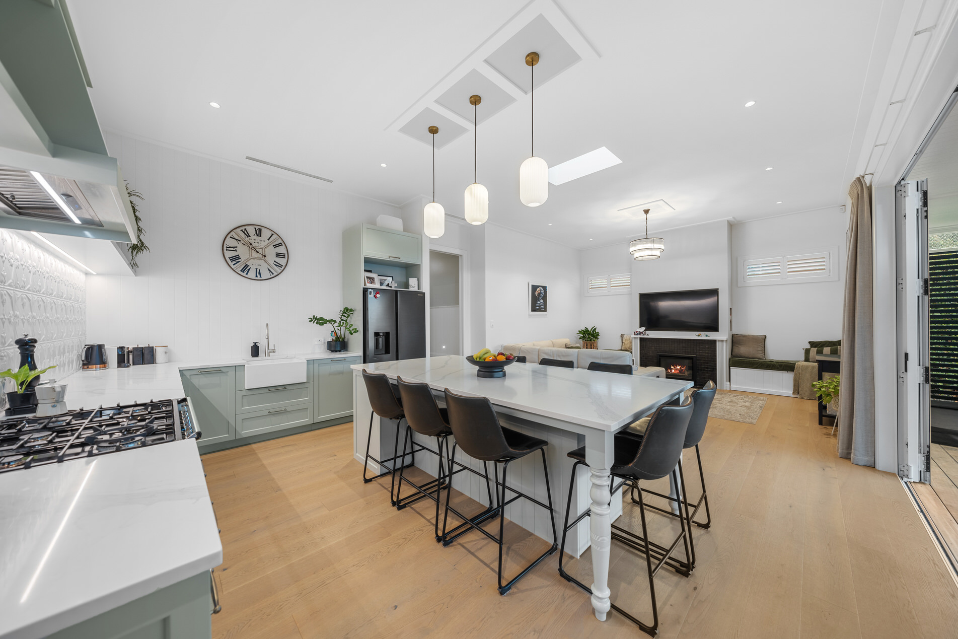 Over the years, this bungalow had been stripped of any character features or charm. Now, it has been transformed and restored into a warm, functional family home. A full renovation and thoughtful addition has reimagined both the layout and the flow of daily life. Through the front door, the home offers calm, neutral tones, complemented by grooved panelling and battened ceilings that preserve classic bungalow charm. Off the hallway is a family bathroom and a separate powder room — an ideal feature for a busy household with three children. The main bedroom suite offers a private retreat, complete with a walk-through robe and ensuite. A large cavity slider signals the transition into the new extension, which continues the ceiling height from the front of the house to create a seamless sense of space and light.
