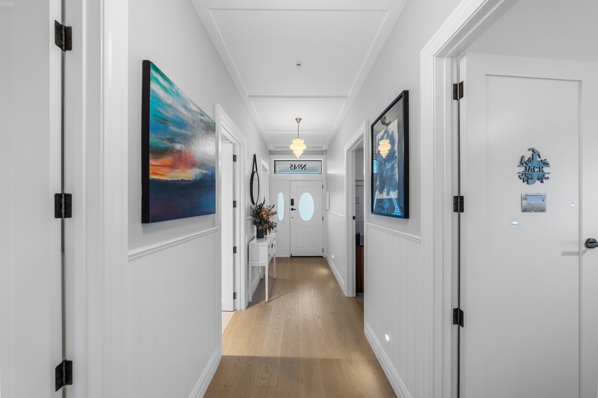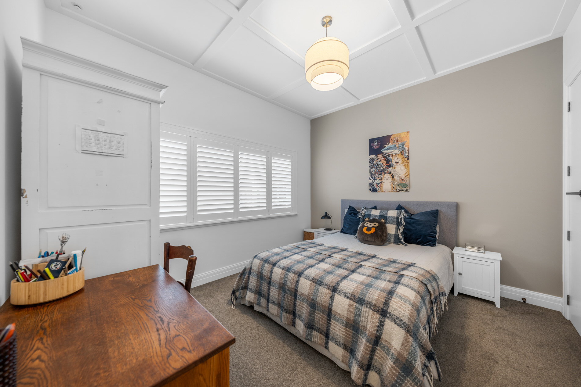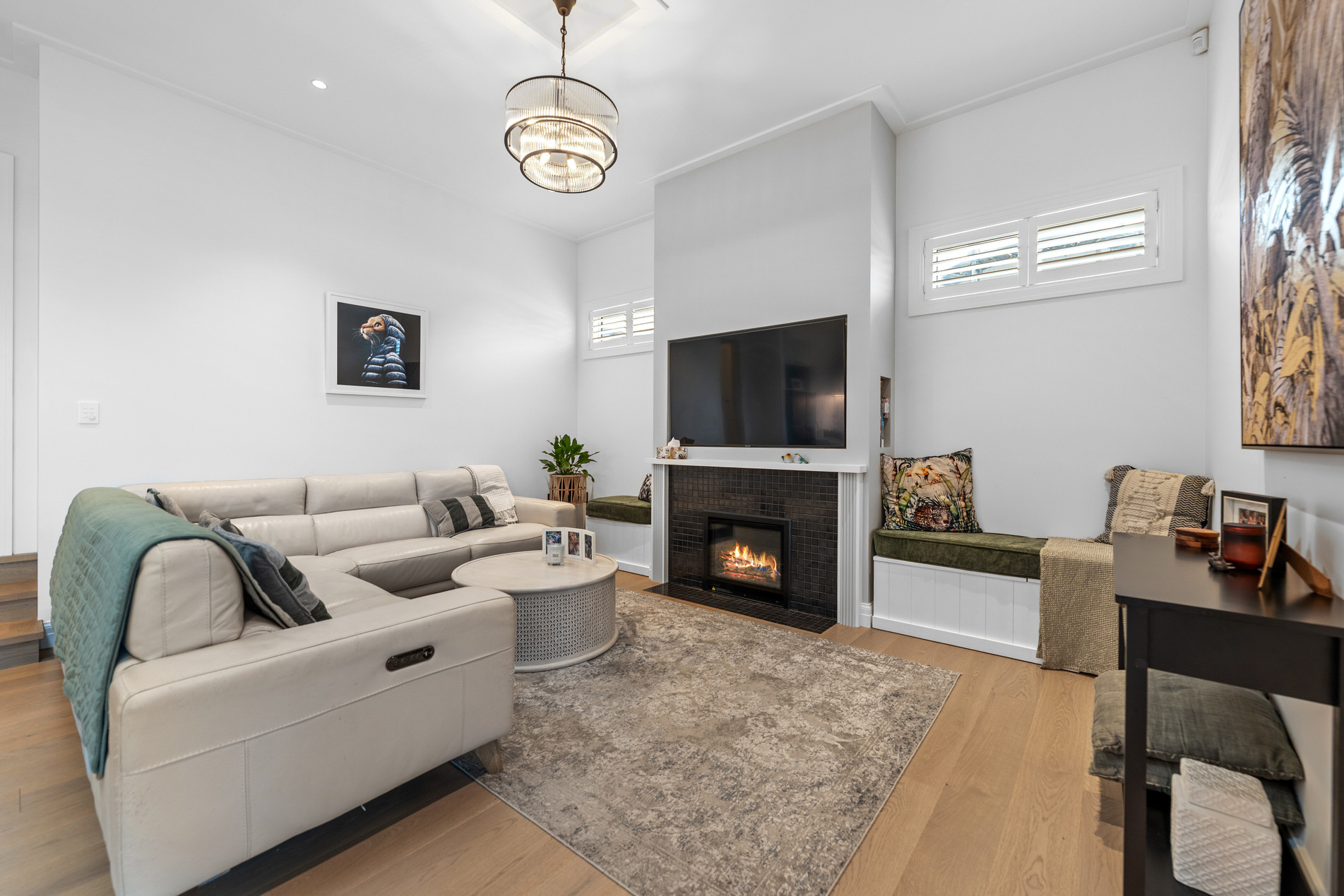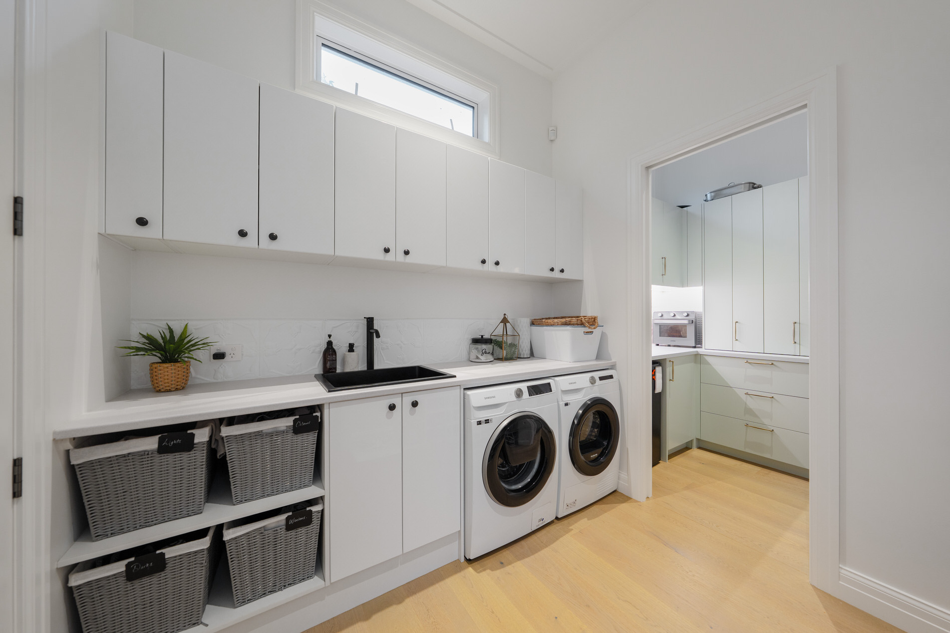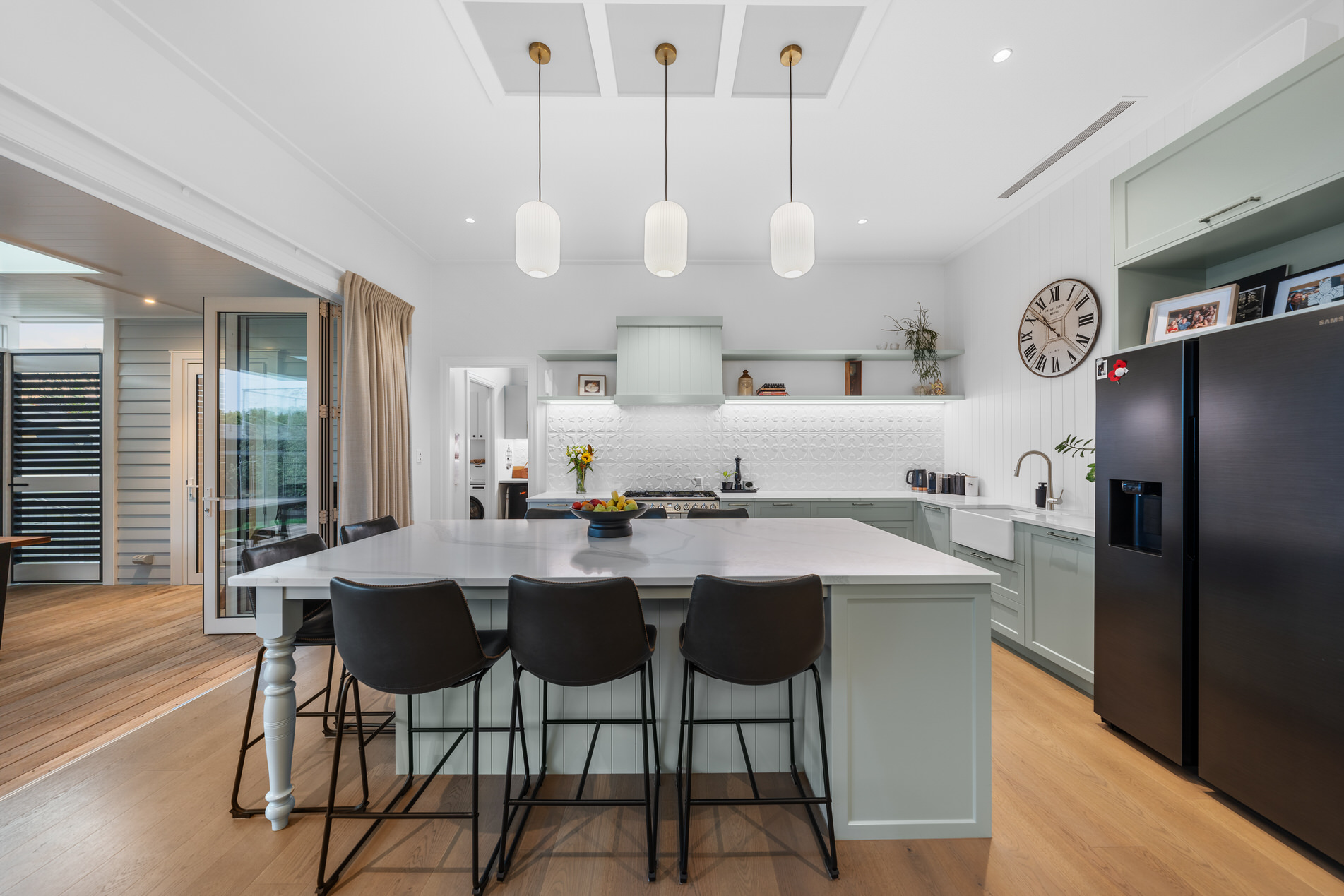 Over the years, this bungalow had been stripped of any character features or charm. Now, it has been transformed and restored into a warm, functional family home. A full renovation and thoughtful addition has reimagined both the layout and the flow of daily life. Through the front door, the home offers calm, neutral tones, complemented by grooved panelling and battened ceilings that preserve classic bungalow charm. Off the hallway is a family bathroom and a separate powder room — an ideal feature for a busy household with three children. The main bedroom suite offers a private retreat, complete with a walk-through robe and ensuite. A large cavity slider signals the transition into the new extension, which continues the ceiling height from the front of the house to create a seamless sense of space and light.