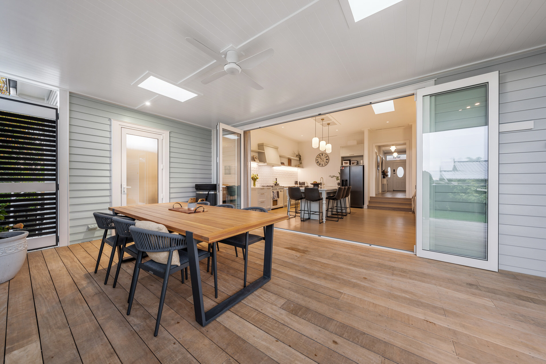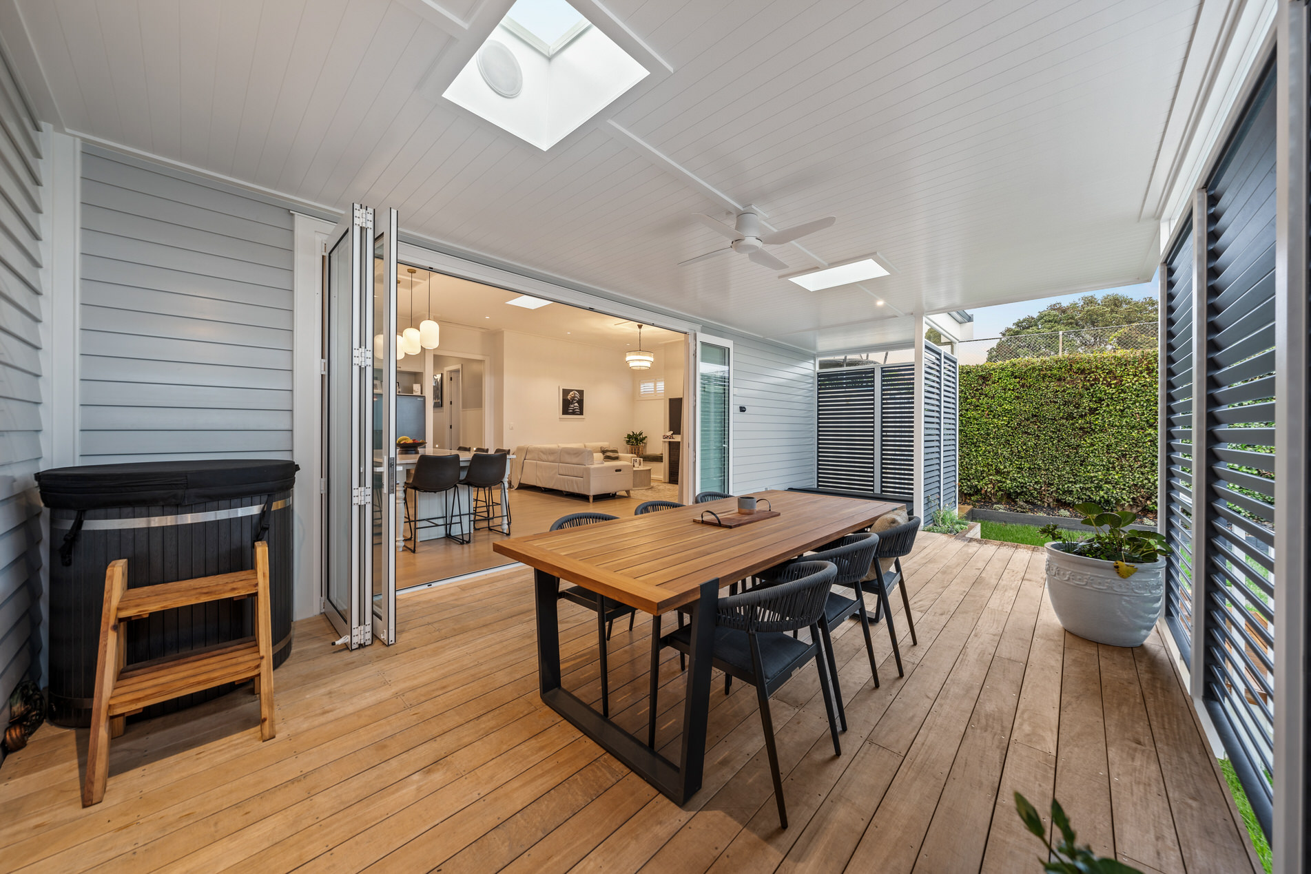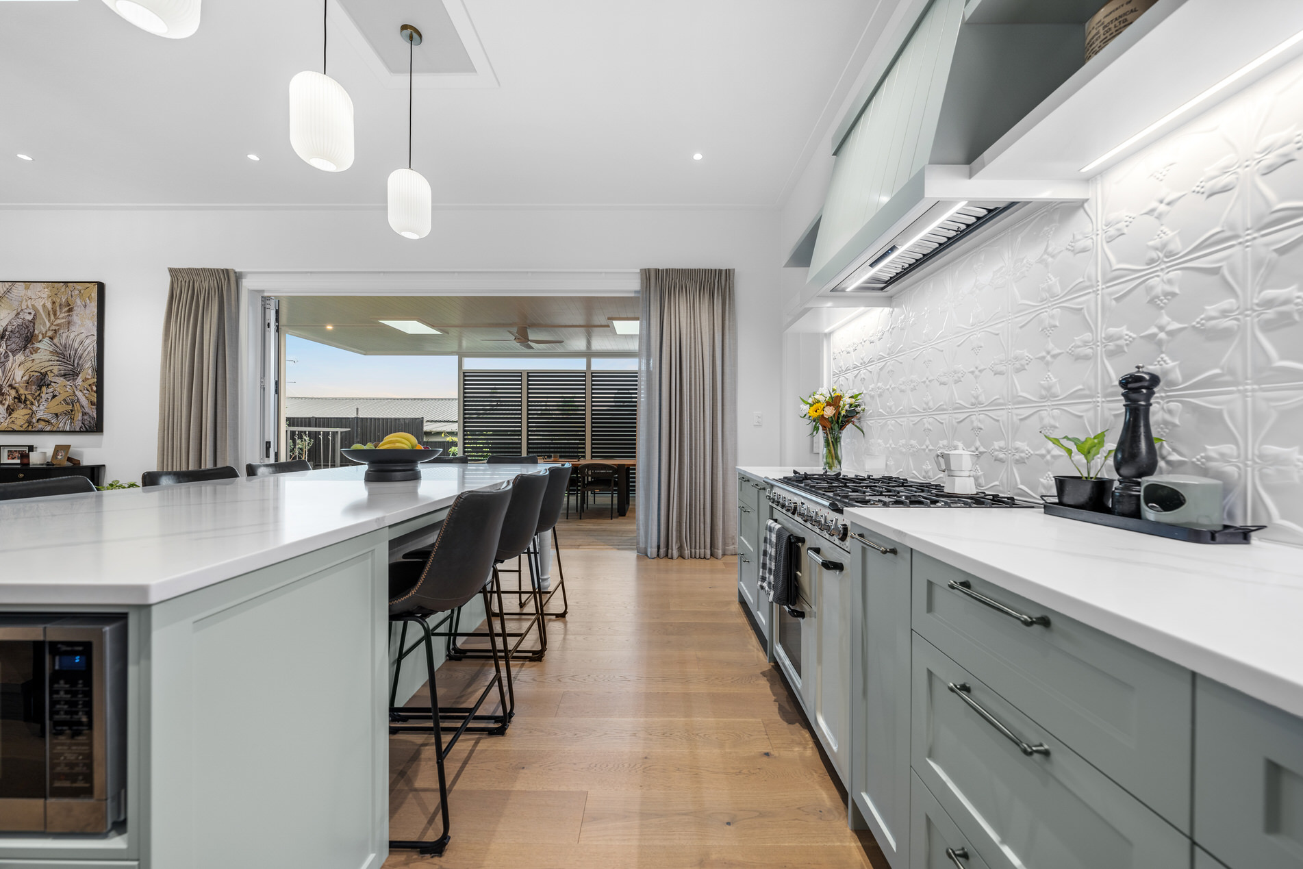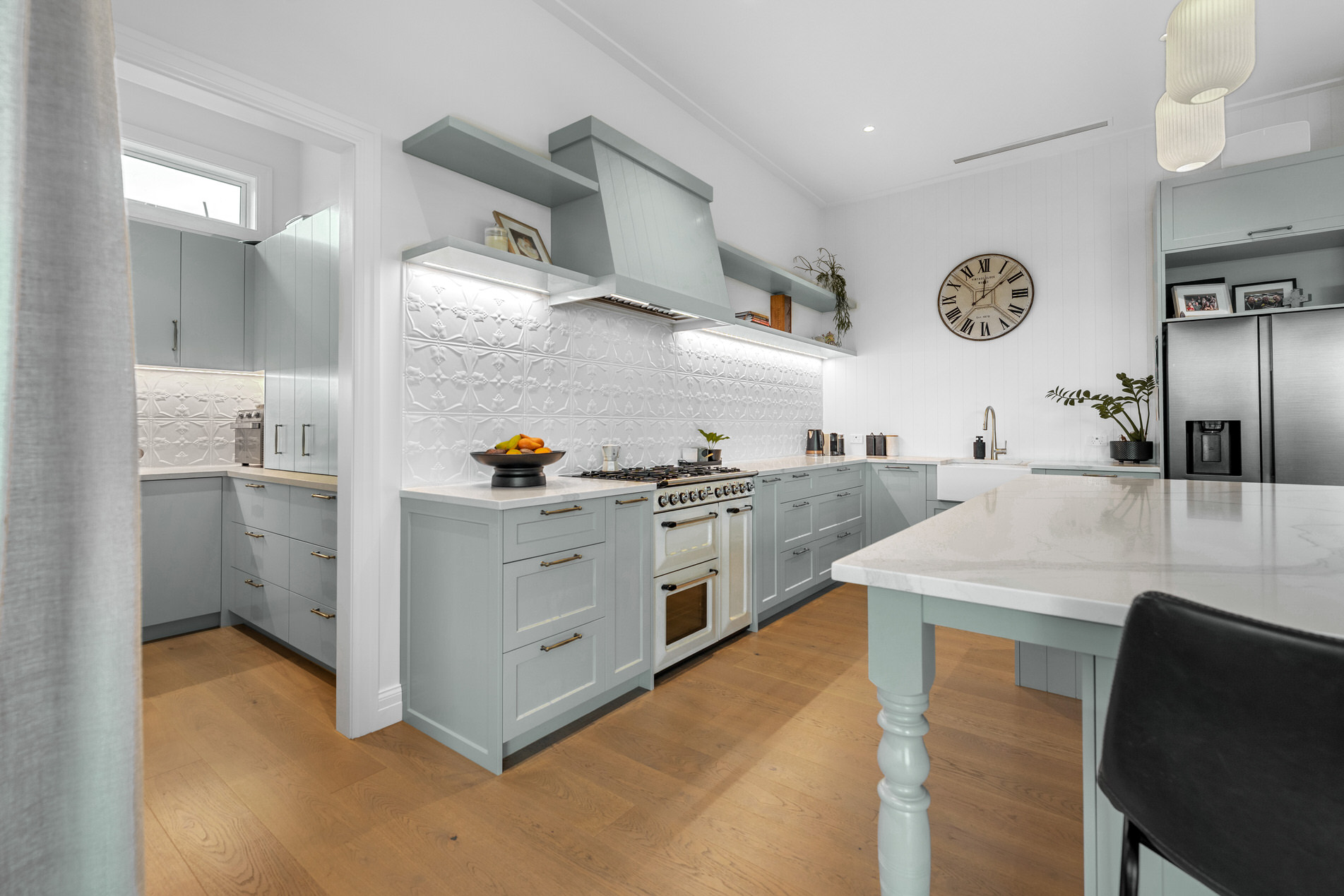 A generous-sized kitchen takes the main role here with cabinetry painted in a soft blue, a striking 2.6-metre central island that doubles as a table to gather around, plus a butler’s pantry and laundry both off to the side. Keeping everyone connected in this open-plan space is the generous living area with couches focussed on the TV and fireplace. Skylights and bifold doors connect the area to the covered deck and second dining area, forming a true all-season entertaining zone. The overall result? A charming four-bedroom family home that really works — it’s practical, liveable and full of personality.