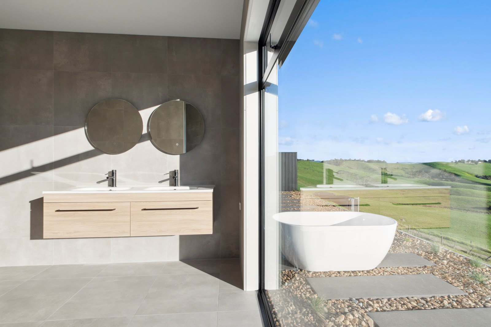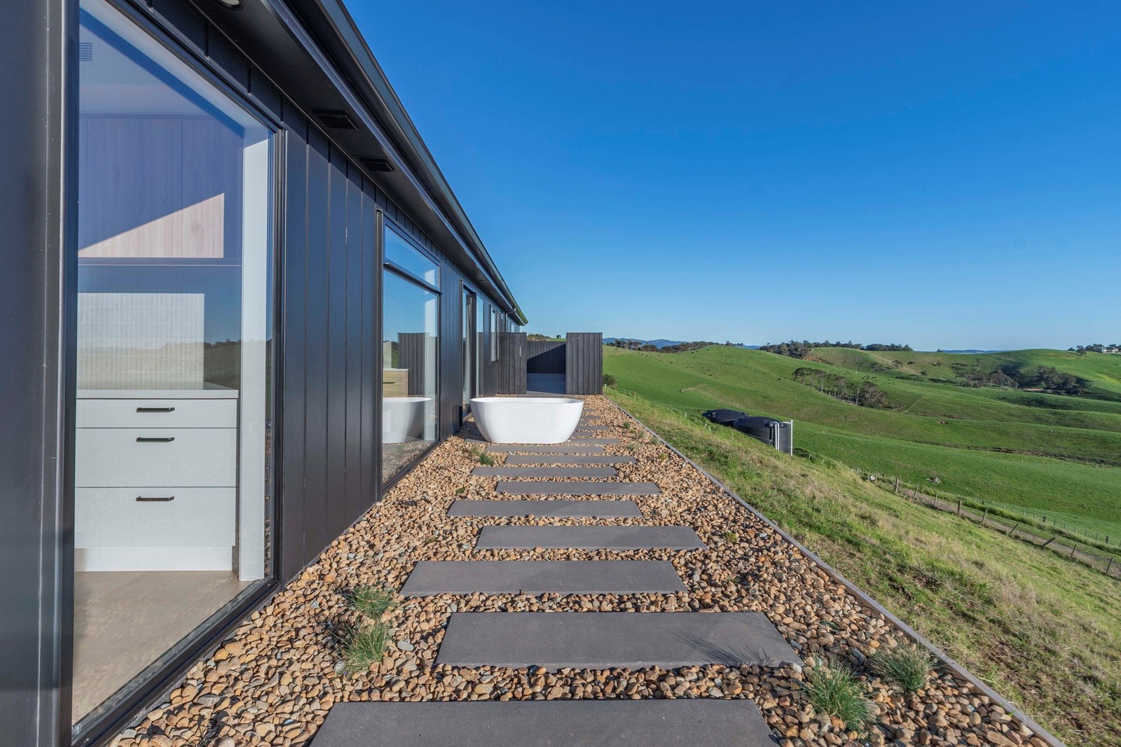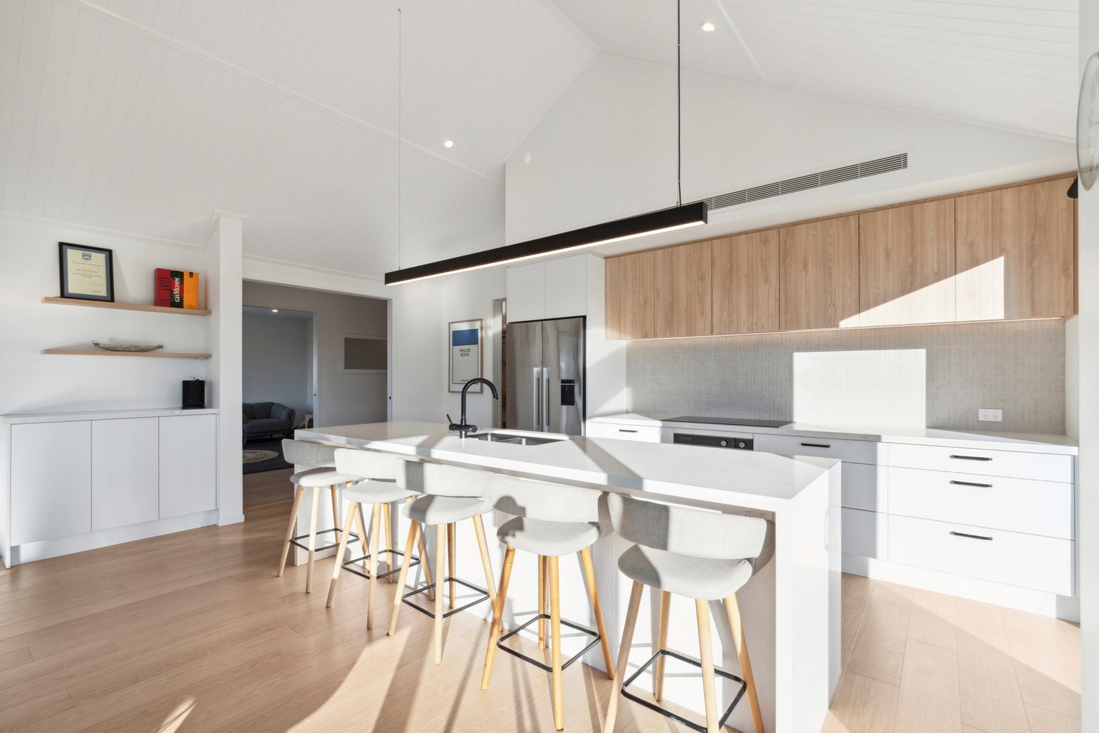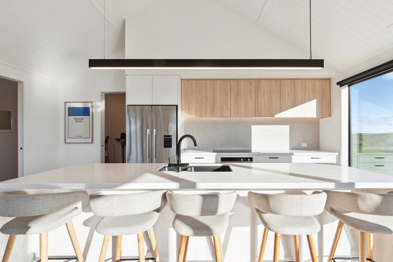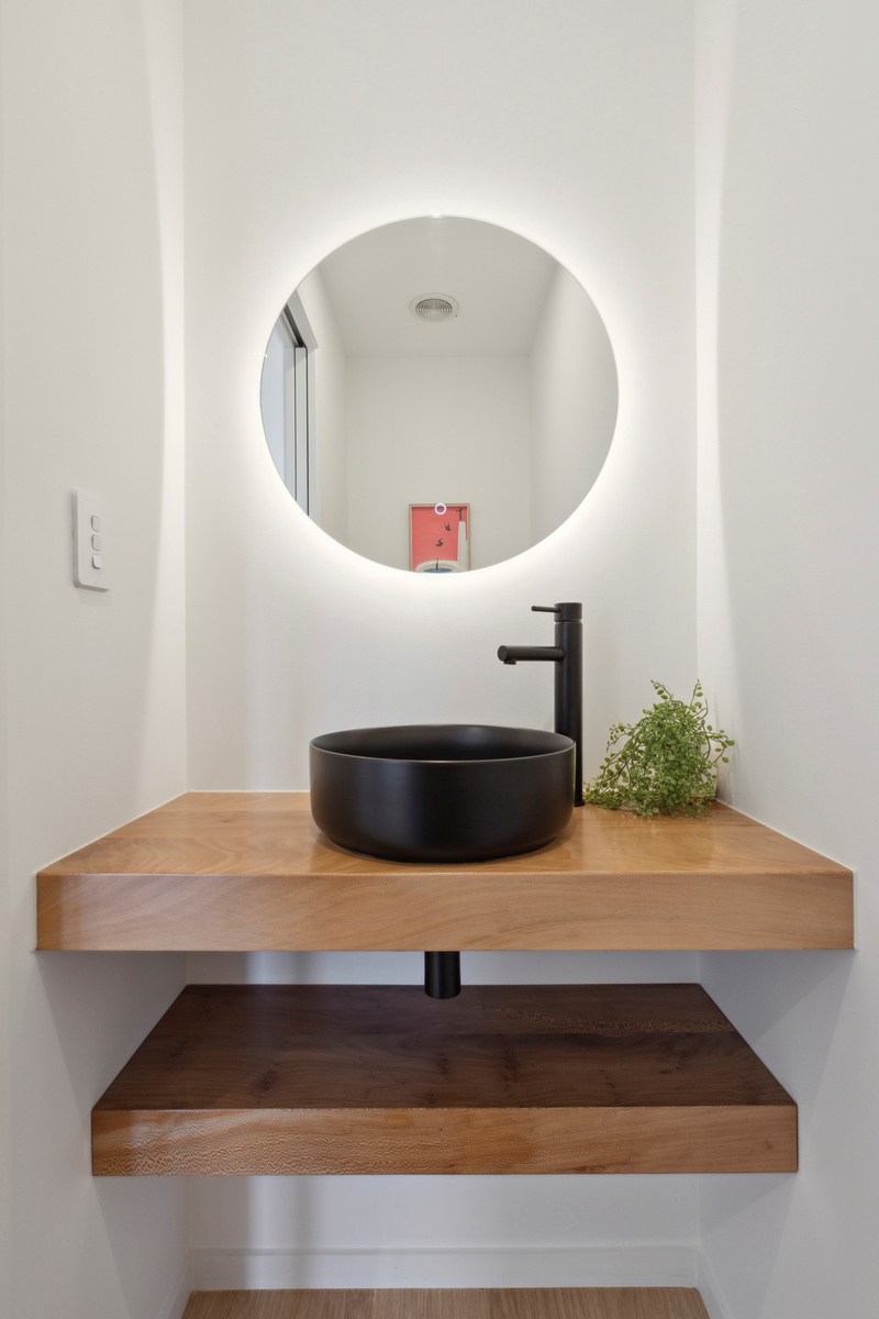Timber cabinetry and tiled splashbacks add warmth and practicality, echoed in the adjacent laundry and bathrooms. A moody powder room contrasts beautifully with the otherwise light palette. Sliding doors open onto a covered alfresco area, offering a seamless transition between house and landscape. Outdoors, thoughtful landscaping includes a children’s play area and wide timber decking that allows room to relax and roam. With its warm material palette, practical layout and crisp execution, this home demonstrates how rural builds can feel both grounded and refined — made for modern living but rooted in place.
