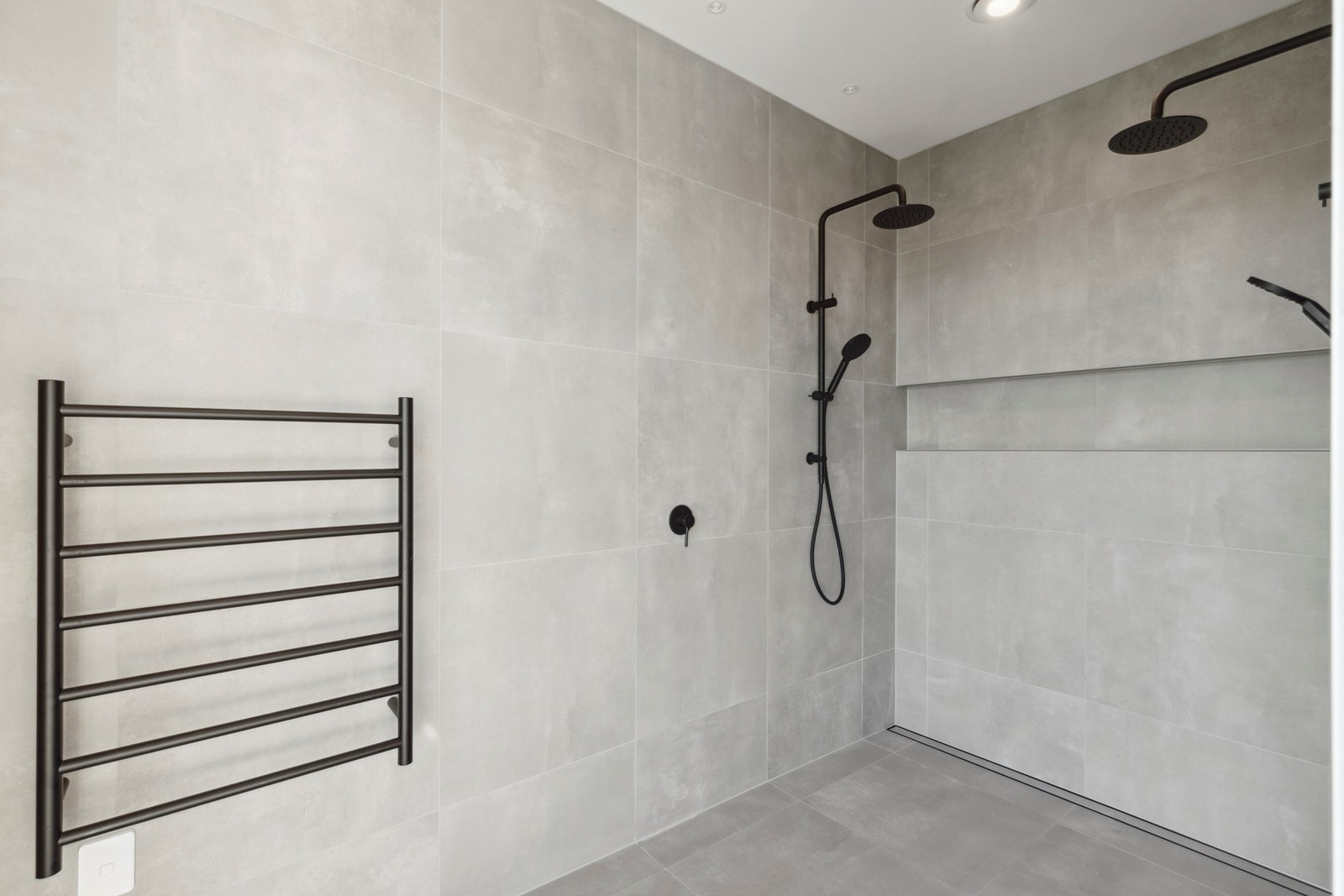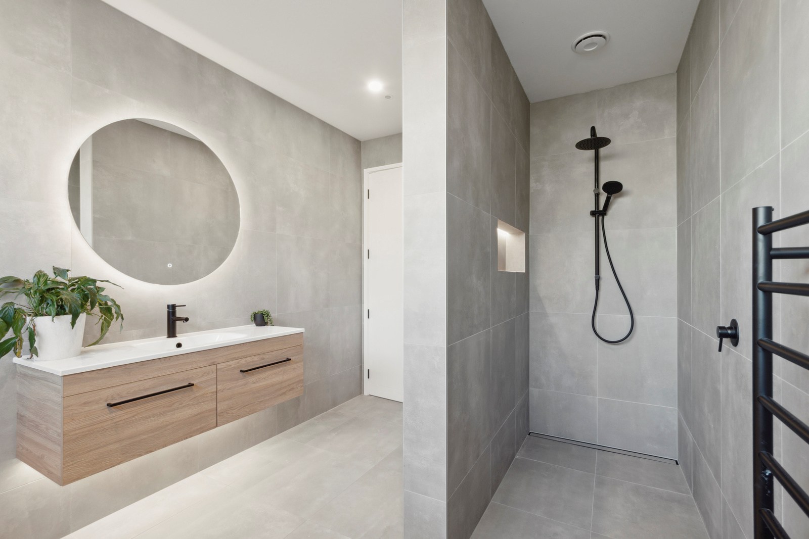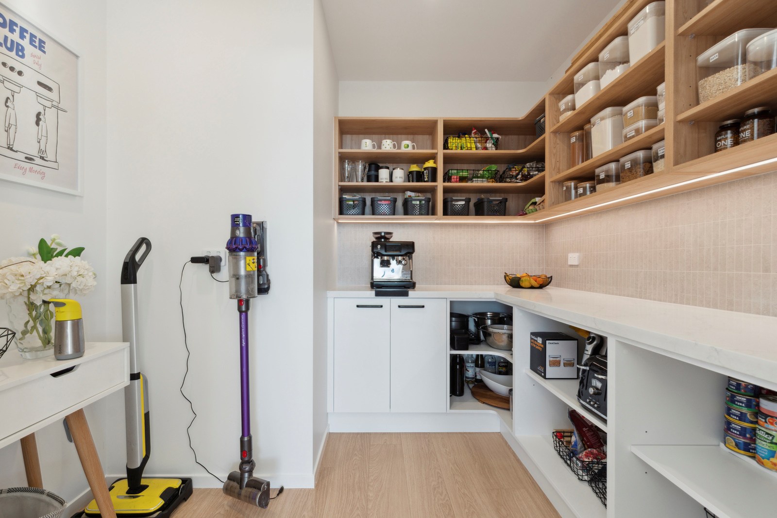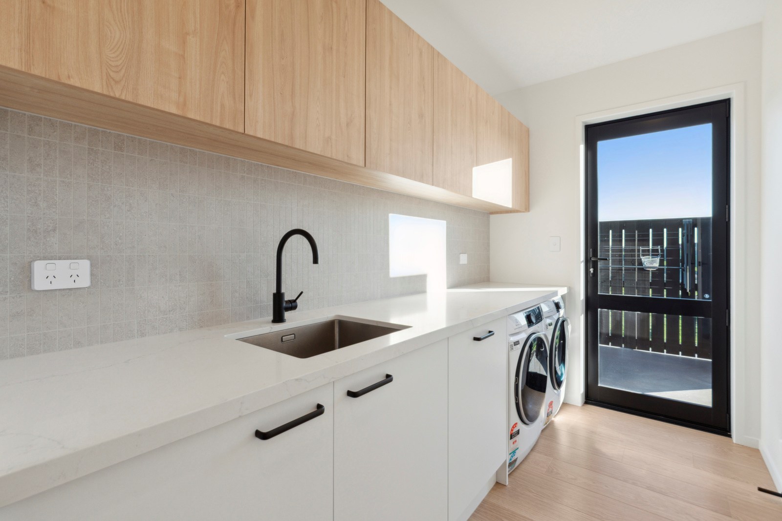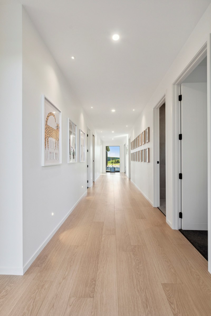 Timber cabinetry and tiled splashbacks add warmth and practicality, echoed in the adjacent laundry and bathrooms. A moody powder room contrasts beautifully with the otherwise light palette. Sliding doors open onto a covered alfresco area, offering a seamless transition between house and landscape. Outdoors, thoughtful landscaping includes a children’s play area and wide timber decking that allows room to relax and roam. With its warm material palette, practical layout and crisp execution, this home demonstrates how rural builds can feel both grounded and refined — made for modern living but rooted in place.
