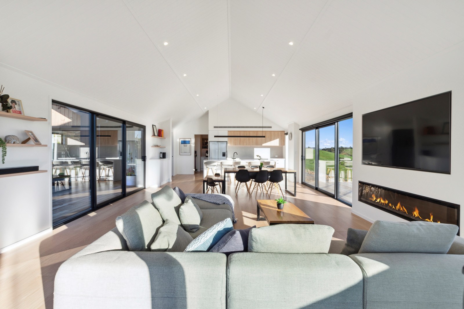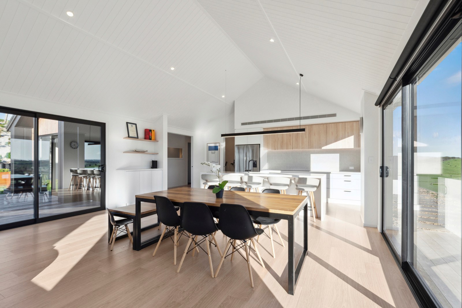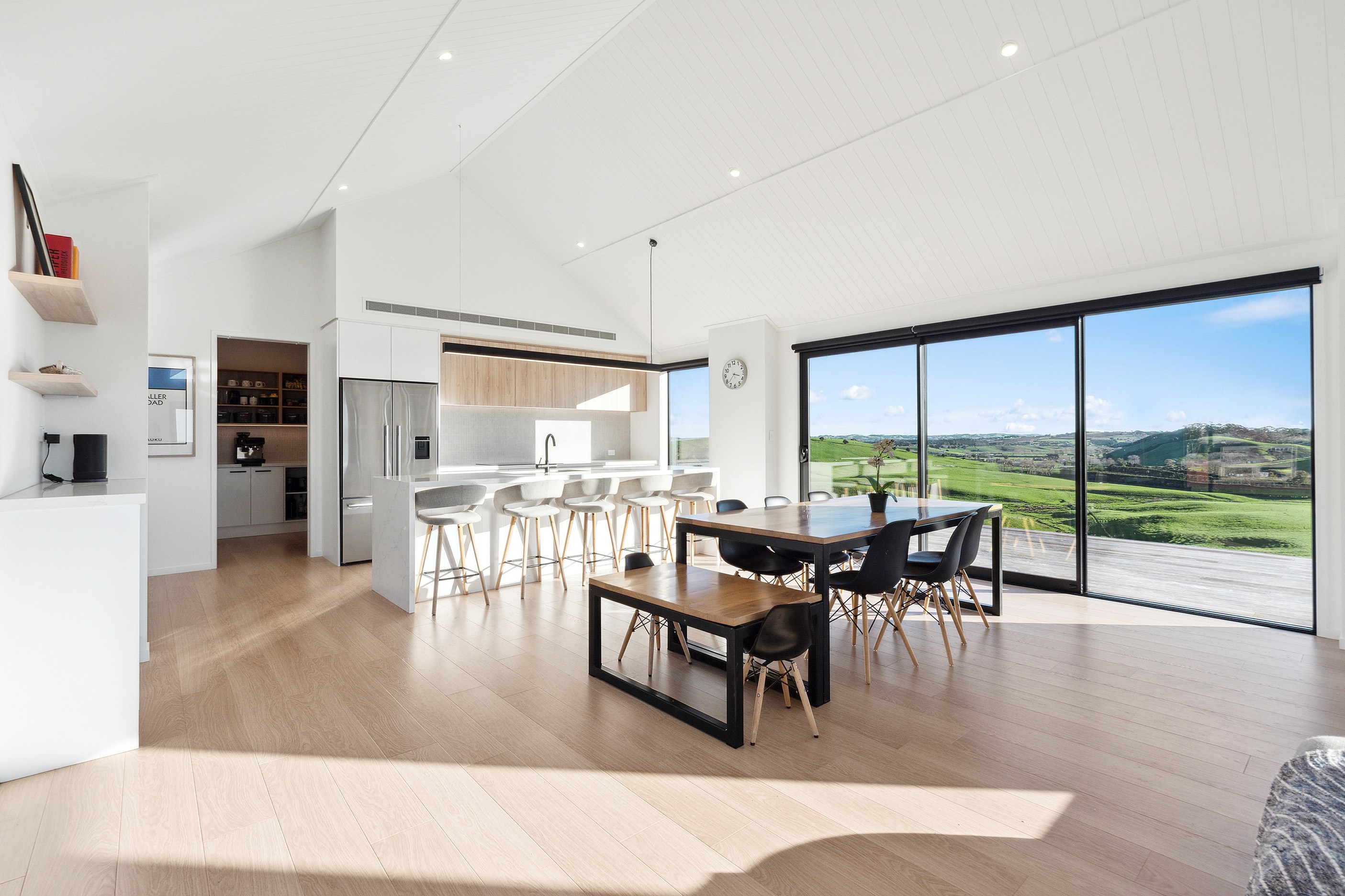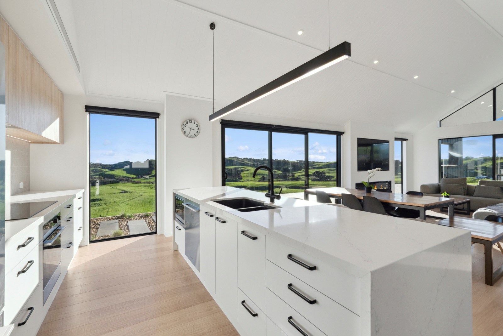 Set against a rolling green backdrop, this fourbedroom, two-bathroom home has been designed to maximise its outlook, without compromising on everyday function. The low-profile, pavilion-style layout spreads across 279sqm, with dual living zones, a triple garage and generous outdoor areas tailored for relaxed family living. Inside, the kitchen, dining and lounge form the heart of the home, unified by a striking raked ceiling lined in grooved panelling. This detail adds subtle texture and visual lift, drawing the eye upwards while bringing in natural light from the expansive glazing that spans the main elevation. The kitchen is clean and contemporary, with sleek black tapware, bar seating and a large walk-in pantry.