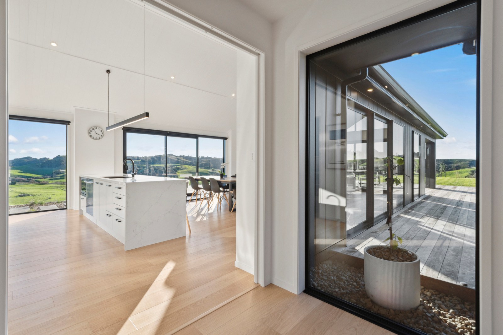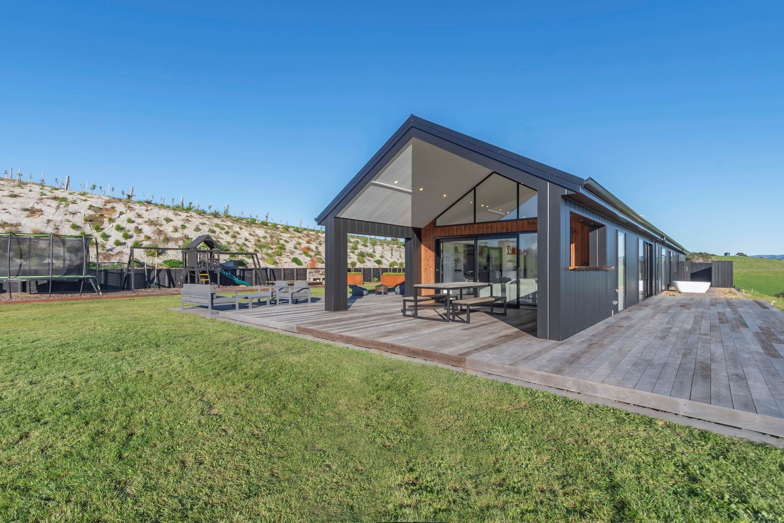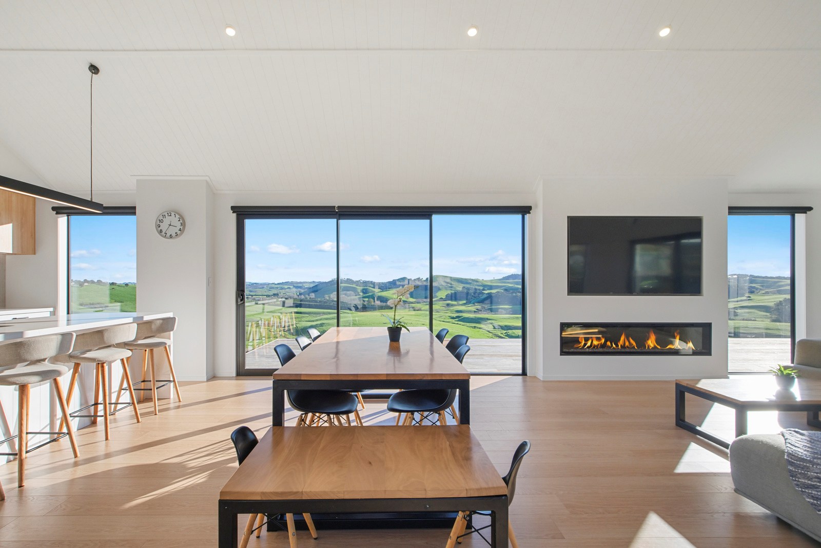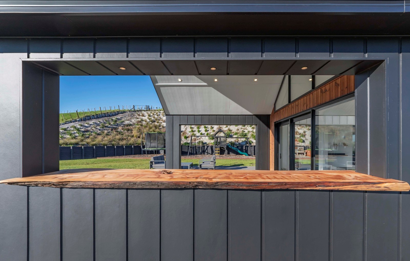 Set against a rolling green backdrop, this fourbedroom, two-bathroom home has been designed to maximise its outlook, without compromising on everyday function. The low-profile, pavilion-style layout spreads across 279sqm, with dual living zones, a triple garage and generous outdoor areas tailored for relaxed family living. Inside, the kitchen, dining and lounge form the heart of the home, unified by a striking raked ceiling lined in grooved panelling. This detail adds subtle texture and visual lift, drawing the eye upwards while bringing in natural light from the expansive glazing that spans the main elevation. The kitchen is clean and contemporary, with sleek black tapware, bar seating and a large walk-in pantry.