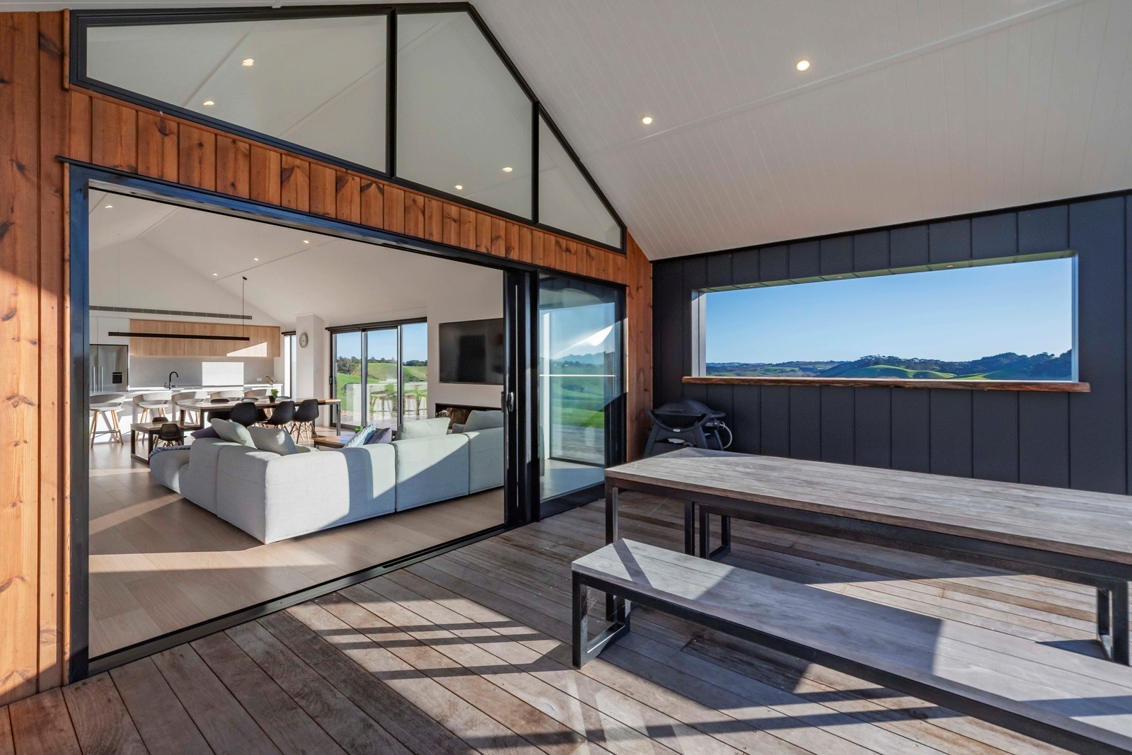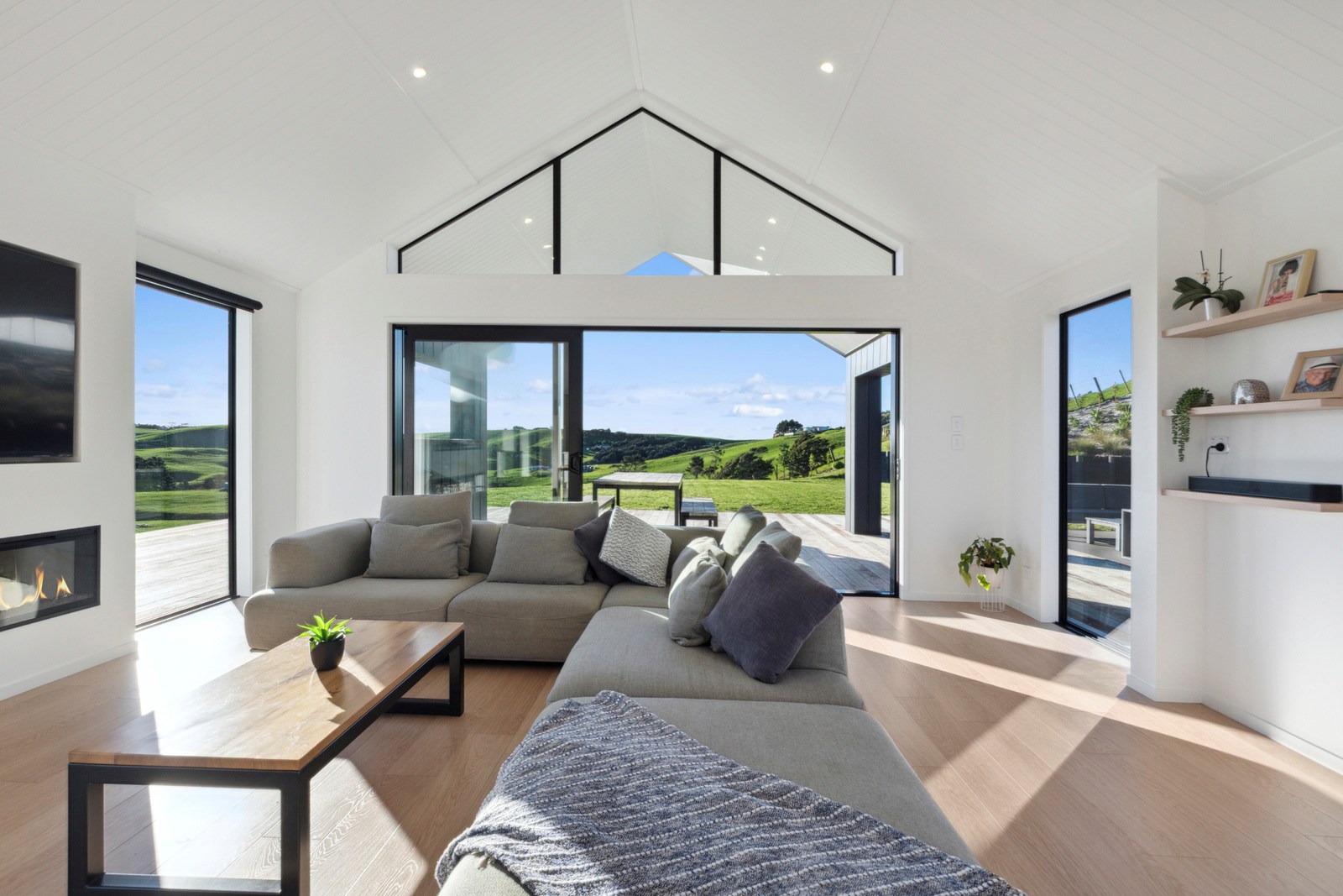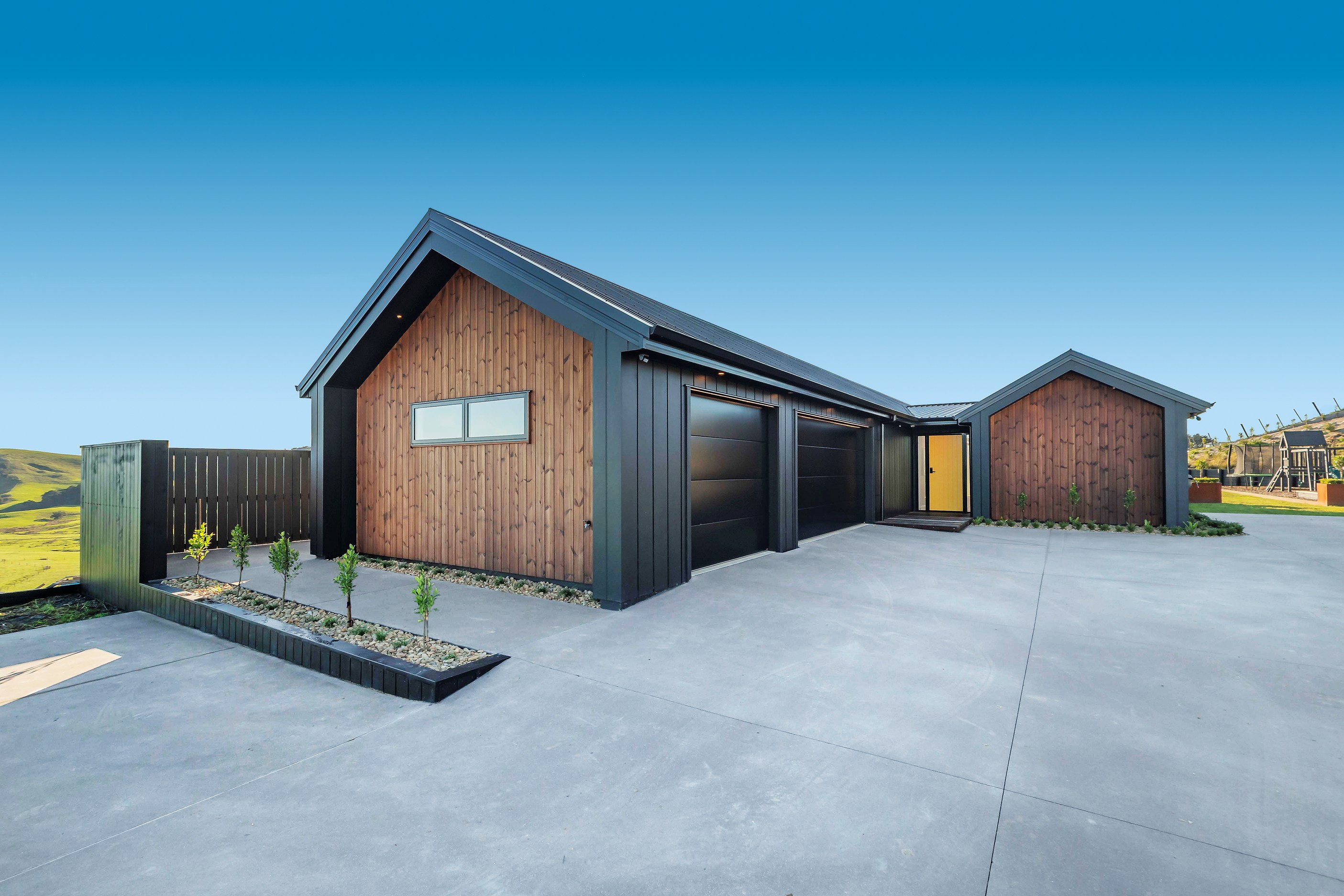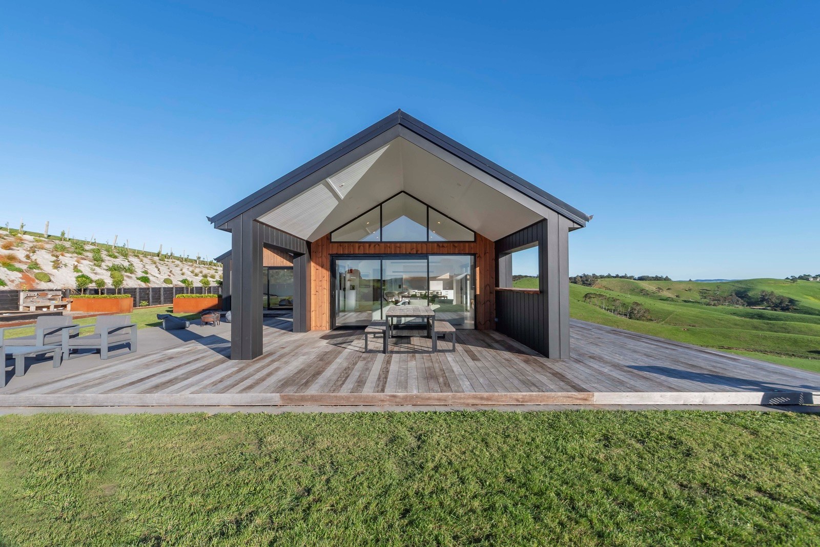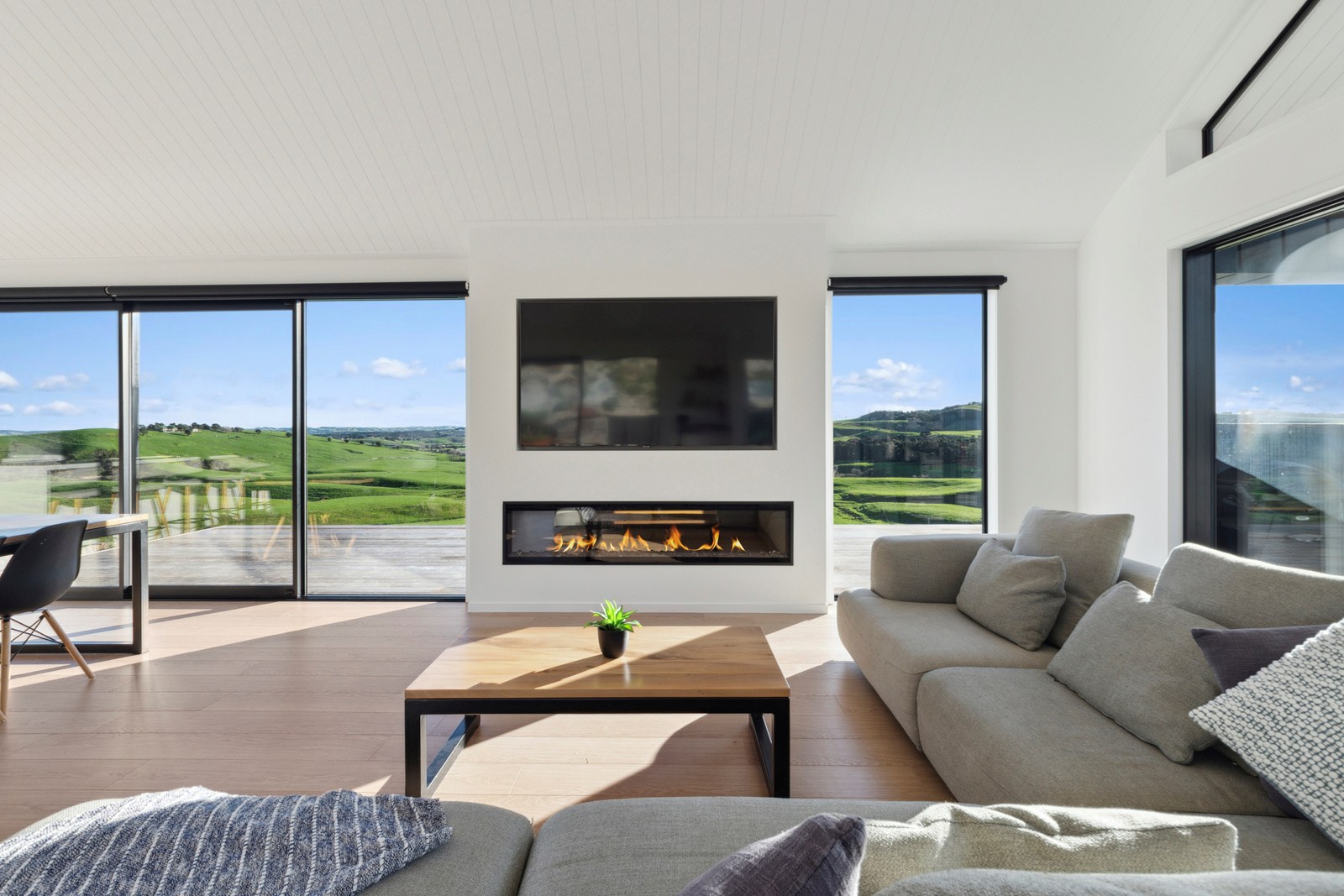 Set against a rolling green backdrop, this fourbedroom, two-bathroom home has been designed to maximise its outlook, without compromising on everyday function. The low-profile, pavilion-style layout spreads across 279sqm, with dual living zones, a triple garage and generous outdoor areas tailored for relaxed family living. Inside, the kitchen, dining and lounge form the heart of the home, unified by a striking raked ceiling lined in grooved panelling. This detail adds subtle texture and visual lift, drawing the eye upwards while bringing in natural light from the expansive glazing that spans the main elevation. The kitchen is clean and contemporary, with sleek black tapware, bar seating and a large walk-in pantry.