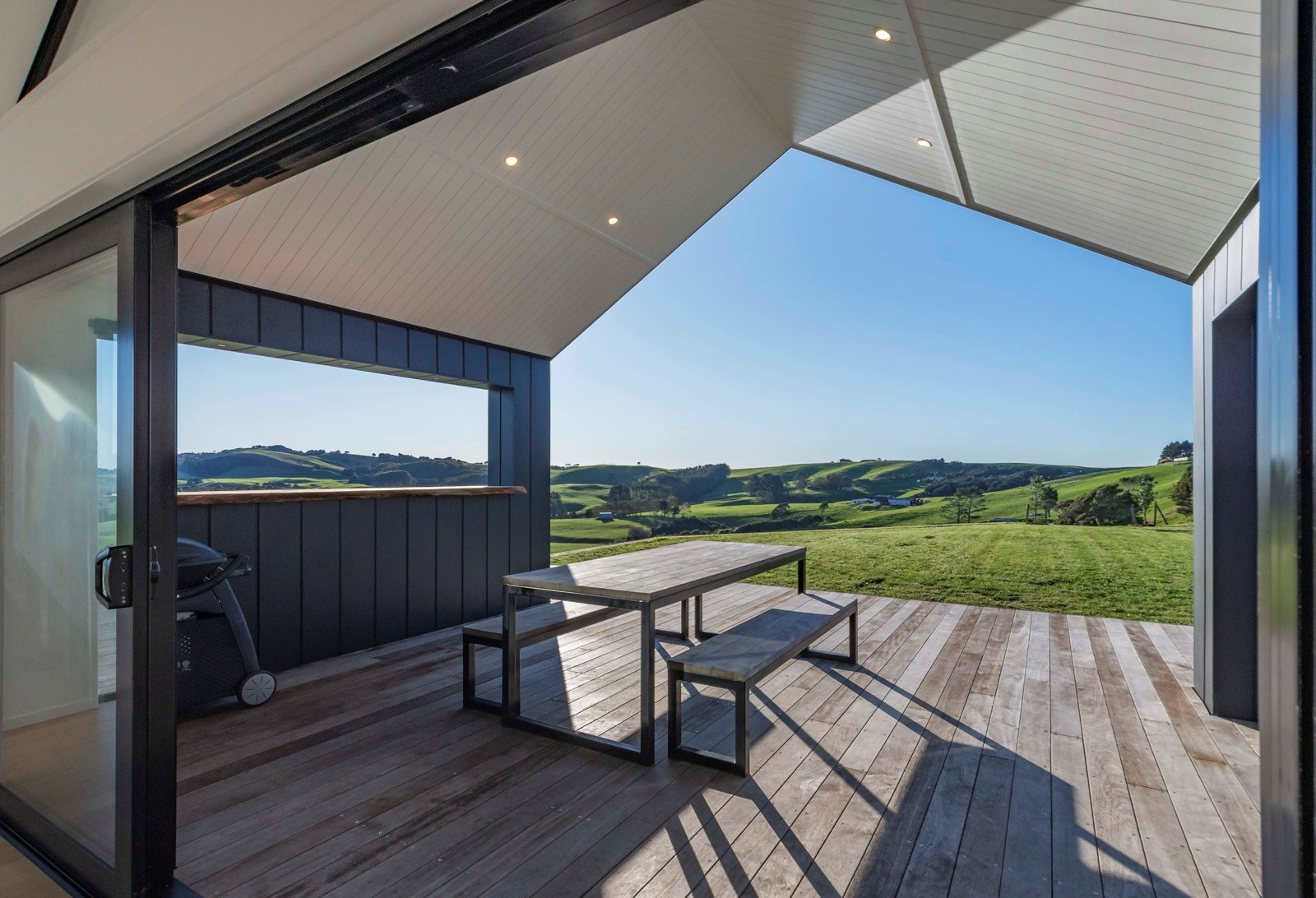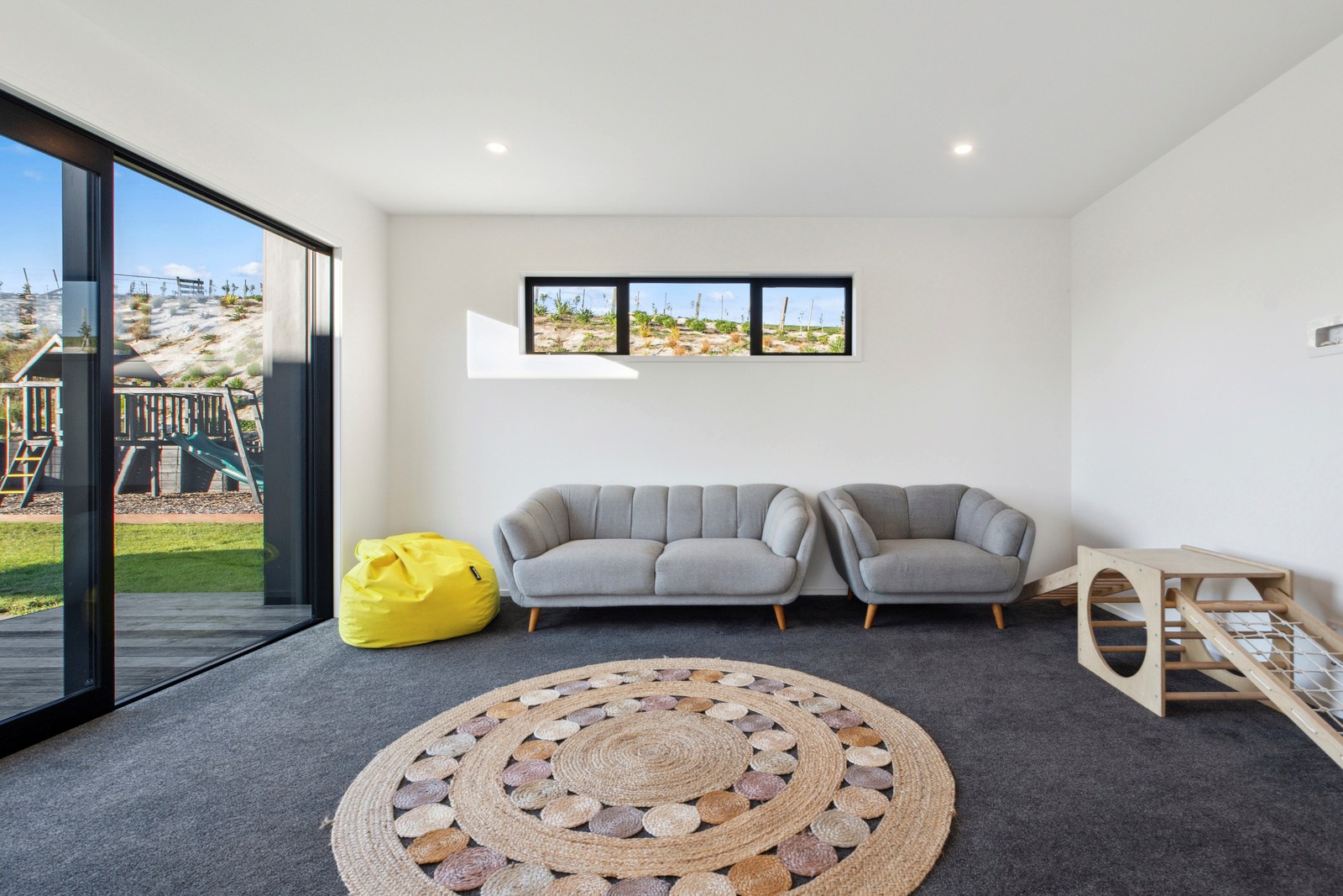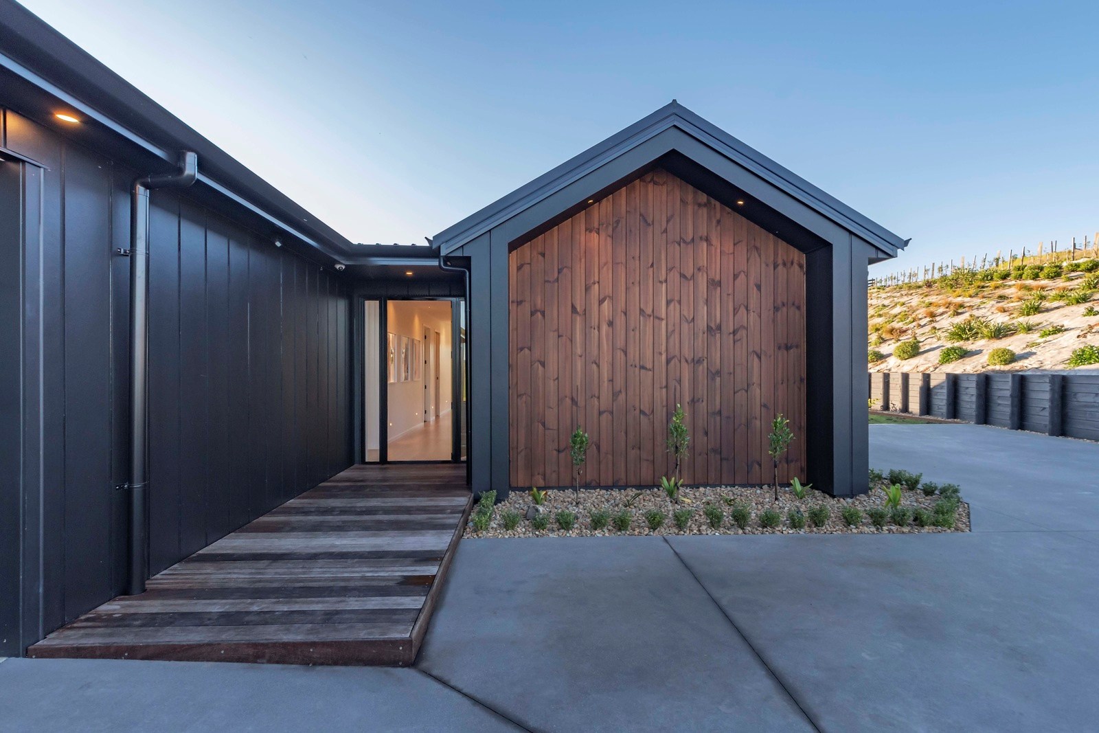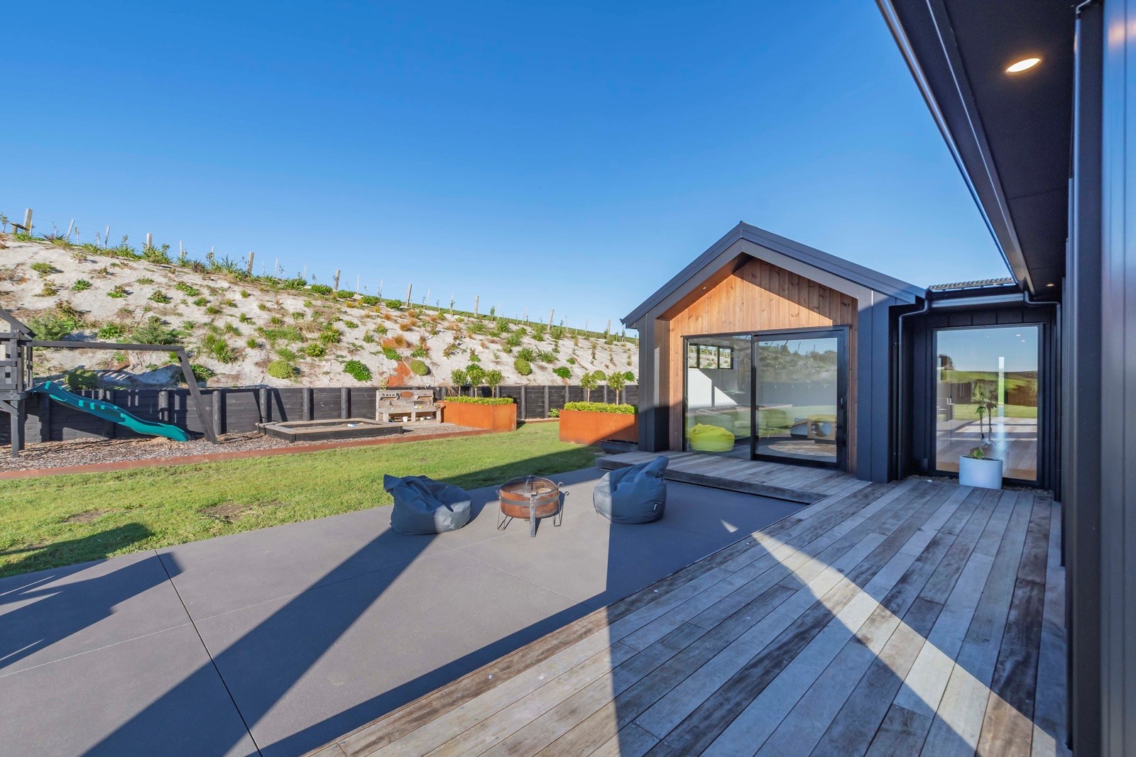 Set against a rolling green backdrop, this fourbedroom, two-bathroom home has been designed to maximise its outlook, without compromising on everyday function. The low-profile, pavilion-style layout spreads across 279sqm, with dual living zones, a triple garage and generous outdoor areas tailored for relaxed family living. Inside, the kitchen, dining and lounge form the heart of the home, unified by a striking raked ceiling lined in grooved panelling. This detail adds subtle texture and visual lift, drawing the eye upwards while bringing in natural light from the expansive glazing that spans the main elevation. The kitchen is clean and contemporary, with sleek black tapware, bar seating and a large walk-in pantry.