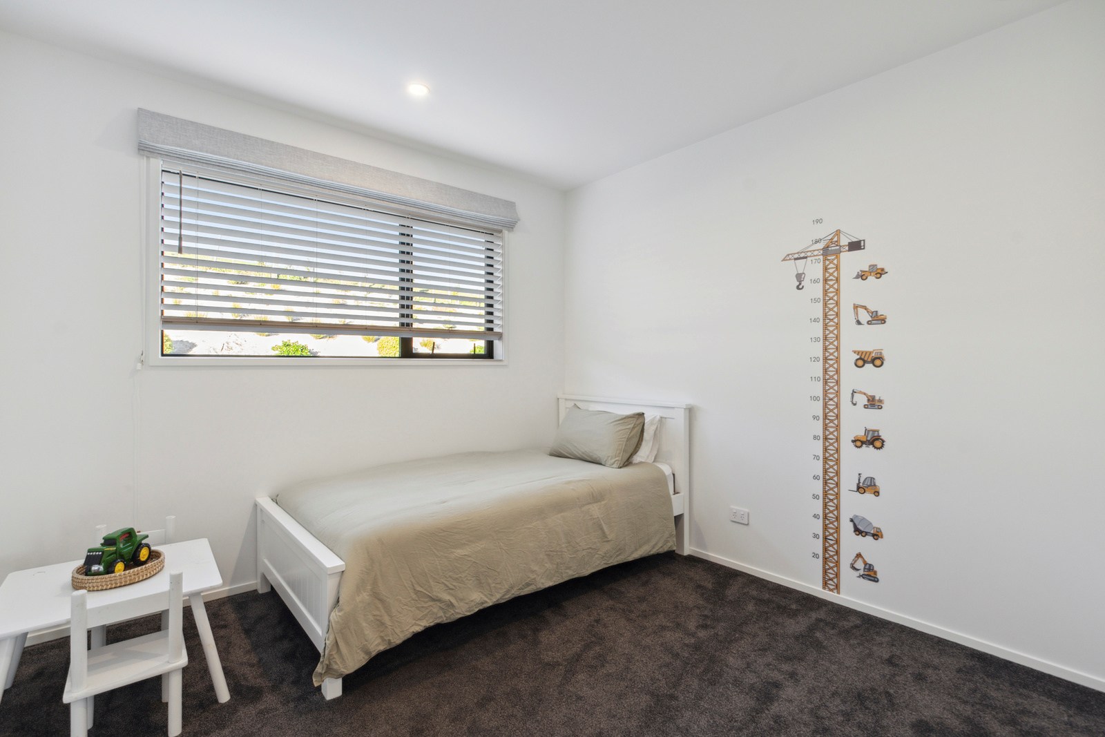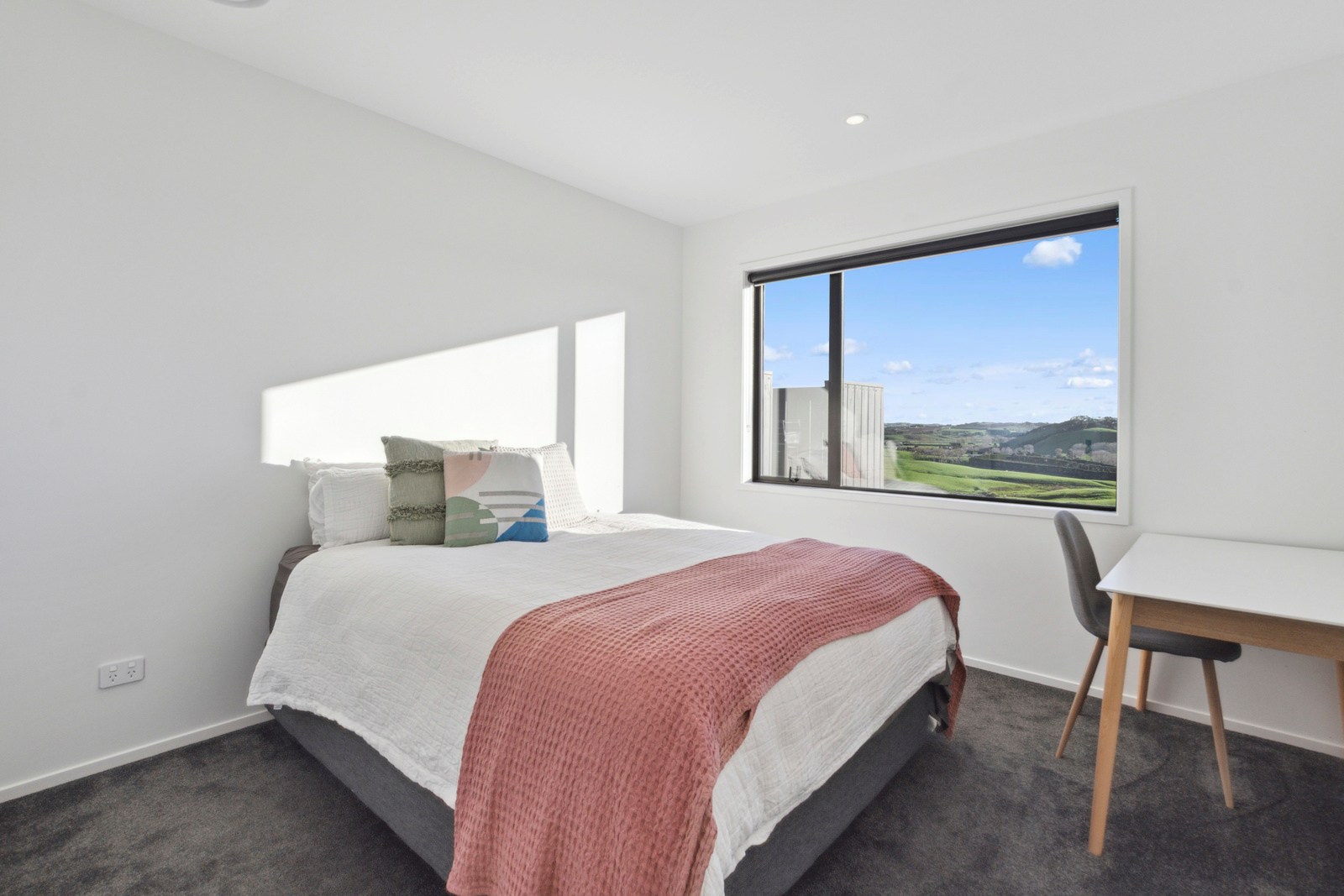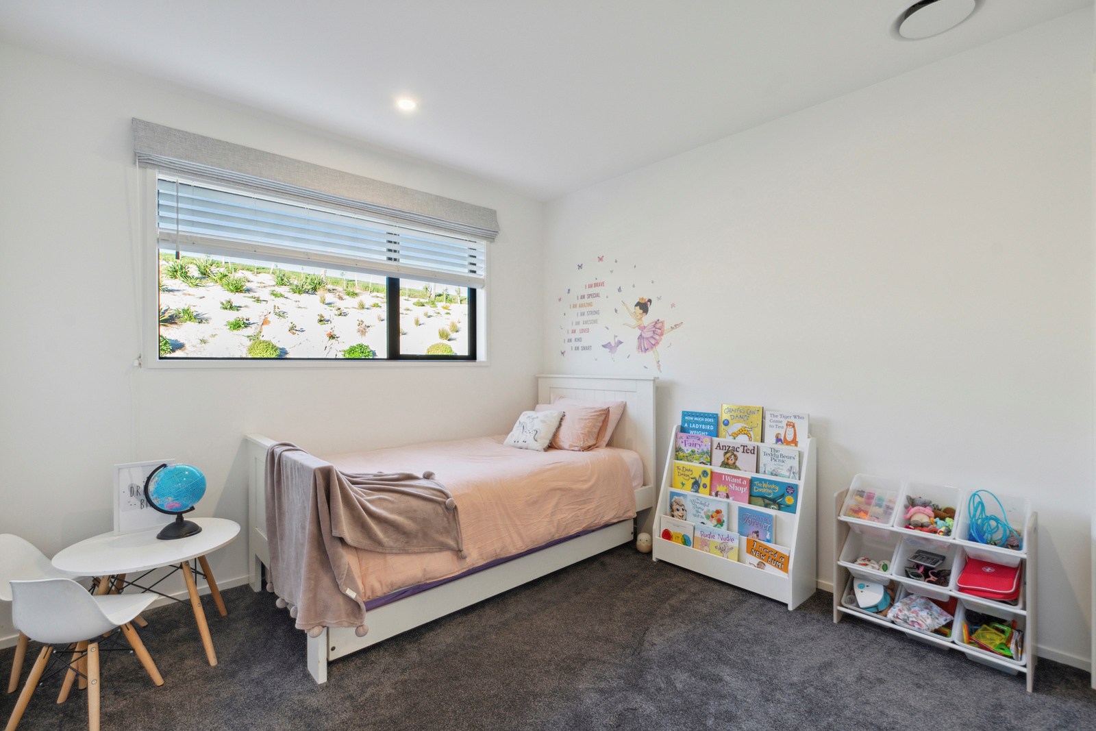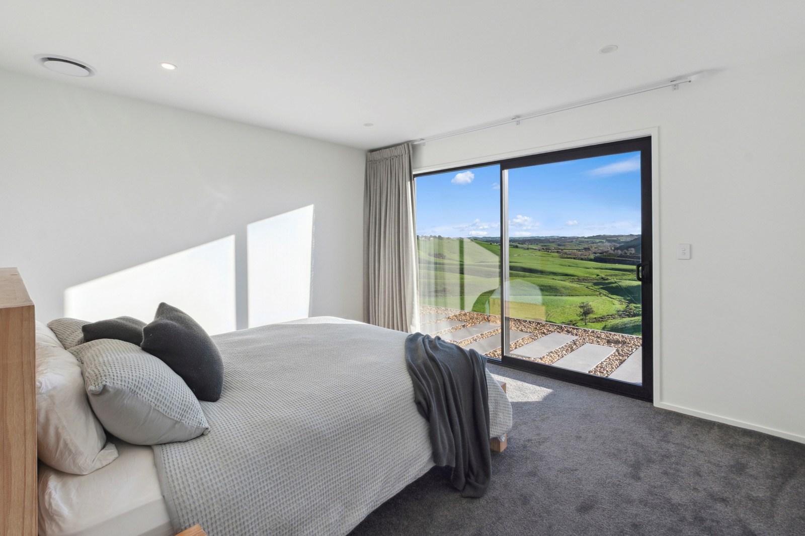 Set against a rolling green backdrop, this fourbedroom, two-bathroom home has been designed to maximise its outlook, without compromising on everyday function. The low-profile, pavilion-style layout spreads across 279sqm, with dual living zones, a triple garage and generous outdoor areas tailored for relaxed family living. Inside, the kitchen, dining and lounge form the heart of the home, unified by a striking raked ceiling lined in grooved panelling. This detail adds subtle texture and visual lift, drawing the eye upwards while bringing in natural light from the expansive glazing that spans the main elevation. The kitchen is clean and contemporary, with sleek black tapware, bar seating and a large walk-in pantry.