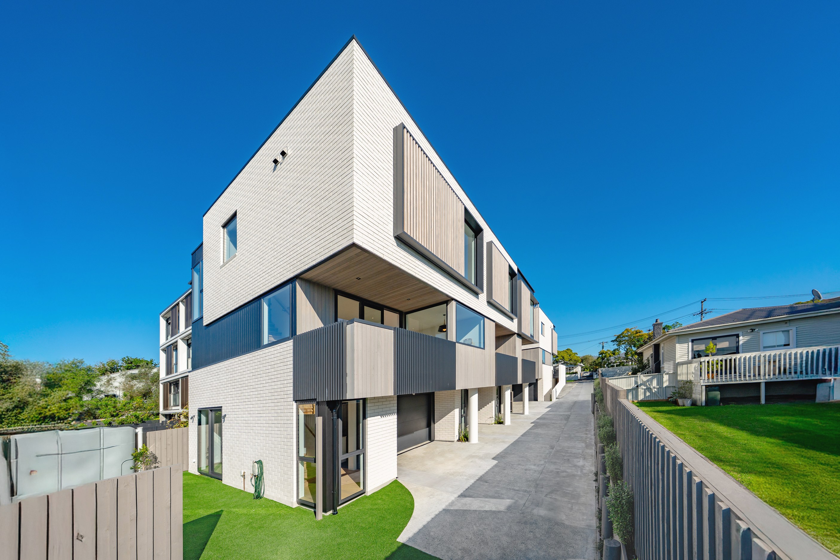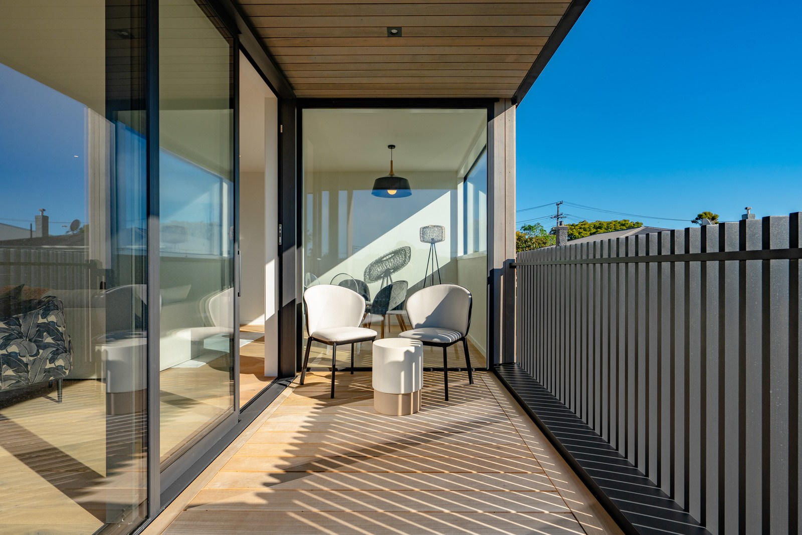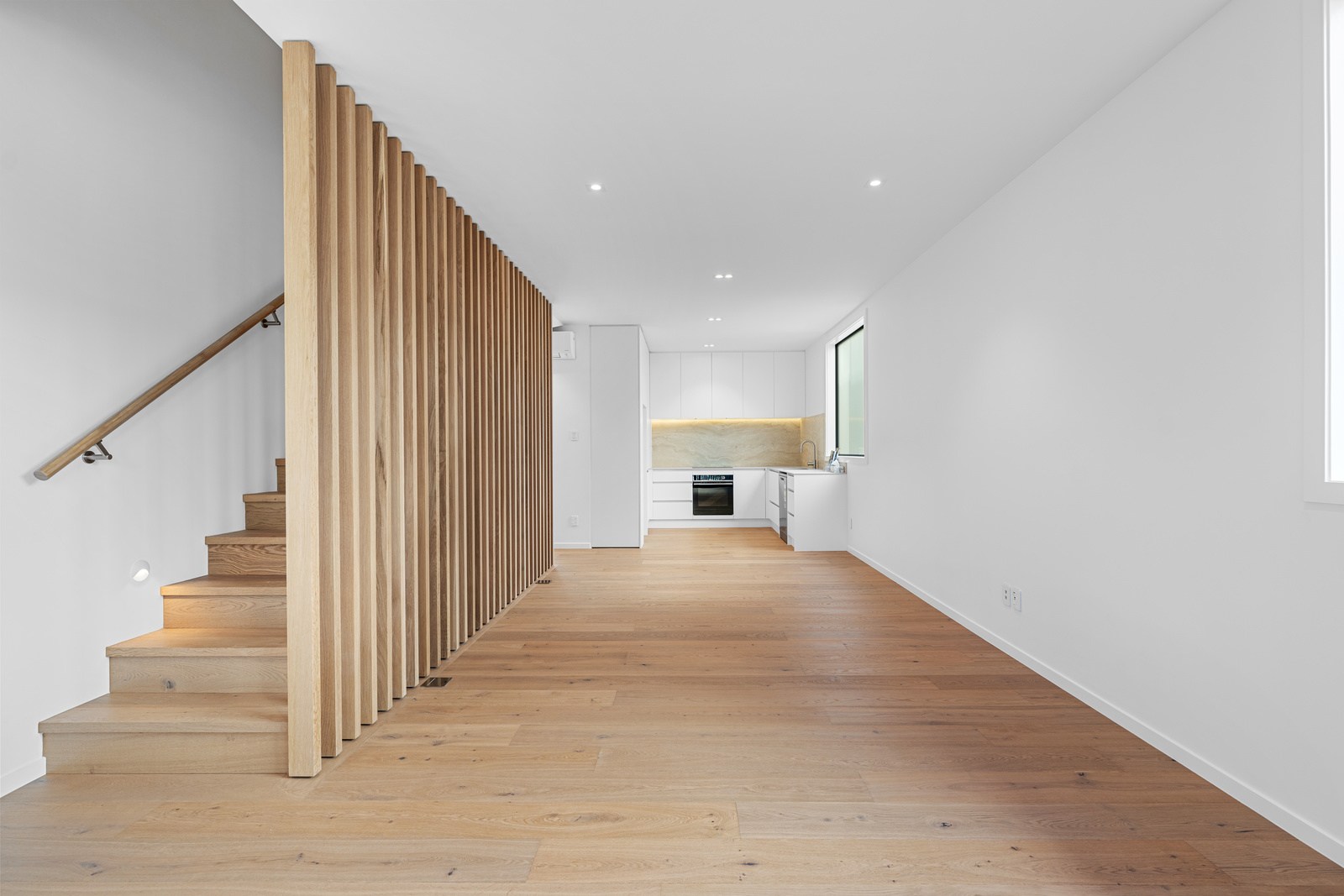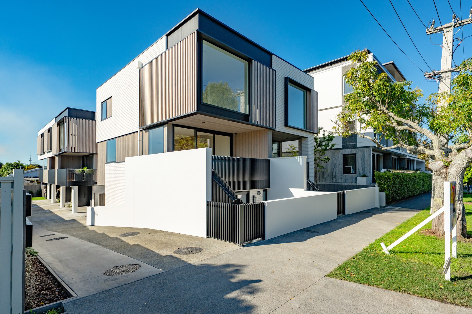 Delivering five high-end homes on a compact urban site, this development exemplifies how smart design and precision construction can achieve elegant, future-ready living. The subdivision introduces three distinct typologies, unified by a bold material palette of pale brick, vertical cedar and aluminium louvres. The result is a crisp, modern aesthetic that balances architectural clarity with a warm, textural finish. A streamlined roofline, enhanced by an improved capping solution and concealed guttering beneath the deck balustrade, maintains the integrity of the building’s silhouette.