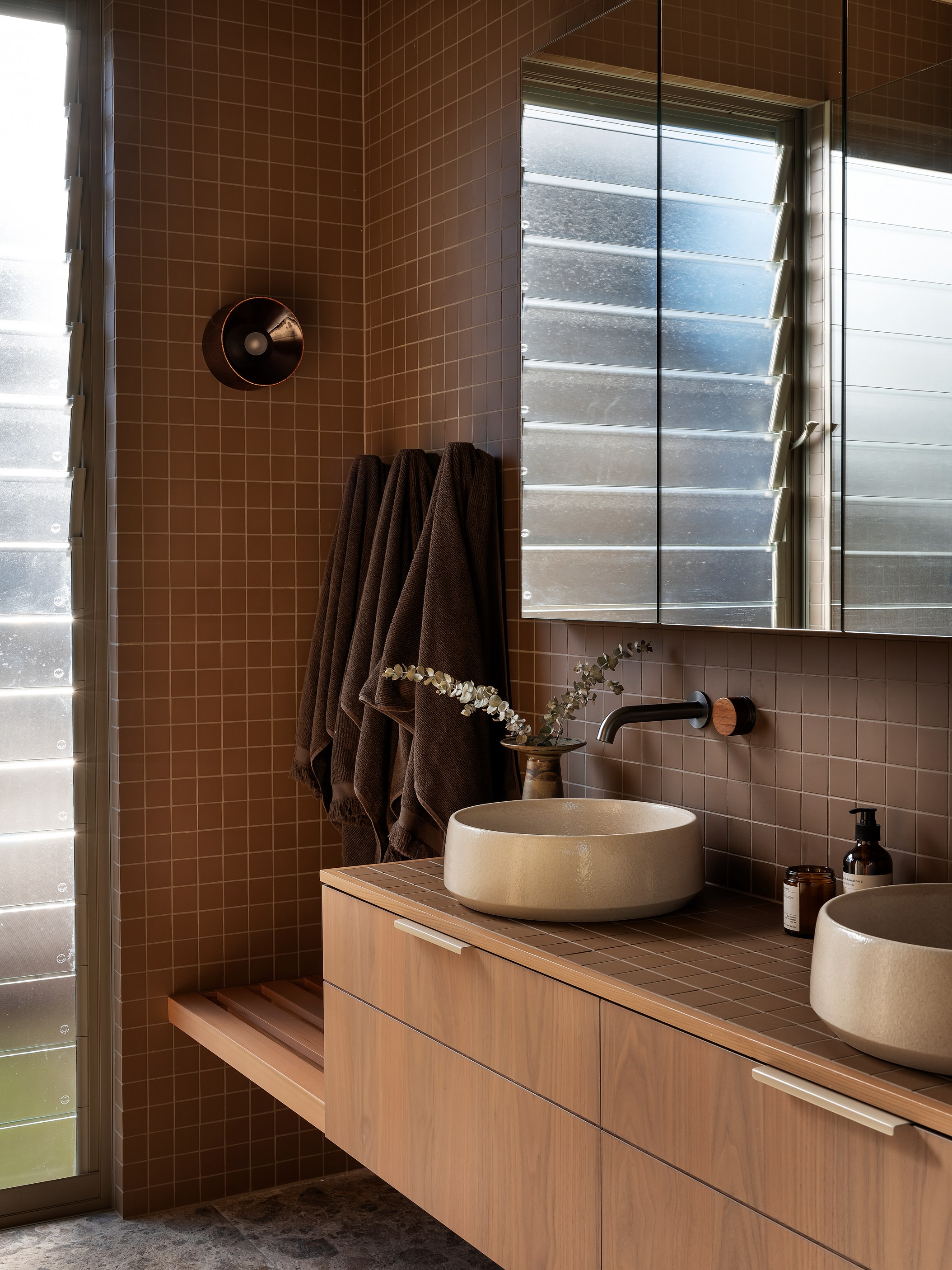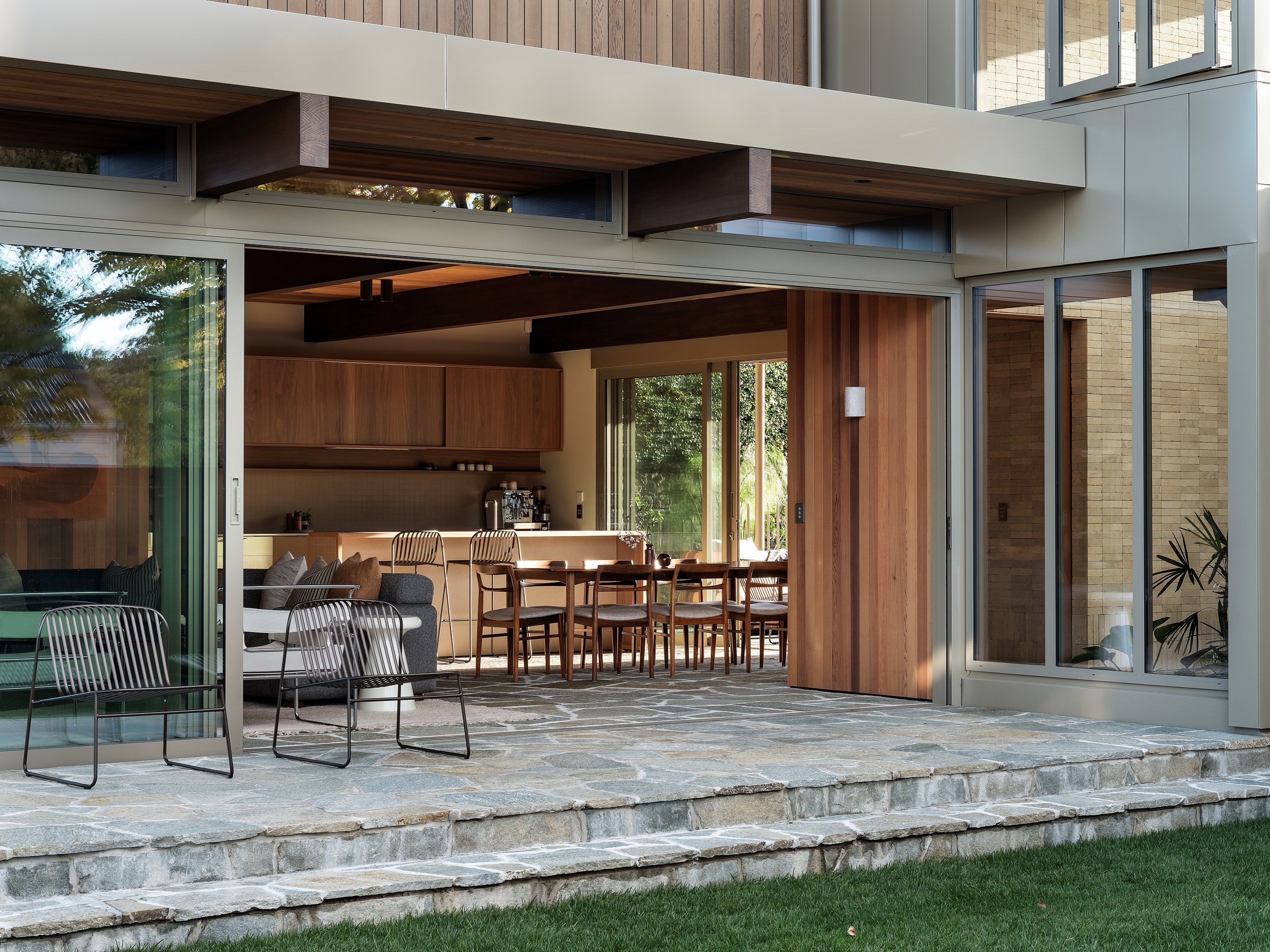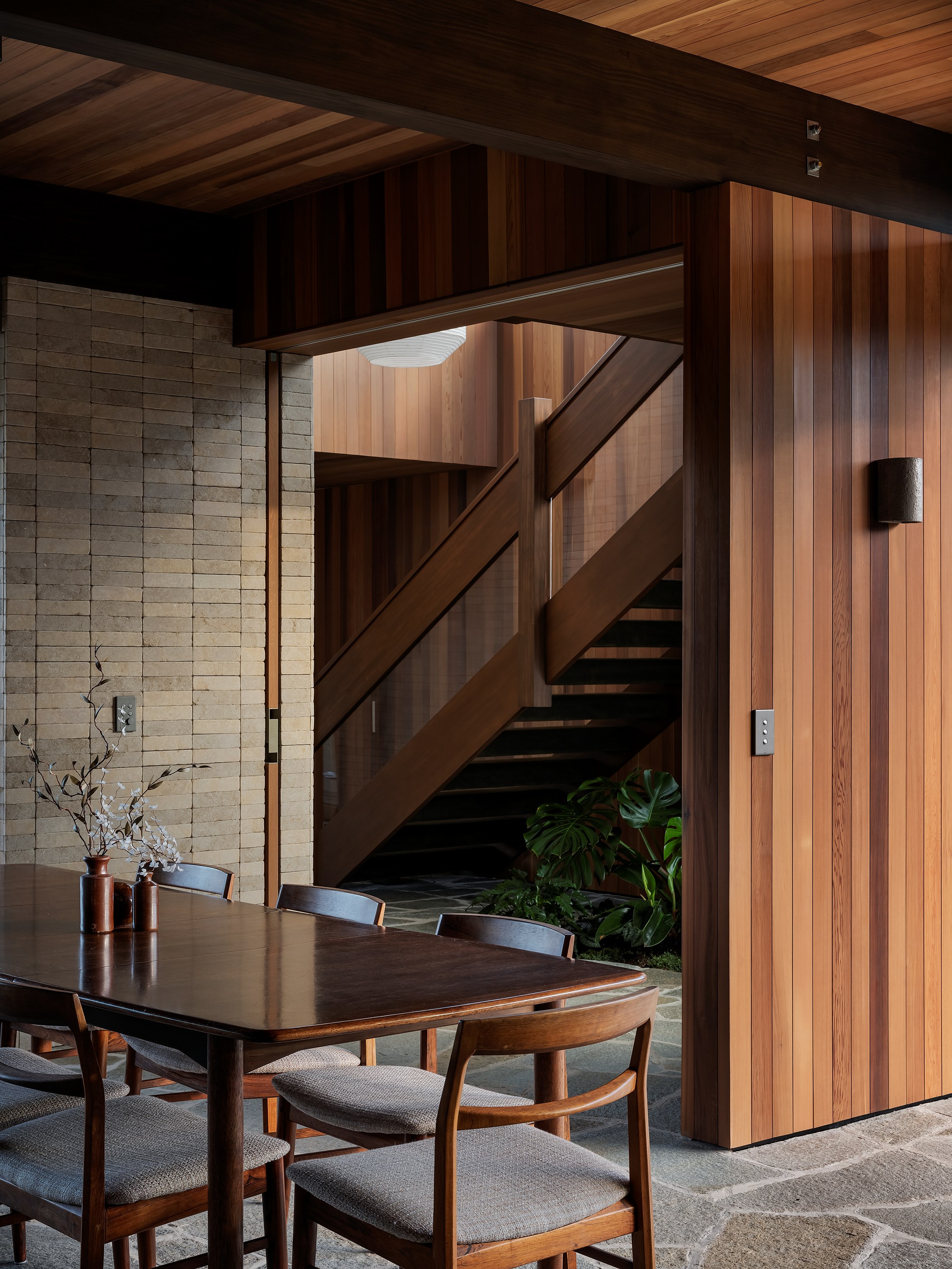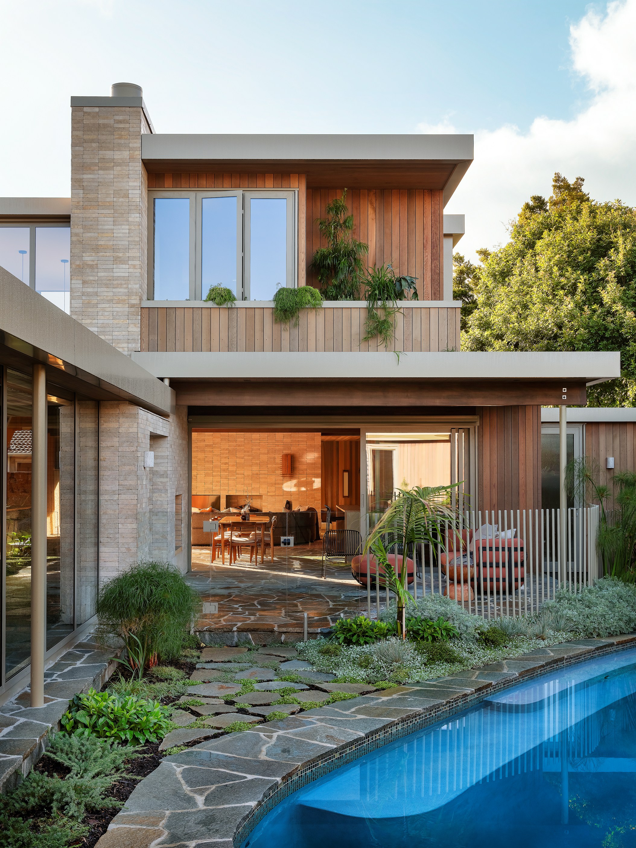 From the moment you set eyes on Prospect House, it’s clear this is much more than a family home. The 275sqm build is also a paradise in the suburbs. Top-of-the-line materials, communal spaces centred around suntrap courtyards and an oasis with in-ground pool combine to beautifully blur the line between indoors and out. The four-bedroom, three-bathroom house, inspired by a relative’s mid-century property, is also a display case for the smarts and craftsmanship of architects MAUD and the interiors by at.space. You can see it in the two-storey atrium featuring cedar, stone and clerestory windows that strike just the right balance between privacy and glimpses inside.