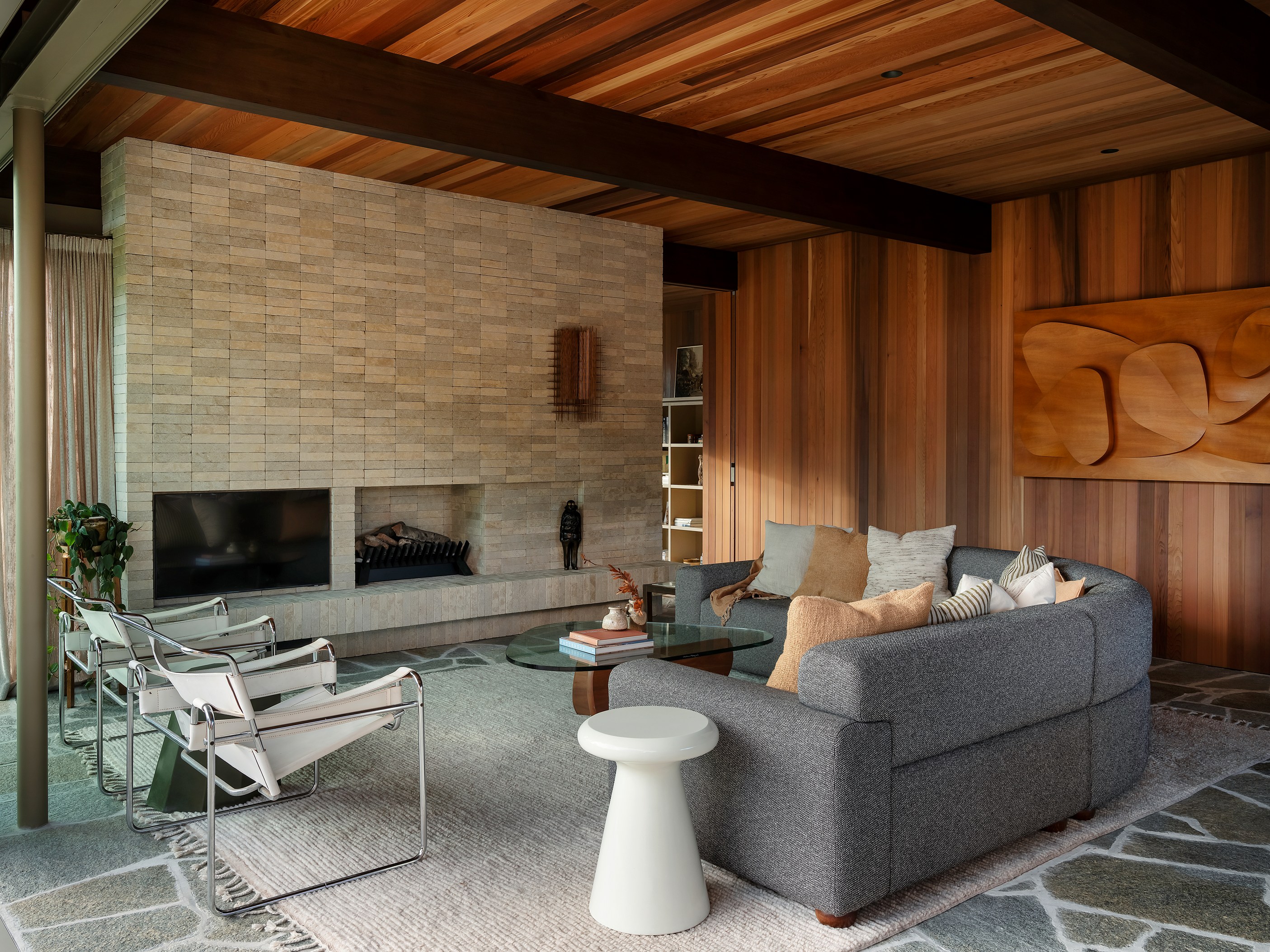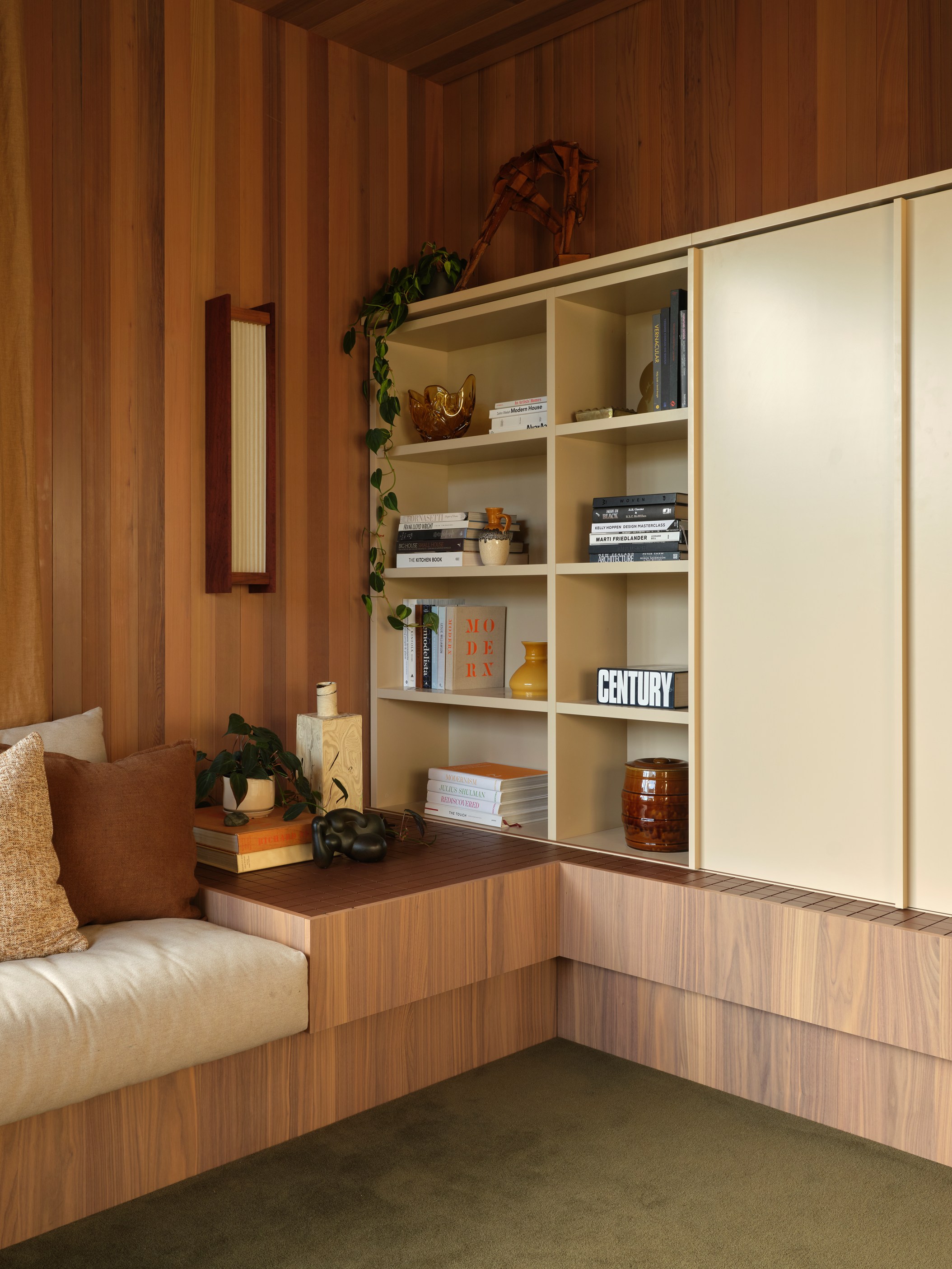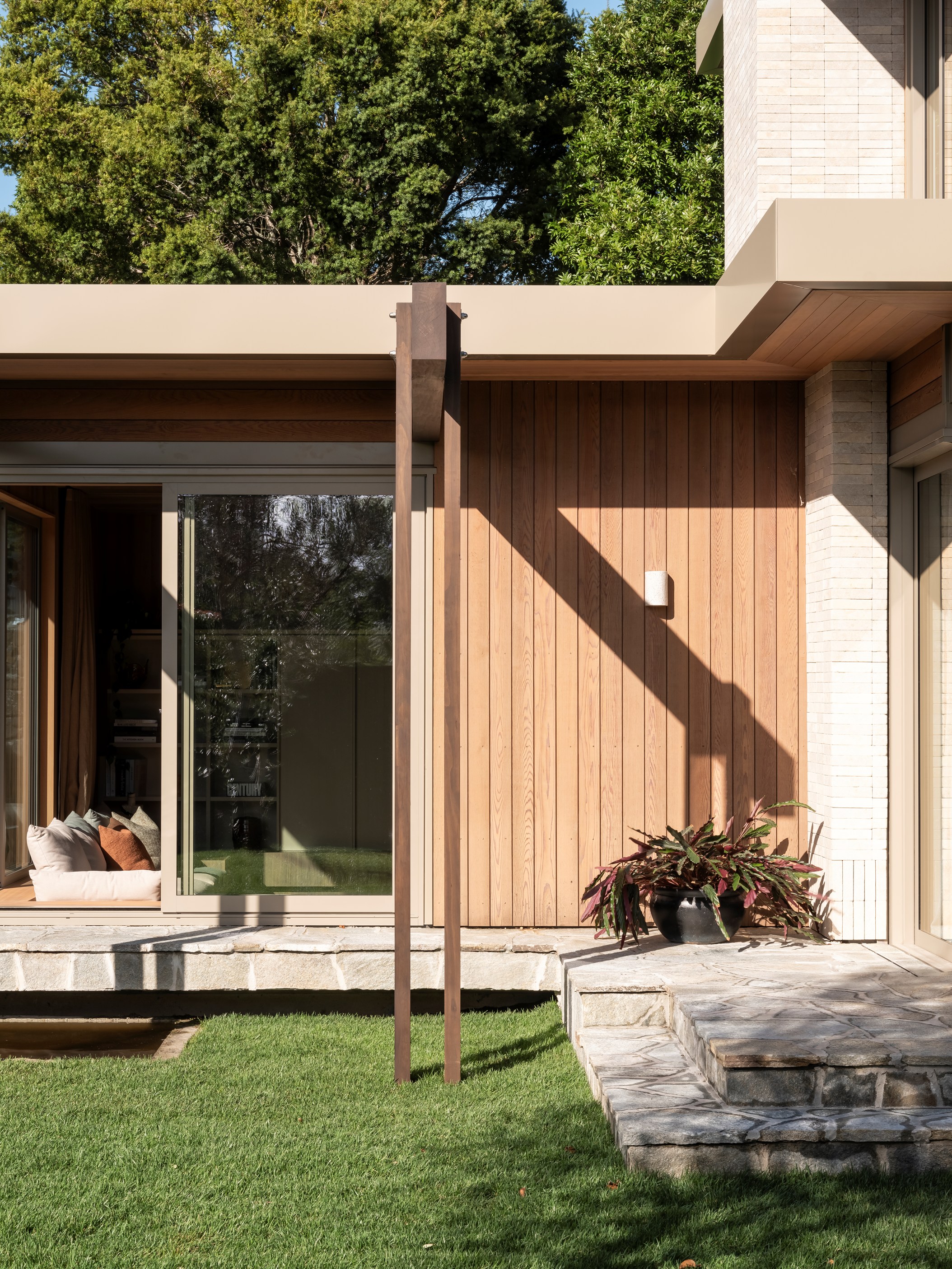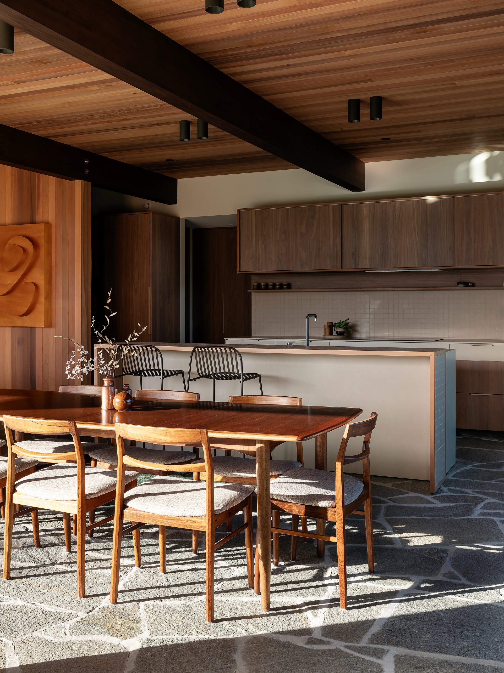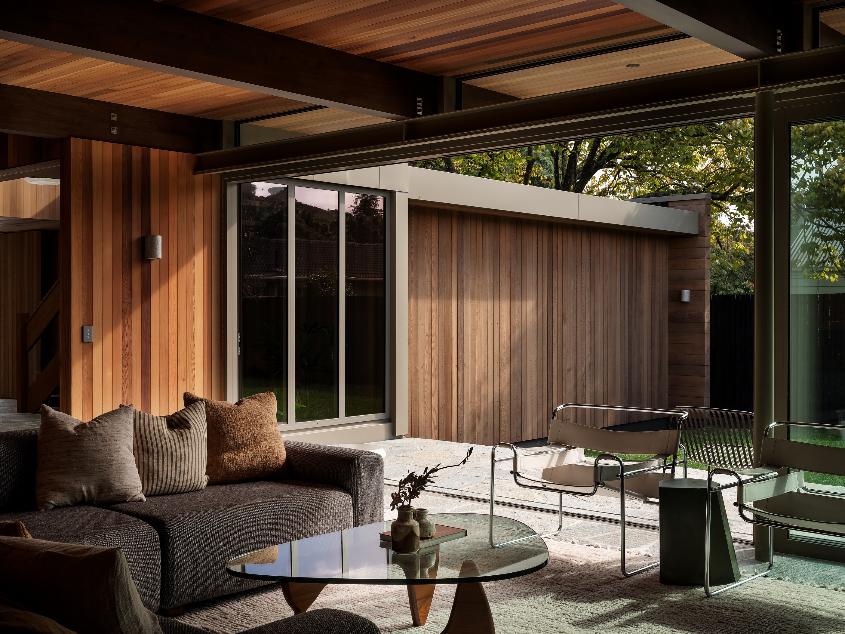 It continues with timber beams extending into a lush garden court and the pool courtyard with a glazed link connecting living areas. Meticulous detailing is showcased in the limestone batons, cedar sarking, interior gardens and crazy paving that flows from inside to out. Key structural elements, such as exposed stained timber beams and complex concrete slabs below the crazy paving, demanded exceptional precision and collaboration across trades. This build required more than 12,000 batons and almost 9000 lineal metres of cedar — plus exceptional problem-solving skills to excavate tonnes of volcanic rock. Beauty, comfort and environmental responsibility — this is a masterpiece in every way.