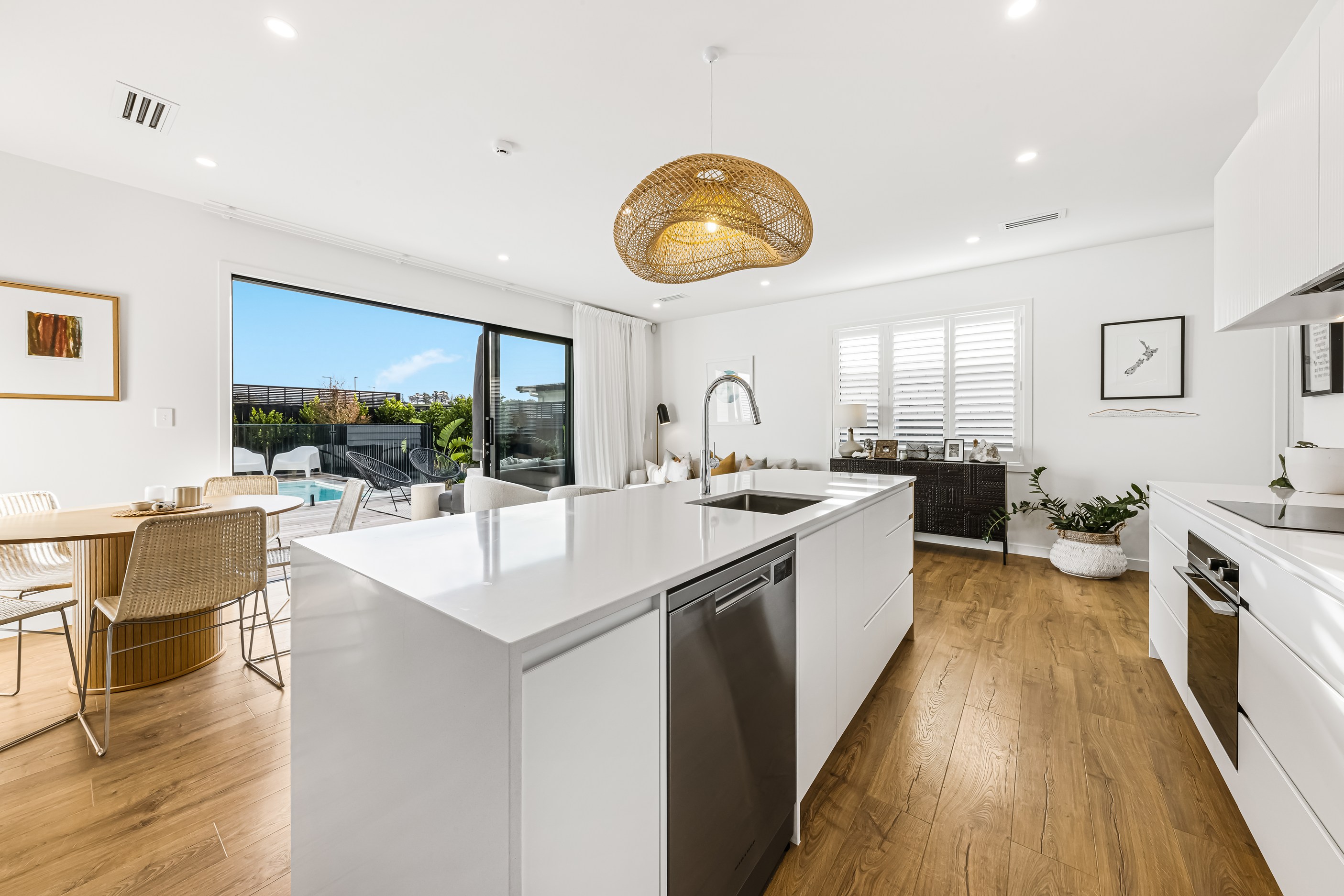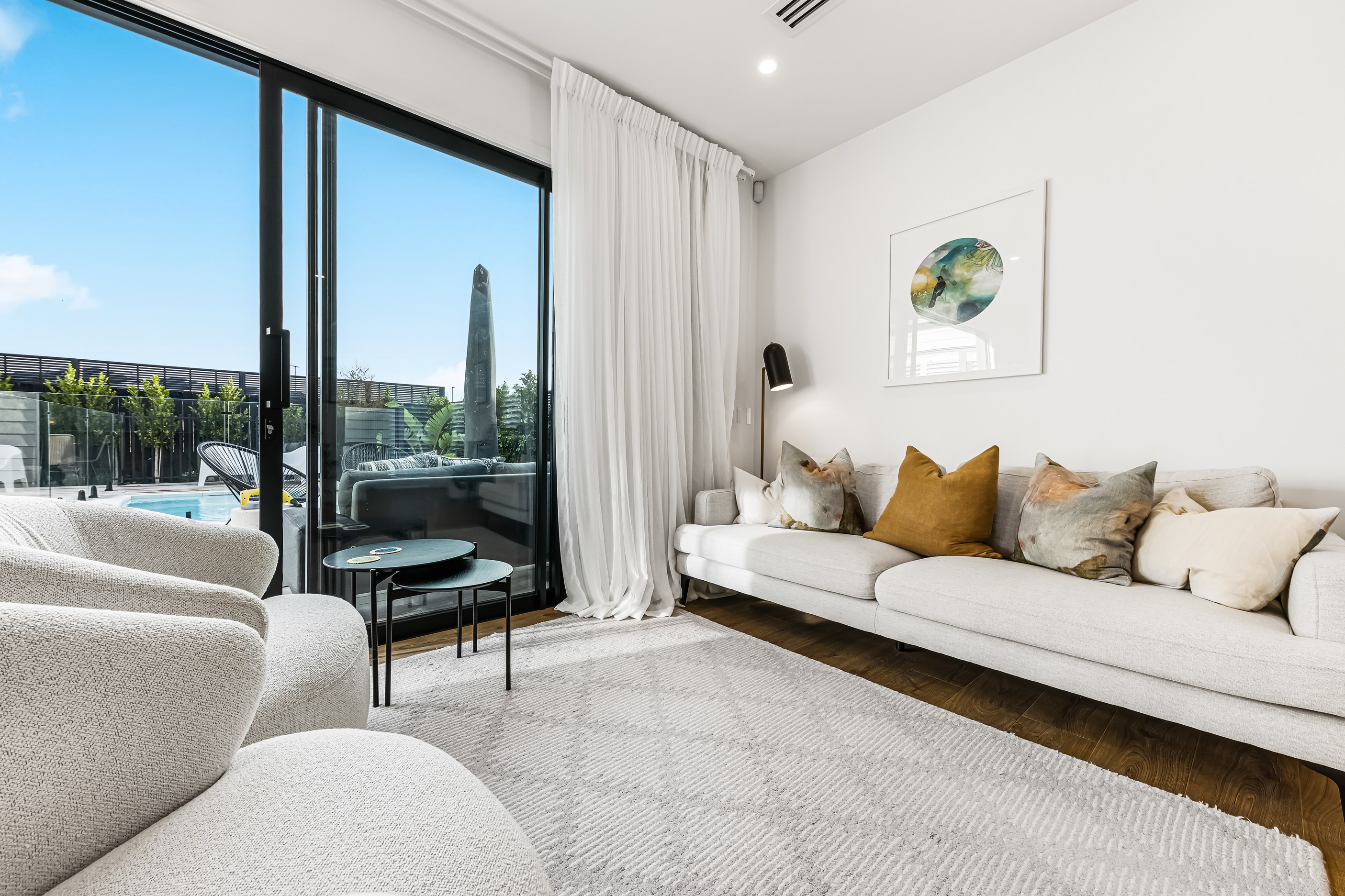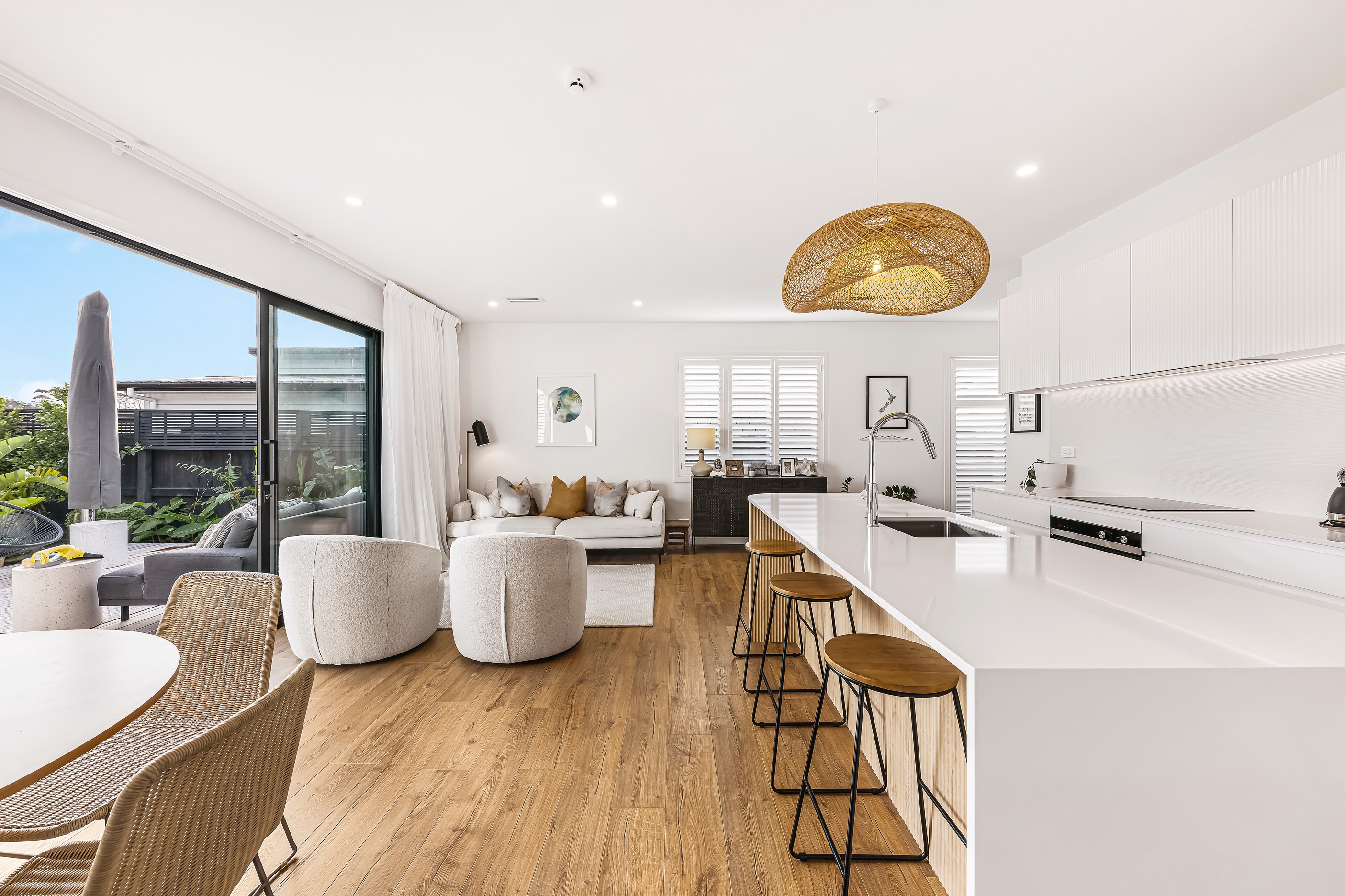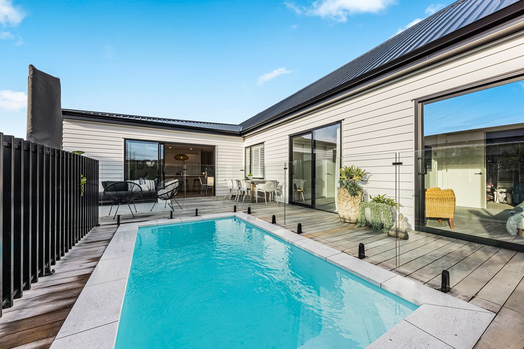 From the street, this contemporary four-bedroom home makes an immediate statement. A dramatic high gable, softened by the warmth of contrasting Abodo timber, creates a striking visual statement while integrating seamlessly into the streetscape. Yet it’s what lies beyond the façade that truly captures attention. The design embraces the north-facing site, wrapping around a private plunge pool that becomes the focal point of outdoor living. Large sliders from the main living area and two bedrooms open onto the expansive deck, creating an easy flow for sun-soaked lounging and effortless entertaining.