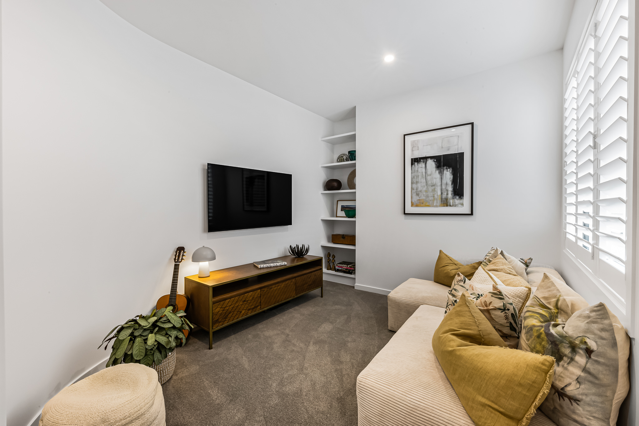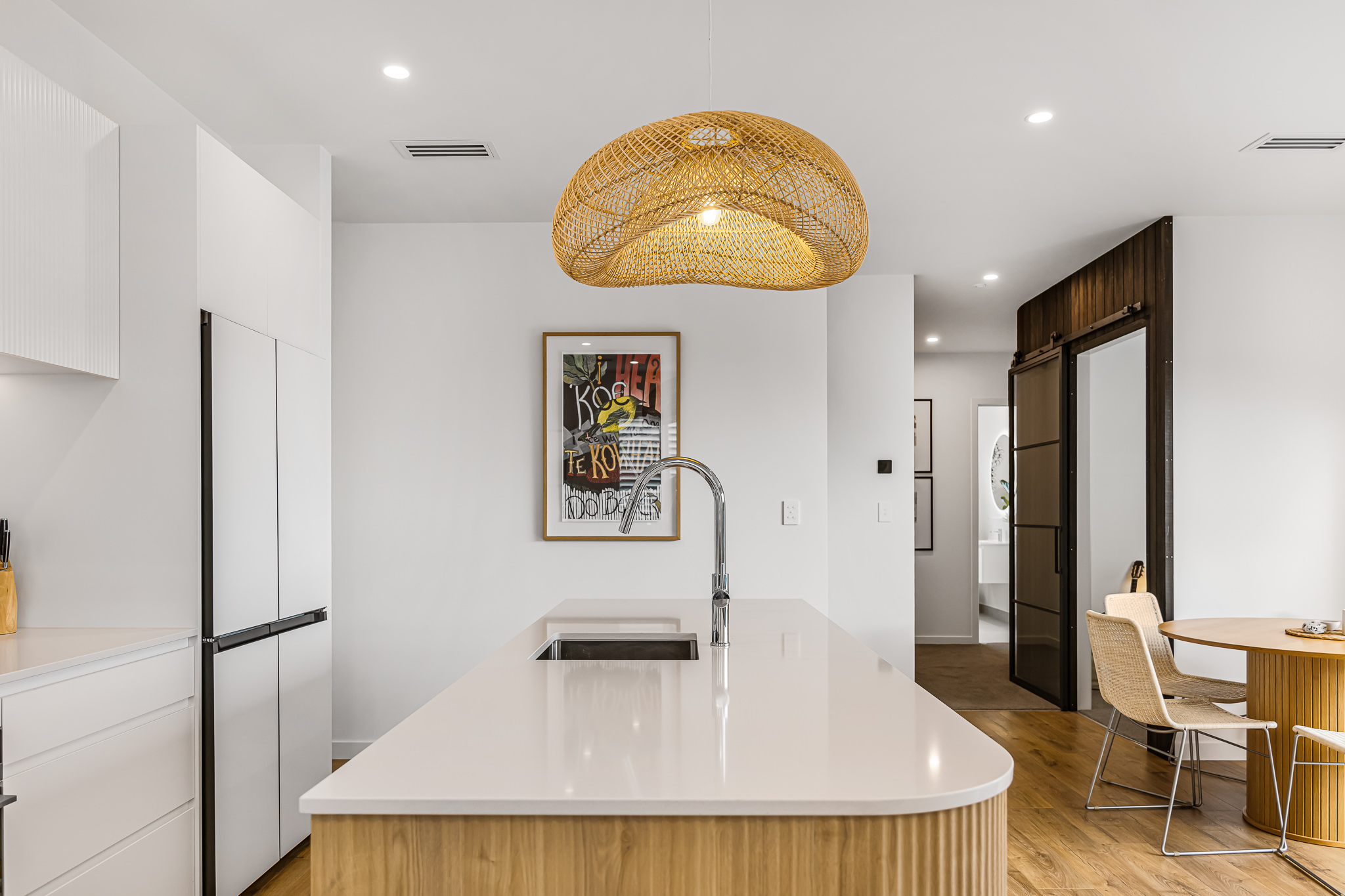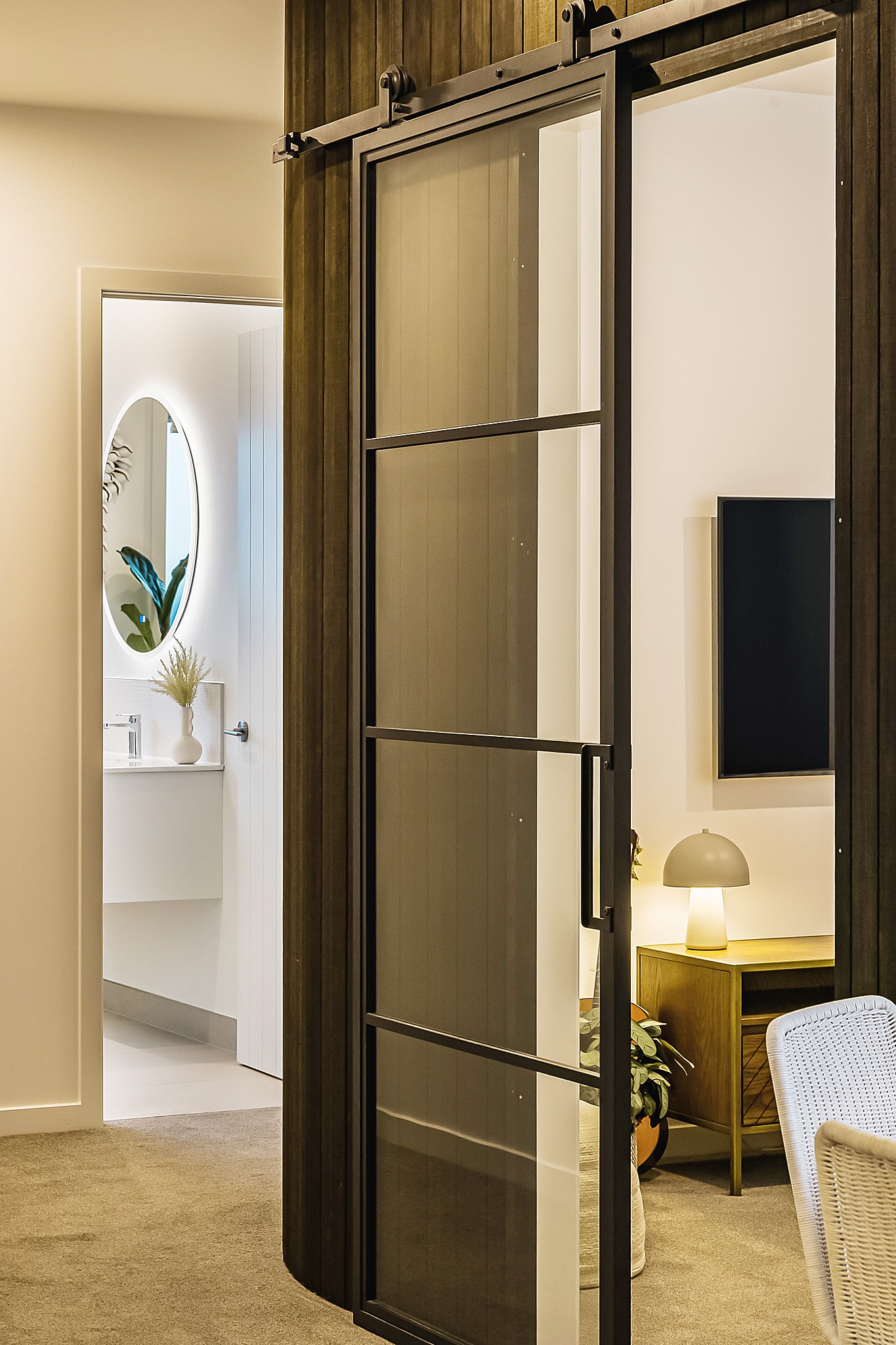 Step into the heart of the home, an inviting open-plan kitchen, dining and living area. The curved end of the kitchen island makes a statement as does a dramatic glass-and-steel barn door, which leads to a cosy media room, offering a quiet counterpoint to the home’s living spaces. With four bedrooms, two bathrooms and dual living areas in a compact 176sqm footprint, the home balances spaciousness with smart, efficient design. Every element feels tailored — from the calming boho-Scandinavian palette to the practical flow of rooms designed for easy, everyday living. This build wasn’t without its challenges — its success hinged on precision craftsmanship to deliver the bespoke architectural features the design demanded. The result is a home that is both refined and welcoming.