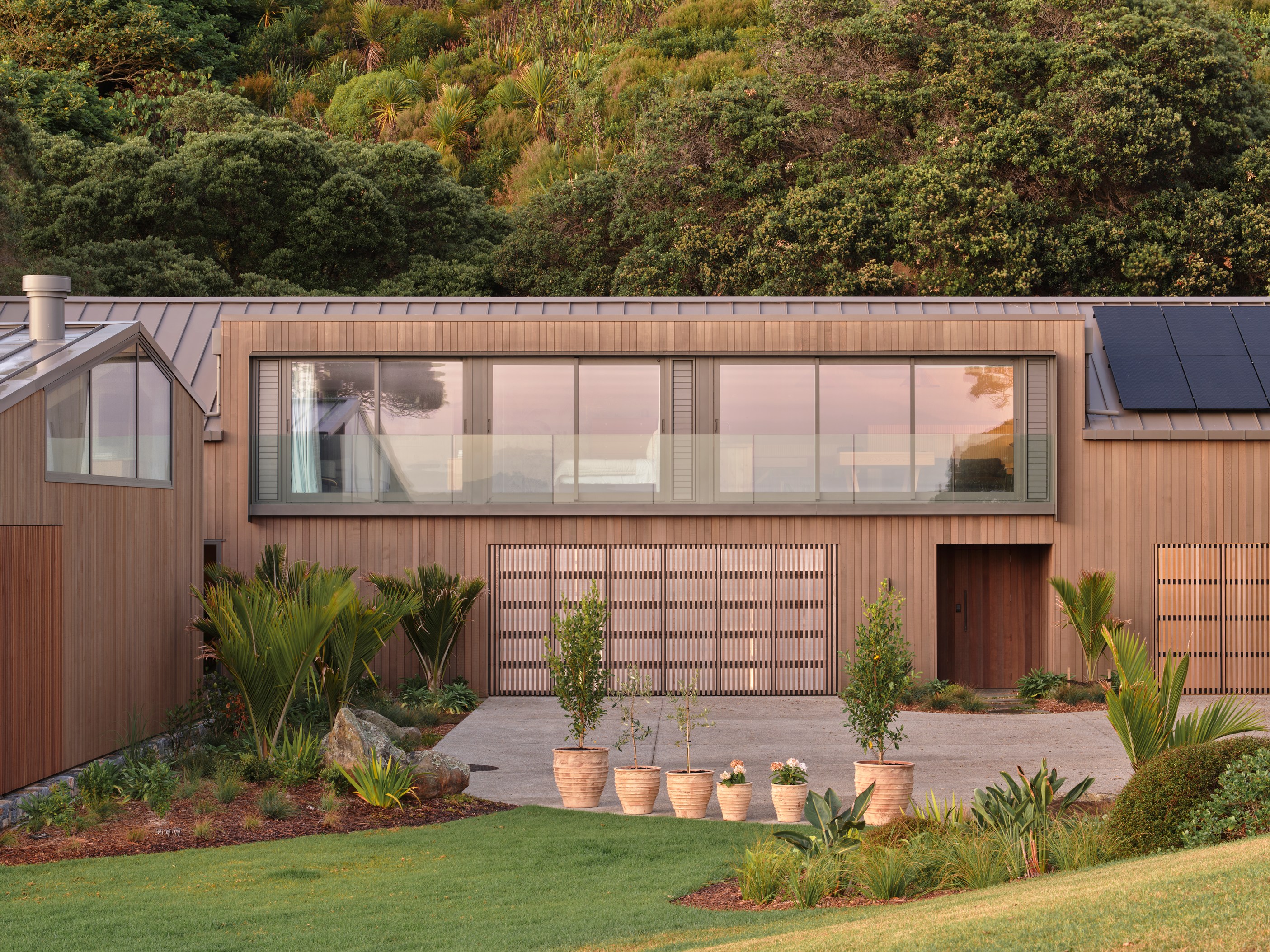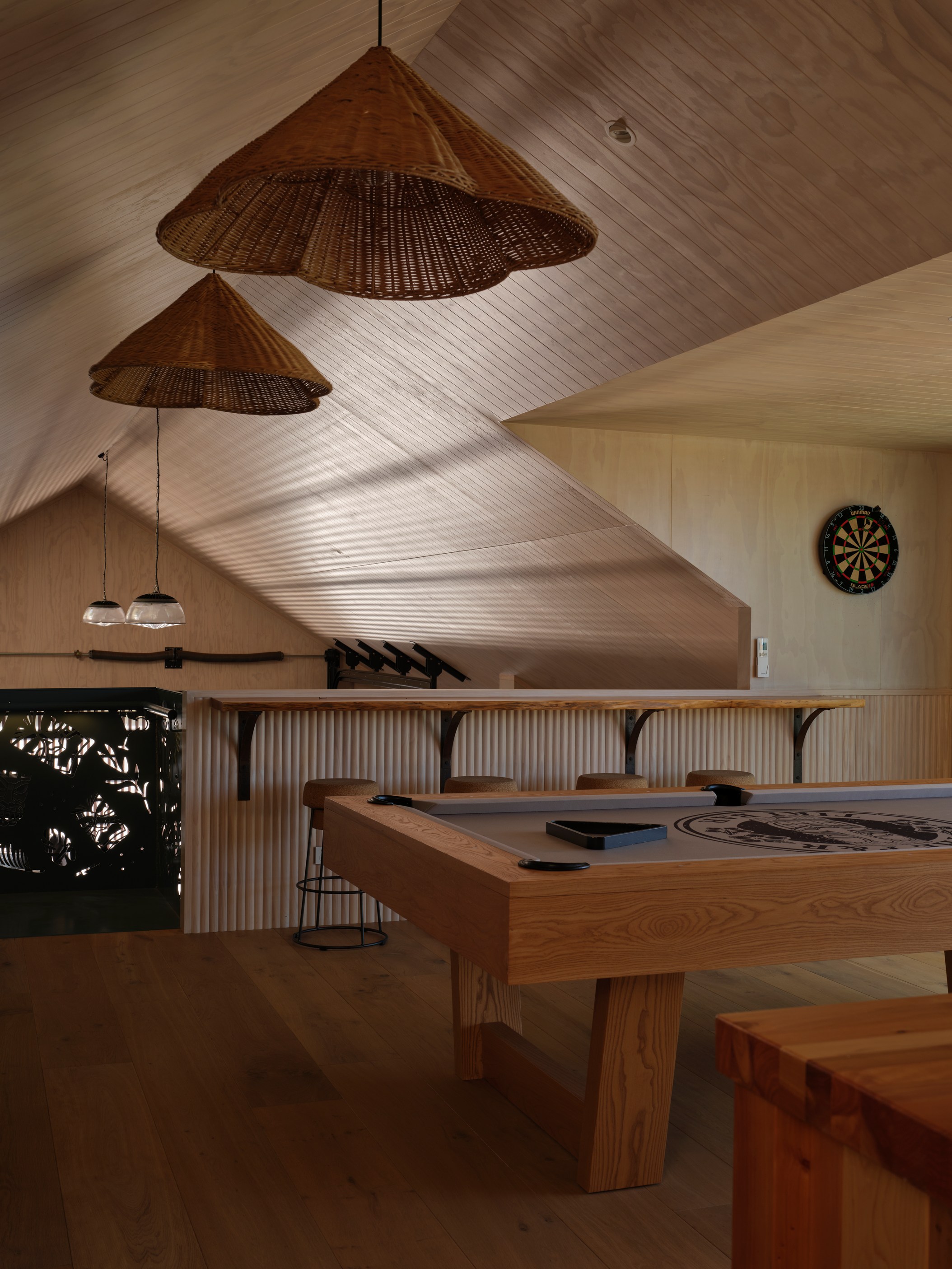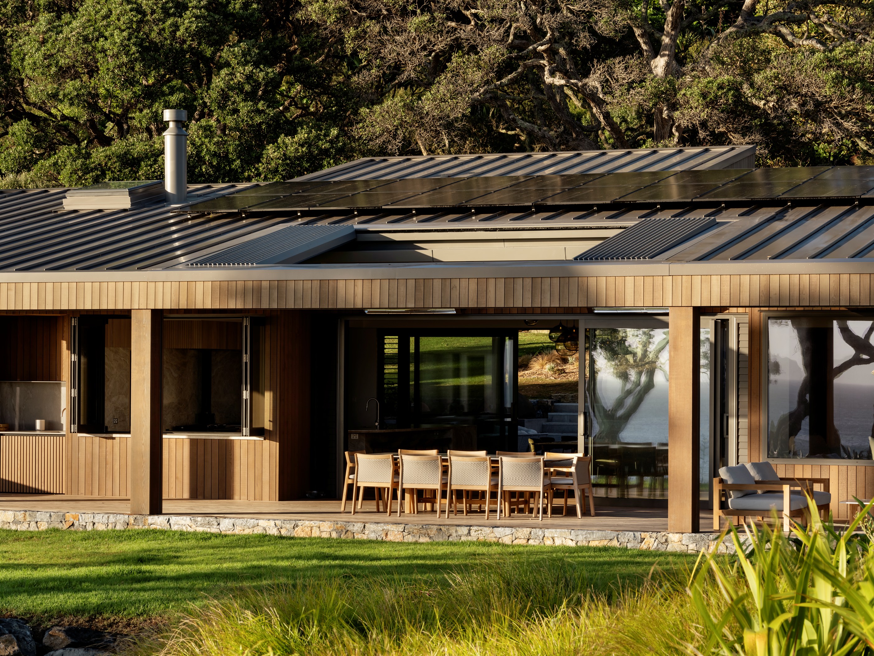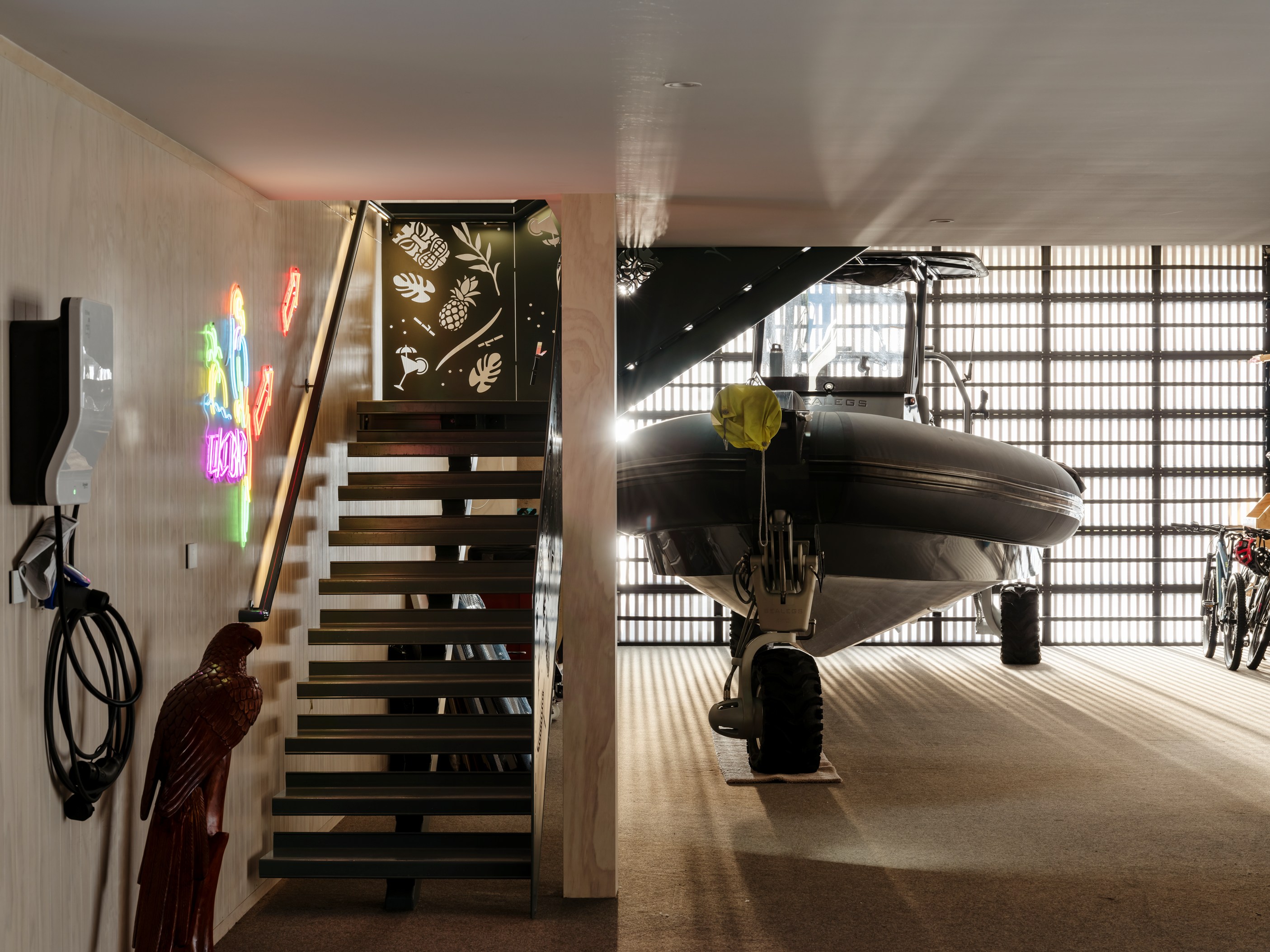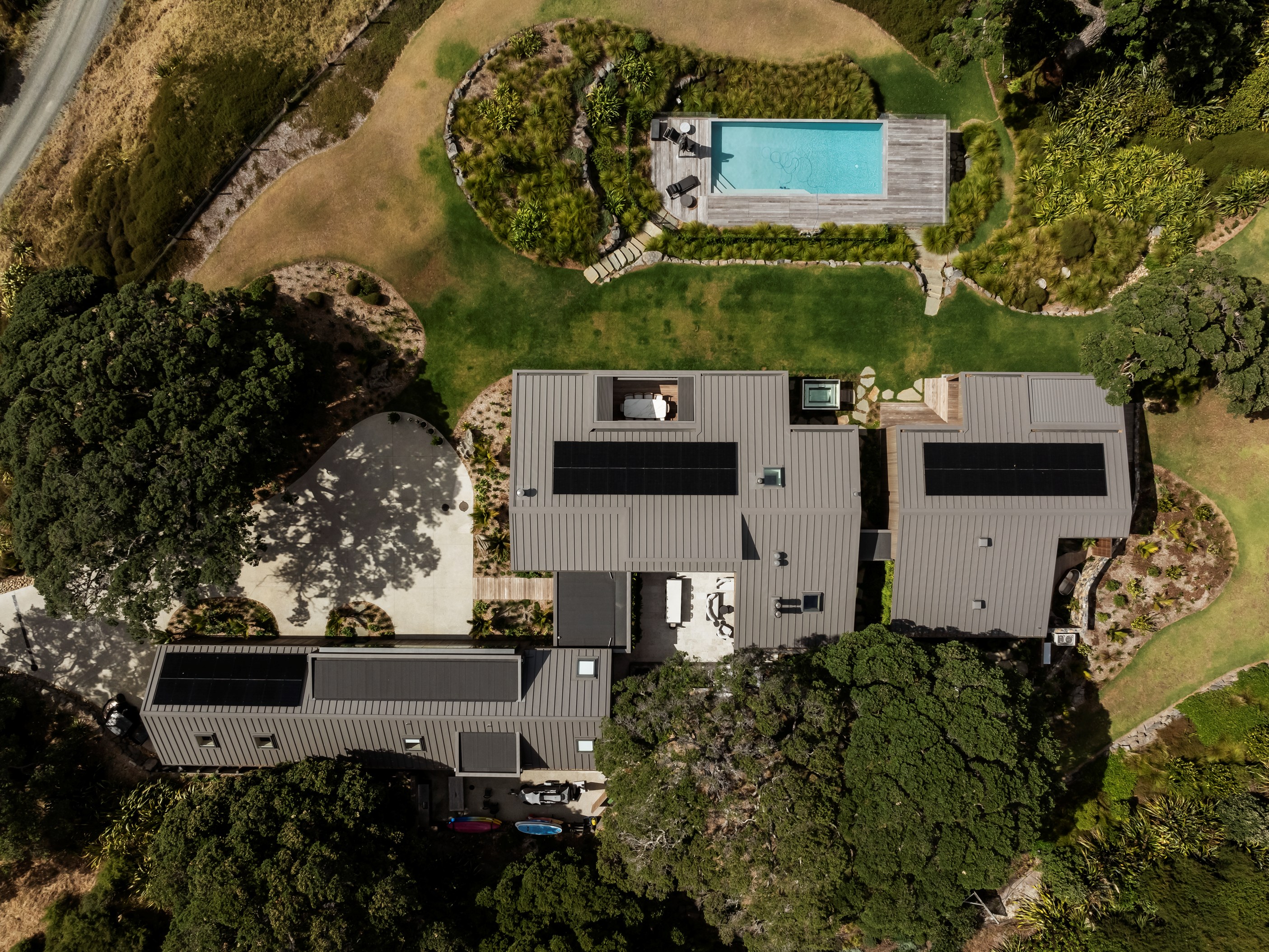 The main house also has a media room, art studio and more bedrooms, including a main bedroom retreat with a secluded outdoor bathroom extending from the ensuite. One wing has been dubbed ‘the boat shed’, a name that refers to its inspiration, but doesn’t do justice to the two-floor structure. Yes, this is a place for boats as well as cars, bikes and a solar plant, but you’ll also find a tiki bar, living space and two-bedroom guest accommodation with a bathroom, lounge and mezzanine floor with pool table. Given this is the clients’ forever dream home, sustainability and self-sufficiency were a must, hence the solar battery bank, onsite wastewatertreatment system and rainwater harvesting.