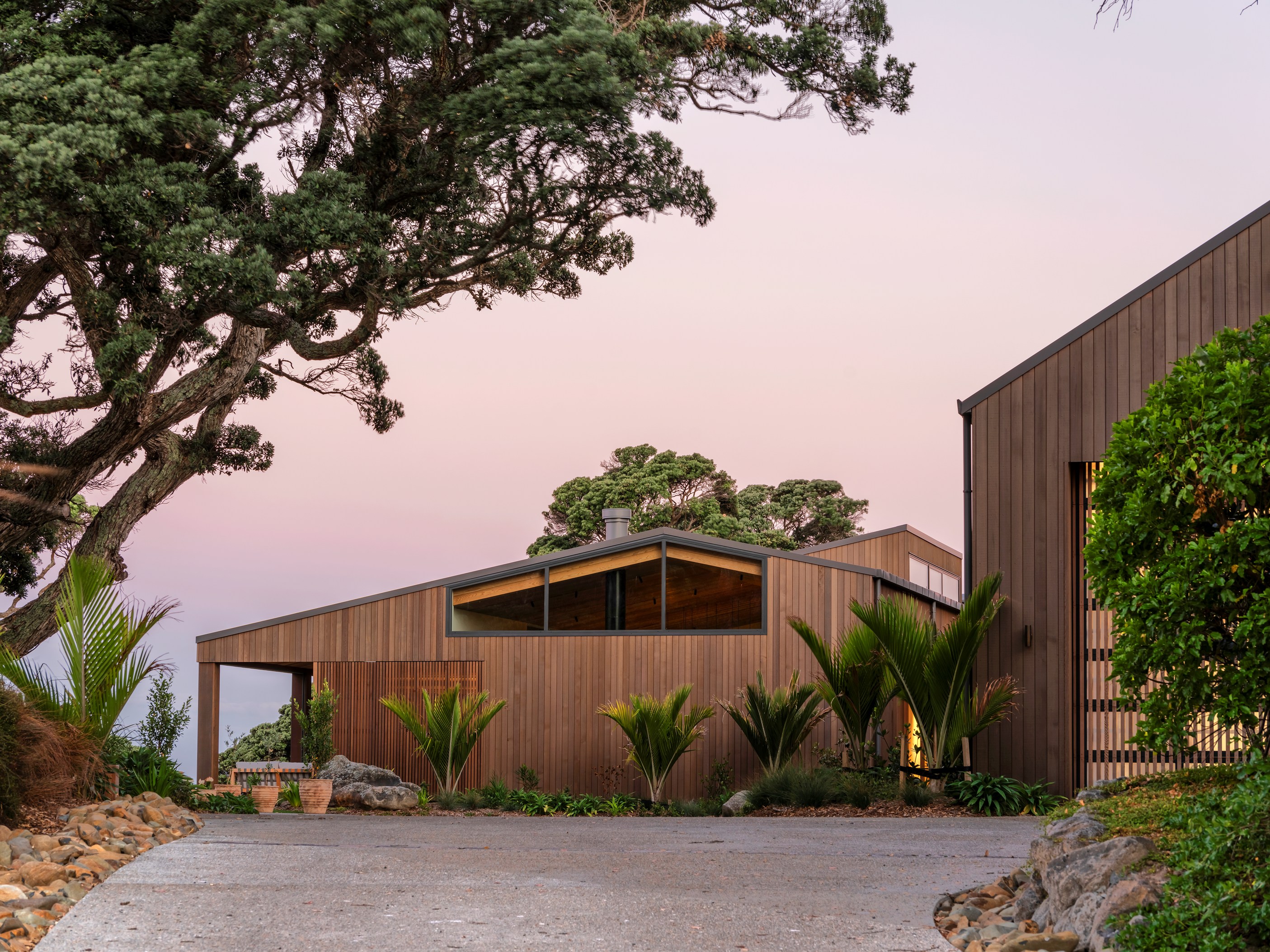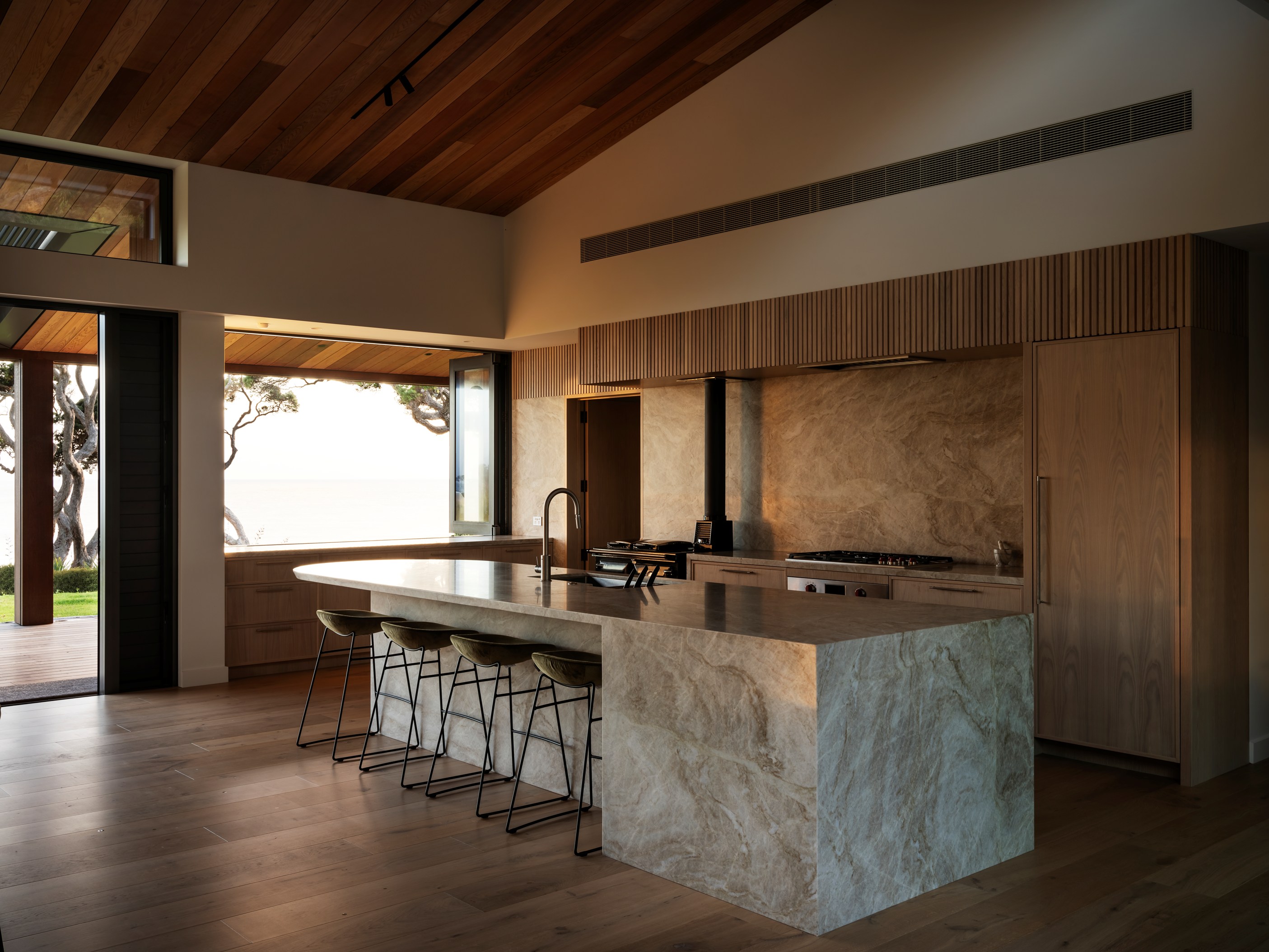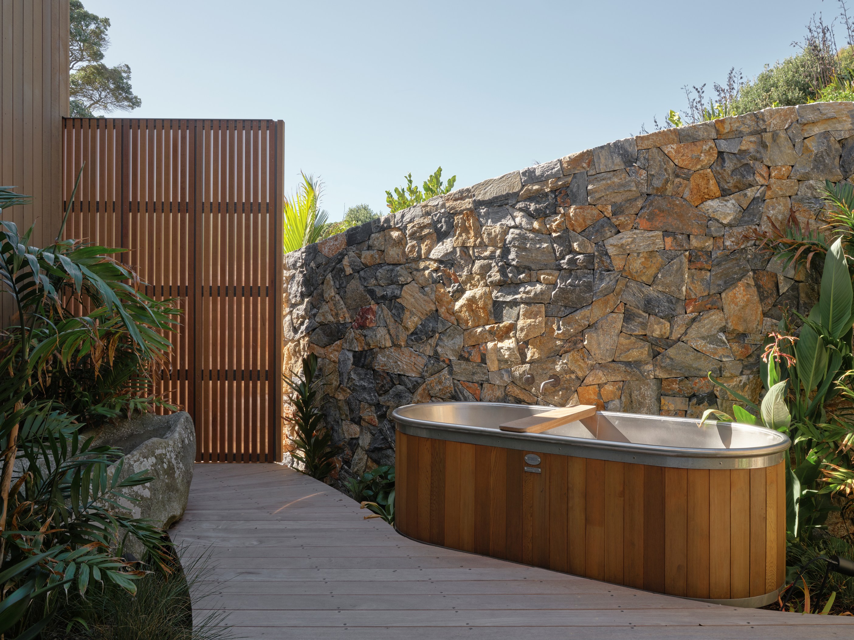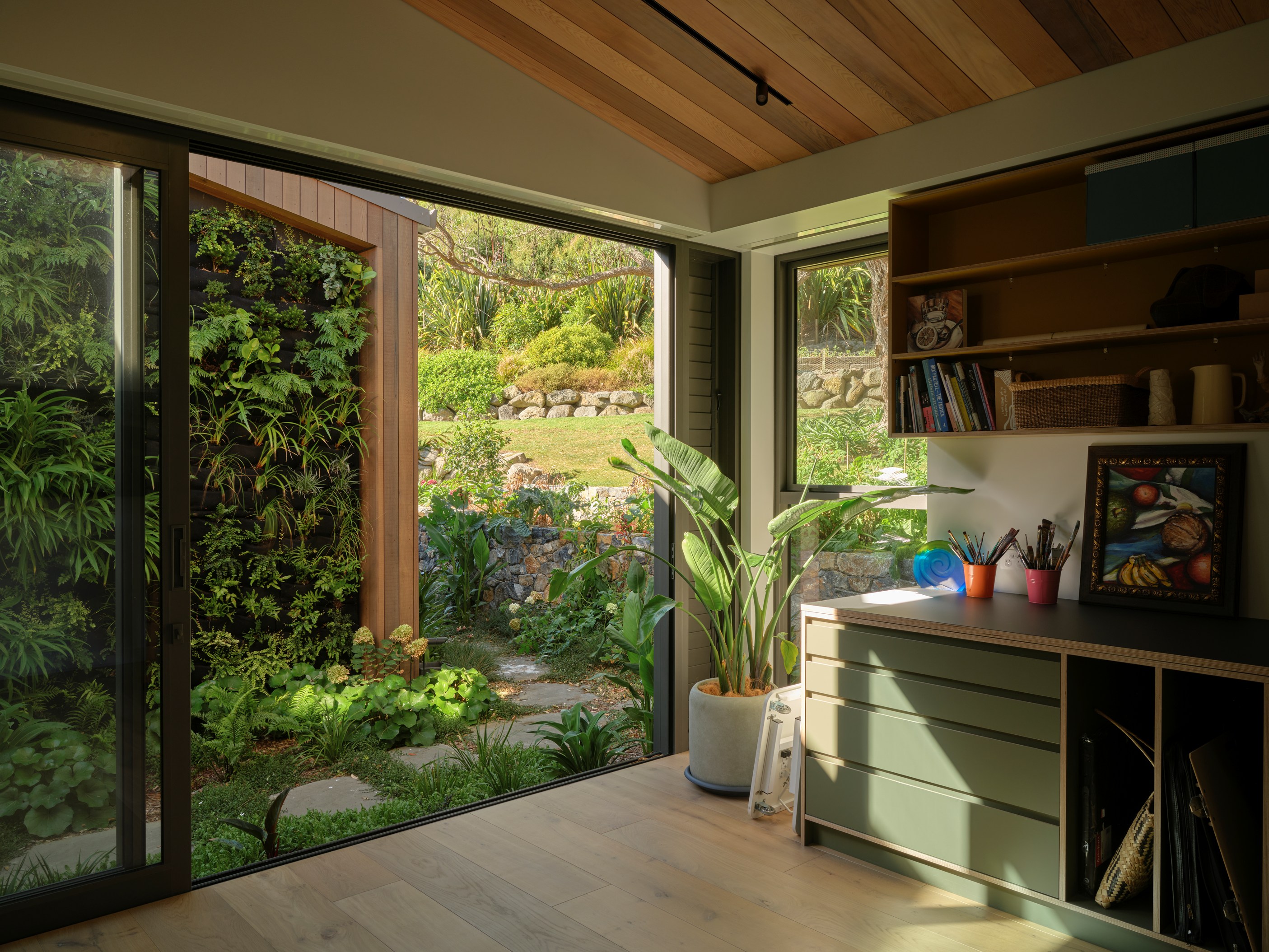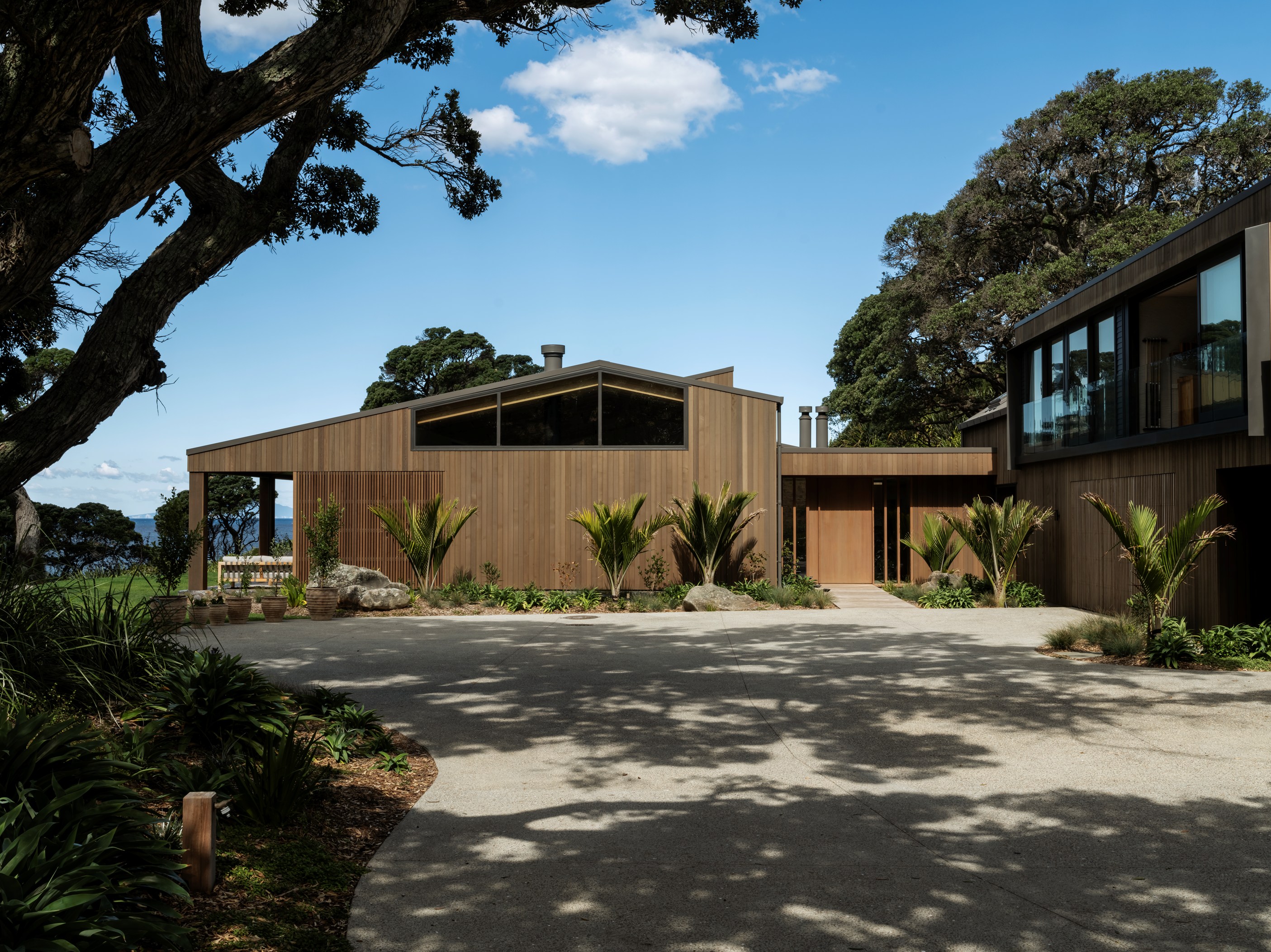 The main house also has a media room, art studio and more bedrooms, including a main bedroom retreat with a secluded outdoor bathroom extending from the ensuite. One wing has been dubbed ‘the boat shed’, a name that refers to its inspiration, but doesn’t do justice to the two-floor structure. Yes, this is a place for boats as well as cars, bikes and a solar plant, but you’ll also find a tiki bar, living space and two-bedroom guest accommodation with a bathroom, lounge and mezzanine floor with pool table. Given this is the clients’ forever dream home, sustainability and self-sufficiency were a must, hence the solar battery bank, onsite wastewatertreatment system and rainwater harvesting.