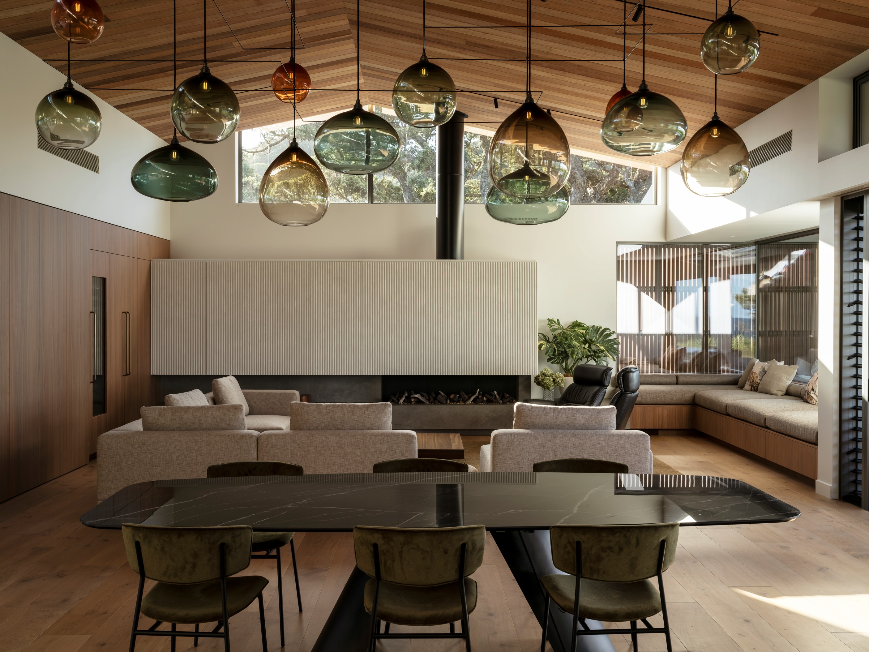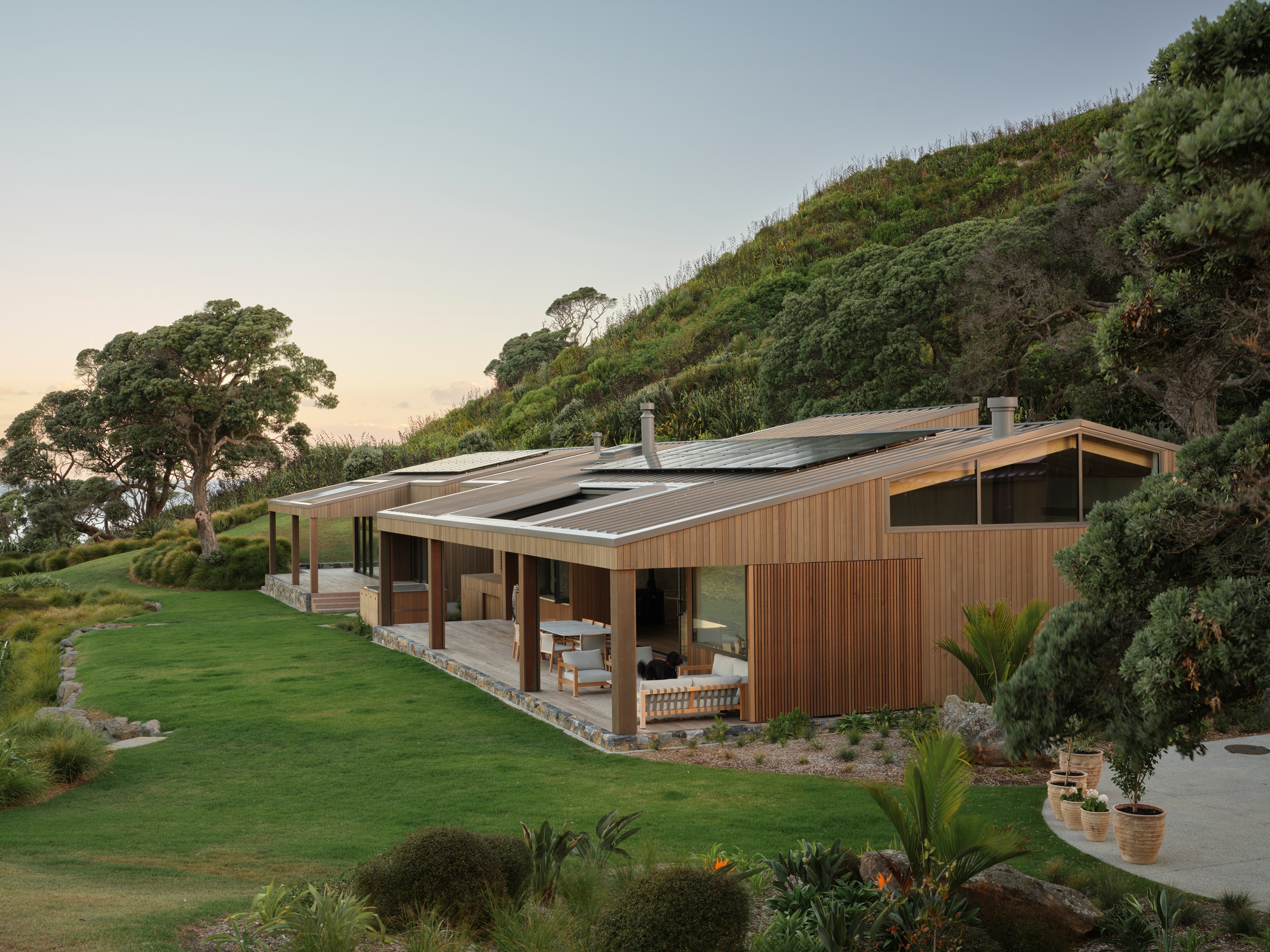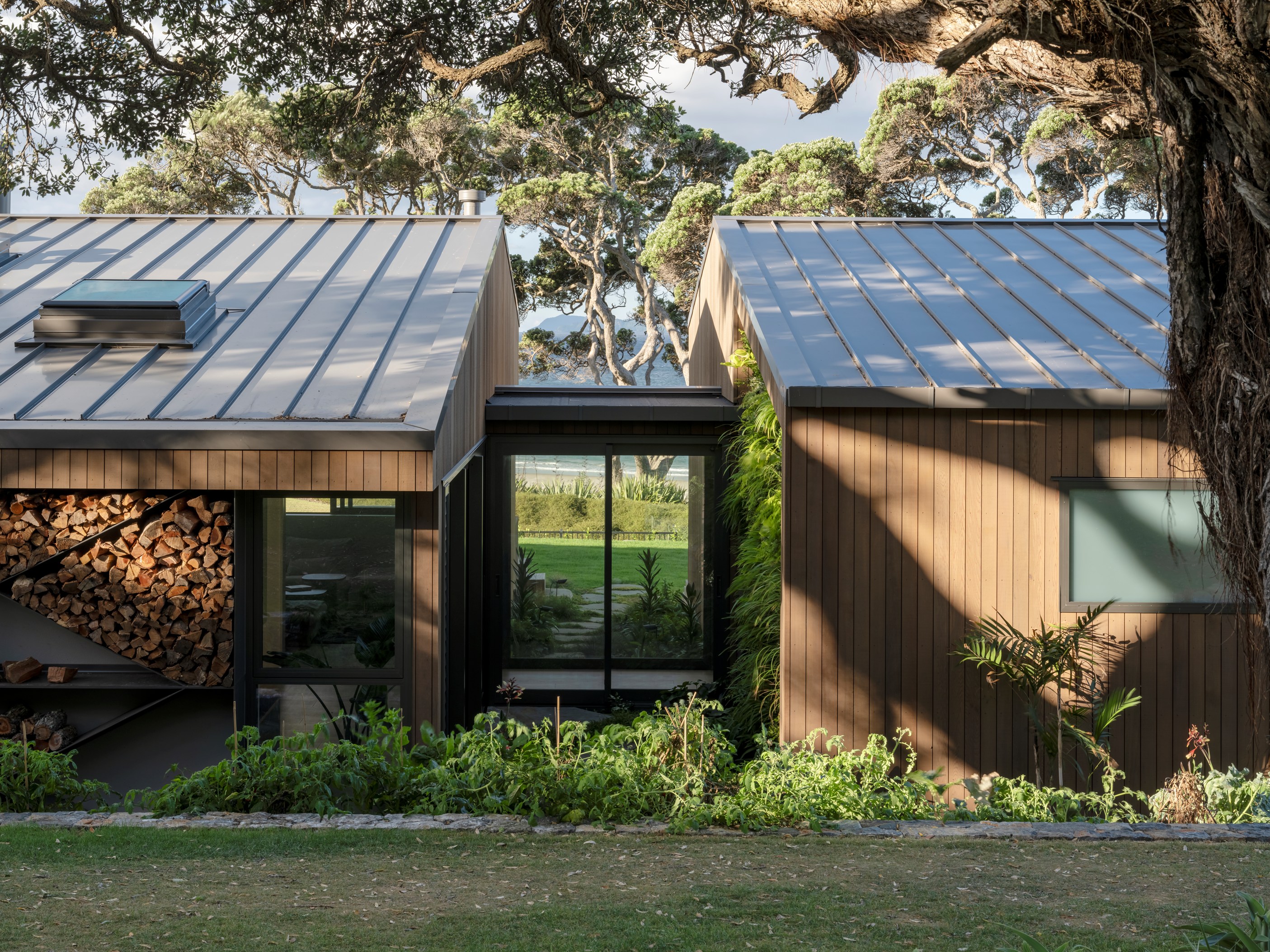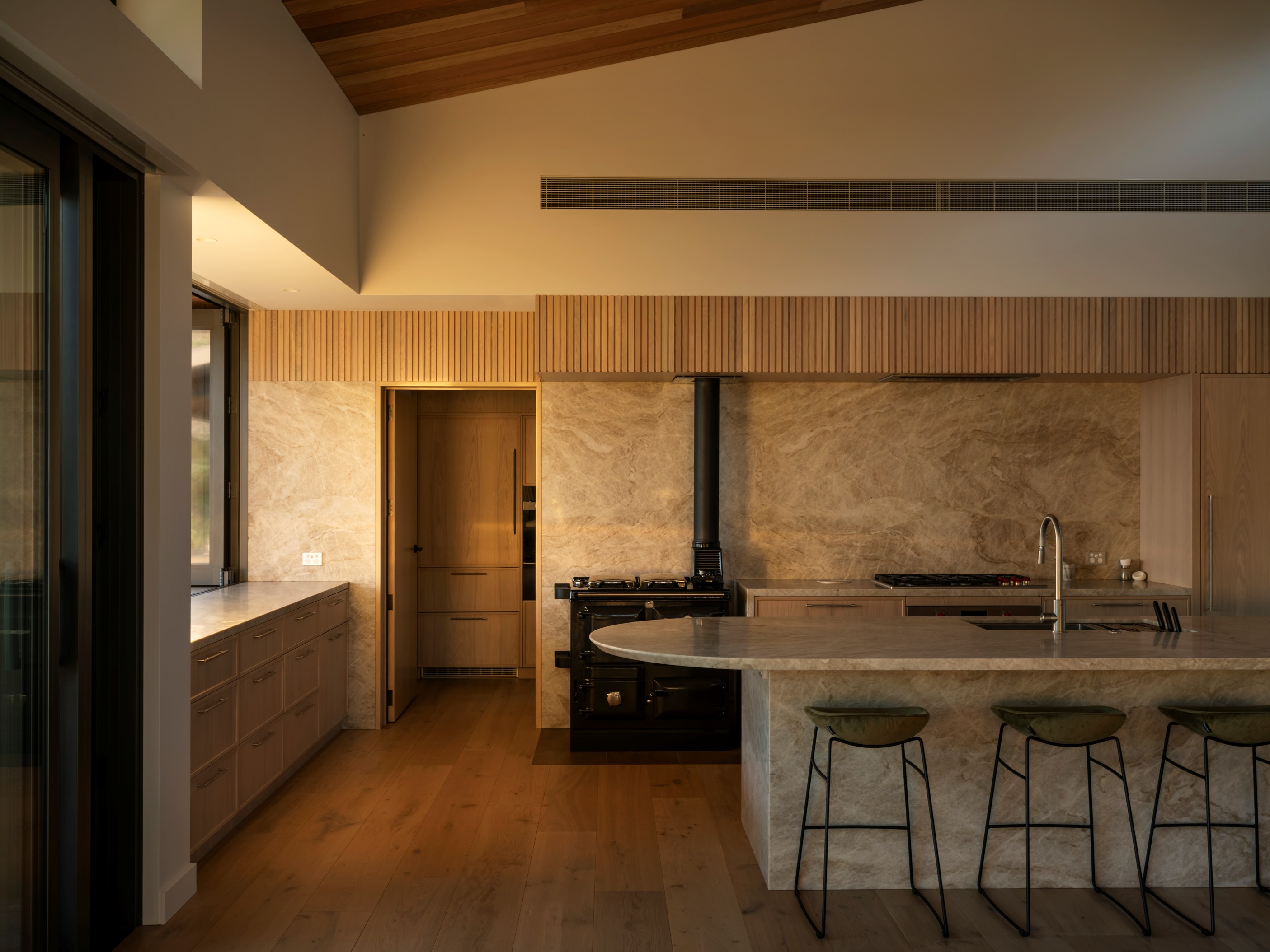 The main house also has a media room, art studio and more bedrooms, including a main bedroom retreat with a secluded outdoor bathroom extending from the ensuite. One wing has been dubbed ‘the boat shed’, a name that refers to its inspiration, but doesn’t do justice to the two-floor structure. Yes, this is a place for boats as well as cars, bikes and a solar plant, but you’ll also find a tiki bar, living space and two-bedroom guest accommodation with a bathroom, lounge and mezzanine floor with pool table. Given this is the clients’ forever dream home, sustainability and self-sufficiency were a must, hence the solar battery bank, onsite wastewatertreatment system and rainwater harvesting.