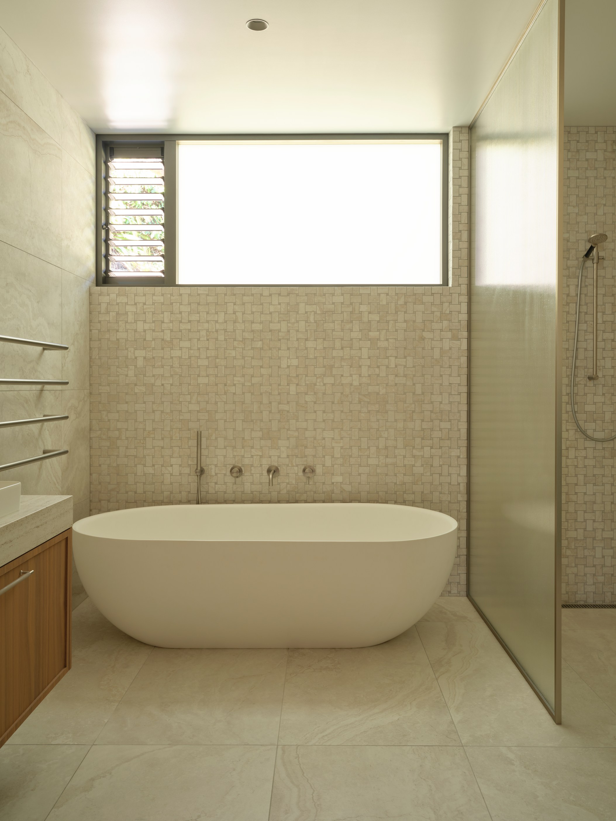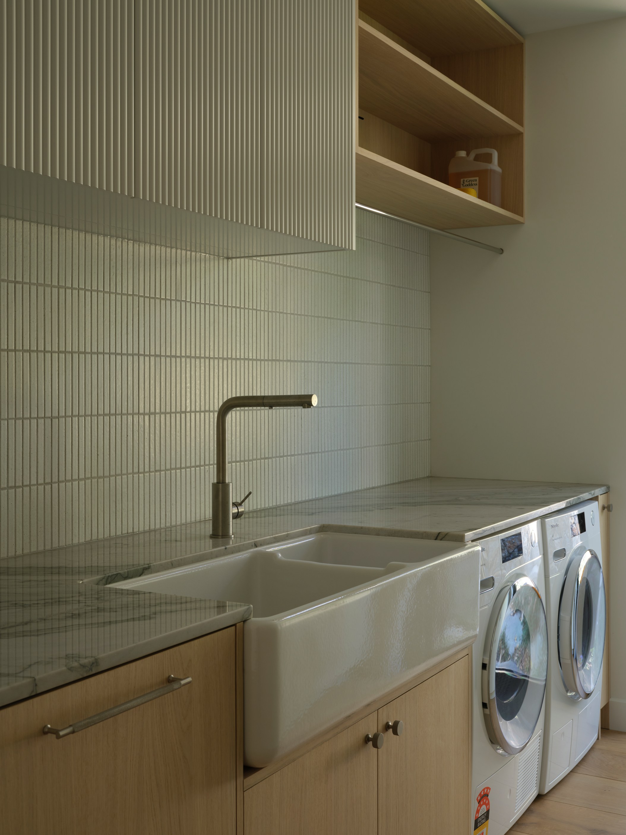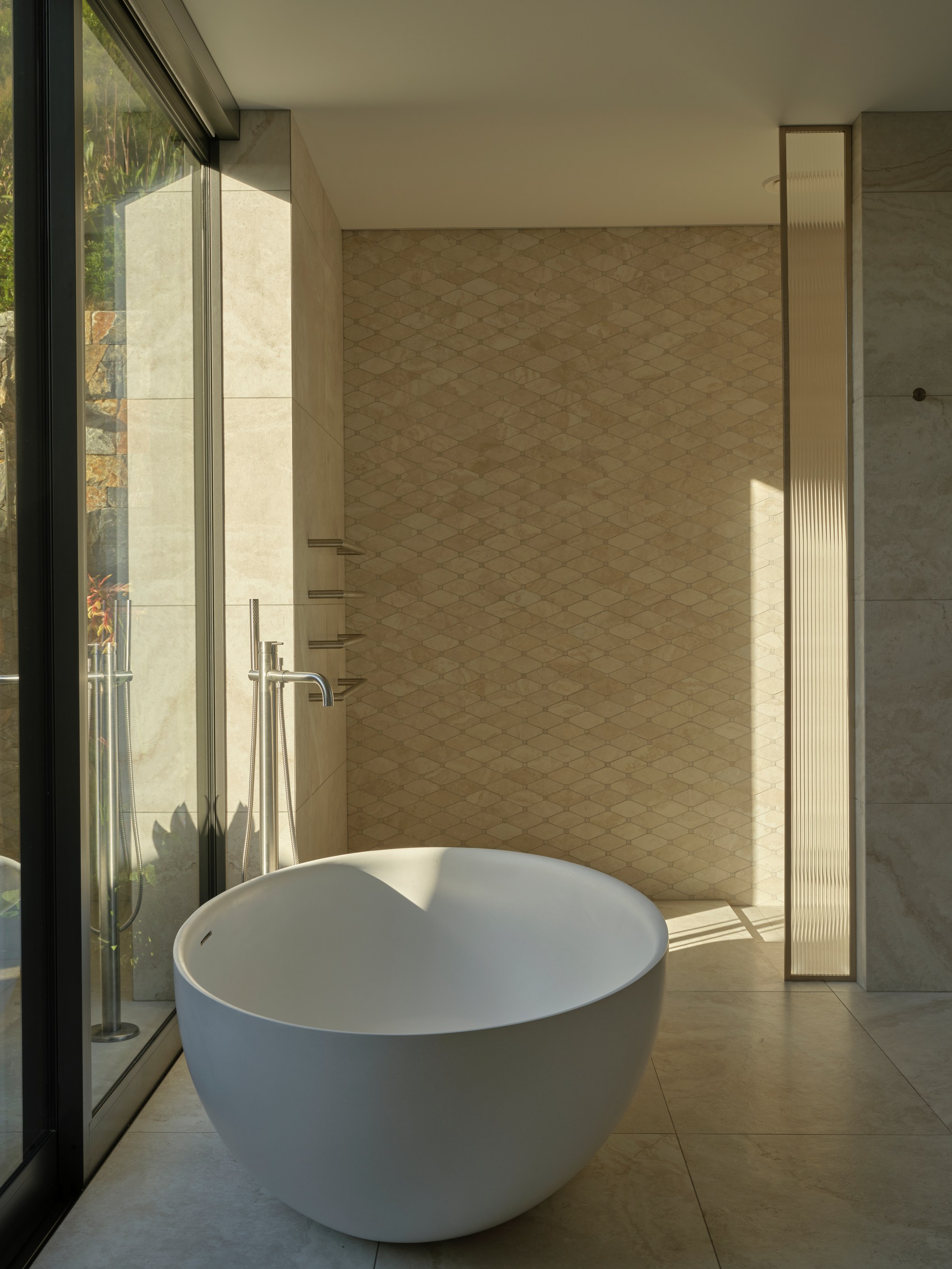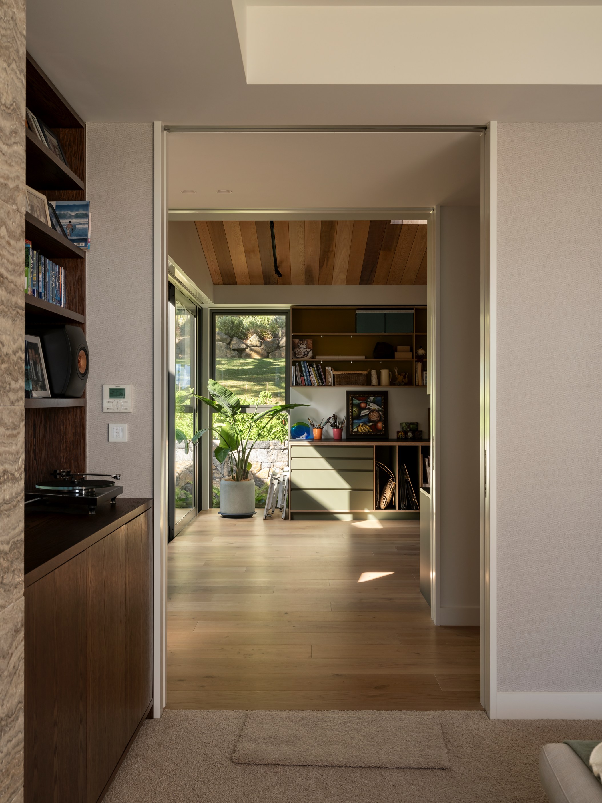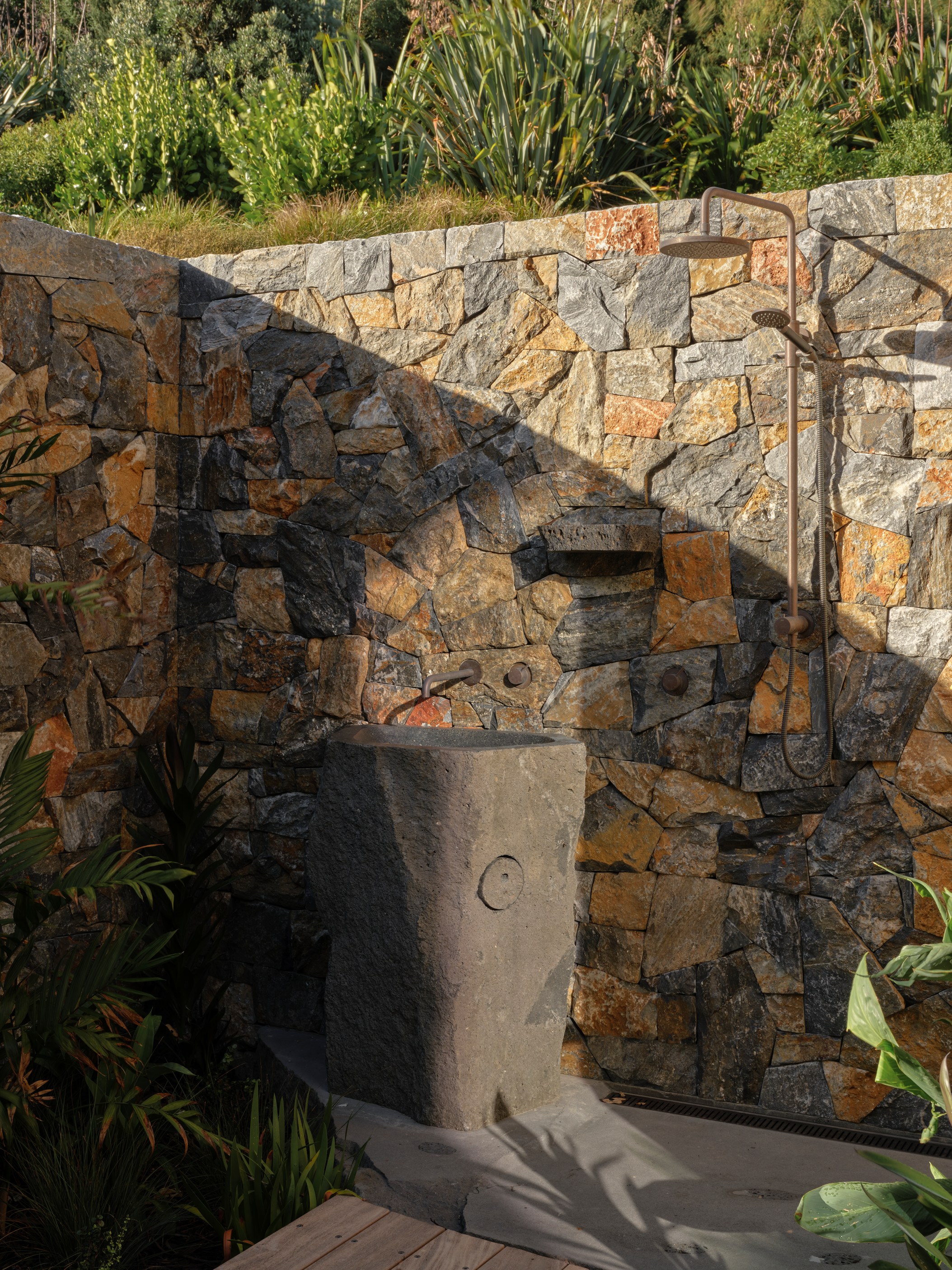 The main house also has a media room, art studio and more bedrooms, including a main bedroom retreat with a secluded outdoor bathroom extending from the ensuite. One wing has been dubbed ‘the boat shed’, a name that refers to its inspiration, but doesn’t do justice to the two-floor structure. Yes, this is a place for boats as well as cars, bikes and a solar plant, but you’ll also find a tiki bar, living space and two-bedroom guest accommodation with a bathroom, lounge and mezzanine floor with pool table. Given this is the clients’ forever dream home, sustainability and self-sufficiency were a must, hence the solar battery bank, onsite wastewatertreatment system and rainwater harvesting.