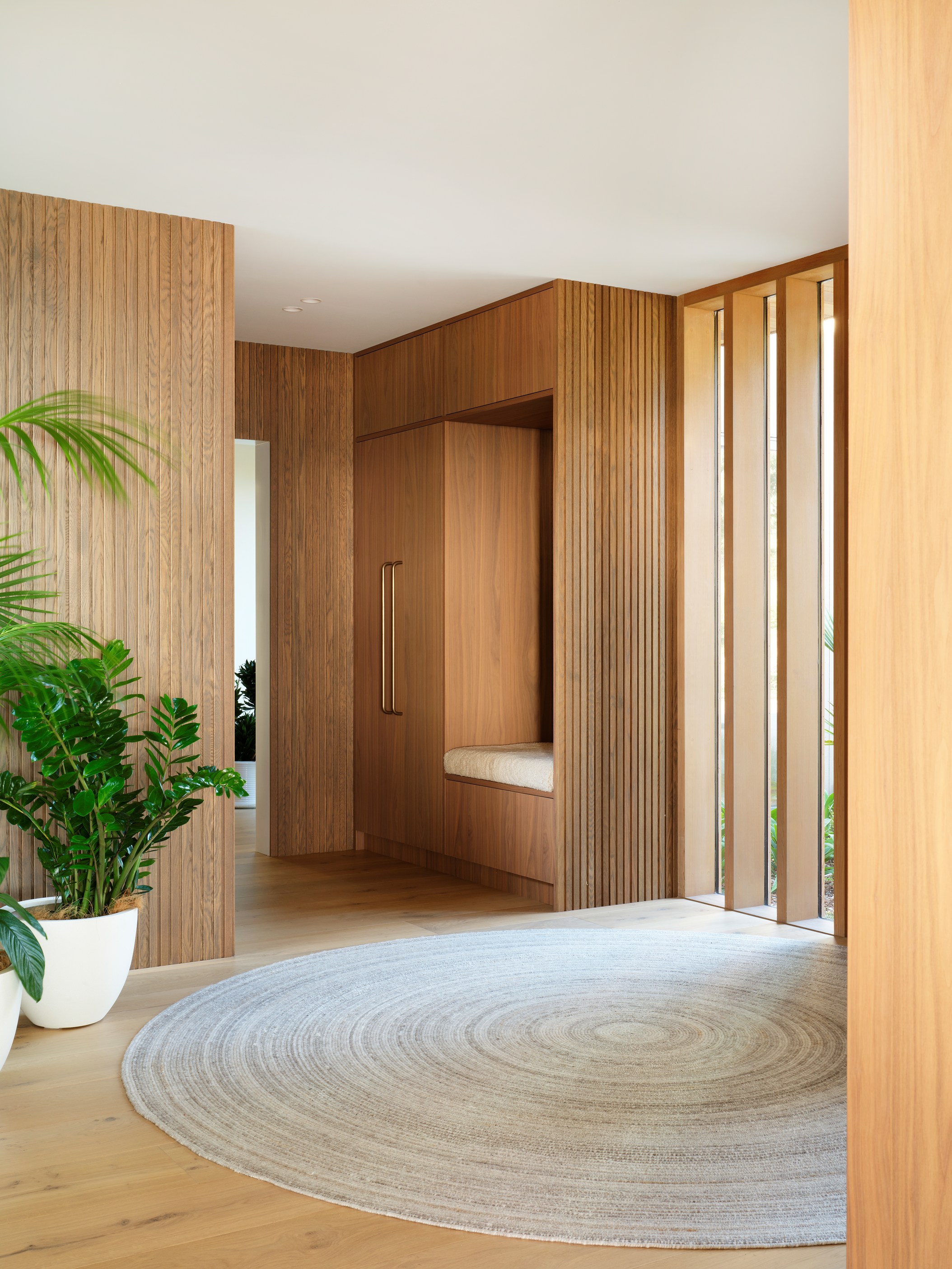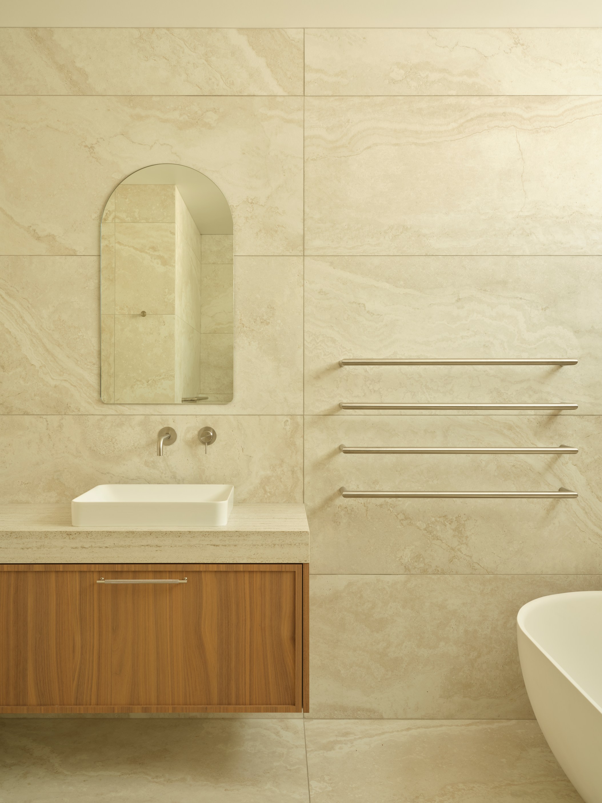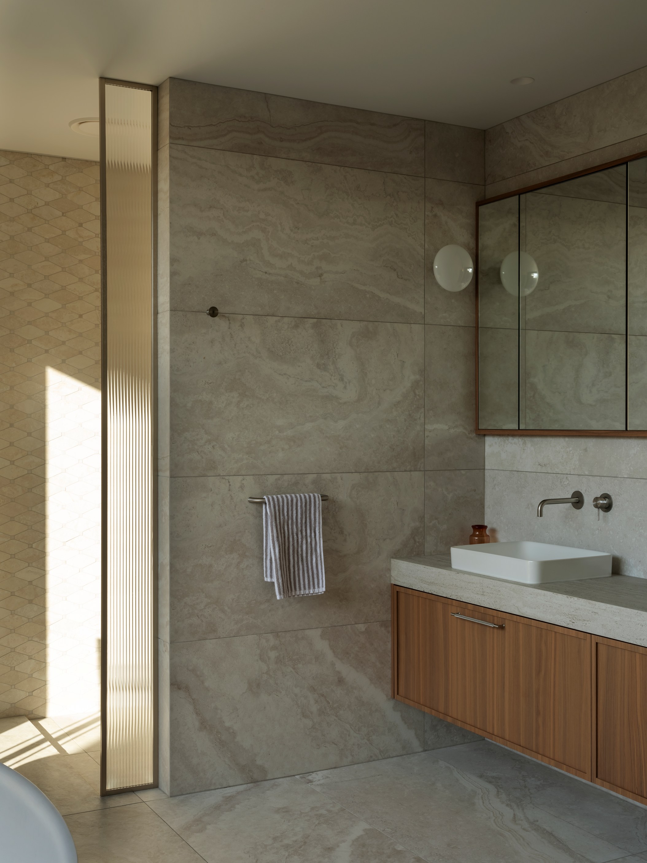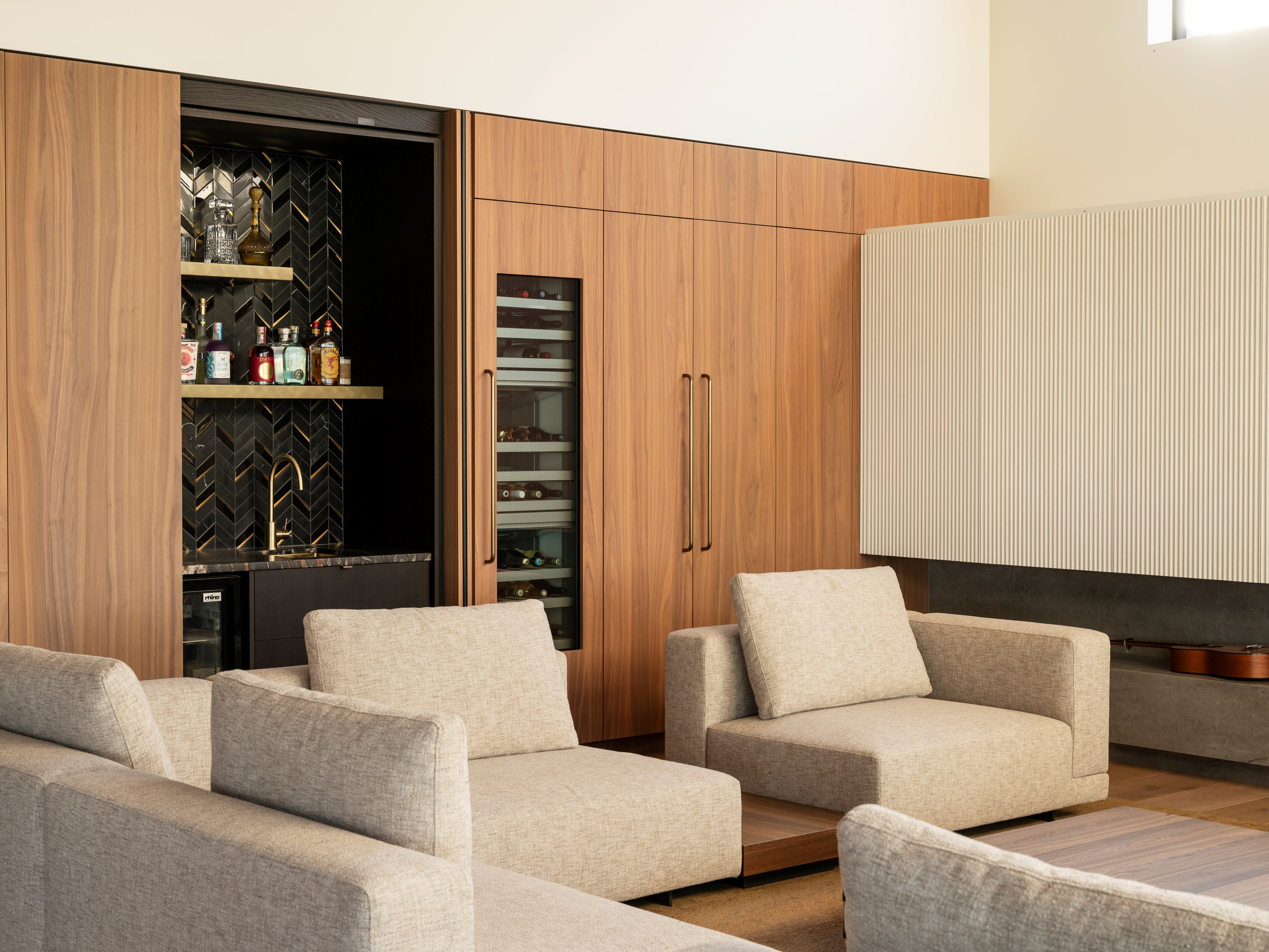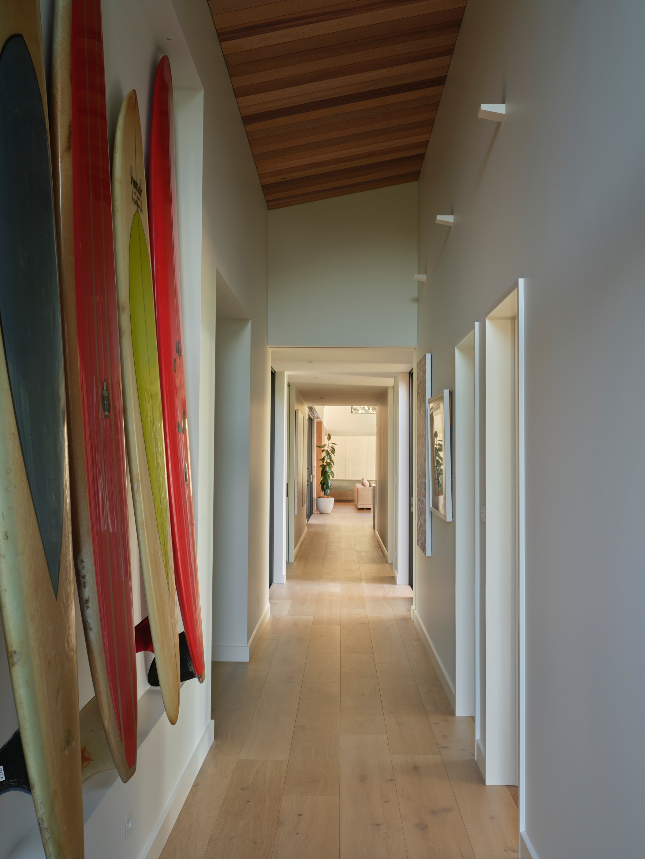 The main house also has a media room, art studio and more bedrooms, including a main bedroom retreat with a secluded outdoor bathroom extending from the ensuite. One wing has been dubbed ‘the boat shed’, a name that refers to its inspiration, but doesn’t do justice to the two-floor structure. Yes, this is a place for boats as well as cars, bikes and a solar plant, but you’ll also find a tiki bar, living space and two-bedroom guest accommodation with a bathroom, lounge and mezzanine floor with pool table. Given this is the clients’ forever dream home, sustainability and self-sufficiency were a must, hence the solar battery bank, onsite wastewatertreatment system and rainwater harvesting.