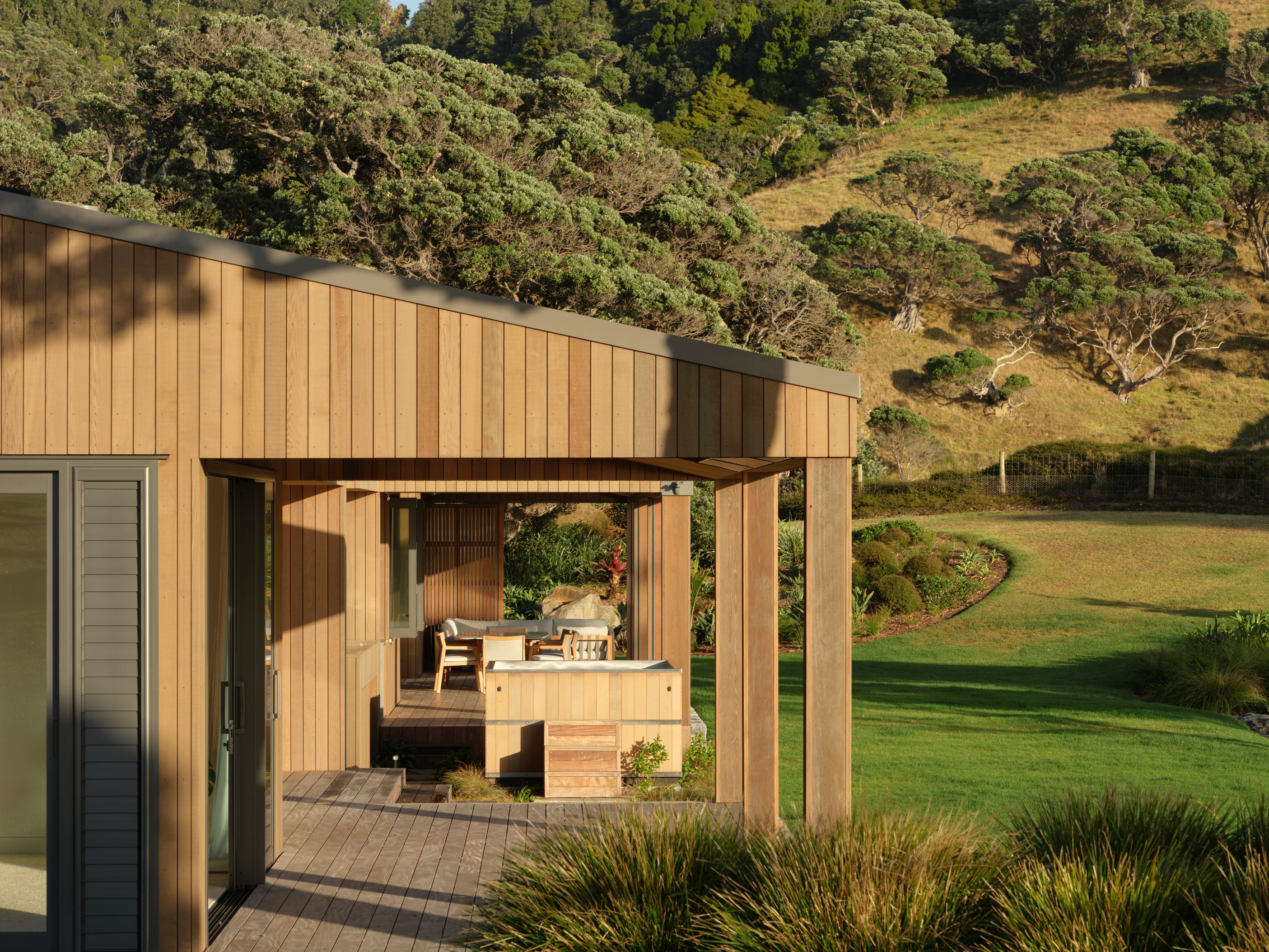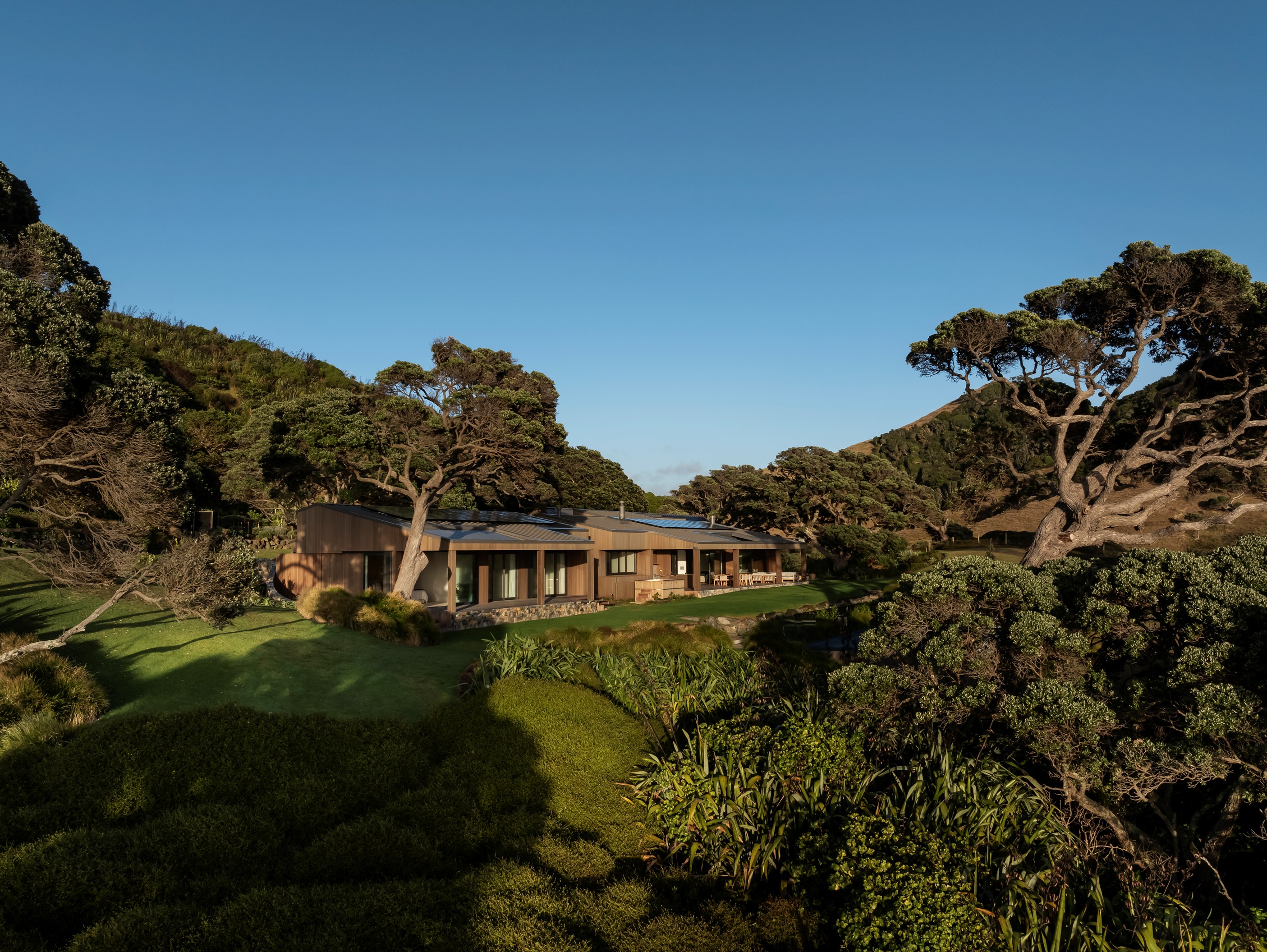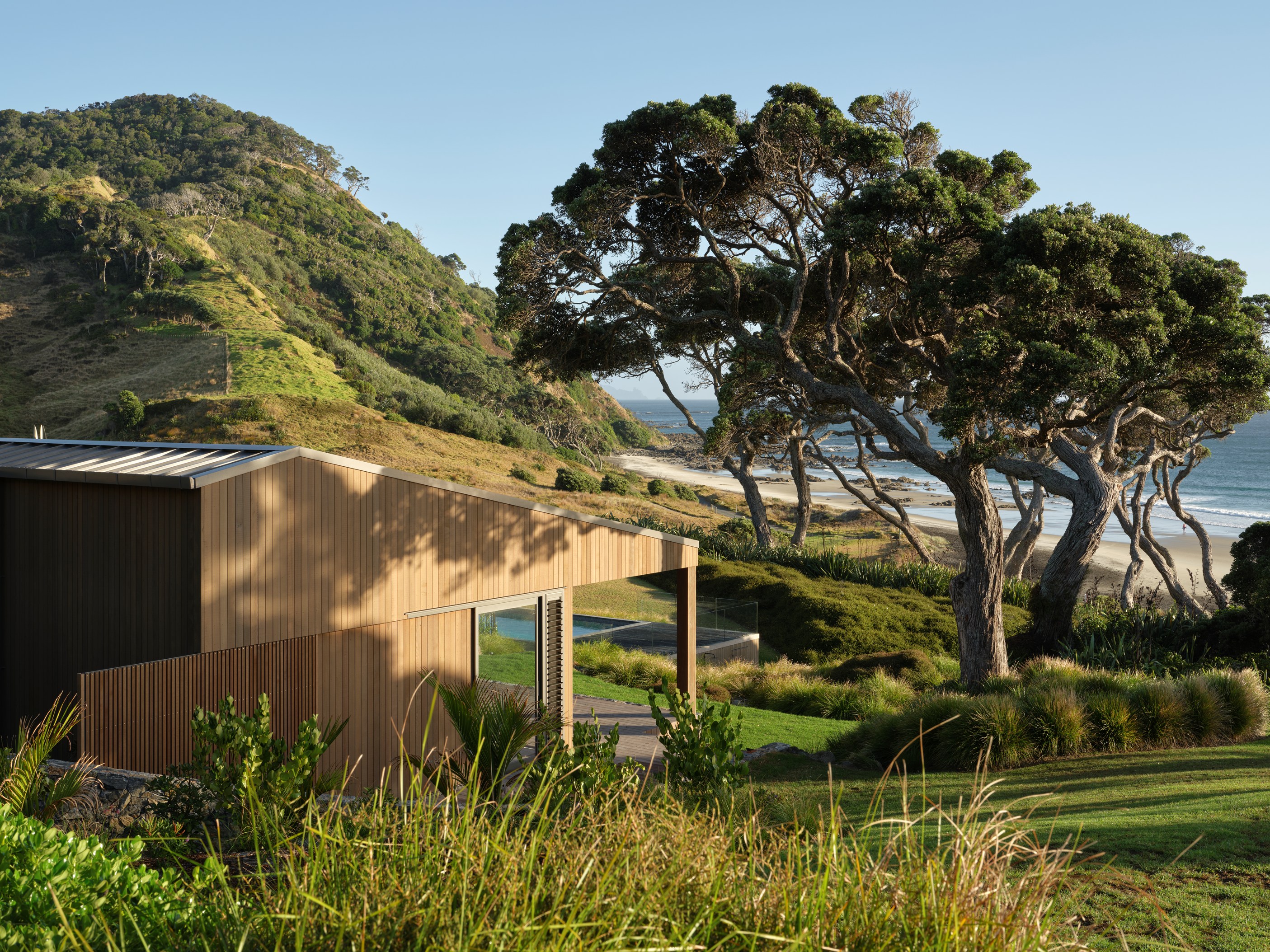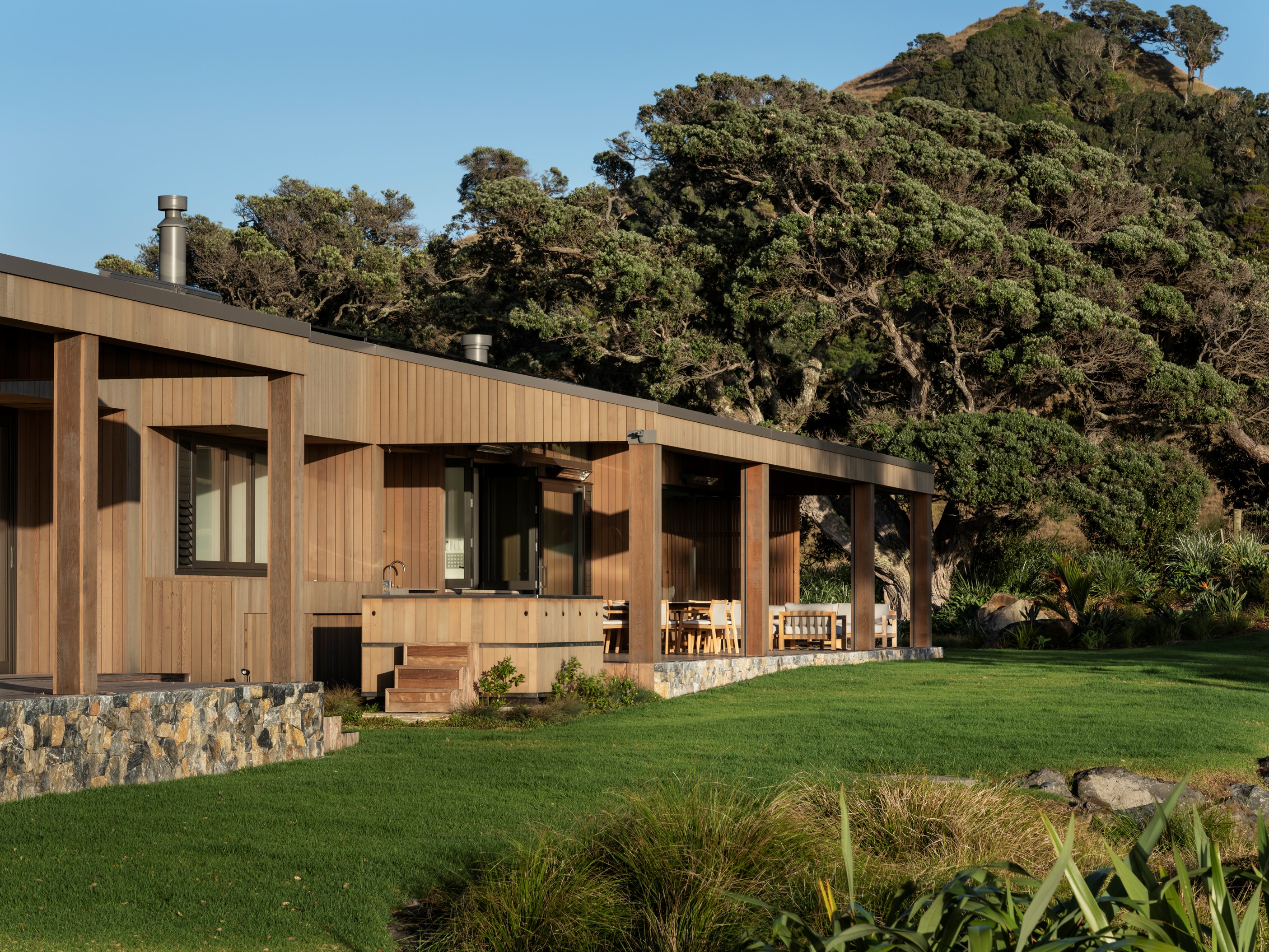 Luxury meets low-key in this tranquil coastal hideaway. At 750sqm, this is an epic build — not that you’d know it. The timber-clad beach house, sited well back from sand dunes and beside 150-year-old pōhutukawa, is at one with its spectacular Northland location. It has been designed and crafted to provide a sanctuary for its owners, without vying for attention, and it does both with understated style. The star of the main house is the grand room with built-in bar, designer kitchen, and dining and living spaces that ease outdoors on both sides. In fact, wherever you look you’ll see dreamy places in which to relax or entertain — outdoor kitchens, open decks, a heated pool, spa, sauna and putting green.