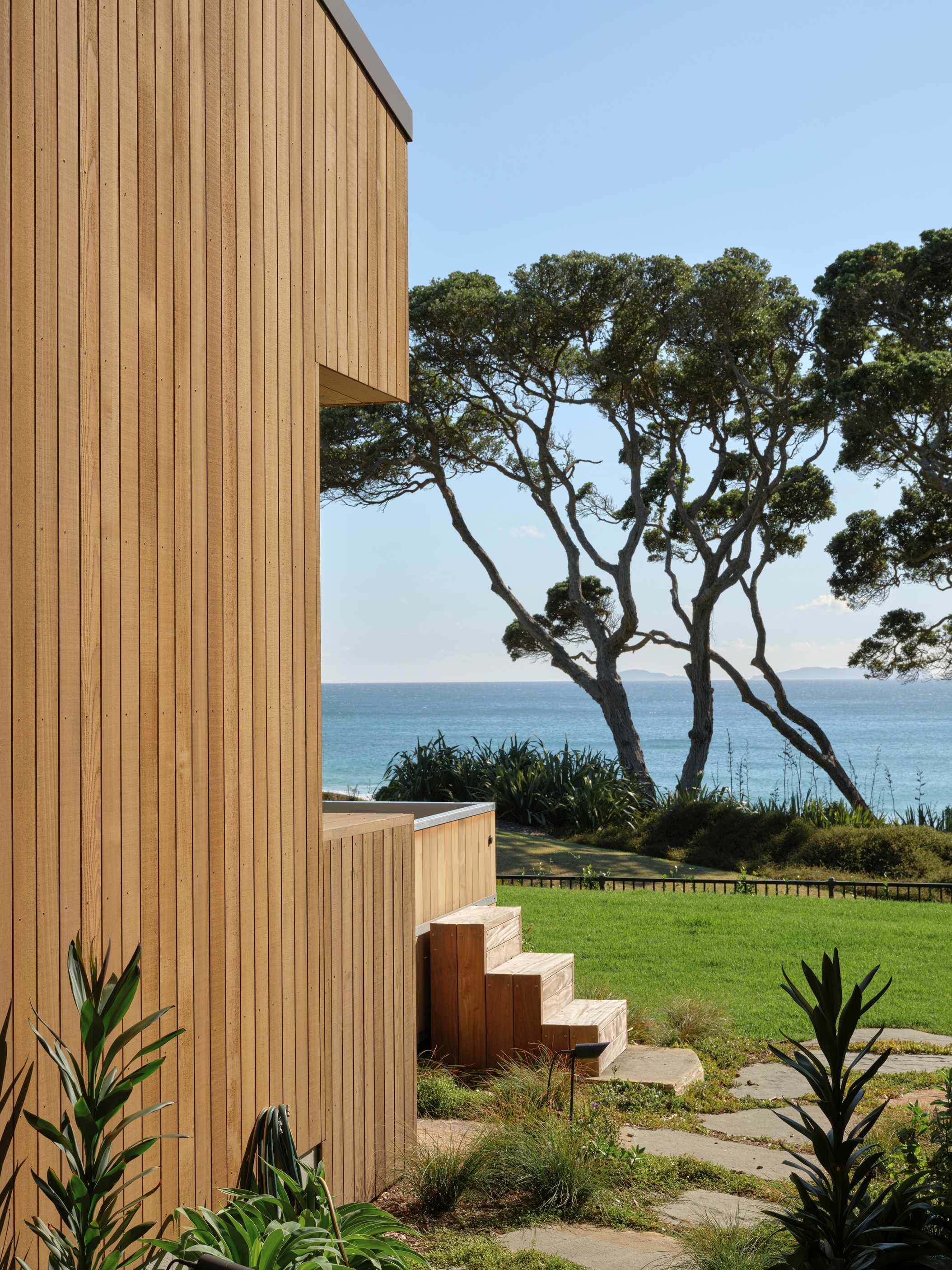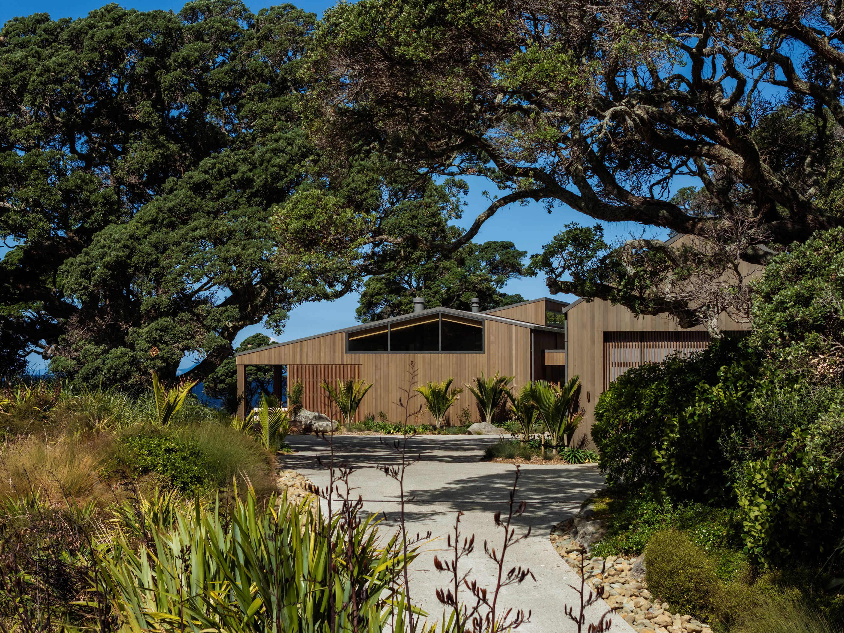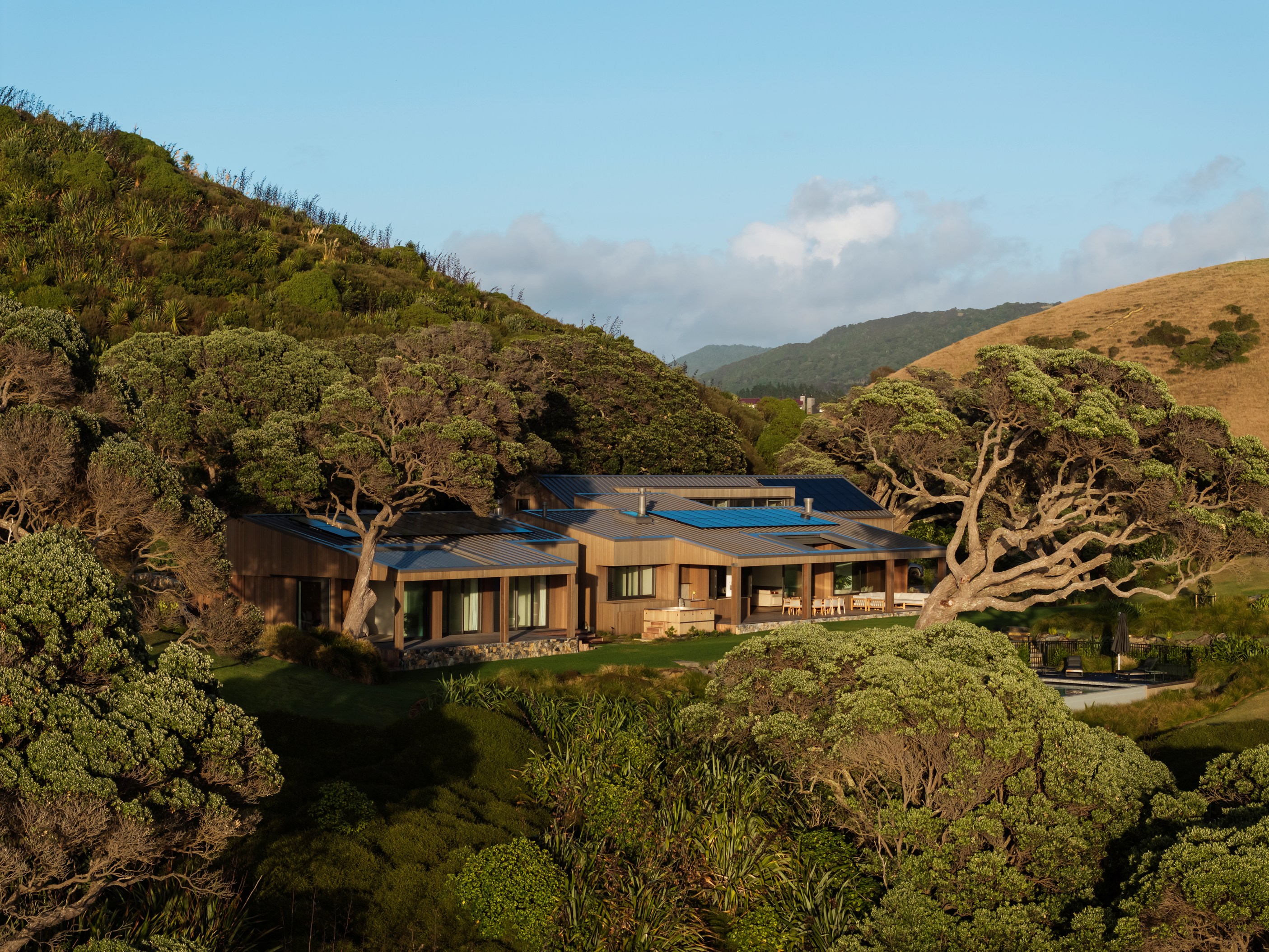 Luxury meets low-key in this tranquil coastal hideaway. At 750sqm, this is an epic build — not that you’d know it. The timber-clad beach house, sited well back from sand dunes and beside 150-year-old pōhutukawa, is at one with its spectacular Northland location. It has been designed and crafted to provide a sanctuary for its owners, without vying for attention, and it does both with understated style. The star of the main house is the grand room with built-in bar, designer kitchen, and dining and living spaces that ease outdoors on both sides. In fact, wherever you look you’ll see dreamy places in which to relax or entertain — outdoor kitchens, open decks, a heated pool, spa, sauna and putting green.