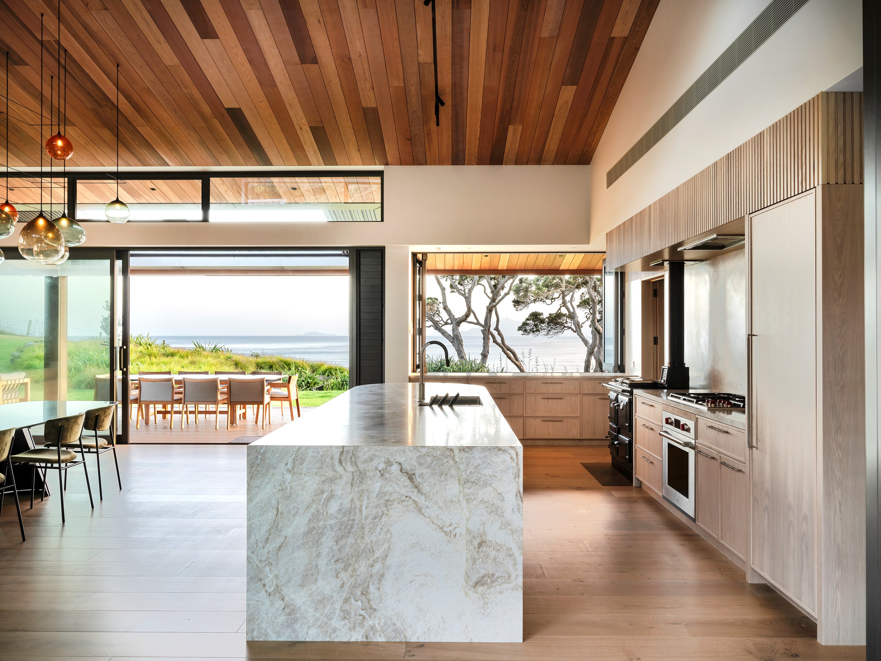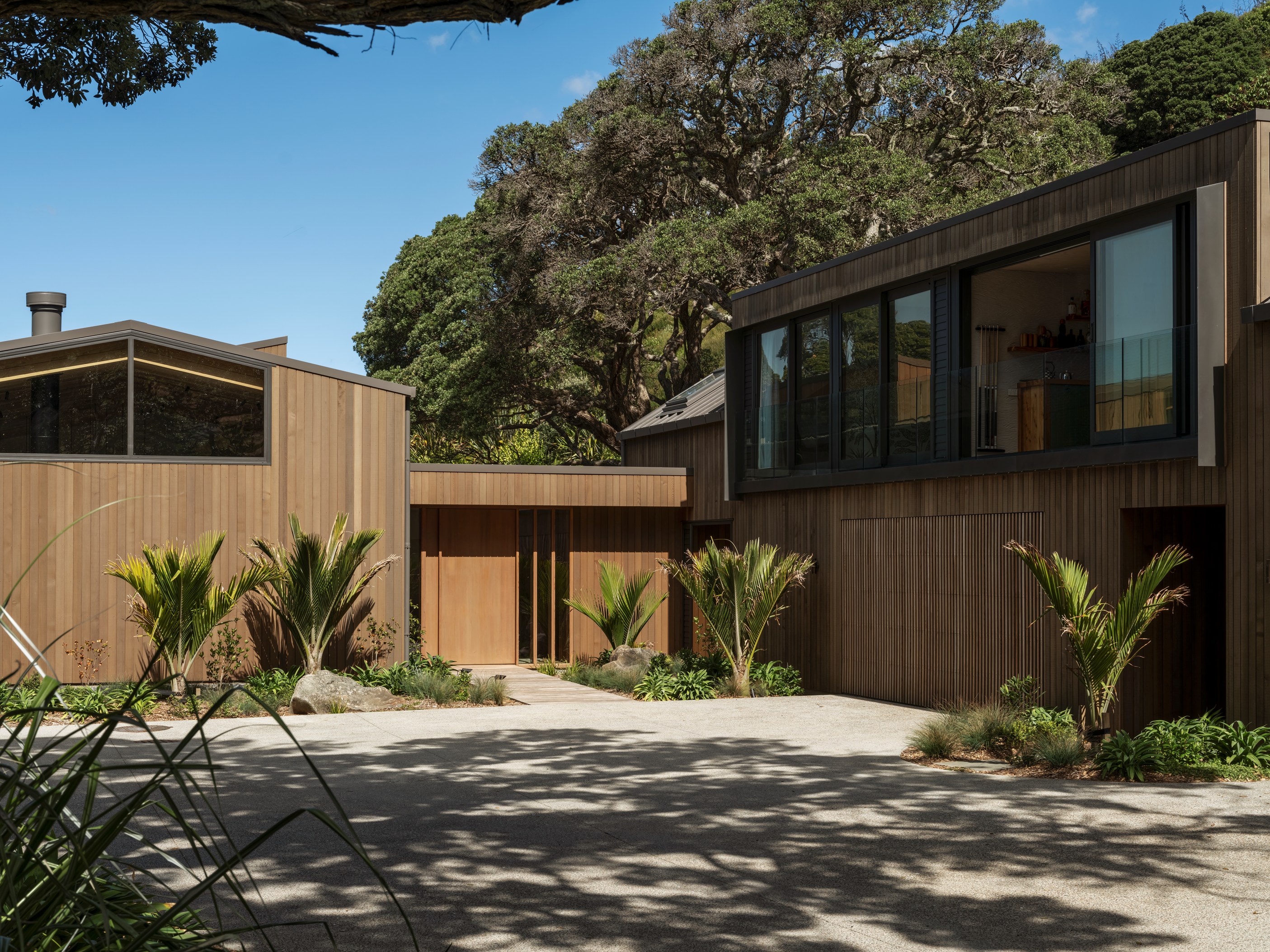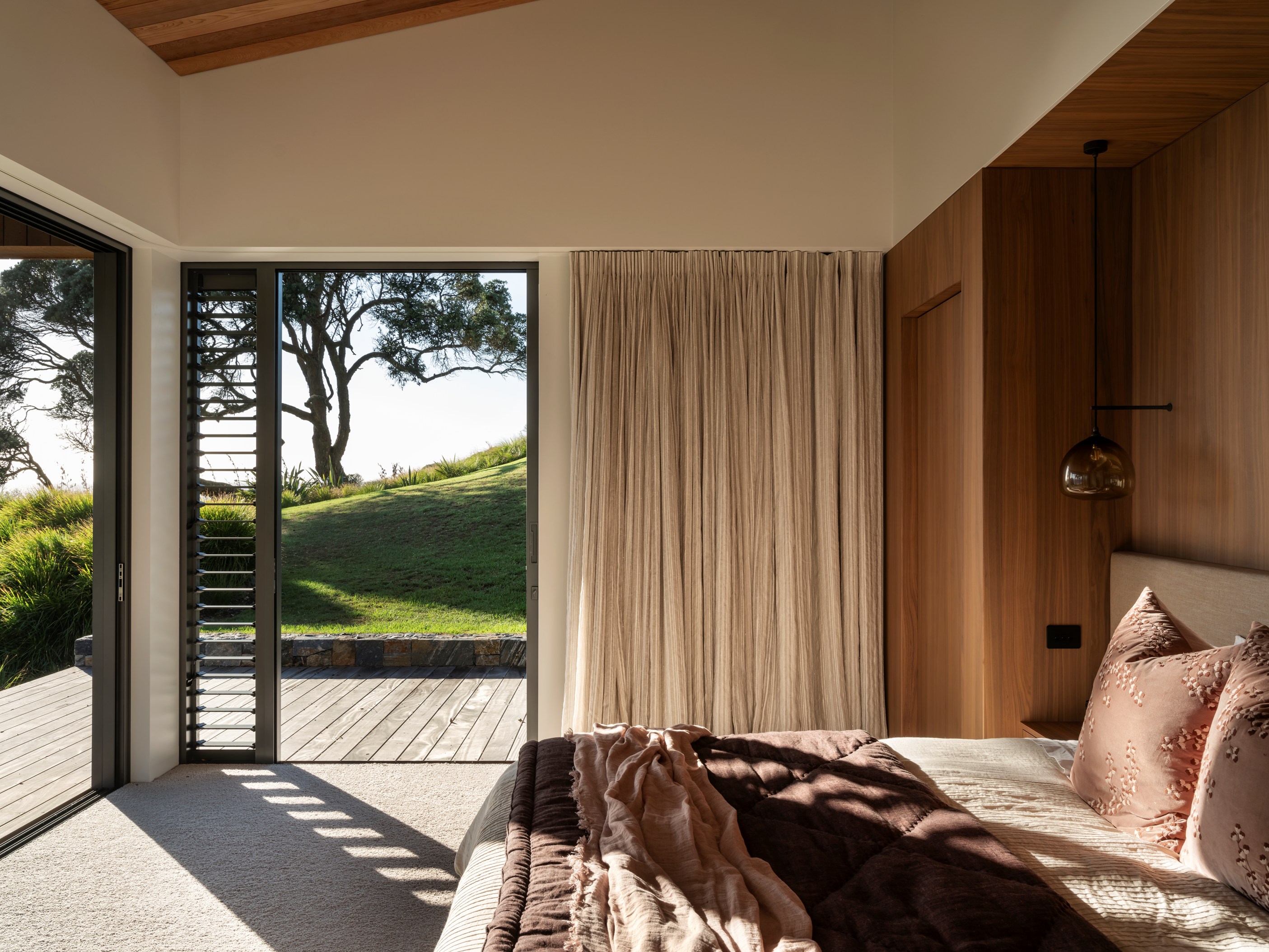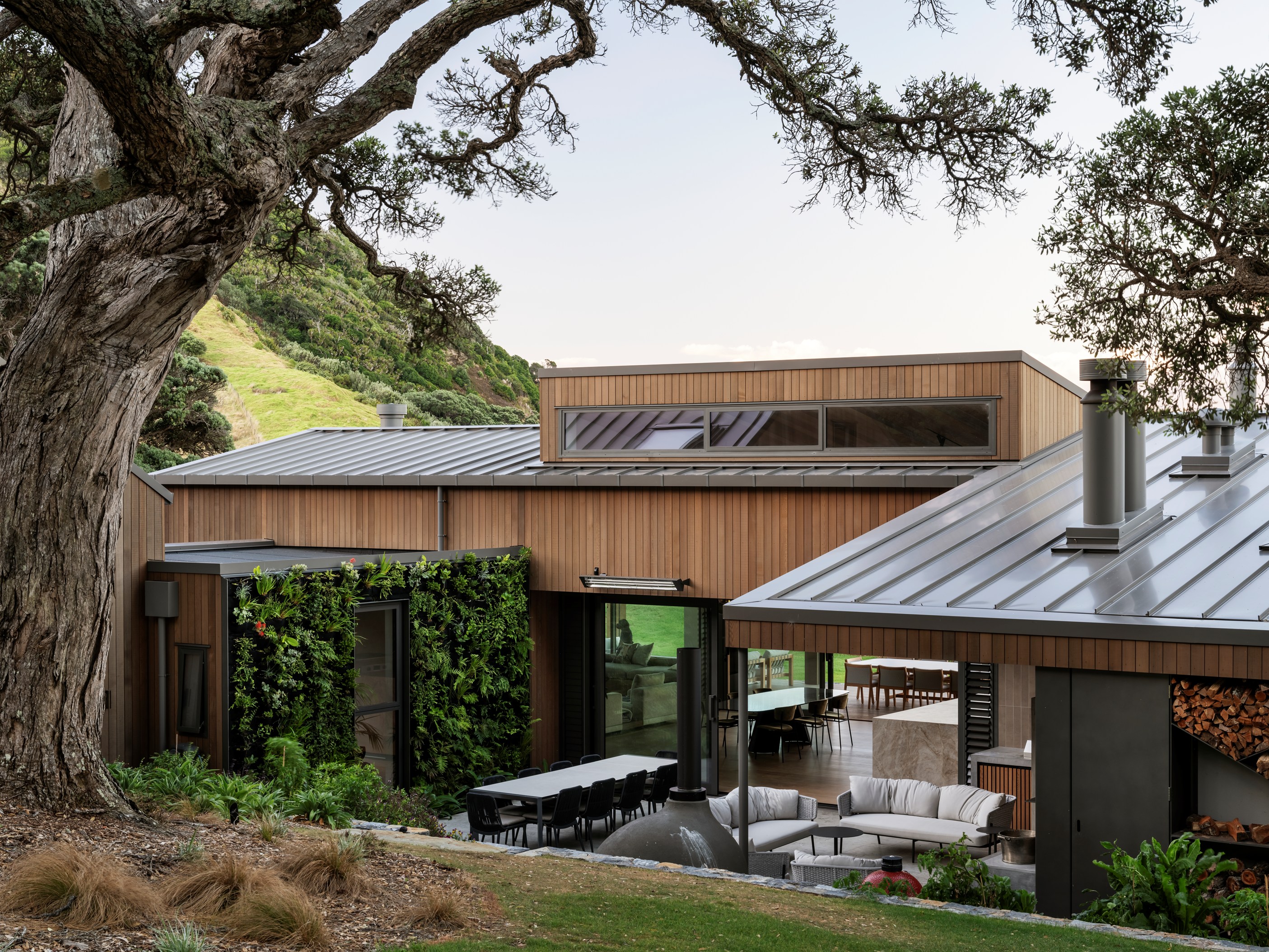 Luxury meets low-key in this tranquil coastal hideaway. At 750sqm, this is an epic build — not that you’d know it. The timber-clad beach house, sited well back from sand dunes and beside 150-year-old pōhutukawa, is at one with its spectacular Northland location. It has been designed and crafted to provide a sanctuary for its owners, without vying for attention, and it does both with understated style. The star of the main house is the grand room with built-in bar, designer kitchen, and dining and living spaces that ease outdoors on both sides. In fact, wherever you look you’ll see dreamy places in which to relax or entertain — outdoor kitchens, open decks, a heated pool, spa, sauna and putting green.