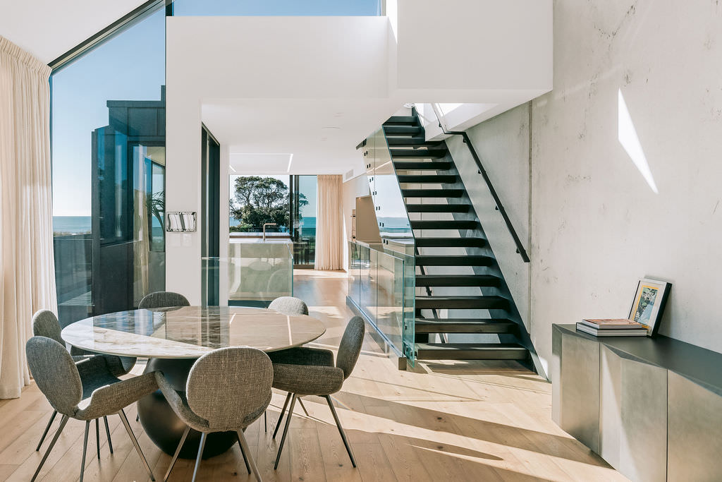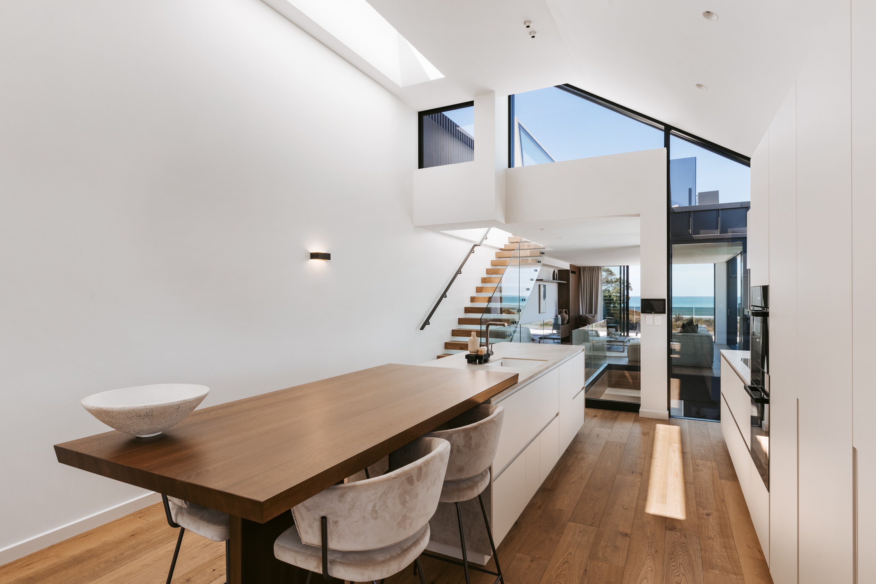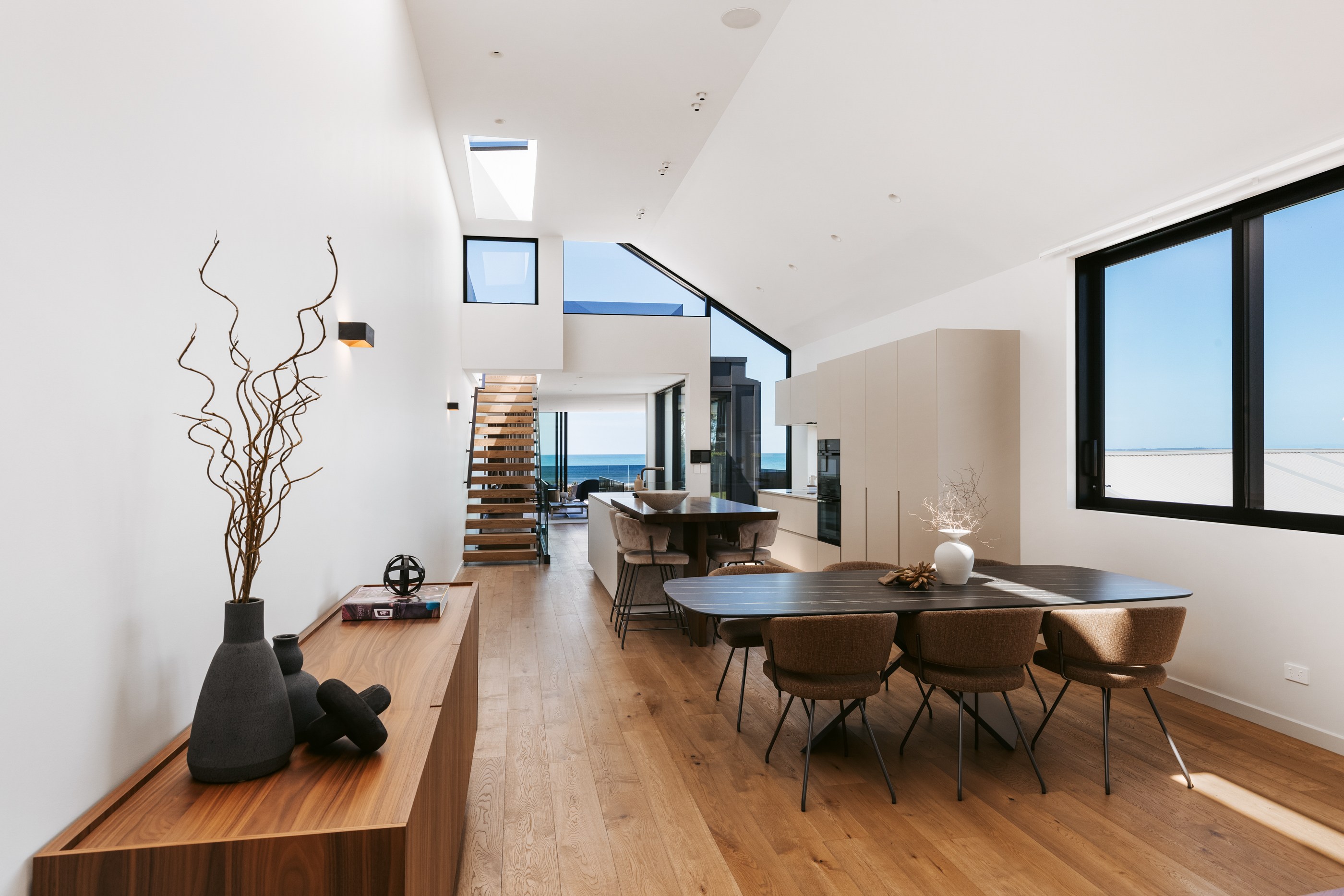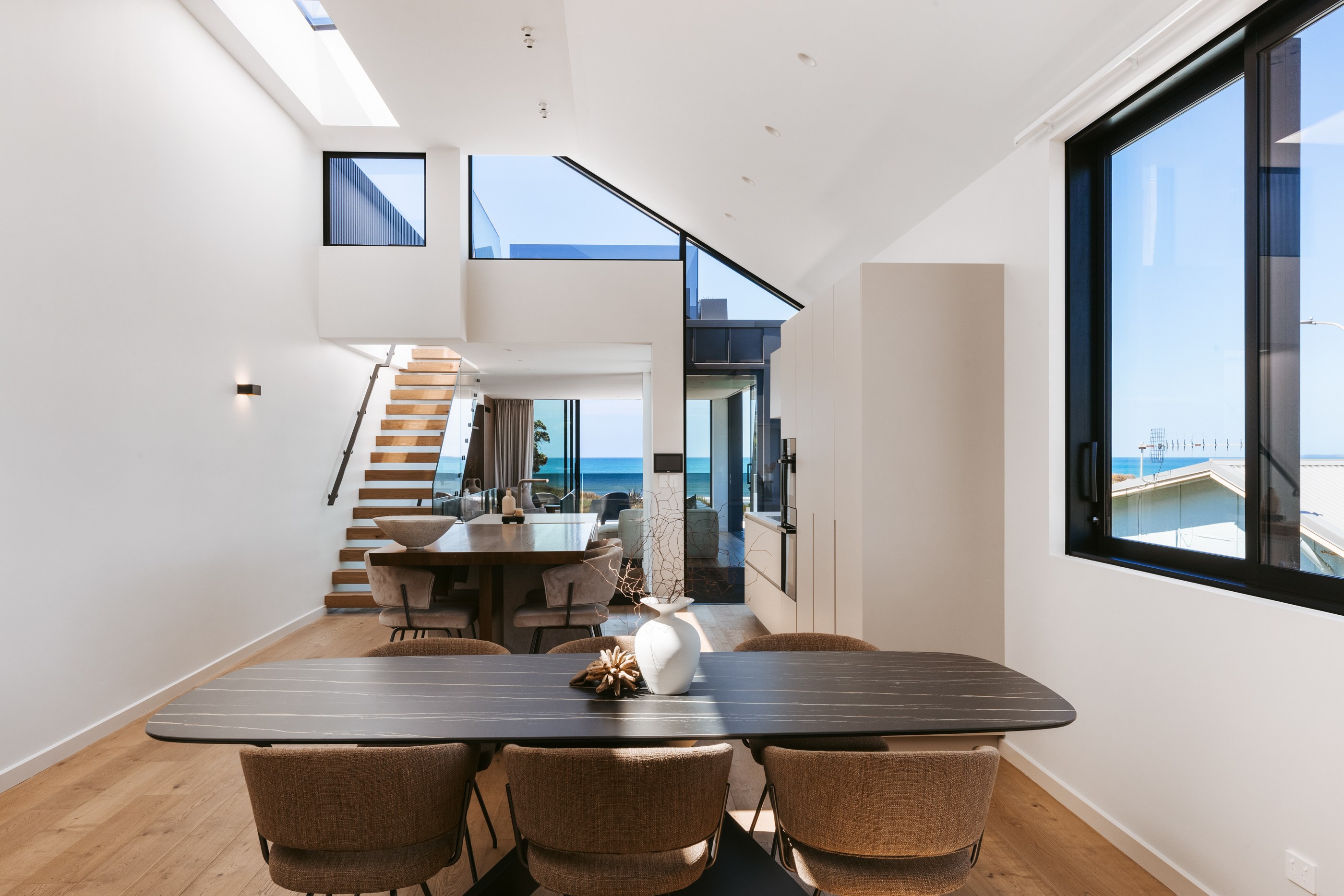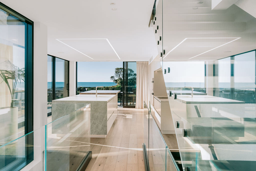 Take the timber stairs — sunlit thanks to swathes of glazing — and you’ll come to the open-plan living and dining spaces with elegant built-in cabinets. These flow from kitchens where minimalism, bold geometry, solid-oak island extensions and sleek lacquered cabinets ramp up the opulence. Naturally, this stylish space extends to sea-facing balconies. At the other end of the floor are the main bedrooms that feature dressing rooms and ensuites. The second flight of stairs takes you to the roof terraces with sun, sea views and salt air. Dark metal cladding is coast-hardy, low maintenance and low key. There’s so much to commend in this build that speaks an elegant architectural language and showcases next-level craftsmanship.