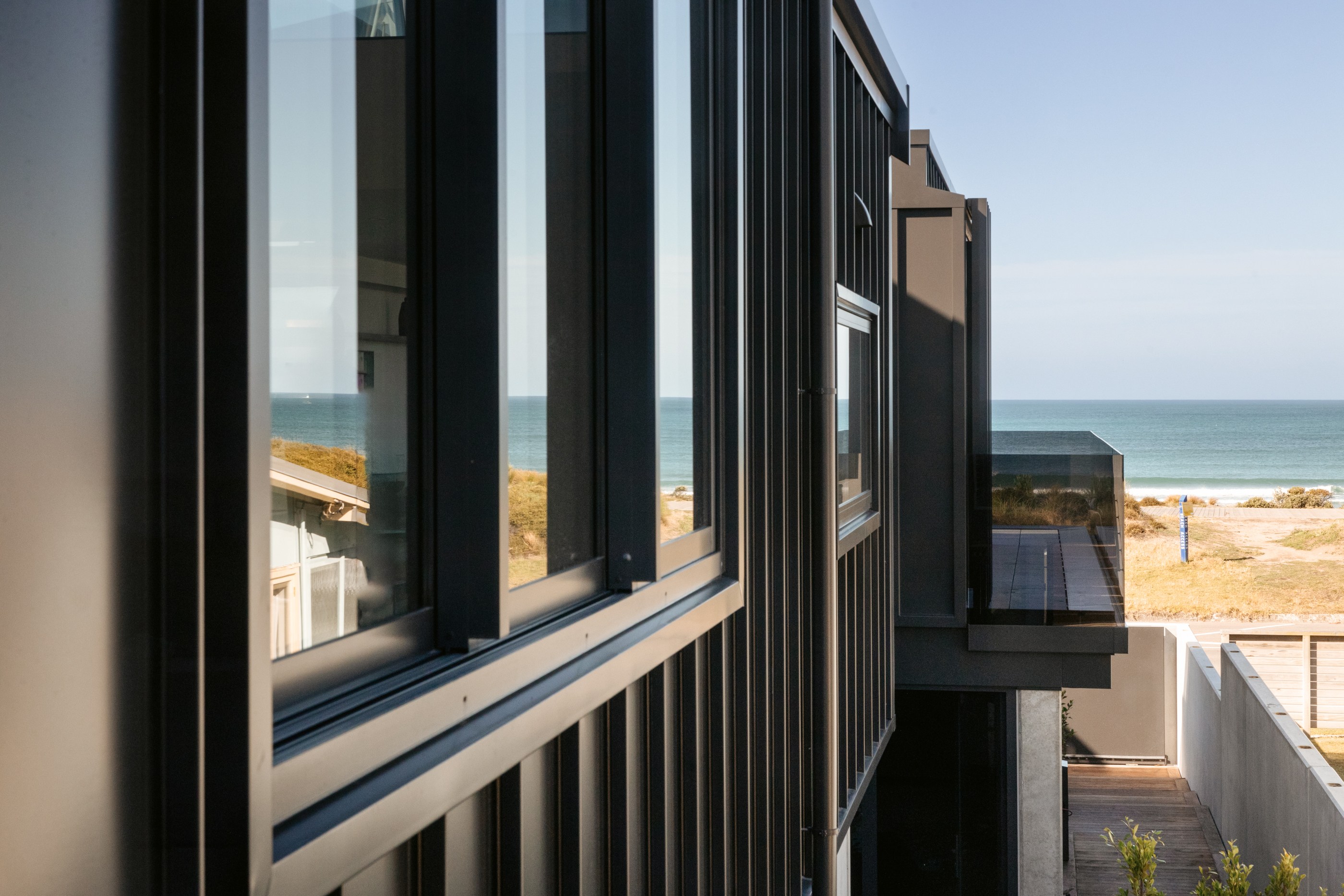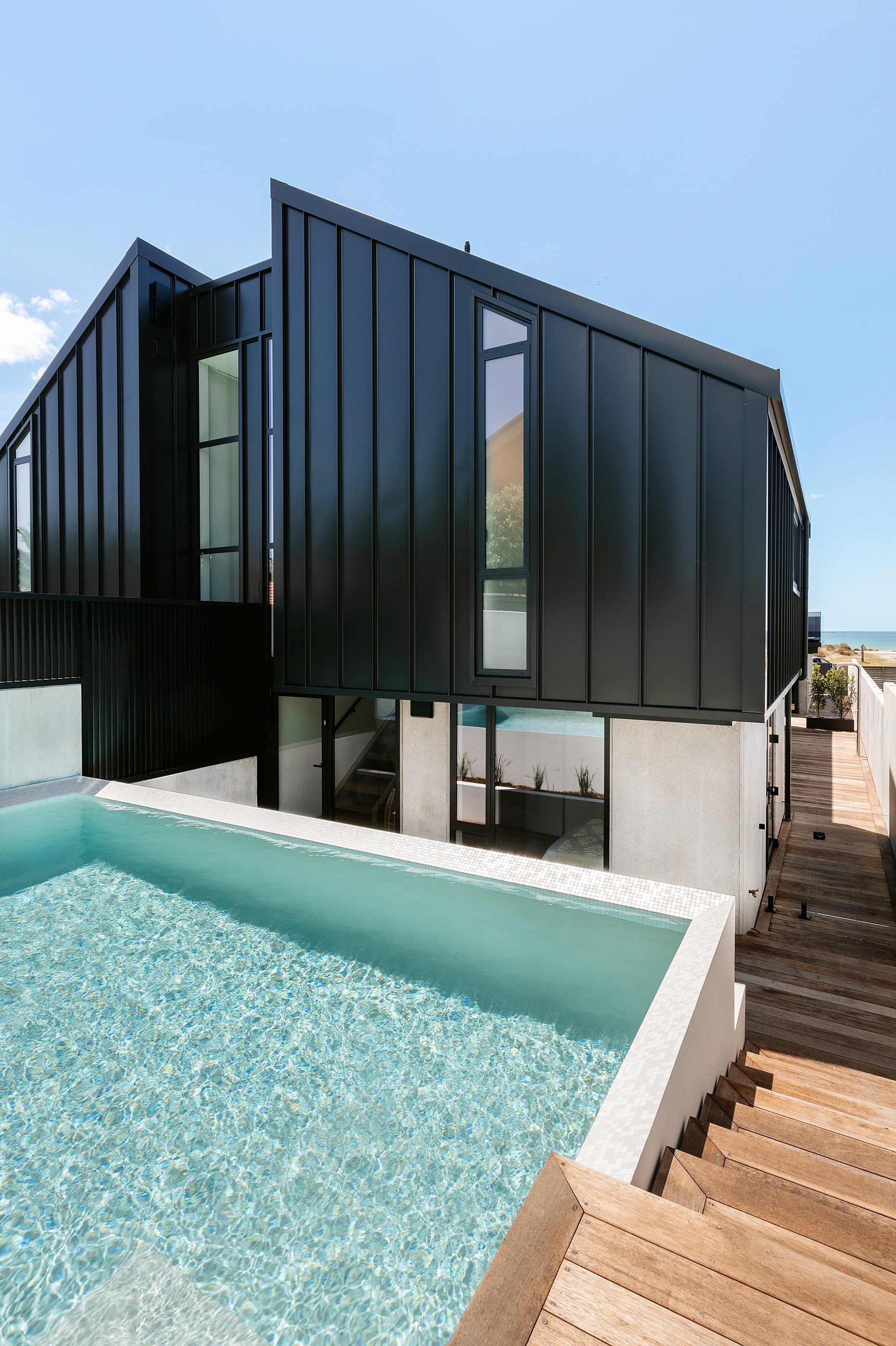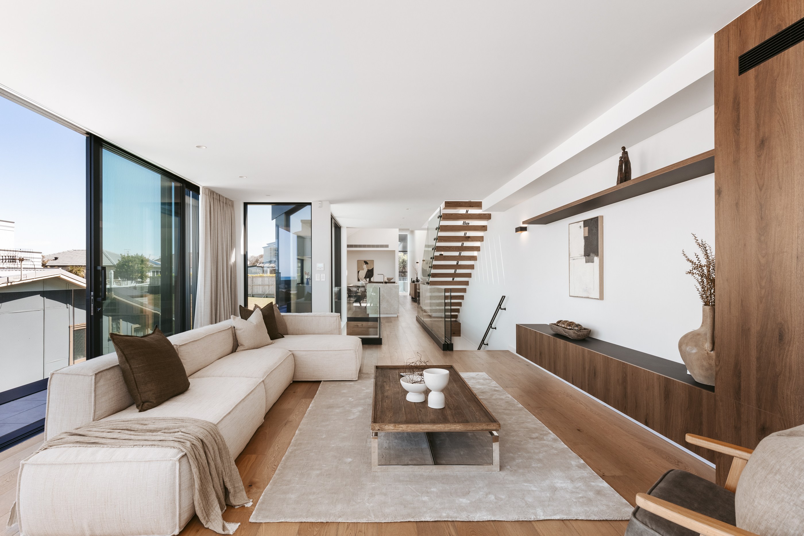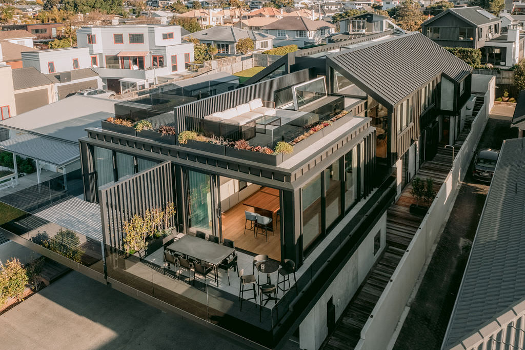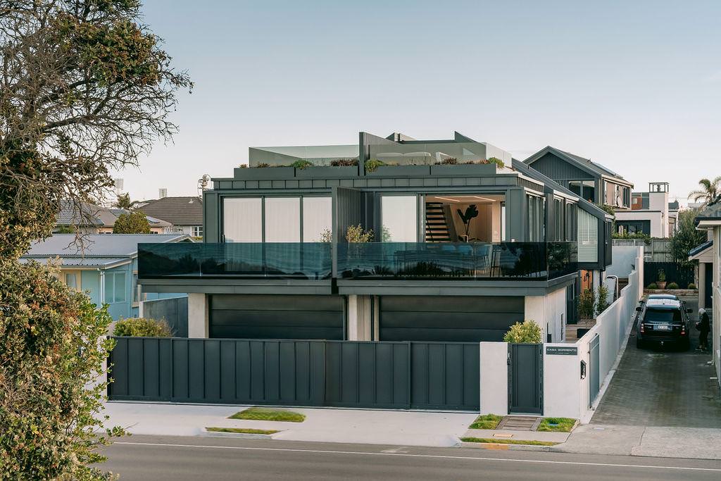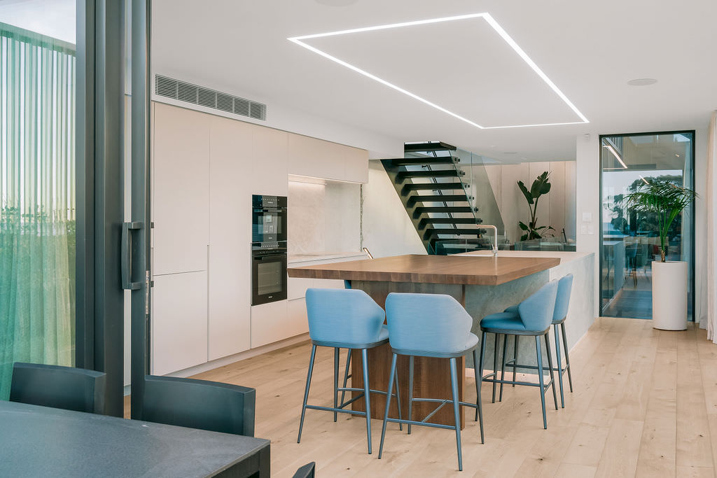 Take the timber stairs — sunlit thanks to swathes of glazing — and you’ll come to the open-plan living and dining spaces with elegant built-in cabinets. These flow from kitchens where minimalism, bold geometry, solid-oak island extensions and sleek lacquered cabinets ramp up the opulence. Naturally, this stylish space extends to sea-facing balconies. At the other end of the floor are the main bedrooms that feature dressing rooms and ensuites. The second flight of stairs takes you to the roof terraces with sun, sea views and salt air. Dark metal cladding is coast-hardy, low maintenance and low key. There’s so much to commend in this build that speaks an elegant architectural language and showcases next-level craftsmanship.