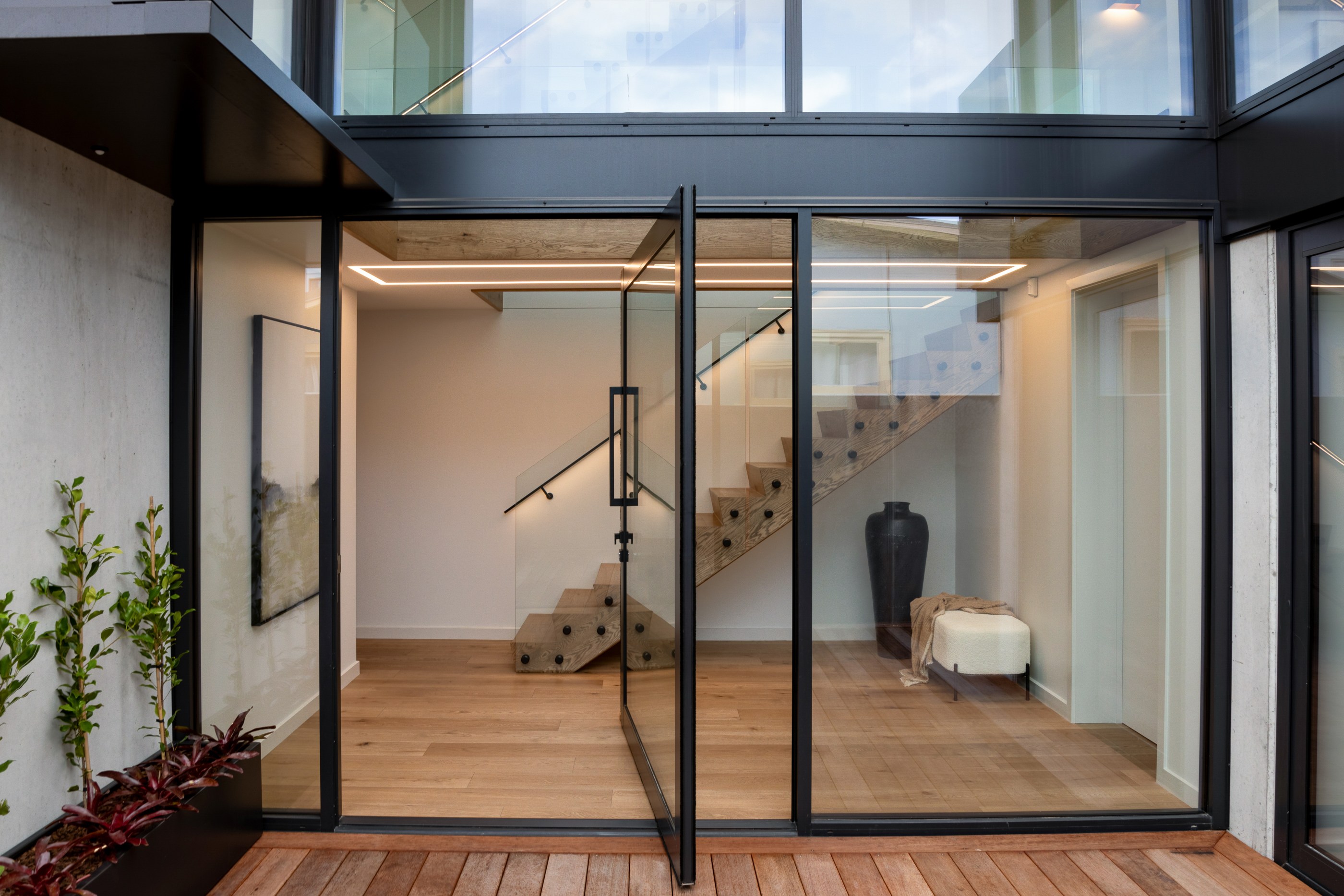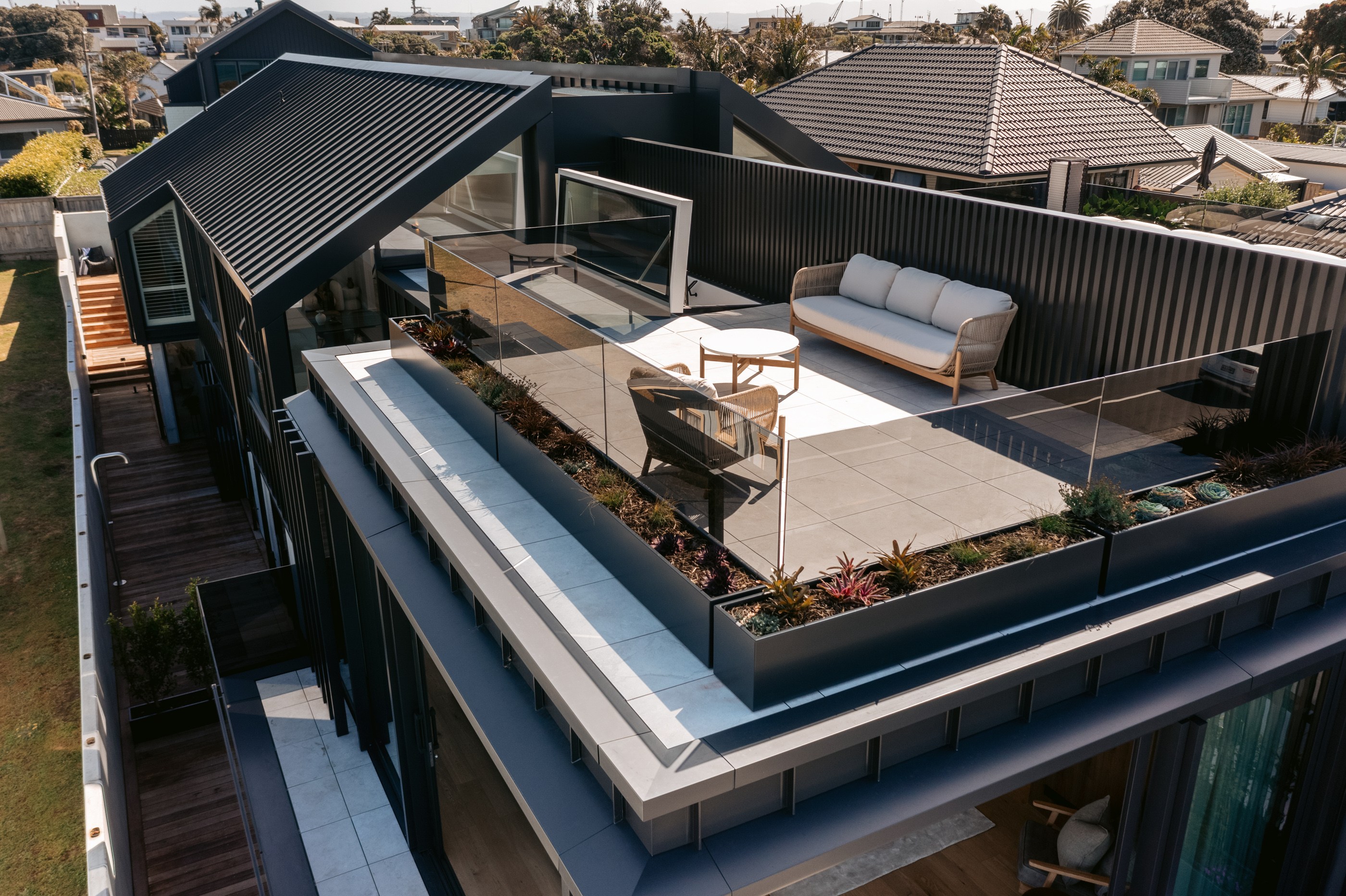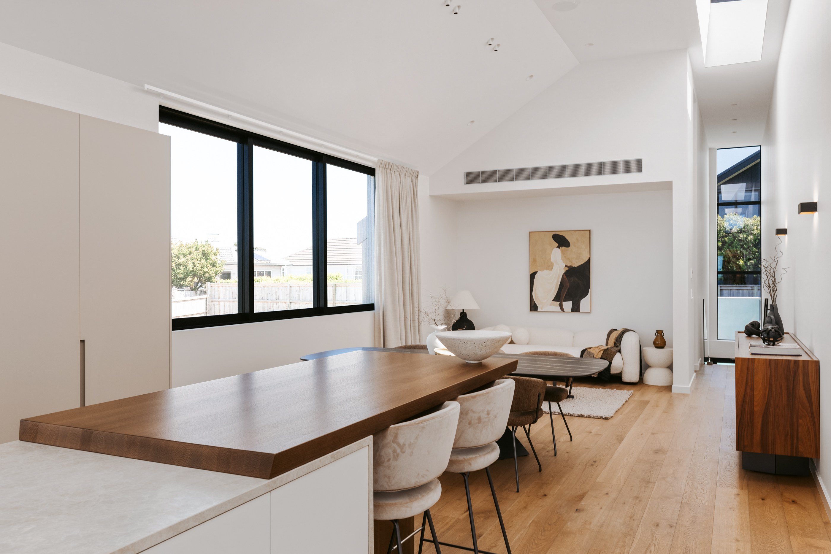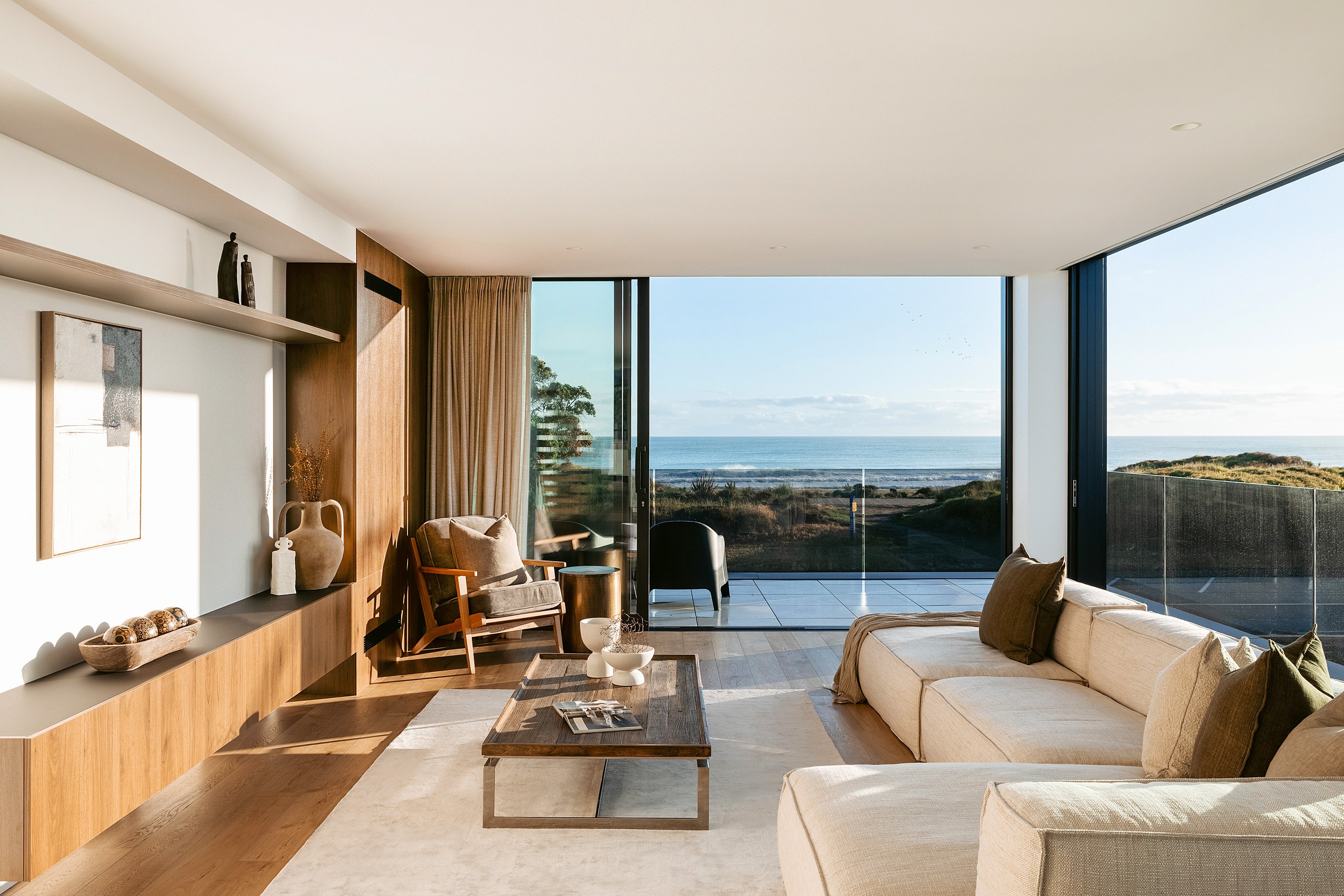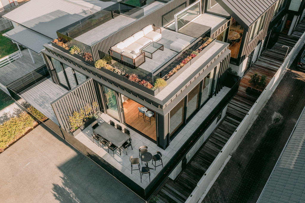 Take the timber stairs — sunlit thanks to swathes of glazing — and you’ll come to the open-plan living and dining spaces with elegant built-in cabinets. These flow from kitchens where minimalism, bold geometry, solid-oak island extensions and sleek lacquered cabinets ramp up the opulence. Naturally, this stylish space extends to sea-facing balconies. At the other end of the floor are the main bedrooms that feature dressing rooms and ensuites. The second flight of stairs takes you to the roof terraces with sun, sea views and salt air. Dark metal cladding is coast-hardy, low maintenance and low key. There’s so much to commend in this build that speaks an elegant architectural language and showcases next-level craftsmanship.
