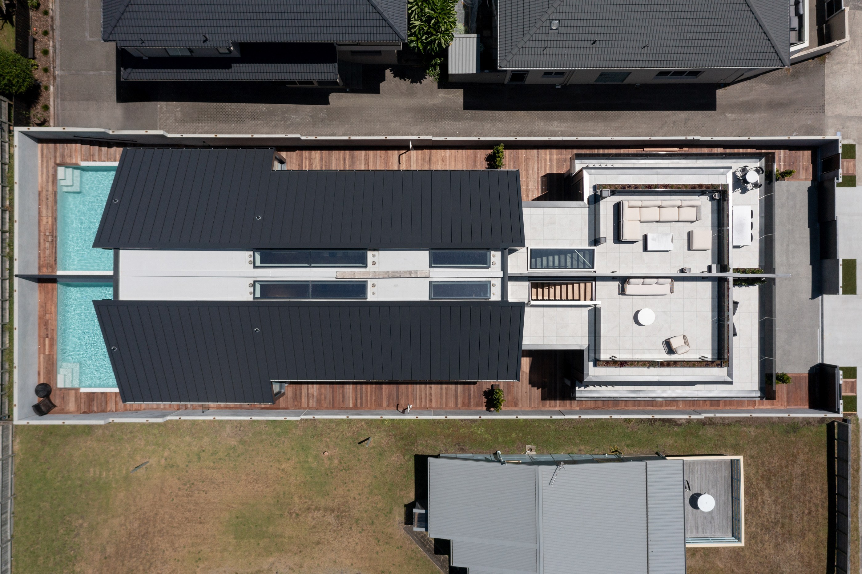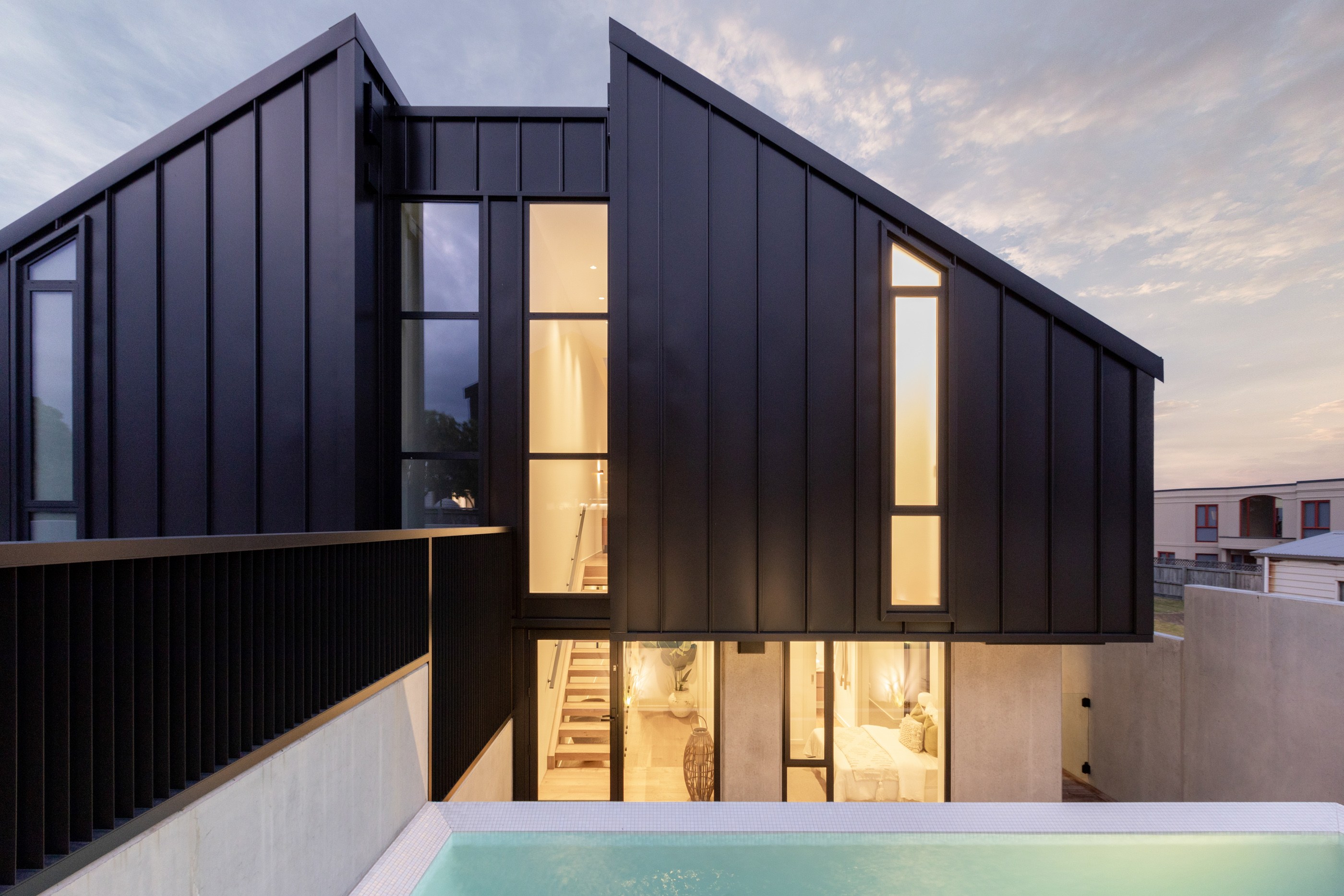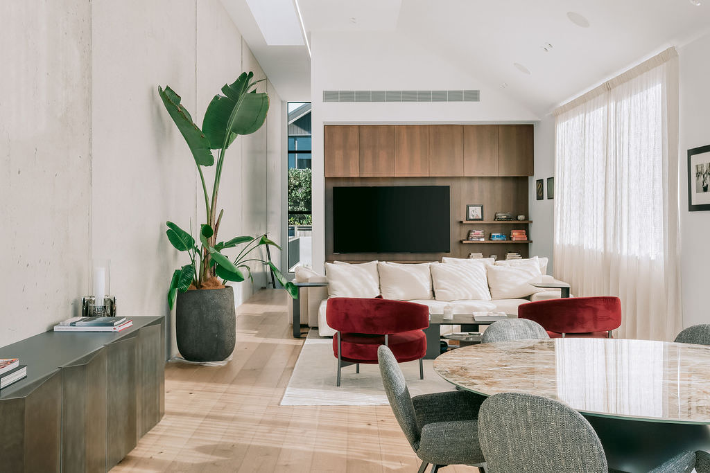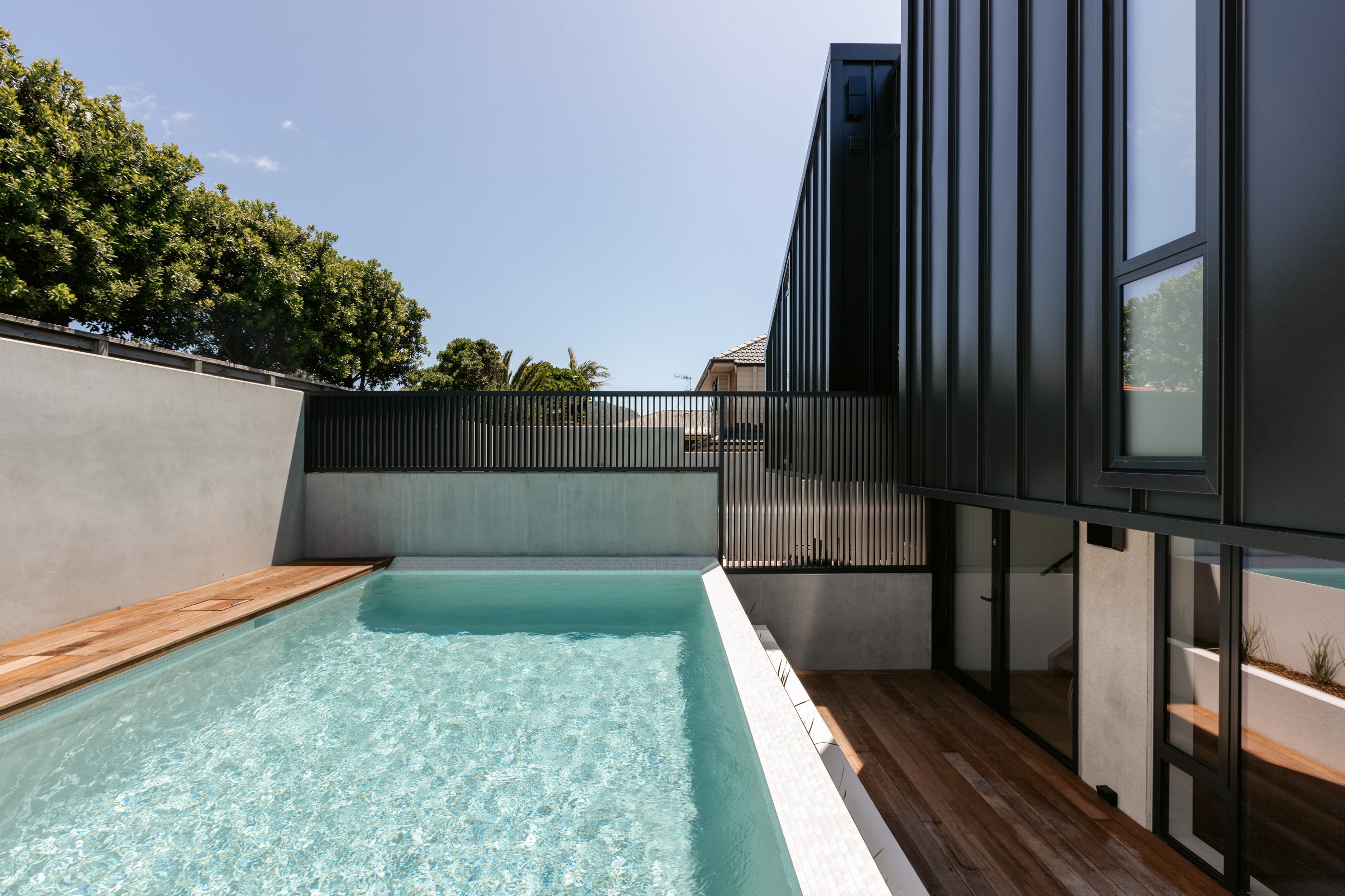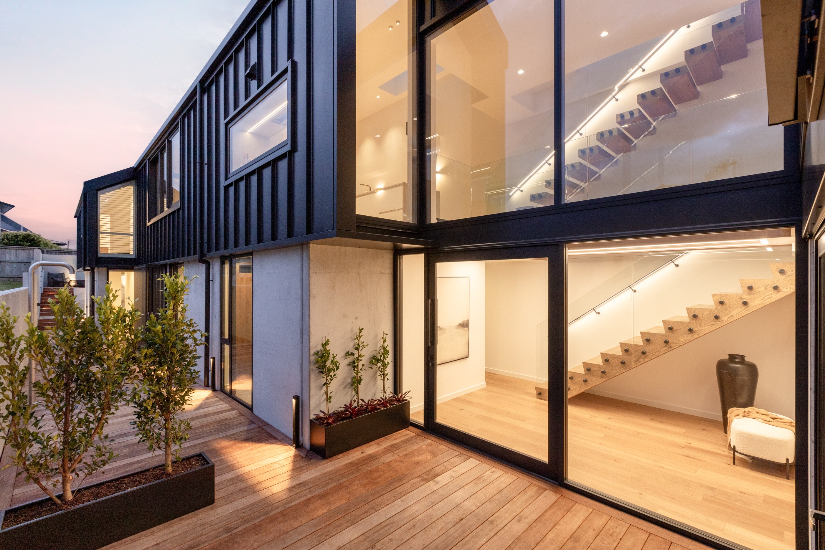 Take the timber stairs — sunlit thanks to swathes of glazing — and you’ll come to the open-plan living and dining spaces with elegant built-in cabinets. These flow from kitchens where minimalism, bold geometry, solid-oak island extensions and sleek lacquered cabinets ramp up the opulence. Naturally, this stylish space extends to sea-facing balconies. At the other end of the floor are the main bedrooms that feature dressing rooms and ensuites. The second flight of stairs takes you to the roof terraces with sun, sea views and salt air. Dark metal cladding is coast-hardy, low maintenance and low key. There’s so much to commend in this build that speaks an elegant architectural language and showcases next-level craftsmanship.