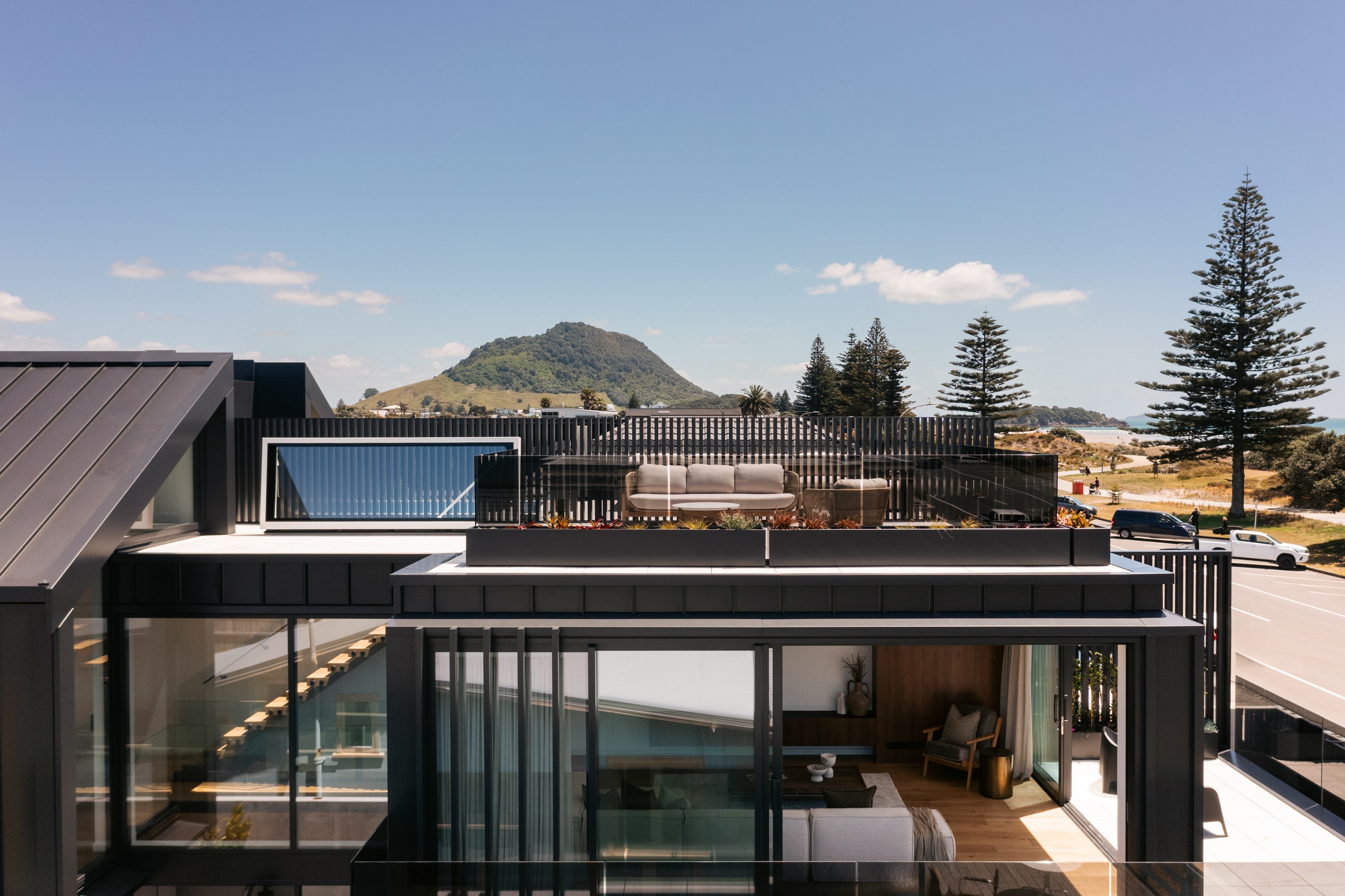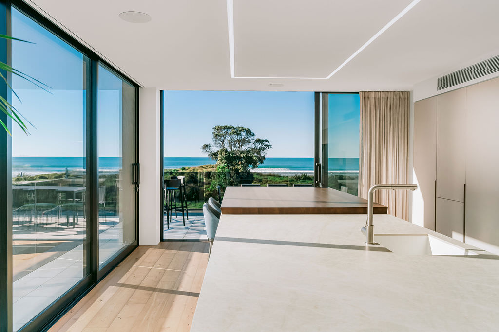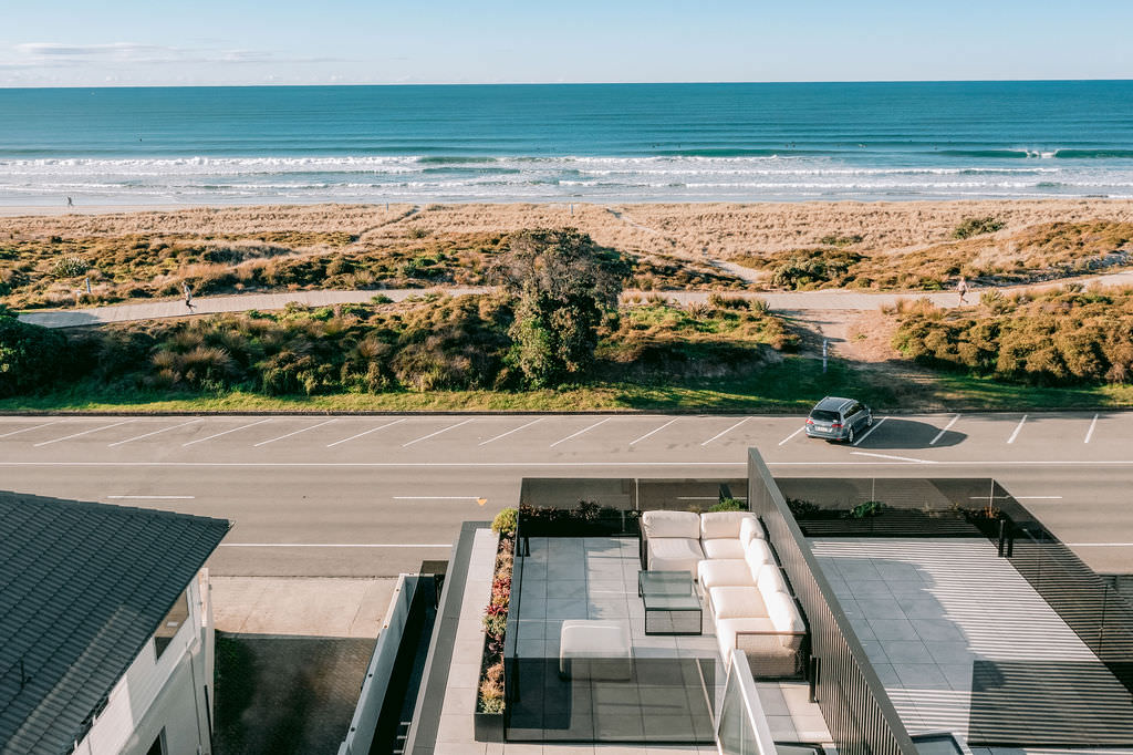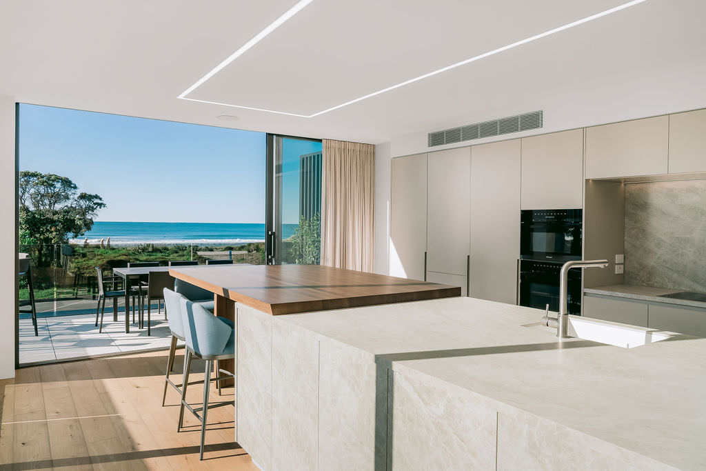 Surf’s up at the Mount, and so is the level of luxury. This 568sqm duplex development offers a long list of delights — rooftop terraces, swimming pools, exquisite interiors and cutting-edge technology. Additionally, the residents, who enjoy panoramic ocean views, need only cross the road, follow the path through the dunes and they’re at the whitesand beach. It’s paradise beside the Pacific. Back to the three-level homes, which have floorplan variations but offer the same level of splendour. In each ground floor, you’ll find a double garage, entry atrium, study and bathrooms. Sliders in the bedrooms open to decking that leads to the pools.