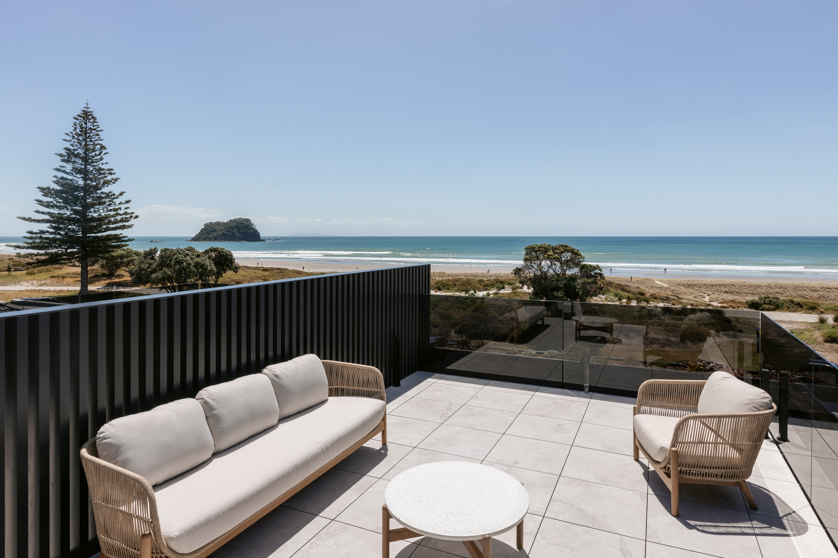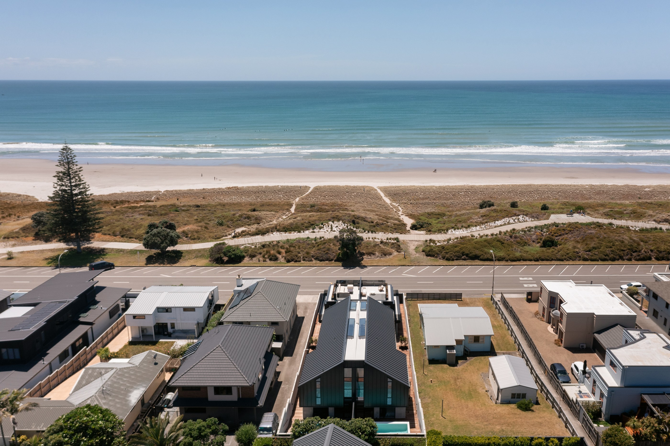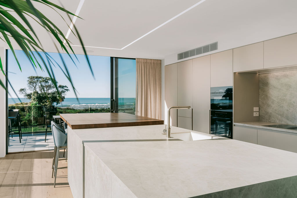 Surf’s up at the Mount, and so is the level of luxury. This 568sqm duplex development offers a long list of delights — rooftop terraces, swimming pools, exquisite interiors and cutting-edge technology. Additionally, the residents, who enjoy panoramic ocean views, need only cross the road, follow the path through the dunes and they’re at the whitesand beach. It’s paradise beside the Pacific. Back to the three-level homes, which have floorplan variations but offer the same level of splendour. In each ground floor, you’ll find a double garage, entry atrium, study and bathrooms. Sliders in the bedrooms open to decking that leads to the pools.