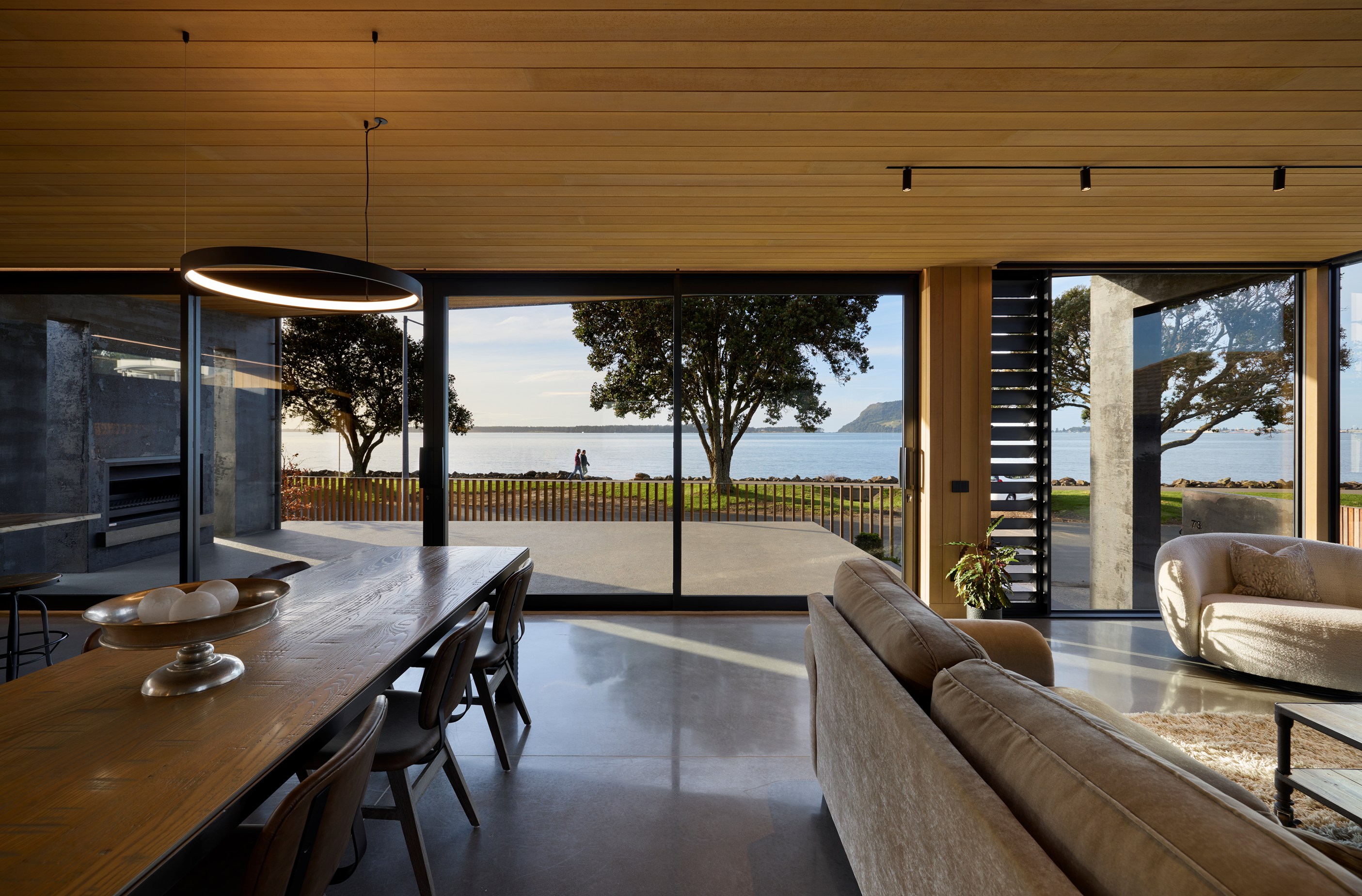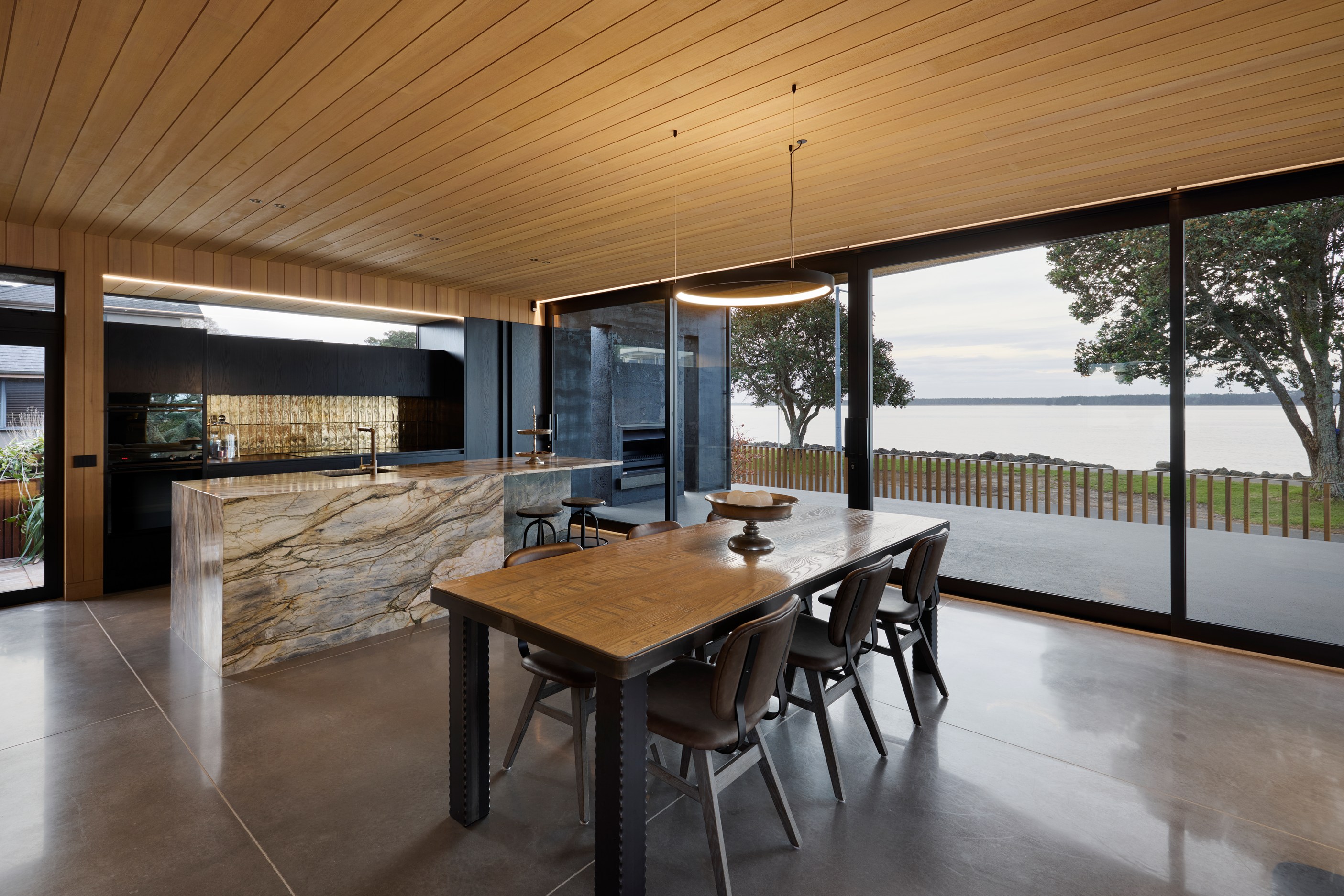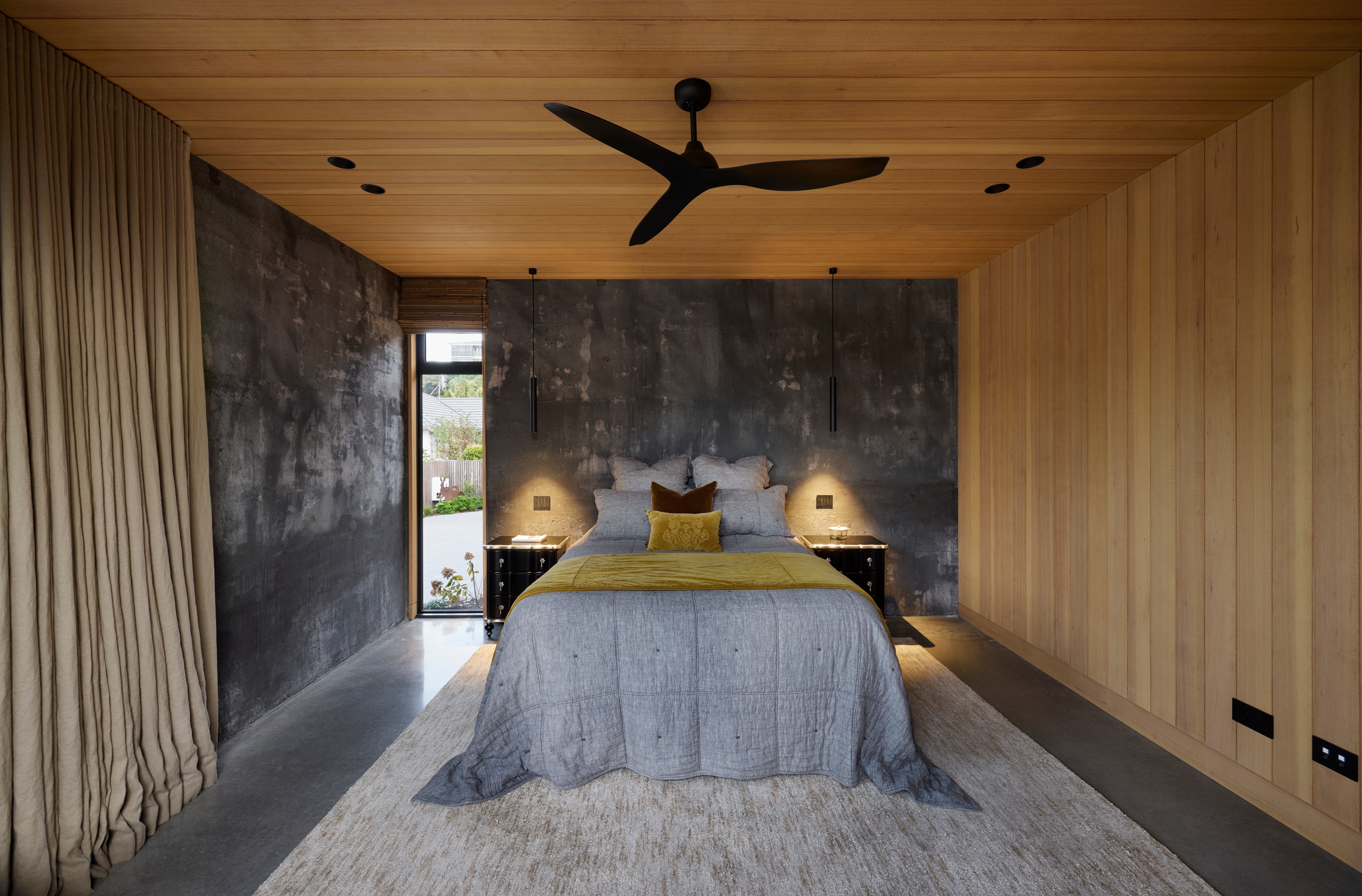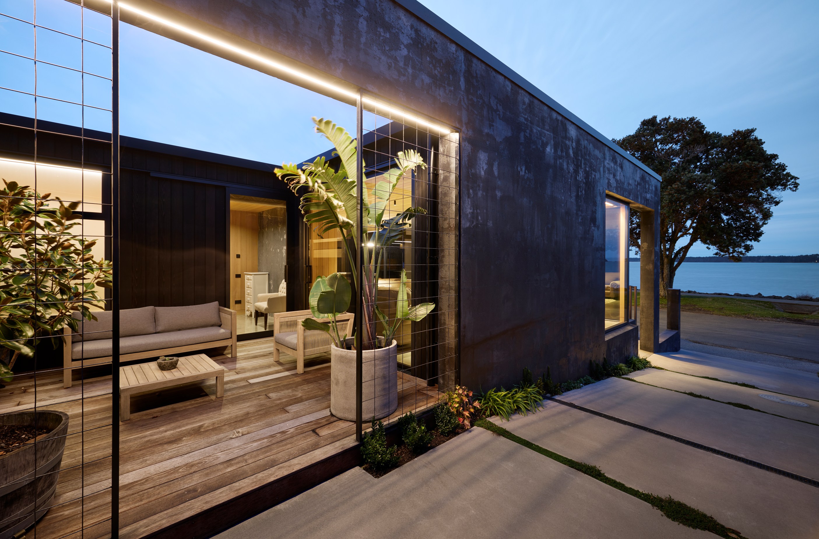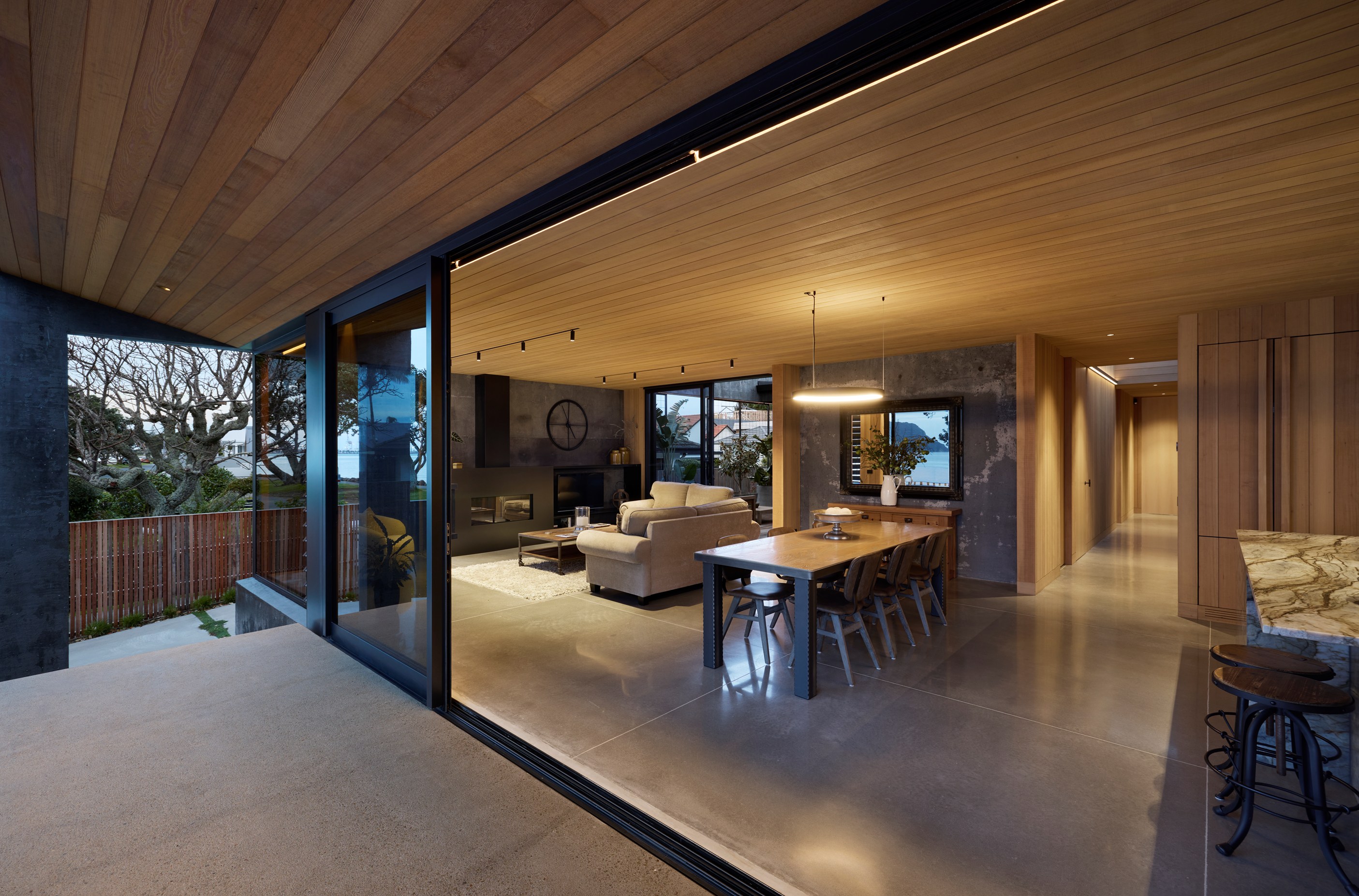 This dark delight on the shores of Tauranga Harbour deliberately appears low key to blend into its environs but is, in fact, all about thoughtful laidback luxe. The exterior, for example, has black in-situ concrete walls with a surface that emulates the bark of the nearby pōhutukawa tree. That’s the sort of detail that’s a hallmark of the 227sqm three-bedroom home. Inside, concrete makes a welcome reappearance and is offset by light hemlock timber walls and ceilings. Even the garage is given the timber treatment: ply lines the walls and has negative detail that emphasises the craftsmanship at play.