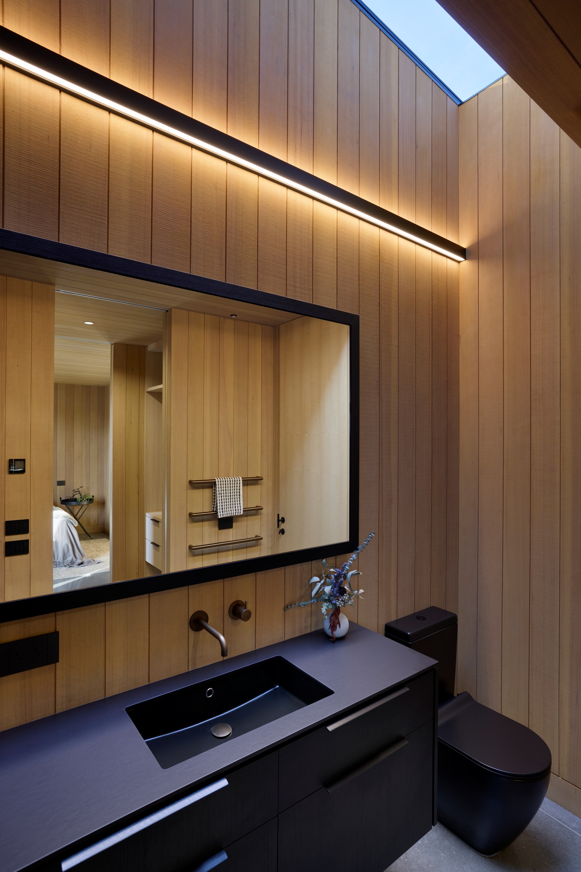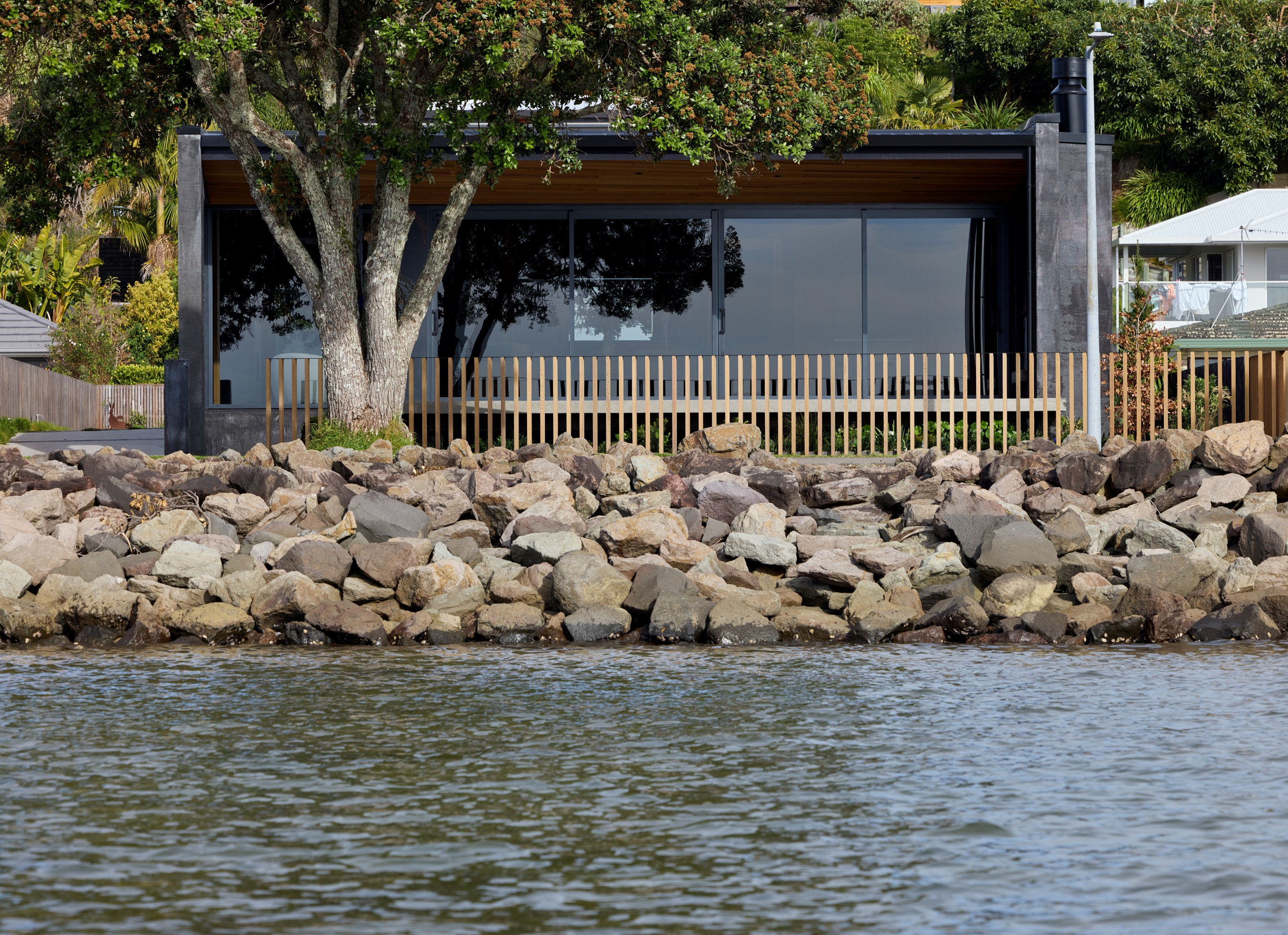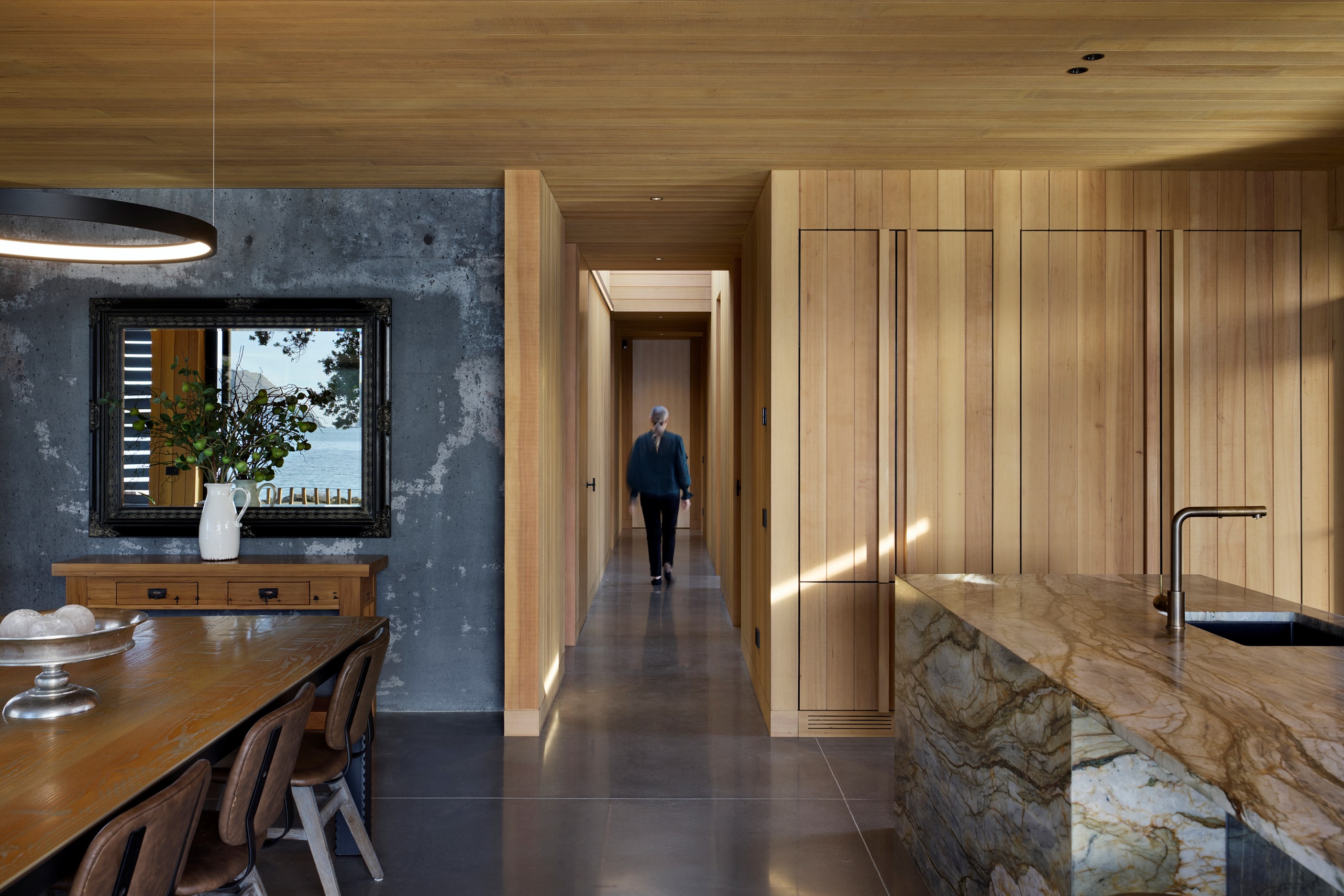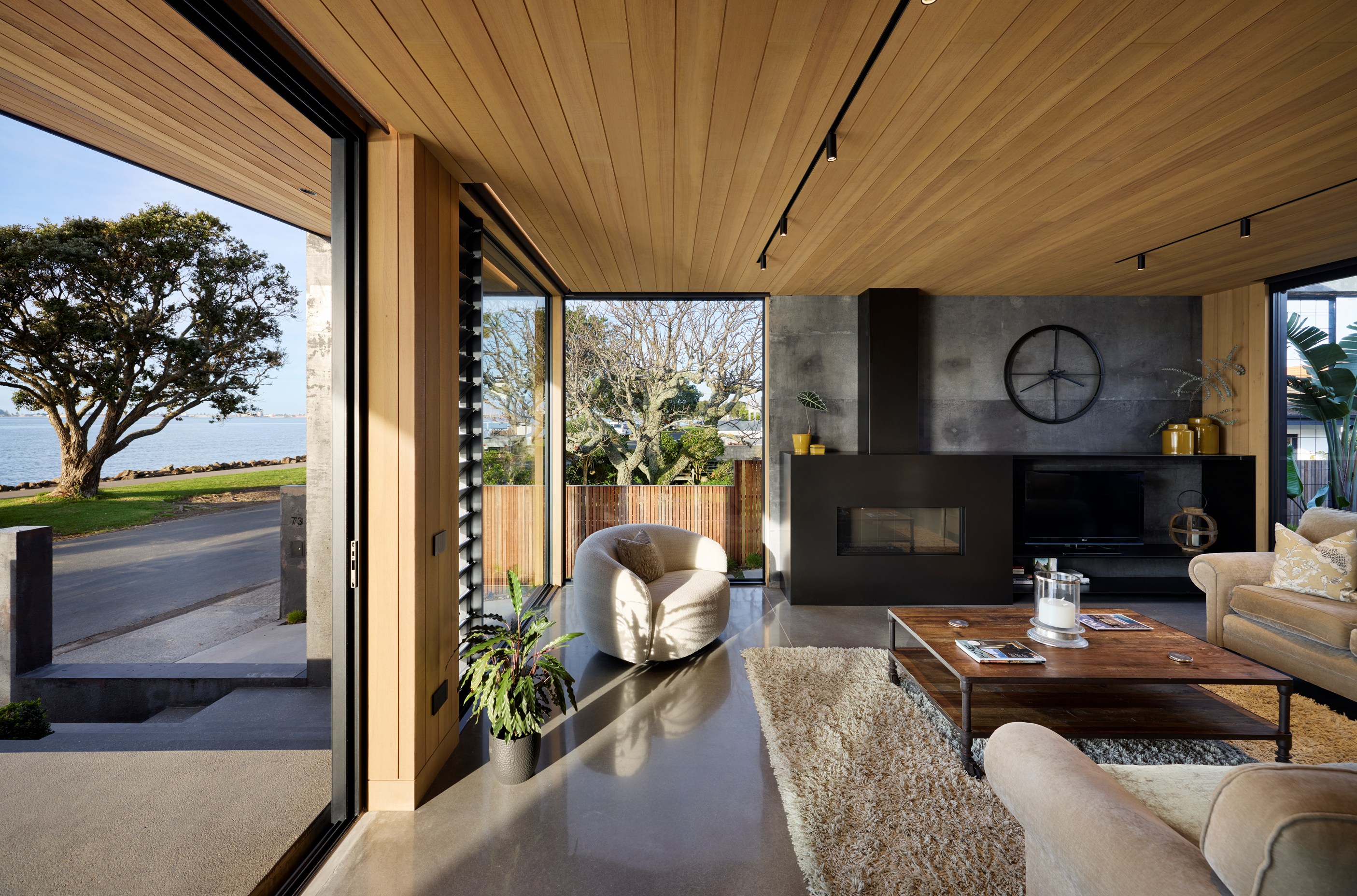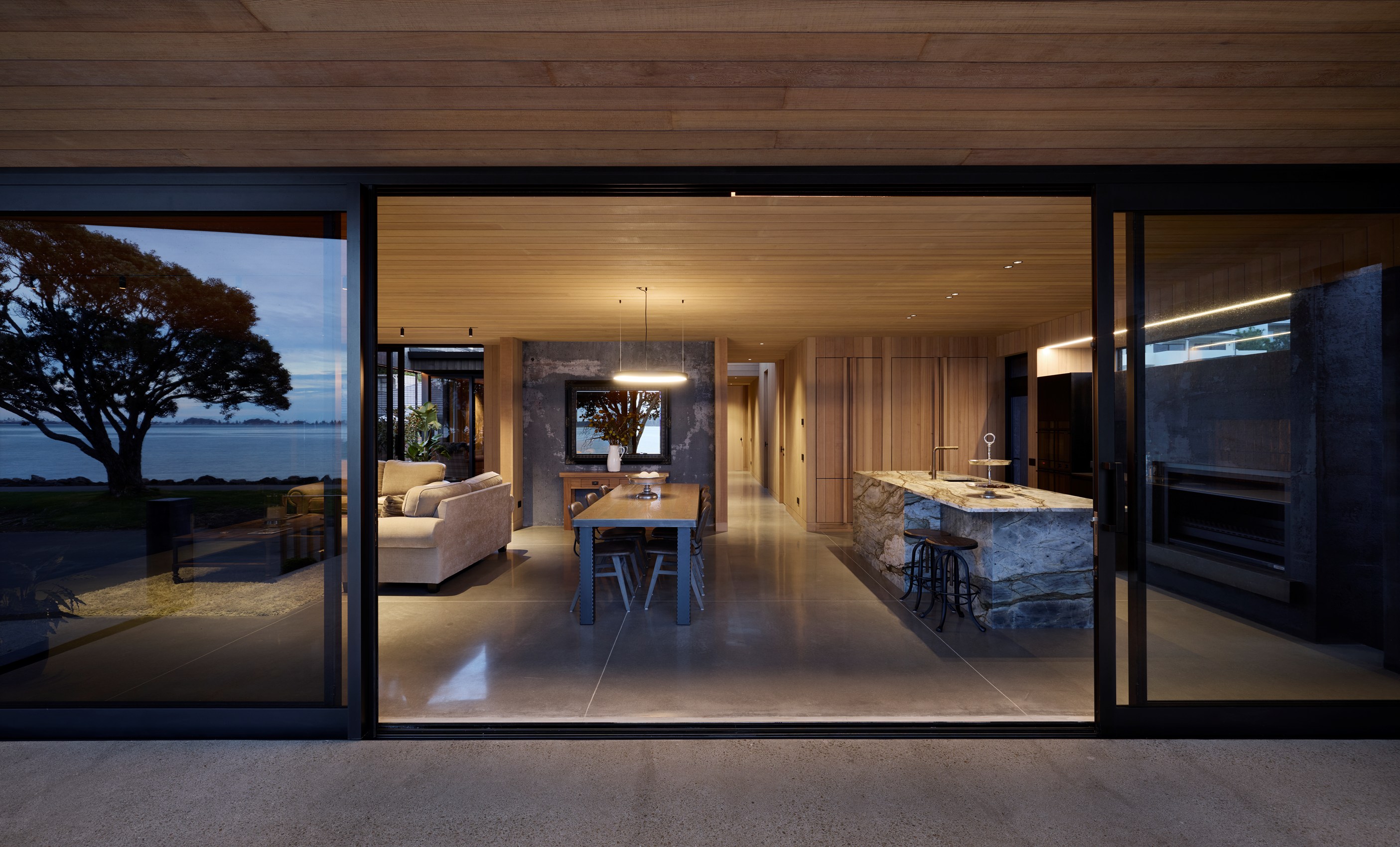 This dark delight on the shores of Tauranga Harbour deliberately appears low key to blend into its environs but is, in fact, all about thoughtful laidback luxe. The exterior, for example, has black in-situ concrete walls with a surface that emulates the bark of the nearby pōhutukawa tree. That’s the sort of detail that’s a hallmark of the 227sqm three-bedroom home. Inside, concrete makes a welcome reappearance and is offset by light hemlock timber walls and ceilings. Even the garage is given the timber treatment: ply lines the walls and has negative detail that emphasises the craftsmanship at play.