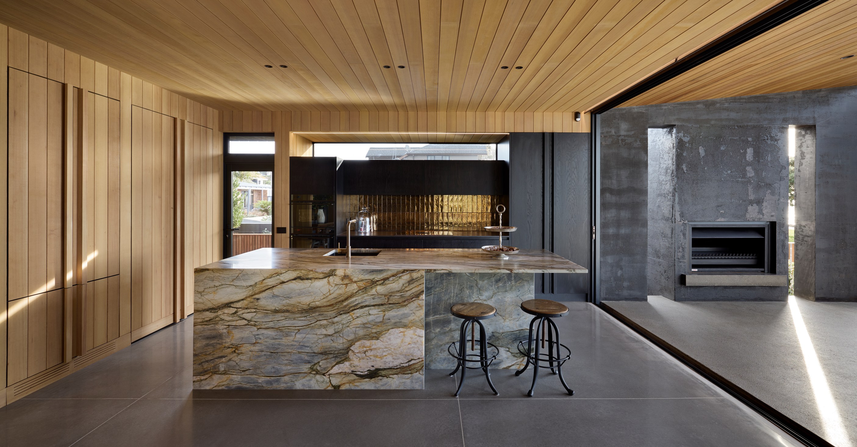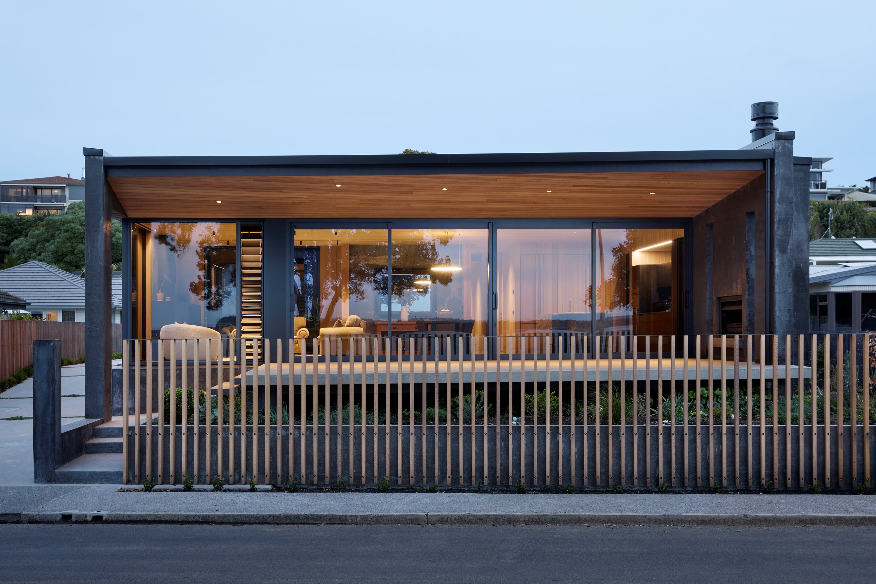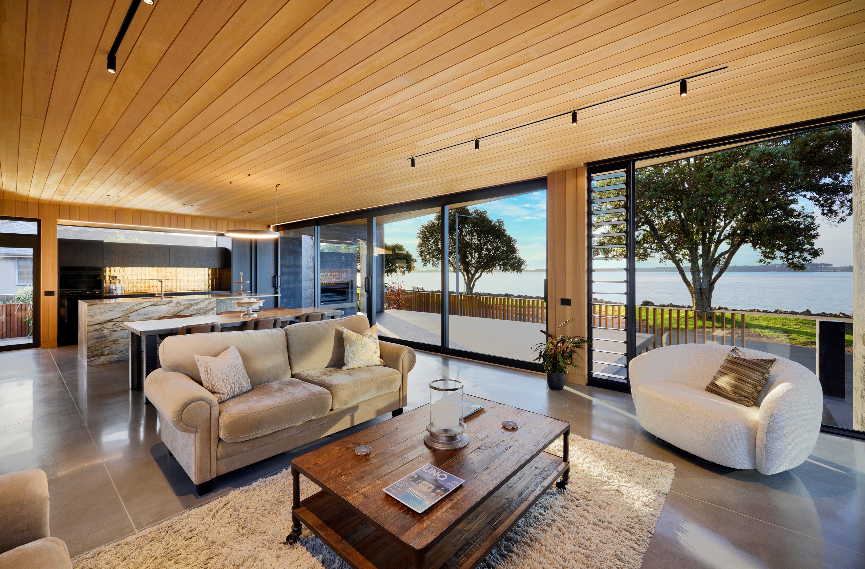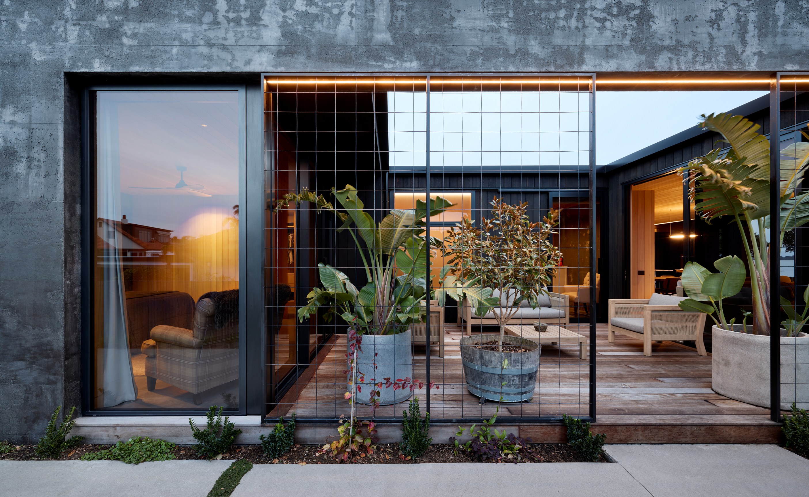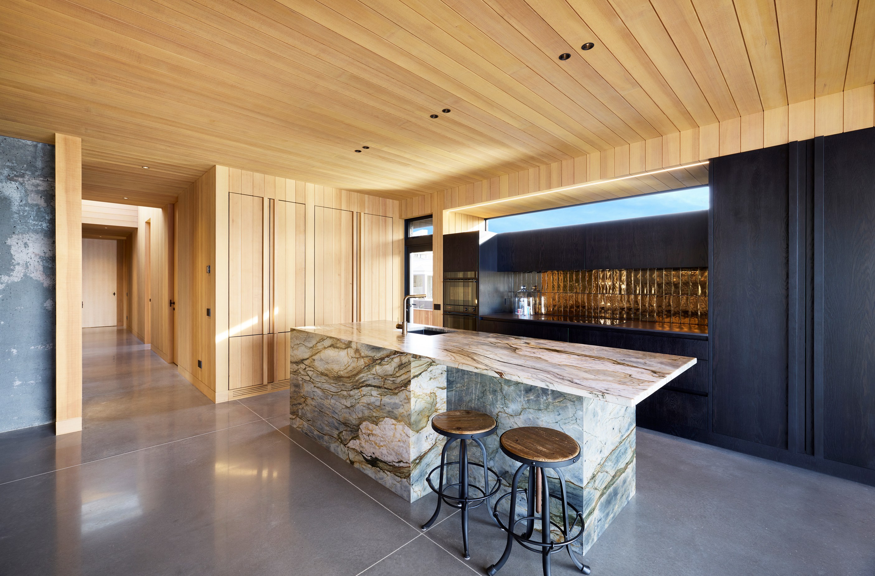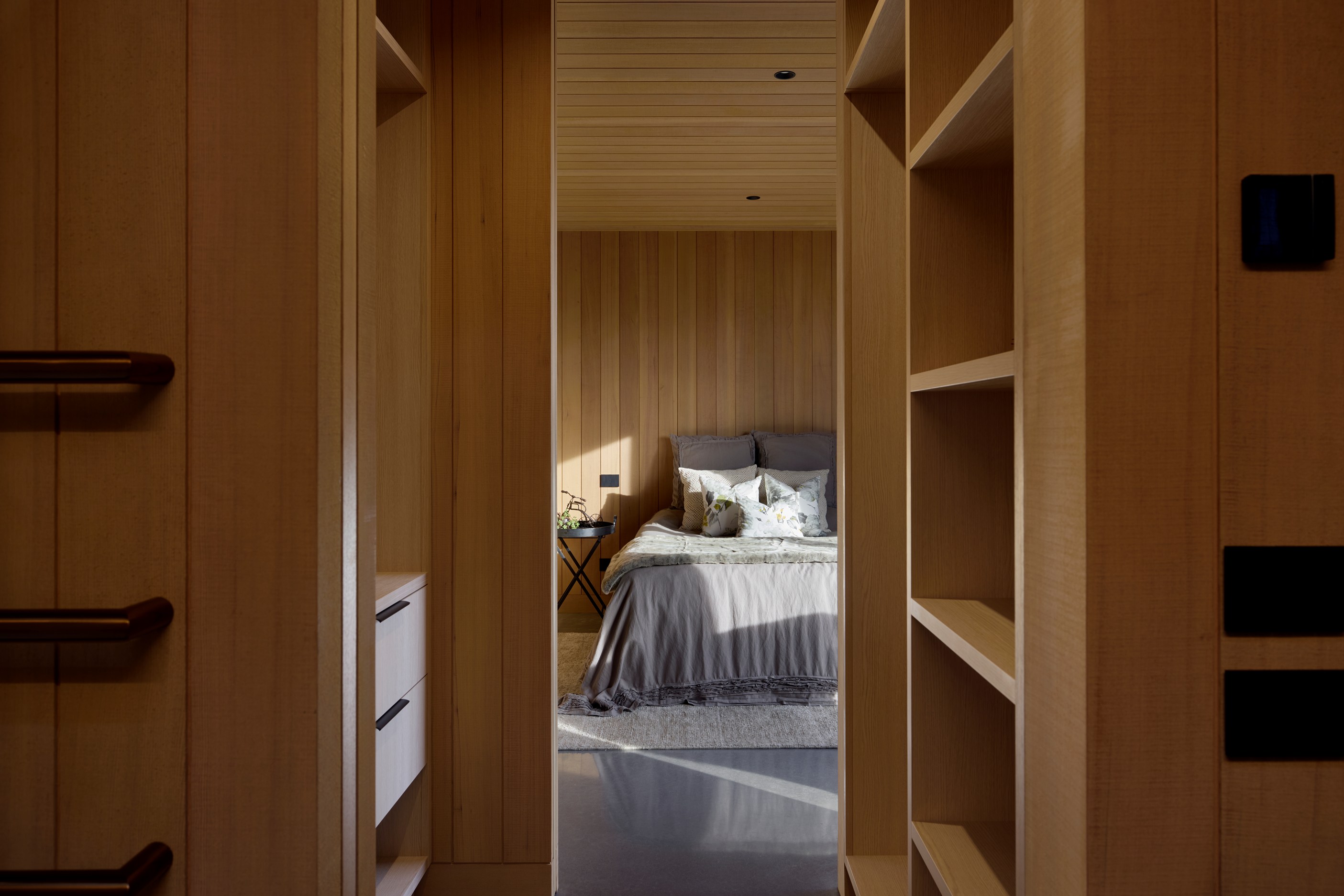 This dark delight on the shores of Tauranga Harbour deliberately appears low key to blend into its environs but is, in fact, all about thoughtful laidback luxe. The exterior, for example, has black in-situ concrete walls with a surface that emulates the bark of the nearby pōhutukawa tree. That’s the sort of detail that’s a hallmark of the 227sqm three-bedroom home. Inside, concrete makes a welcome reappearance and is offset by light hemlock timber walls and ceilings. Even the garage is given the timber treatment: ply lines the walls and has negative detail that emphasises the craftsmanship at play.