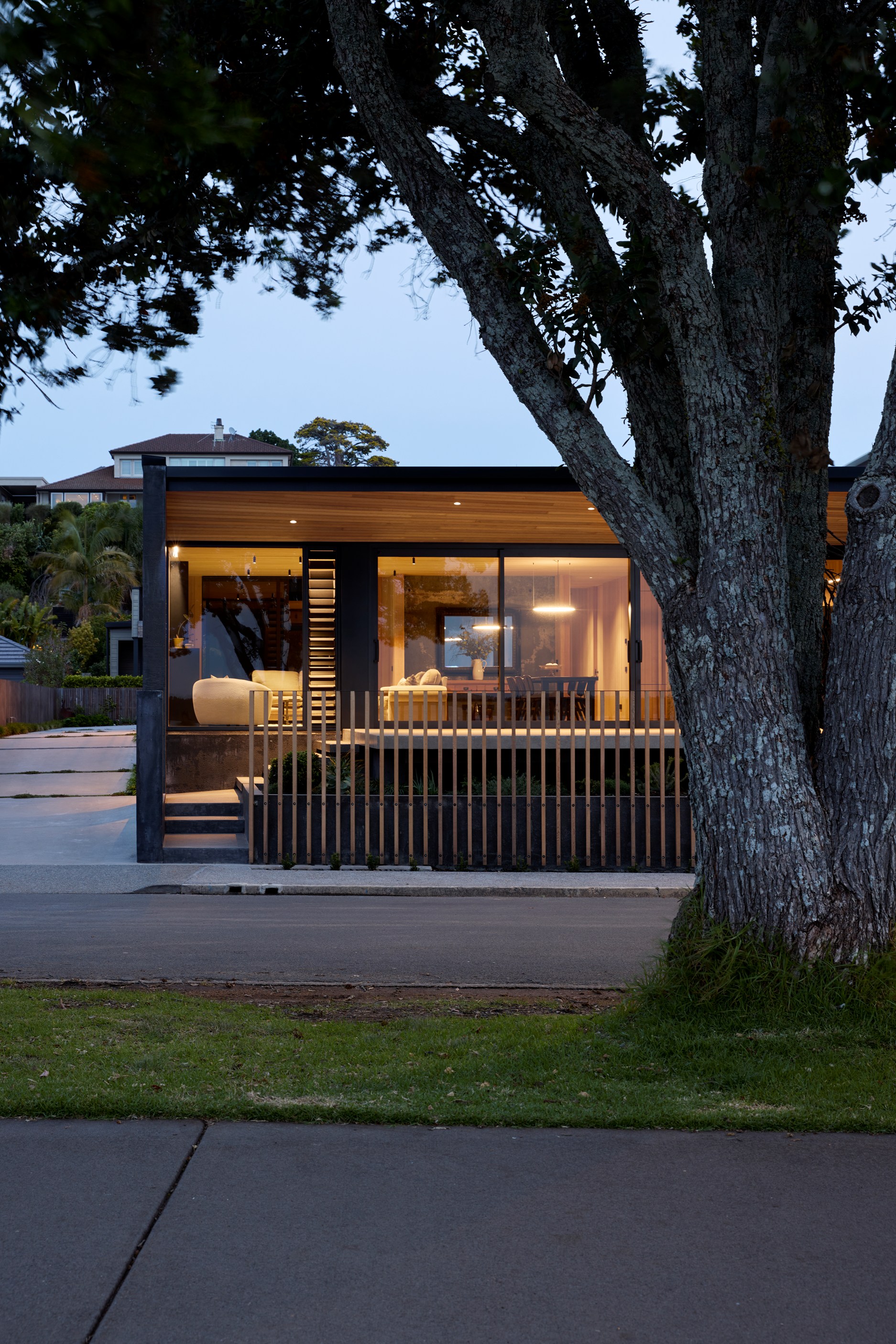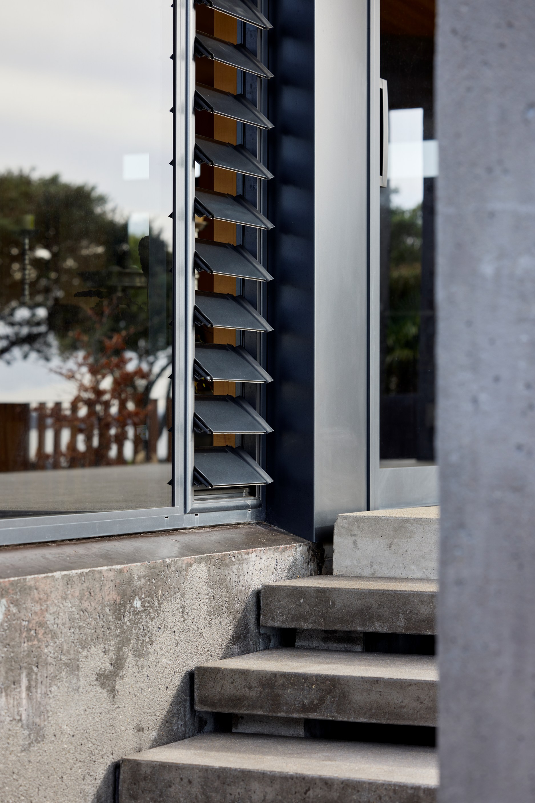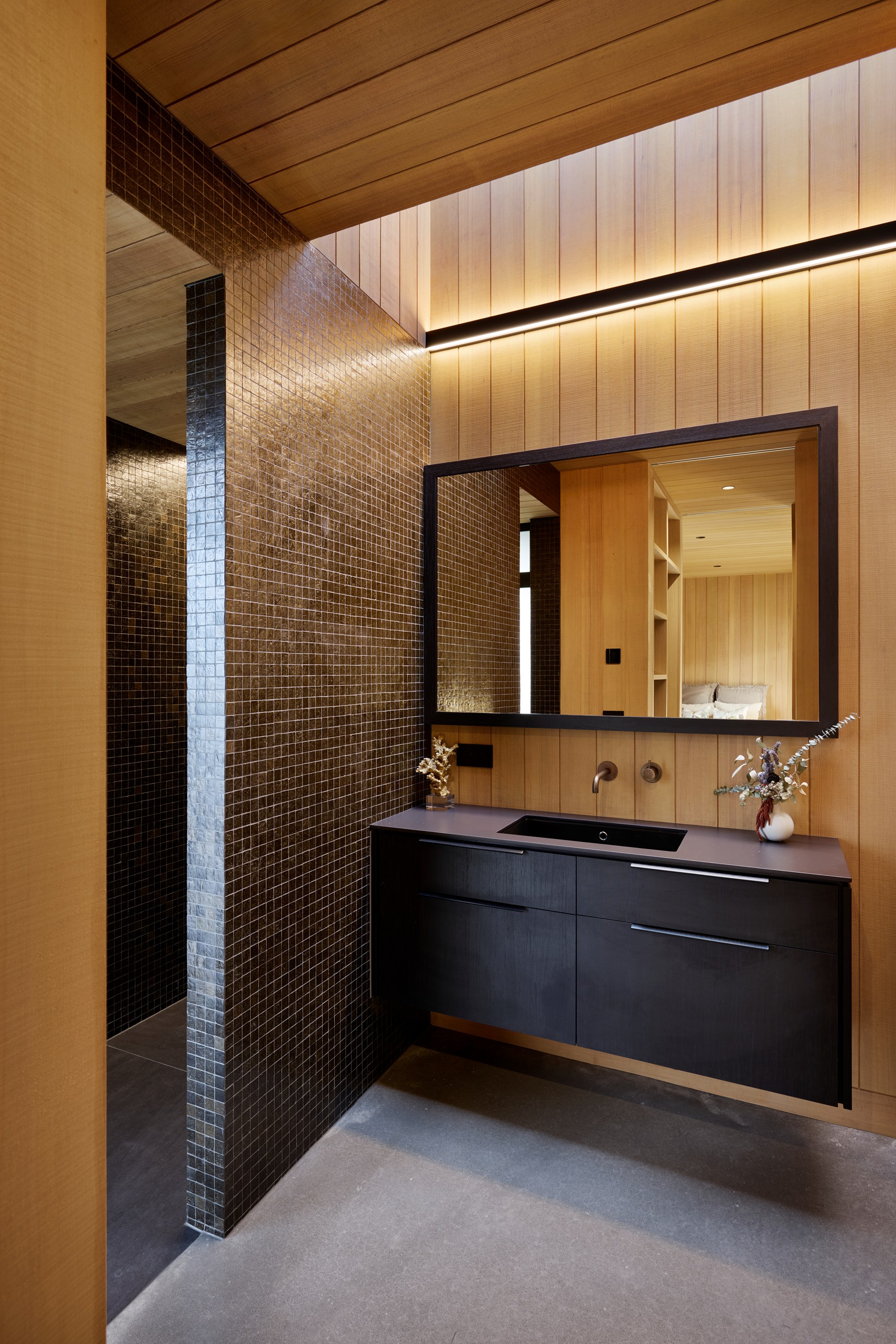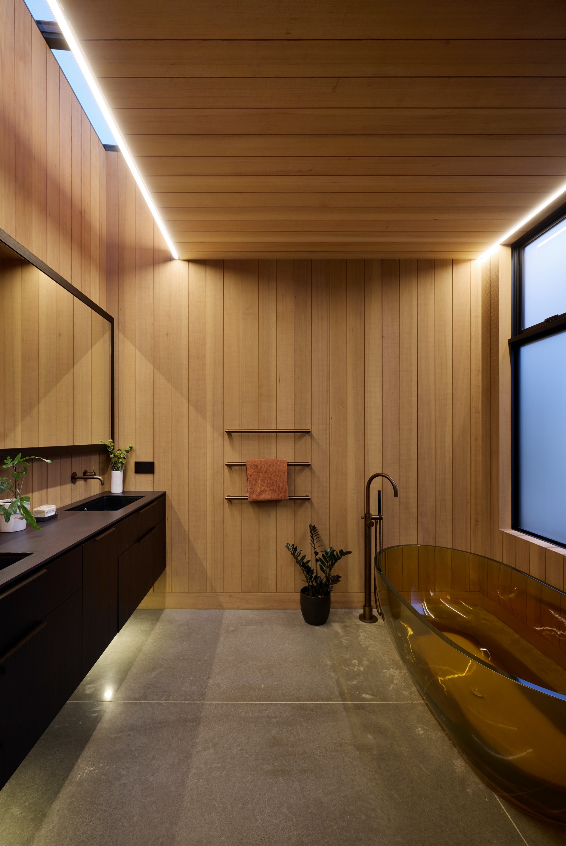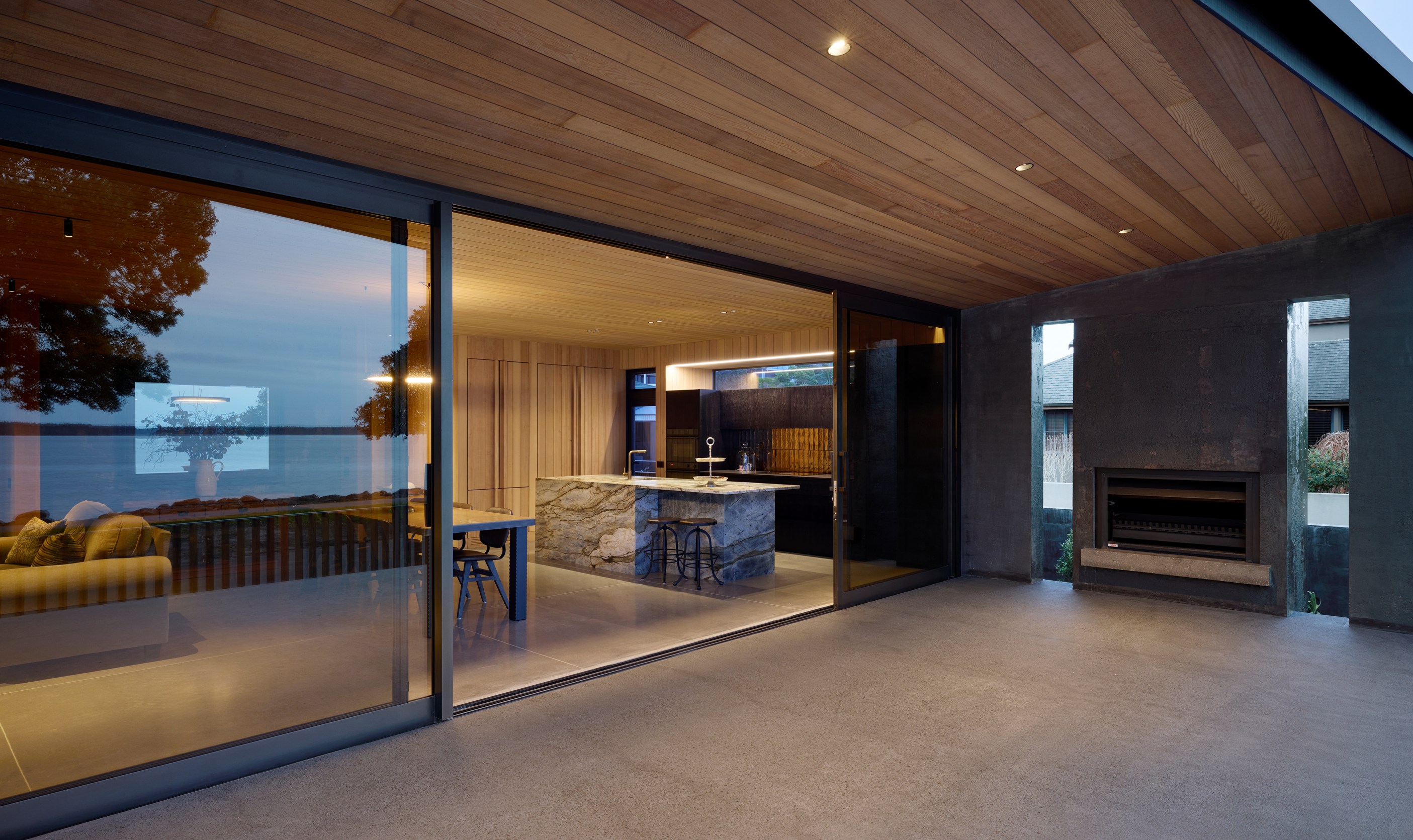 This dark delight on the shores of Tauranga Harbour deliberately appears low key to blend into its environs but is, in fact, all about thoughtful laidback luxe. The exterior, for example, has black in-situ concrete walls with a surface that emulates the bark of the nearby pōhutukawa tree. That’s the sort of detail that’s a hallmark of the 227sqm three-bedroom home. Inside, concrete makes a welcome reappearance and is offset by light hemlock timber walls and ceilings. Even the garage is given the timber treatment: ply lines the walls and has negative detail that emphasises the craftsmanship at play.