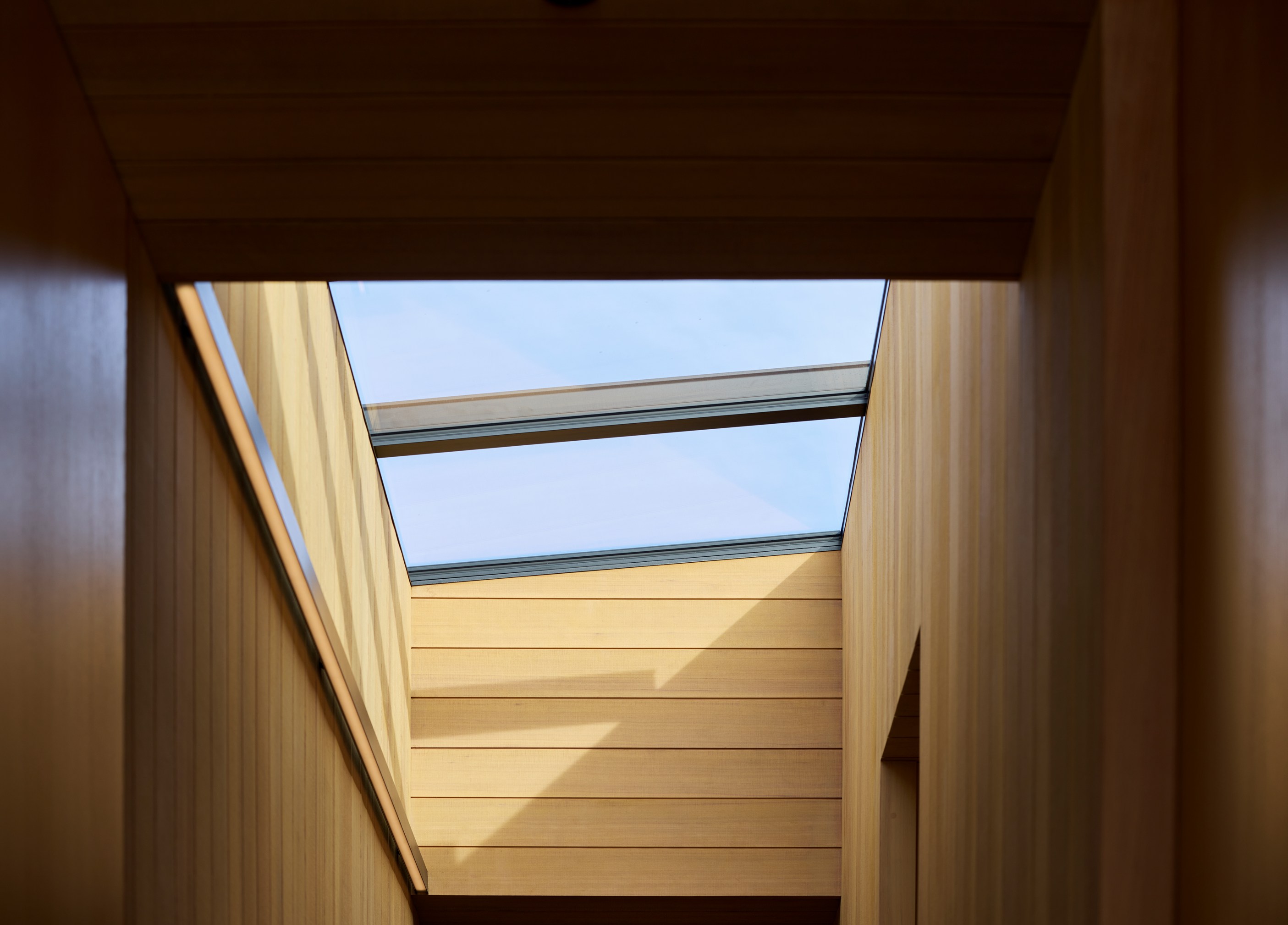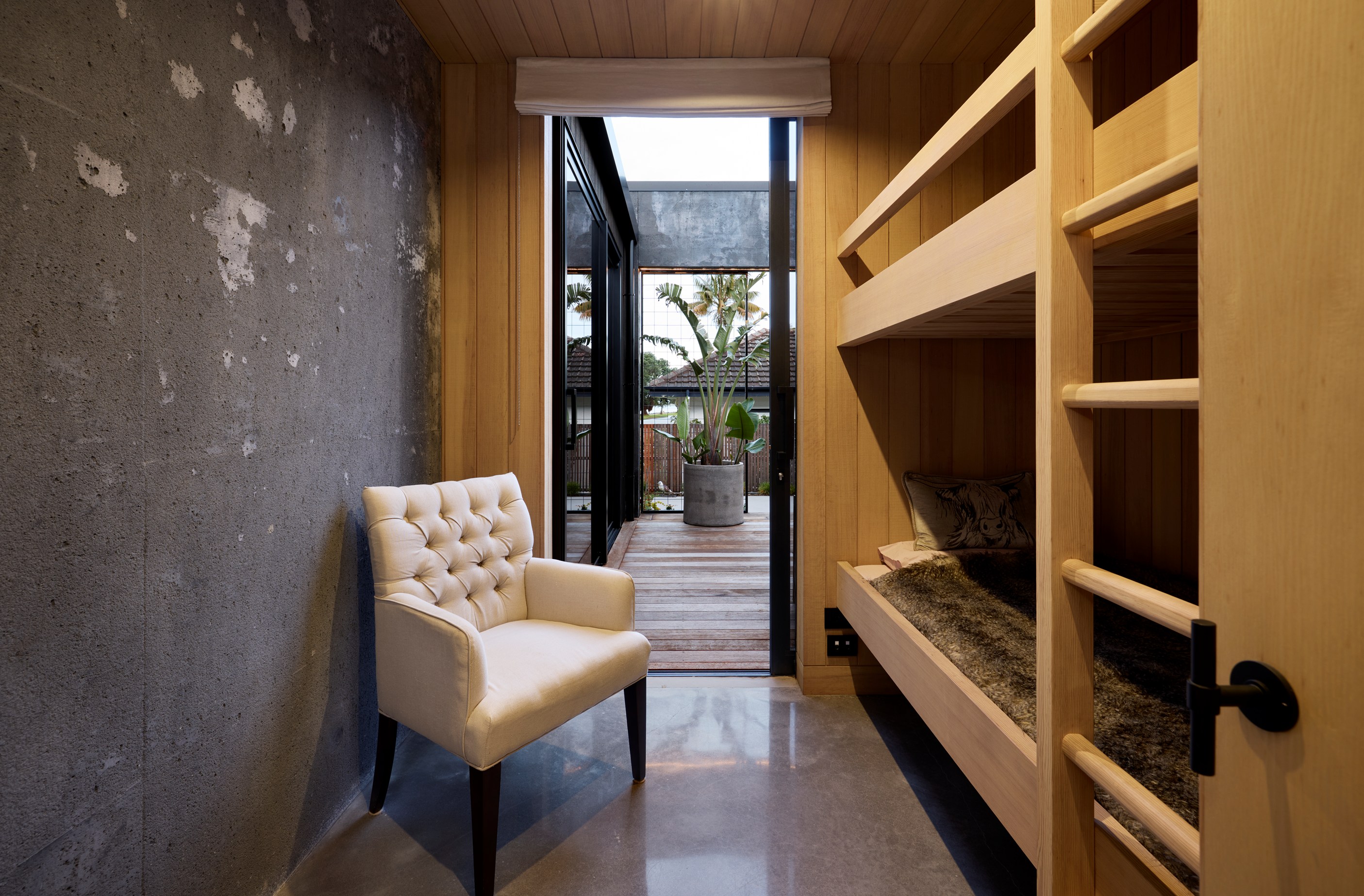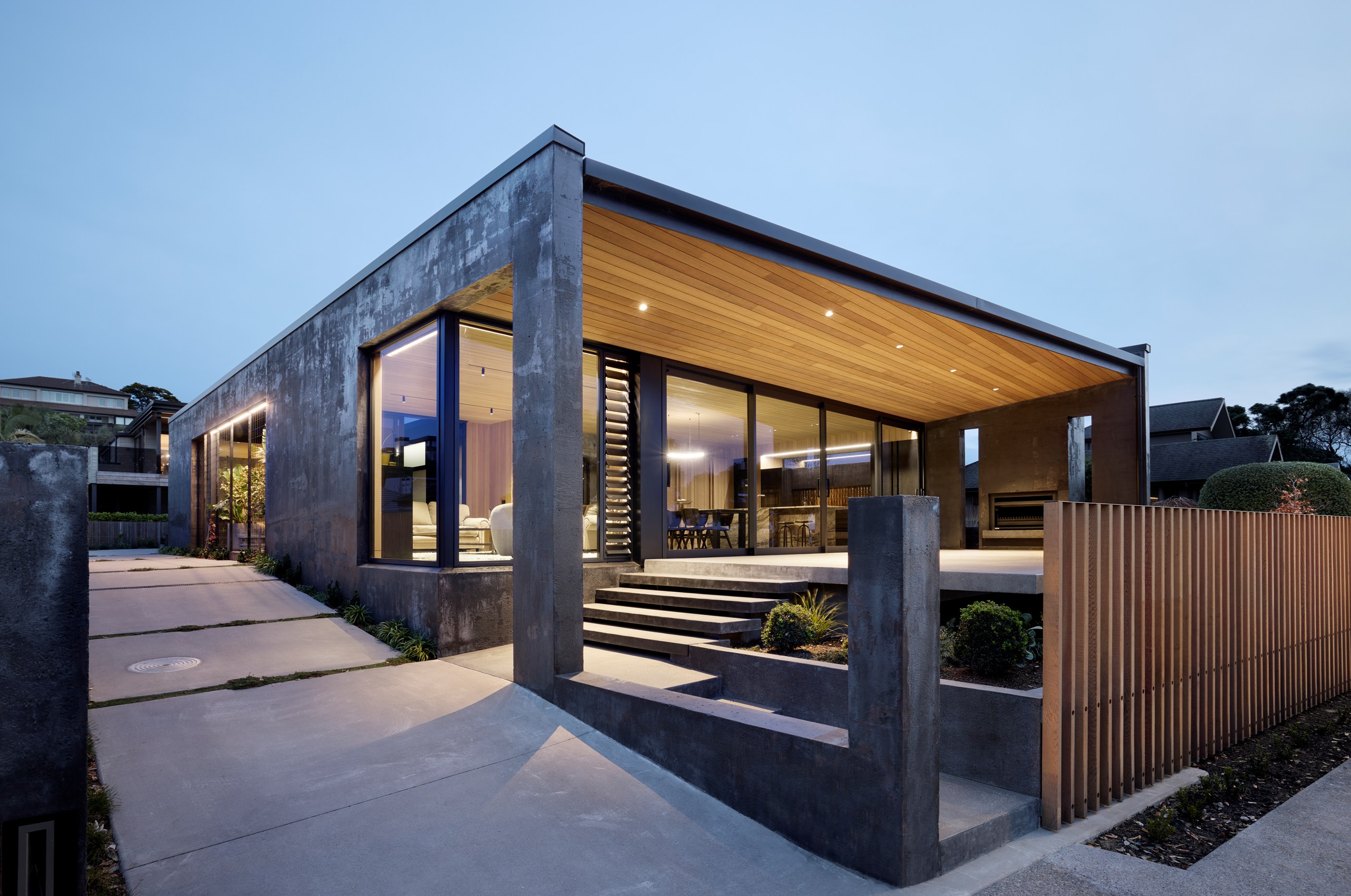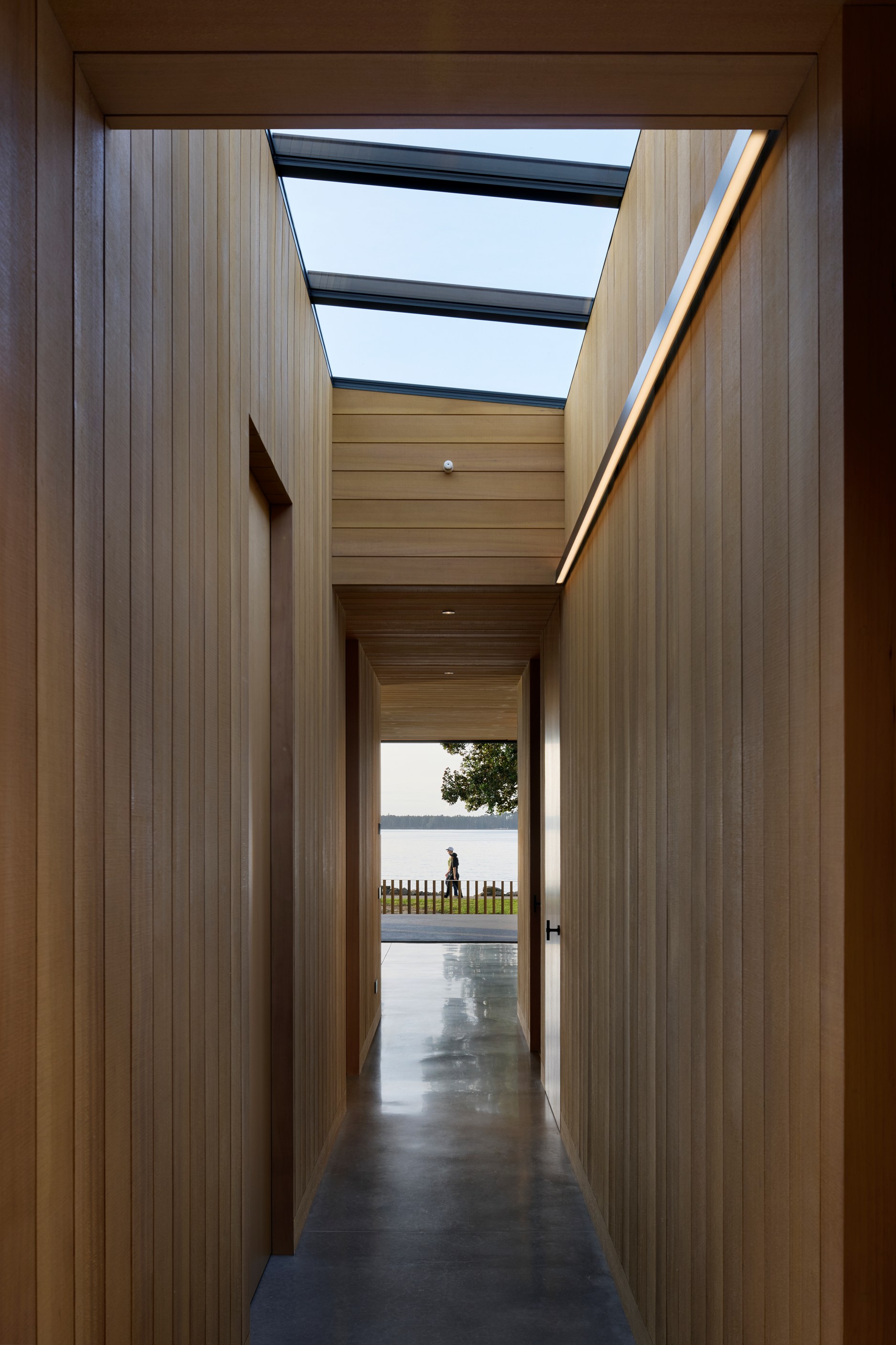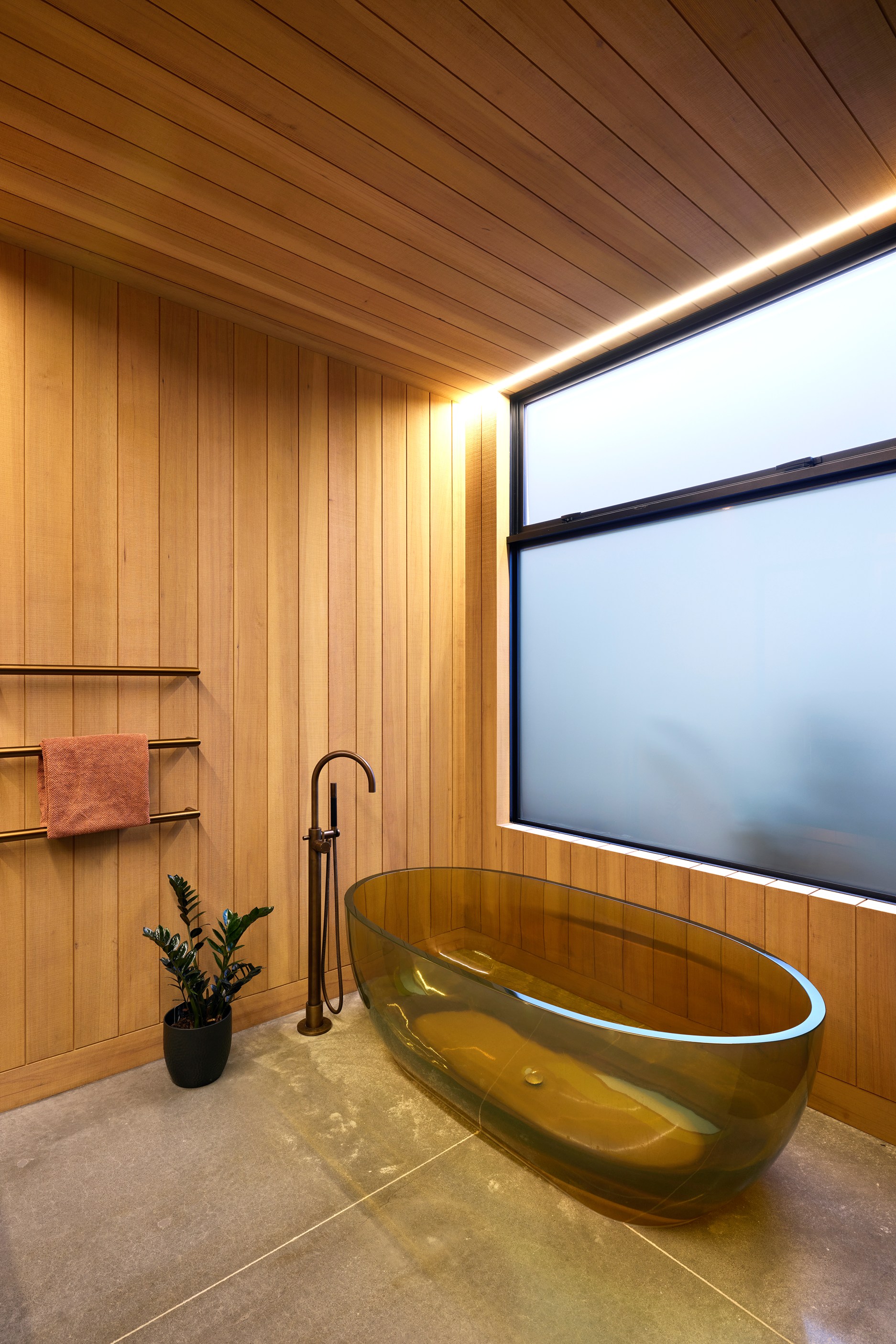 This dark delight on the shores of Tauranga Harbour deliberately appears low key to blend into its environs but is, in fact, all about thoughtful laidback luxe. The exterior, for example, has black in-situ concrete walls with a surface that emulates the bark of the nearby pōhutukawa tree. That’s the sort of detail that’s a hallmark of the 227sqm three-bedroom home. Inside, concrete makes a welcome reappearance and is offset by light hemlock timber walls and ceilings. Even the garage is given the timber treatment: ply lines the walls and has negative detail that emphasises the craftsmanship at play.
