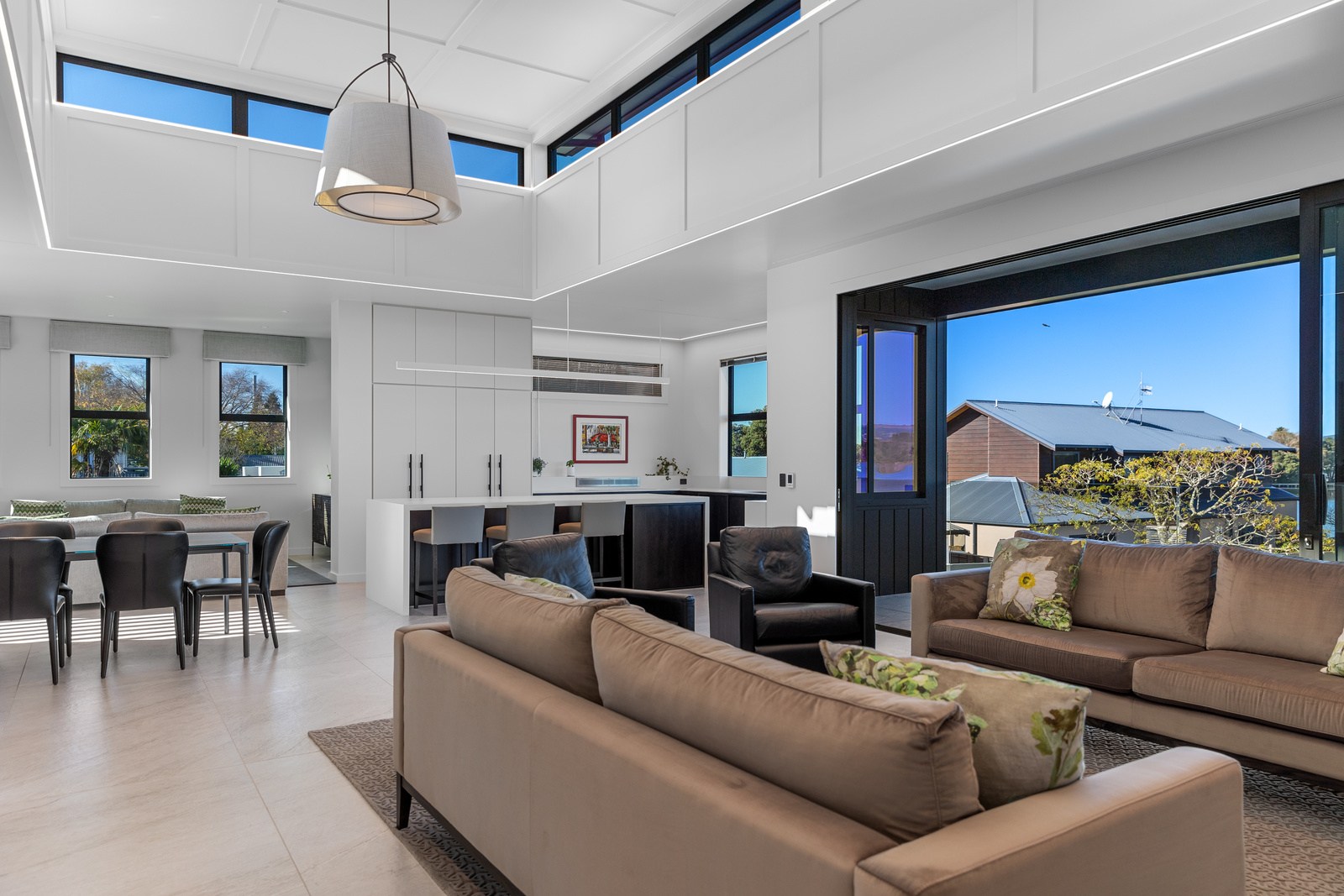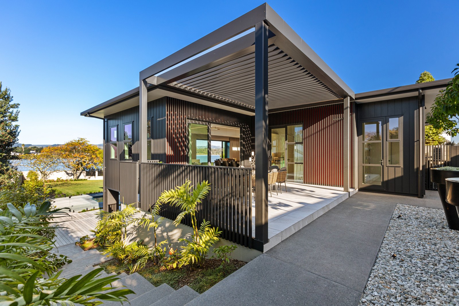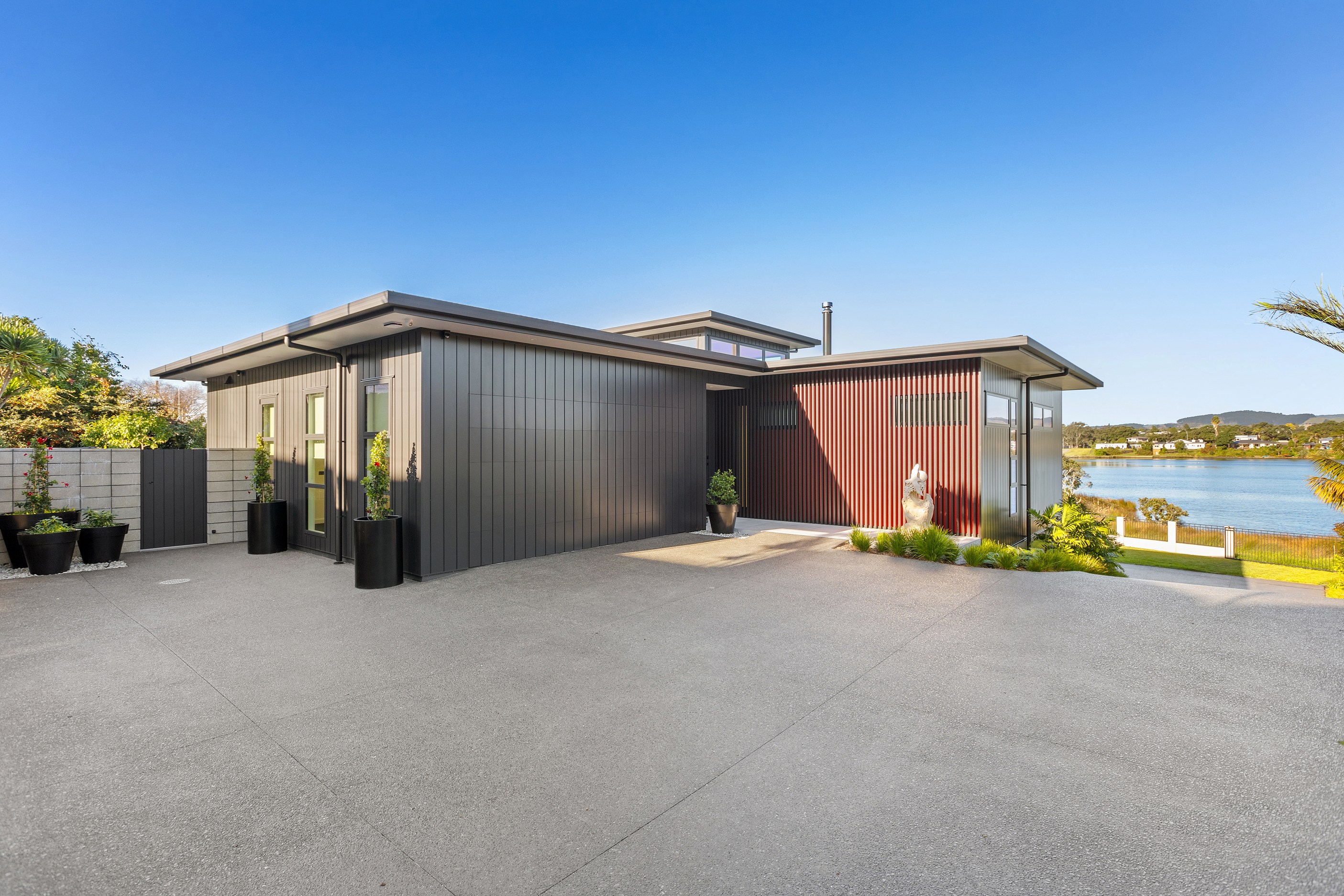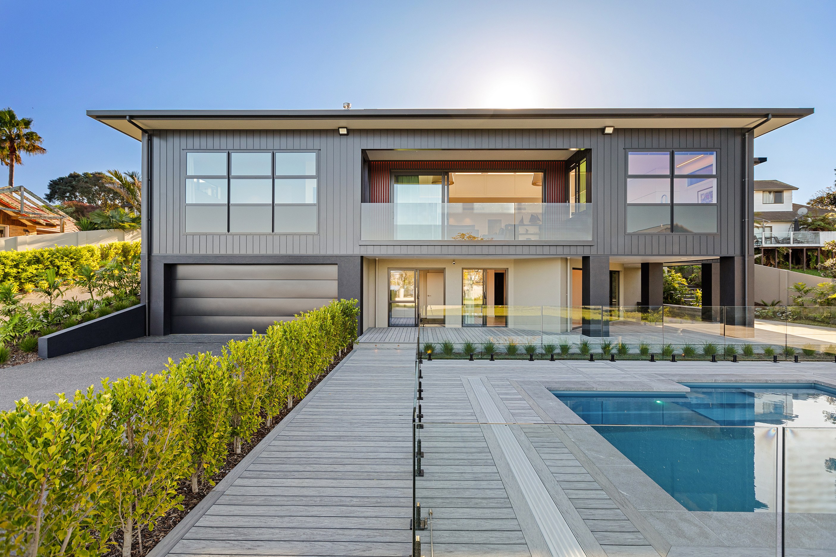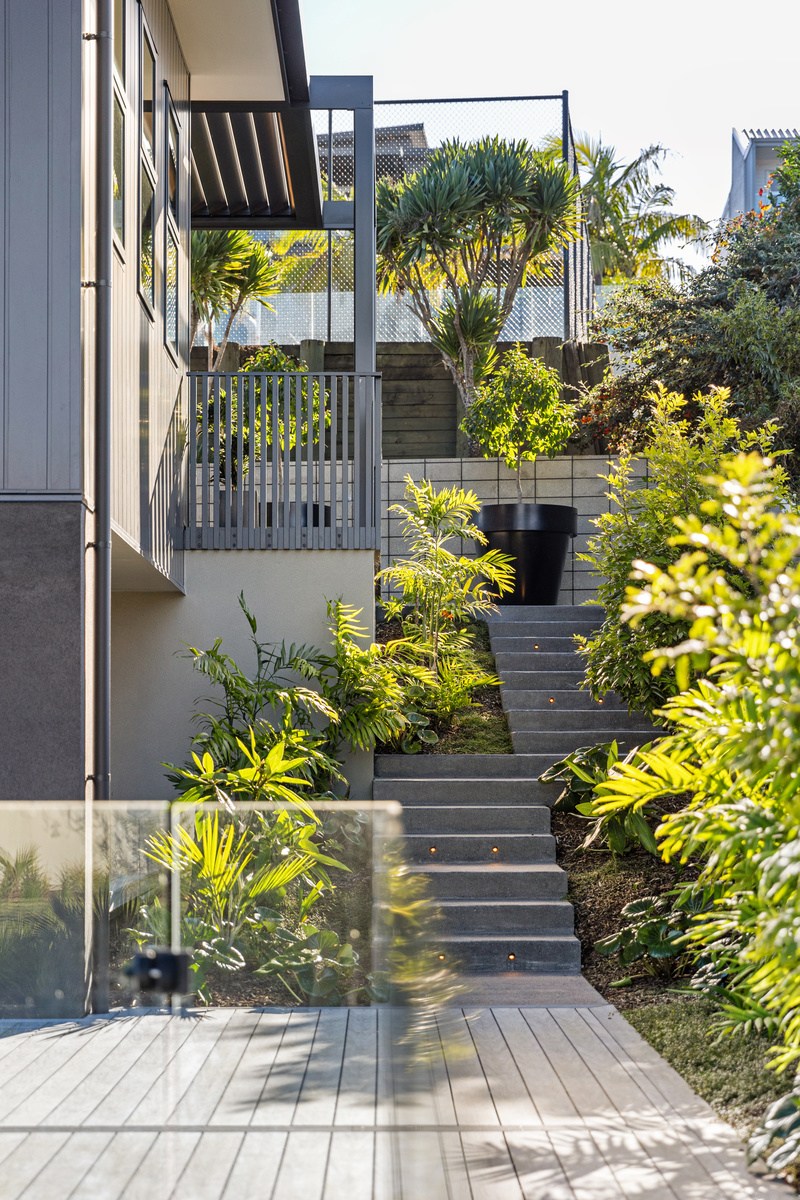 A bold architectural vision has transformed this home into a statement of refined coastal living. The original structure has been expertly reimagined by removing two upper storeys and retaining the solid plastered block base, laying the foundation for a breathtaking new form. Inspired by the owners’ love of the sea, the house now features a striking five-metre-high clerestory pop-up roof with aluminium joinery that captures panoramic harbour views and floods the interior with natural light. Aluminium vertical weatherboards and painted plastered feature walls with screen detailing elevate the contemporary façade.