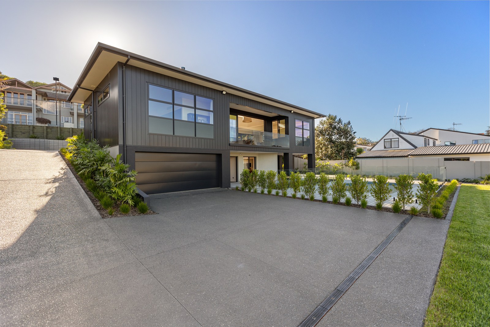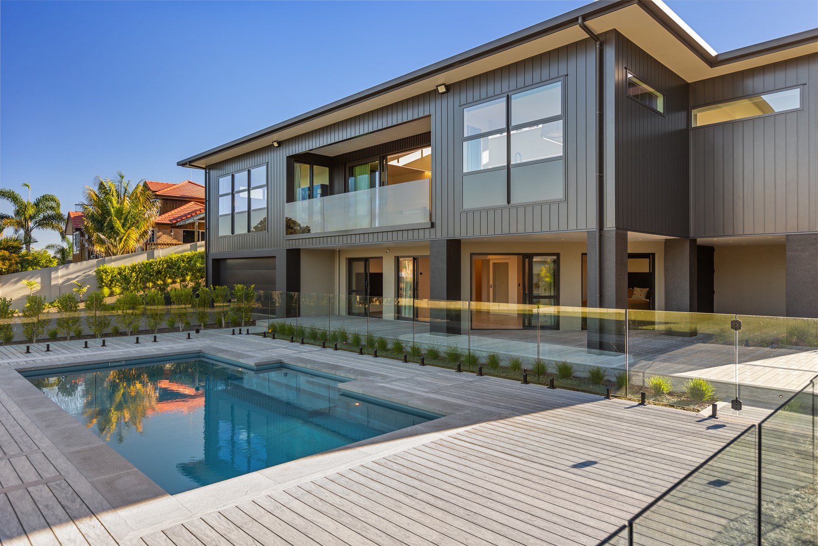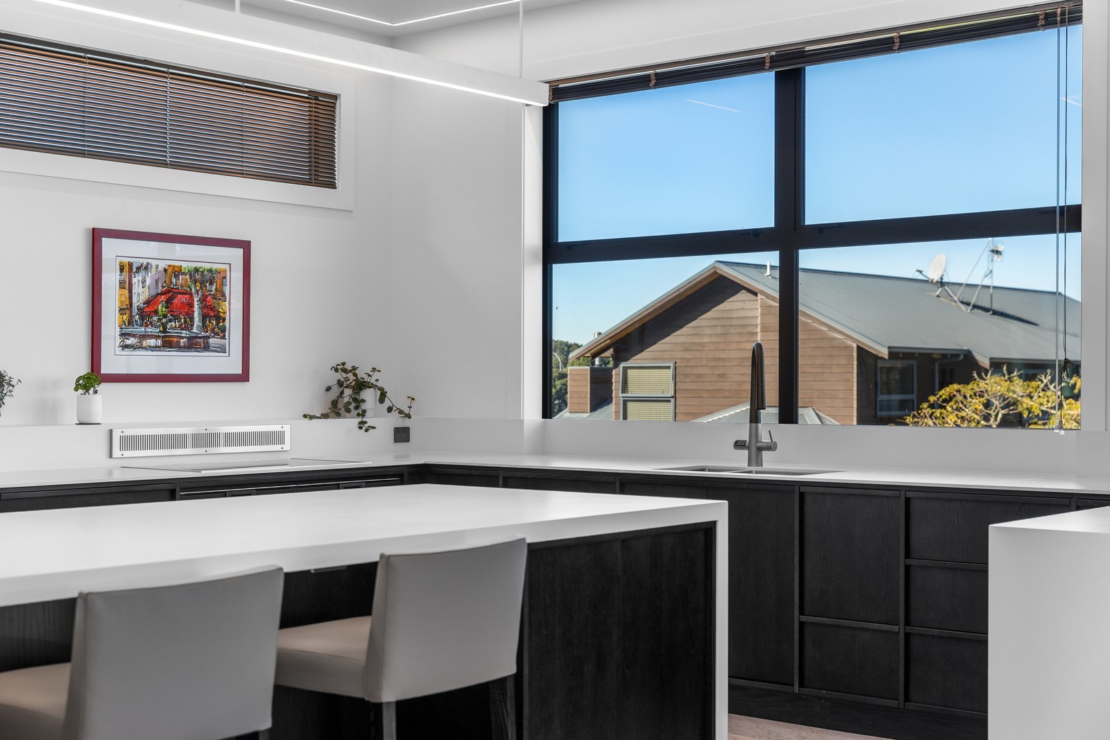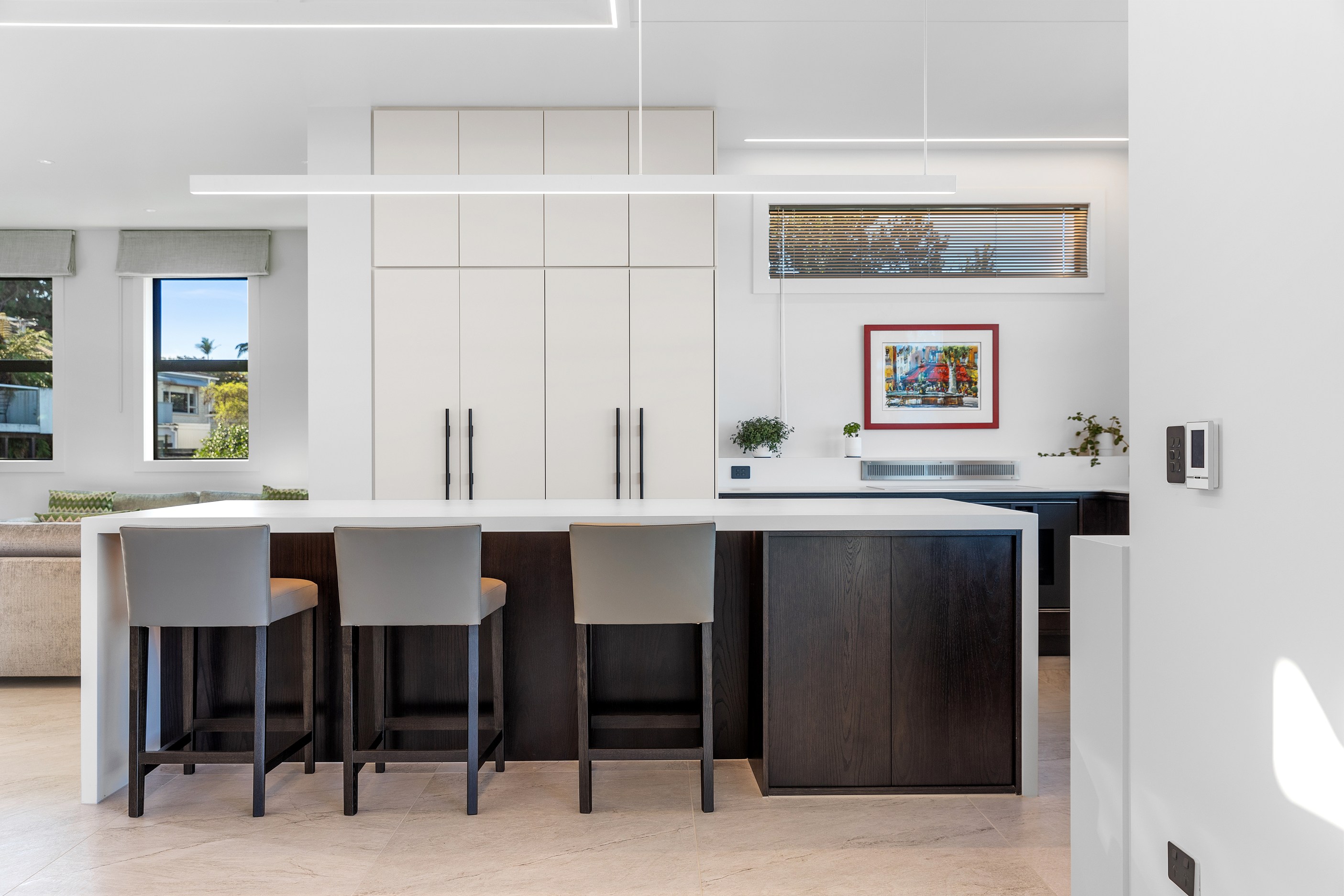 A bold architectural vision has transformed this home into a statement of refined coastal living. The original structure has been expertly reimagined by removing two upper storeys and retaining the solid plastered block base, laying the foundation for a breathtaking new form. Inspired by the owners’ love of the sea, the house now features a striking five-metre-high clerestory pop-up roof with aluminium joinery that captures panoramic harbour views and floods the interior with natural light. Aluminium vertical weatherboards and painted plastered feature walls with screen detailing elevate the contemporary façade.