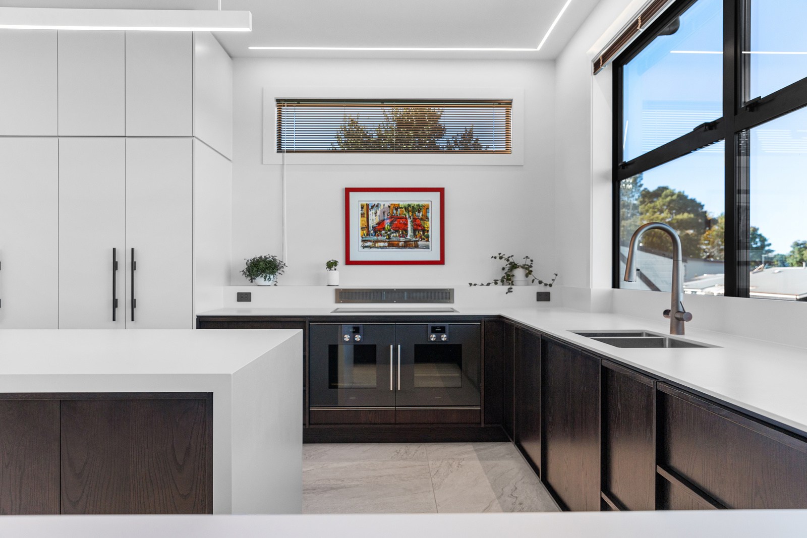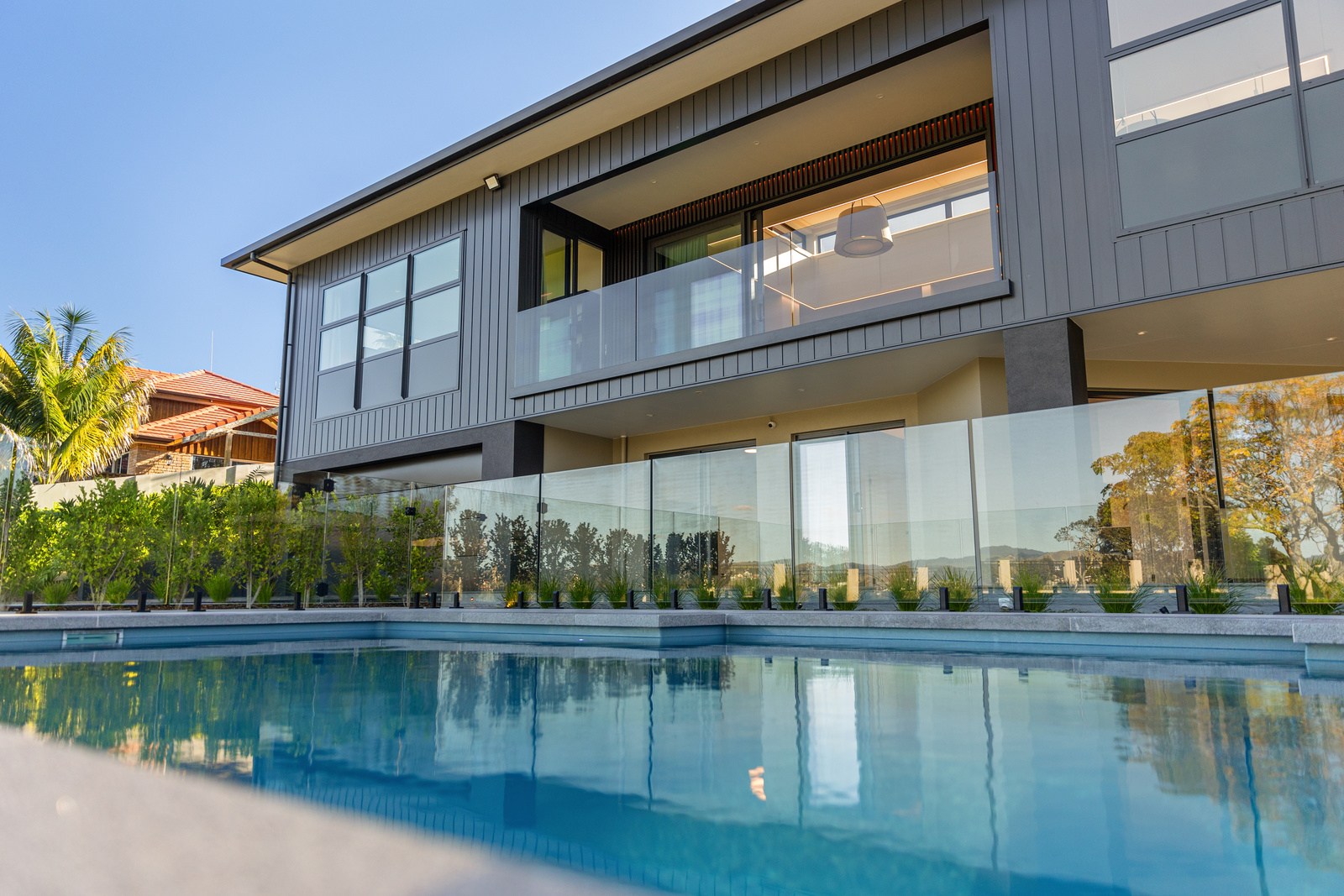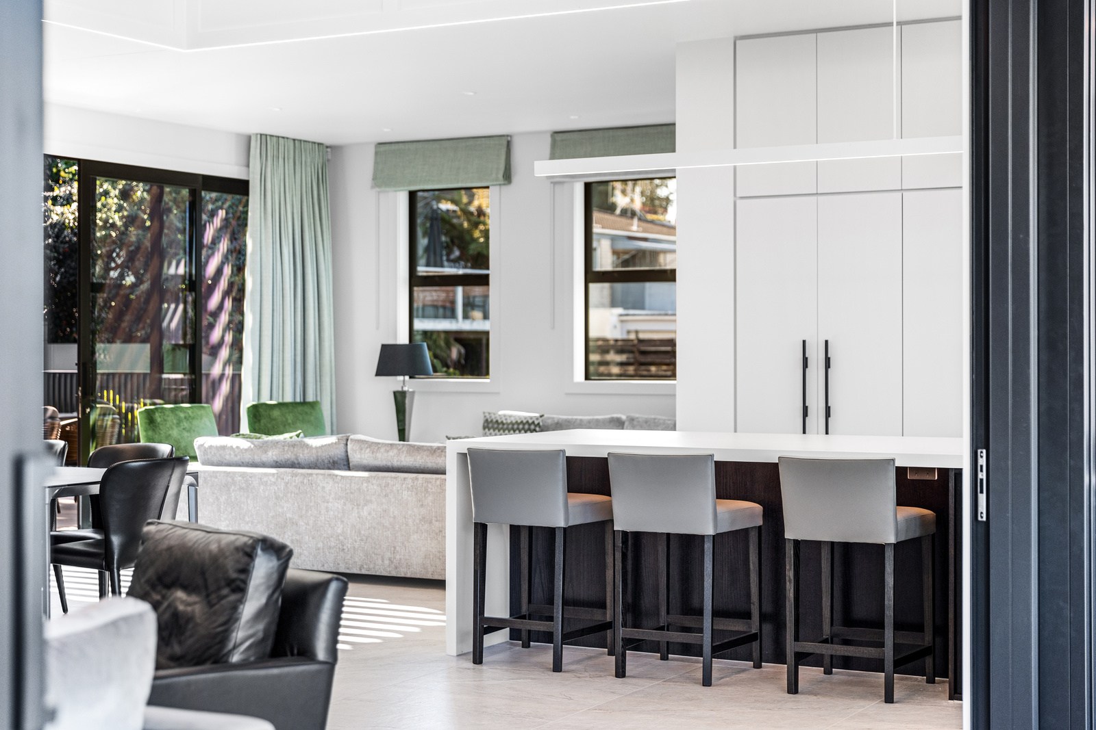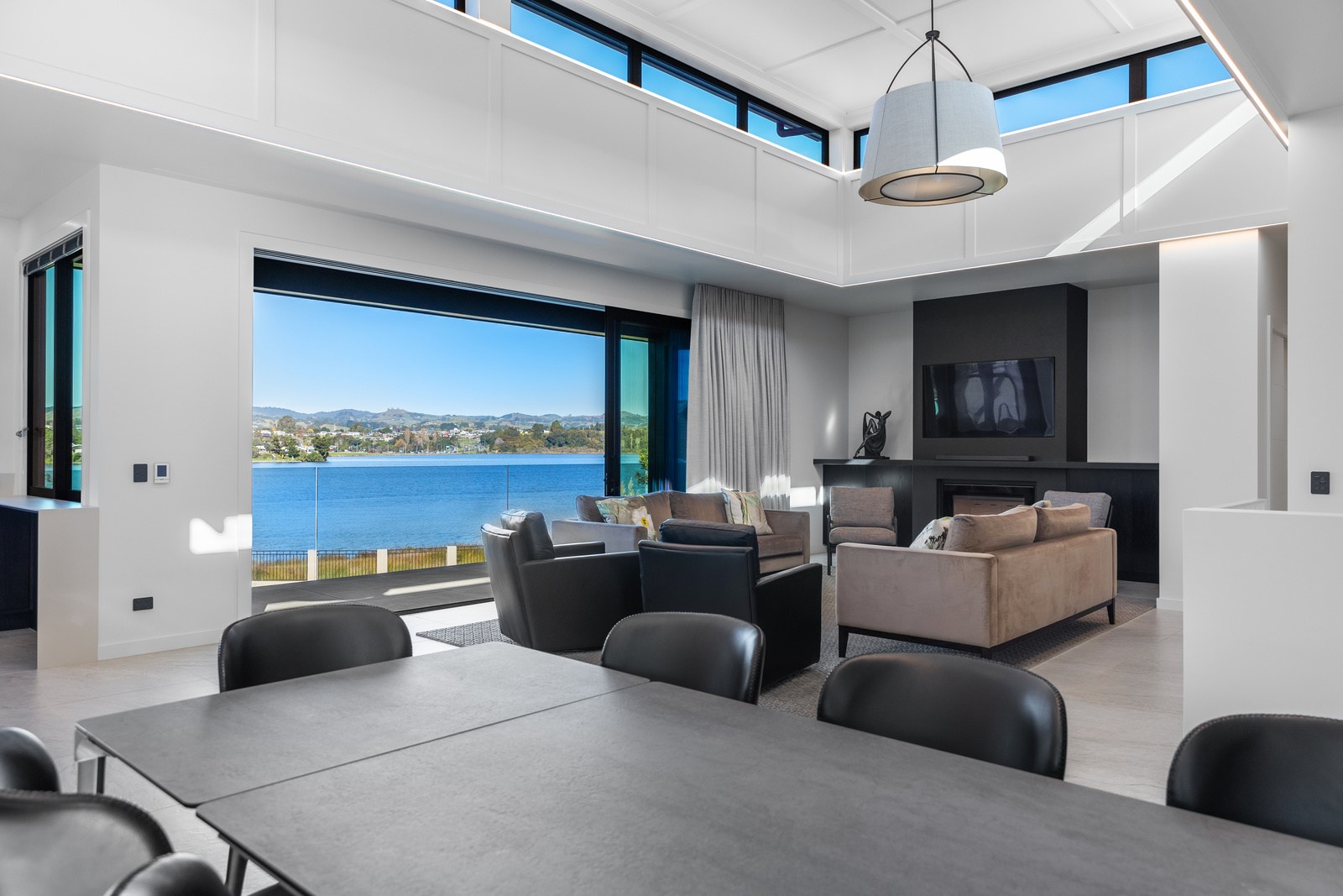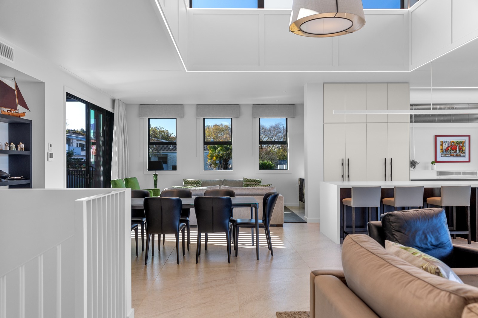 A bold architectural vision has transformed this home into a statement of refined coastal living. The original structure has been expertly reimagined by removing two upper storeys and retaining the solid plastered block base, laying the foundation for a breathtaking new form. Inspired by the owners’ love of the sea, the house now features a striking five-metre-high clerestory pop-up roof with aluminium joinery that captures panoramic harbour views and floods the interior with natural light. Aluminium vertical weatherboards and painted plastered feature walls with screen detailing elevate the contemporary façade.