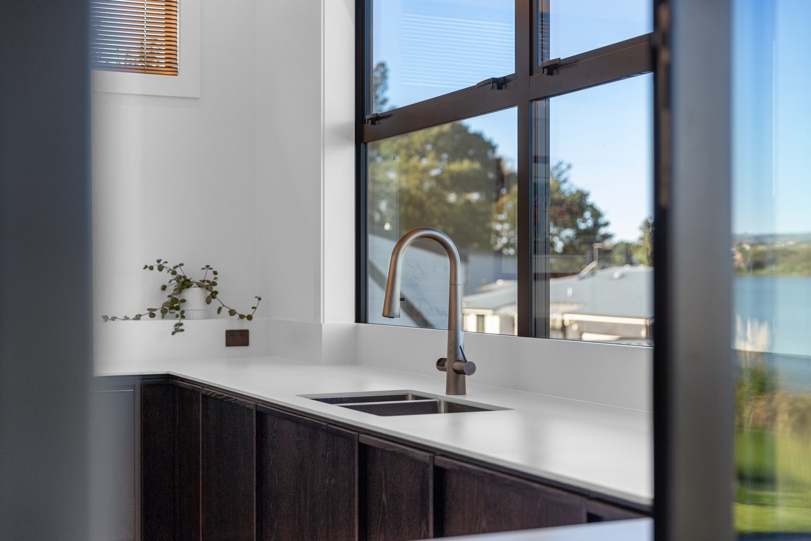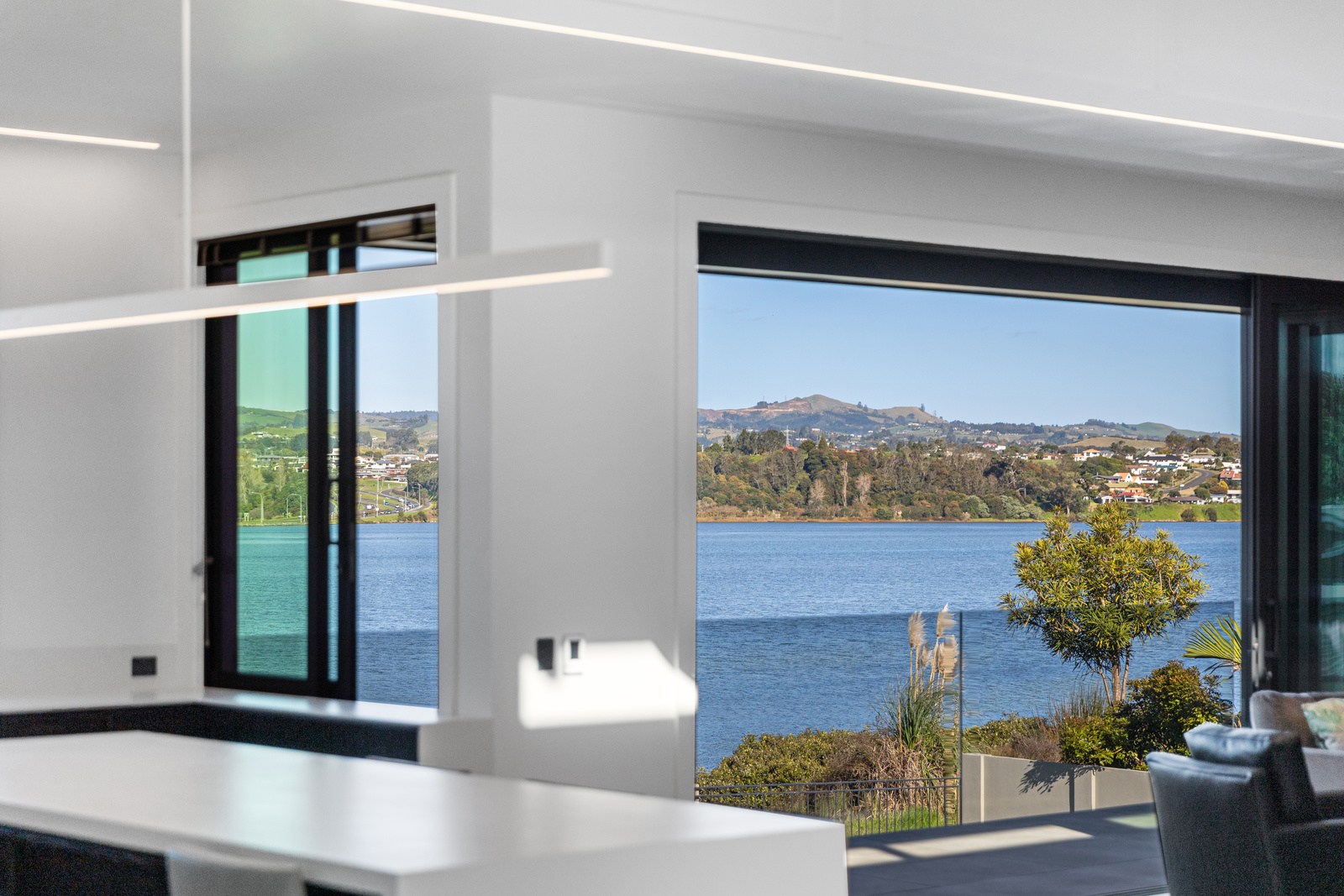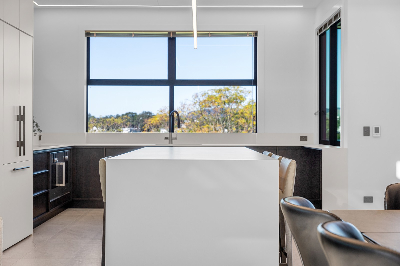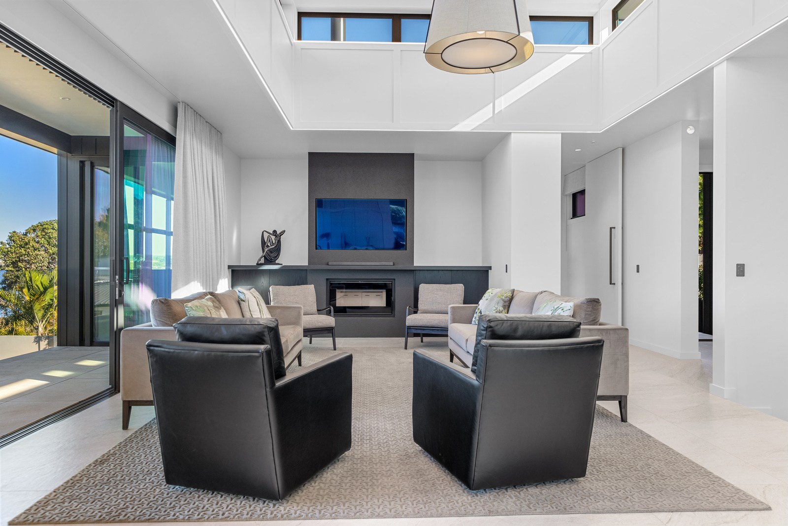 A bold architectural vision has transformed this home into a statement of refined coastal living. The original structure has been expertly reimagined by removing two upper storeys and retaining the solid plastered block base, laying the foundation for a breathtaking new form. Inspired by the owners’ love of the sea, the house now features a striking five-metre-high clerestory pop-up roof with aluminium joinery that captures panoramic harbour views and floods the interior with natural light. Aluminium vertical weatherboards and painted plastered feature walls with screen detailing elevate the contemporary façade.