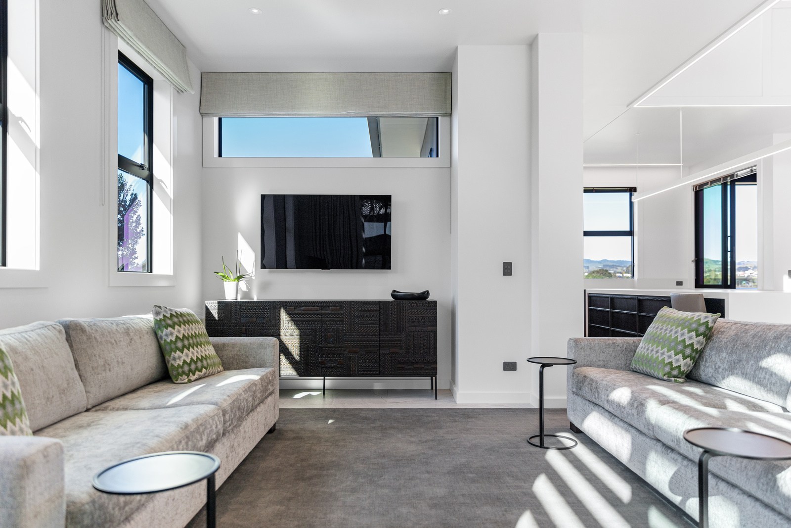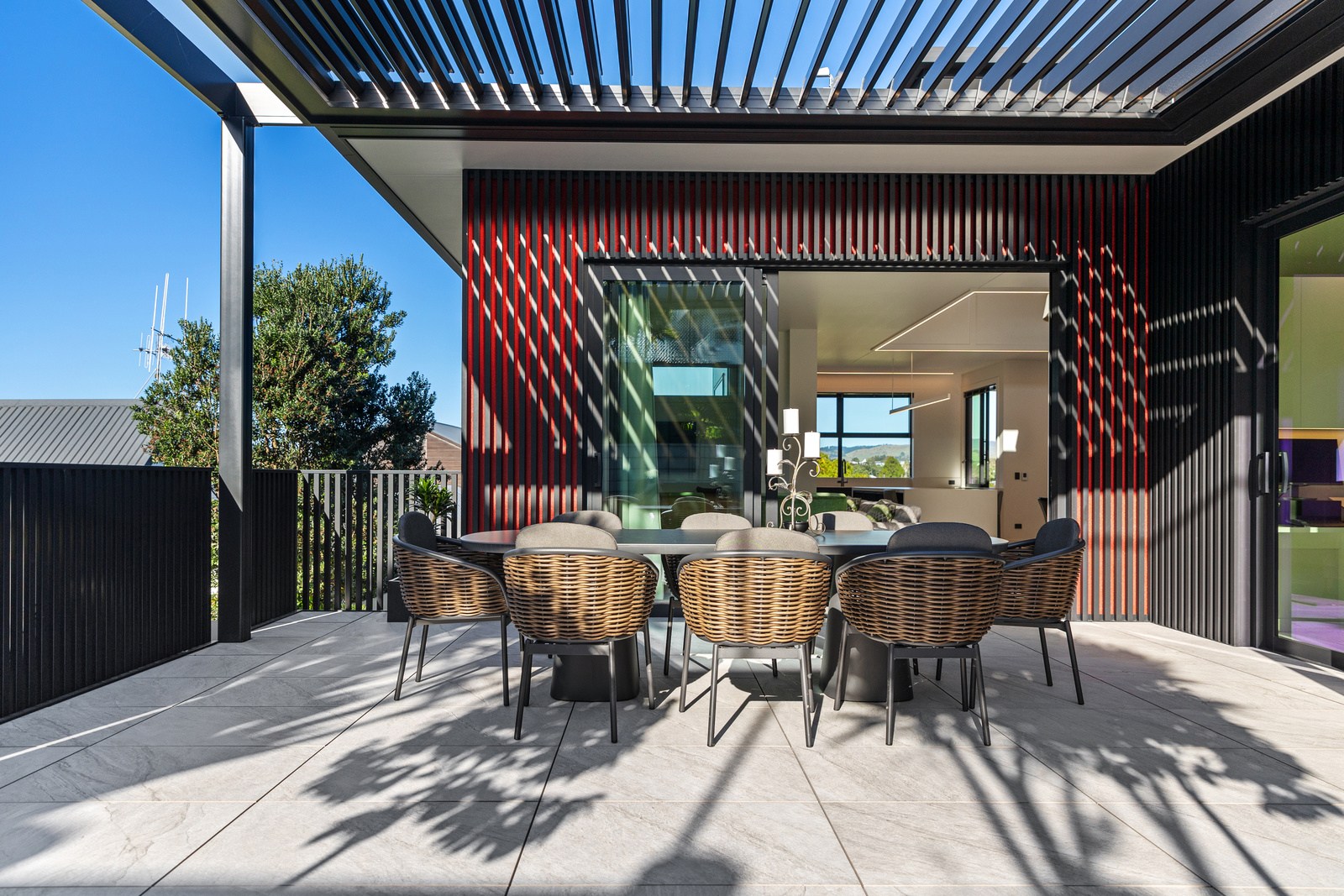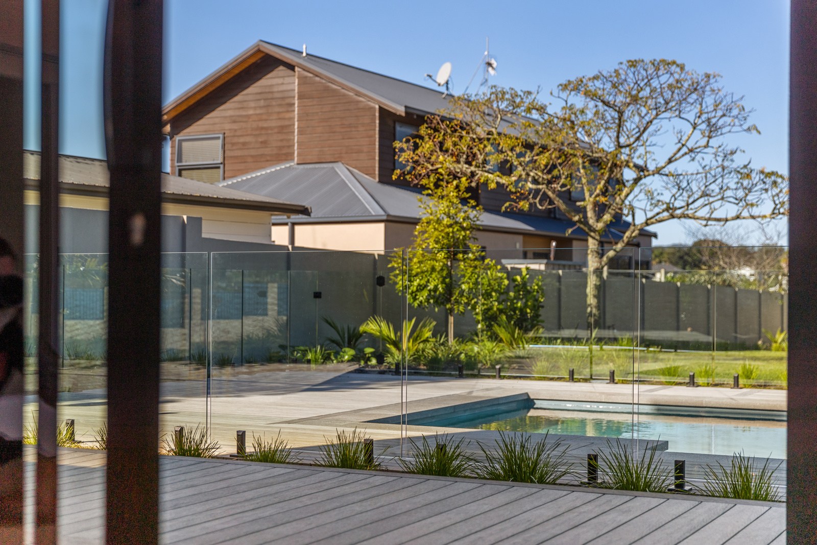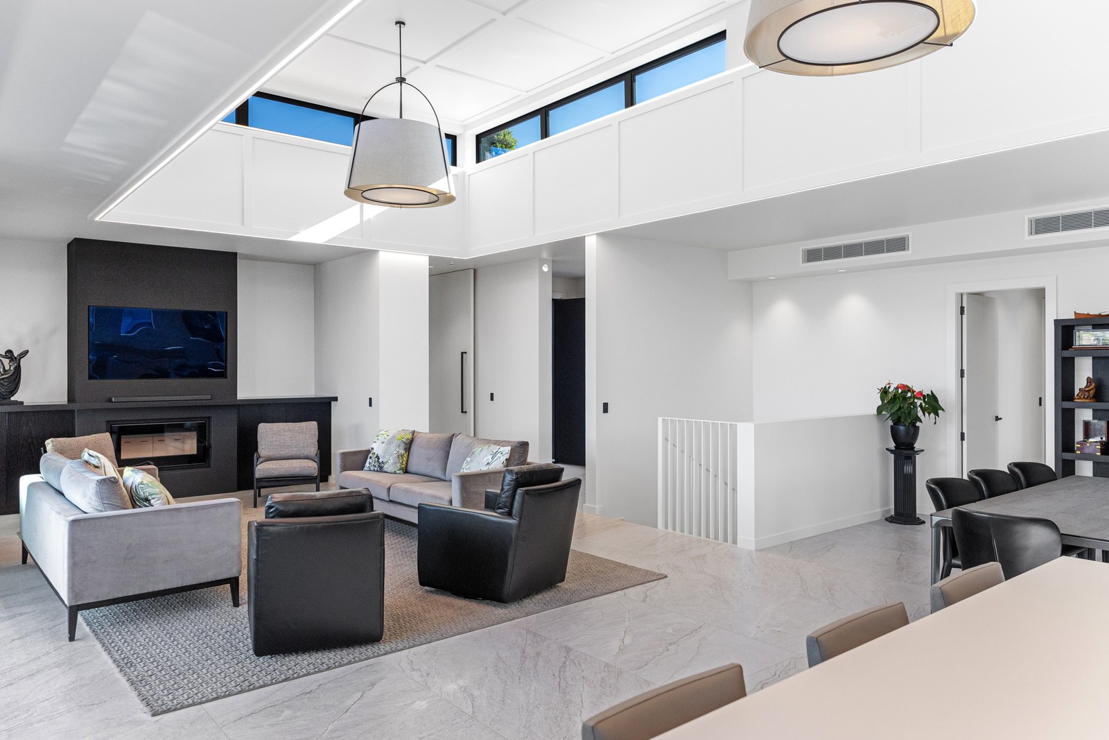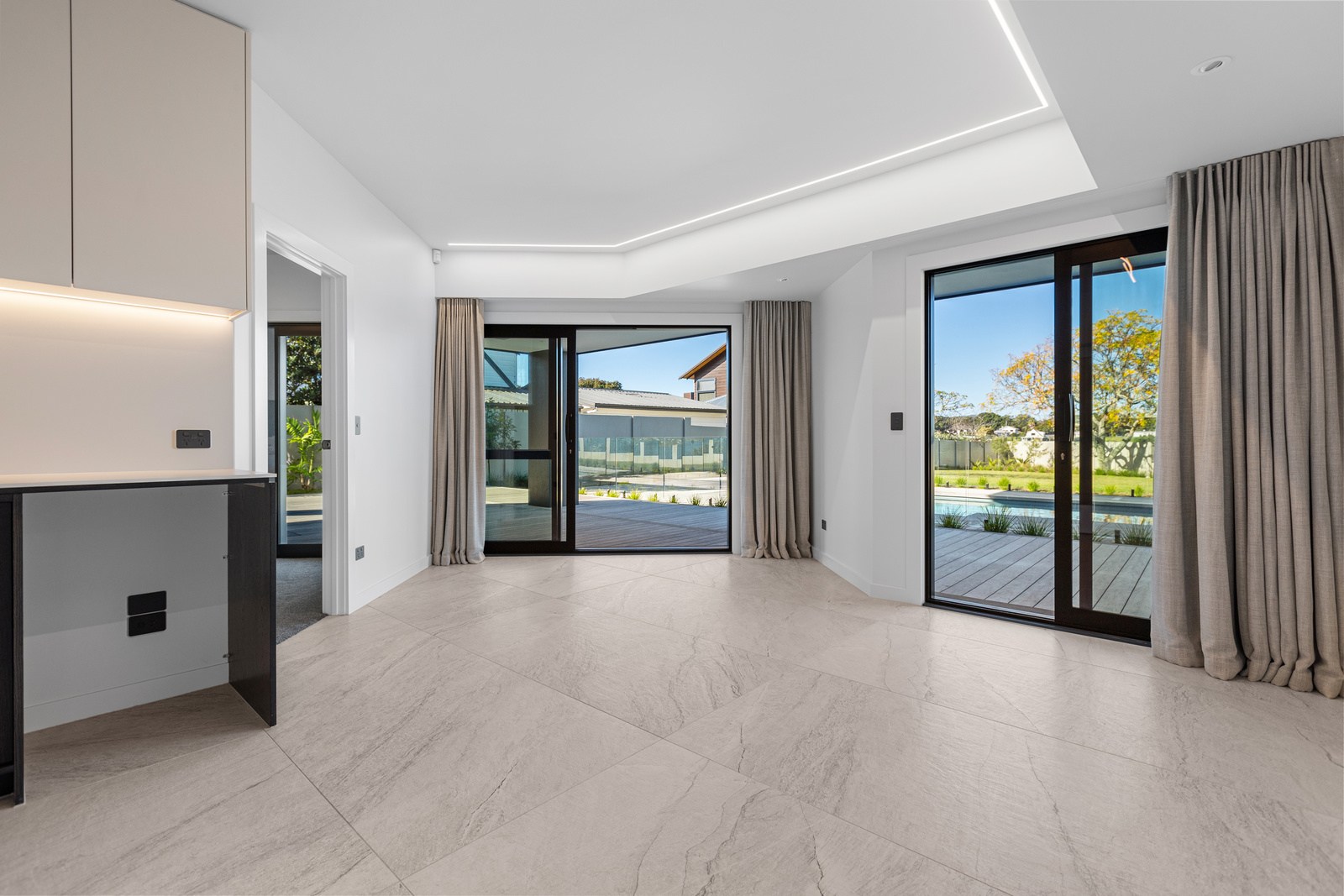 A bold architectural vision has transformed this home into a statement of refined coastal living. The original structure has been expertly reimagined by removing two upper storeys and retaining the solid plastered block base, laying the foundation for a breathtaking new form. Inspired by the owners’ love of the sea, the house now features a striking five-metre-high clerestory pop-up roof with aluminium joinery that captures panoramic harbour views and floods the interior with natural light. Aluminium vertical weatherboards and painted plastered feature walls with screen detailing elevate the contemporary façade.