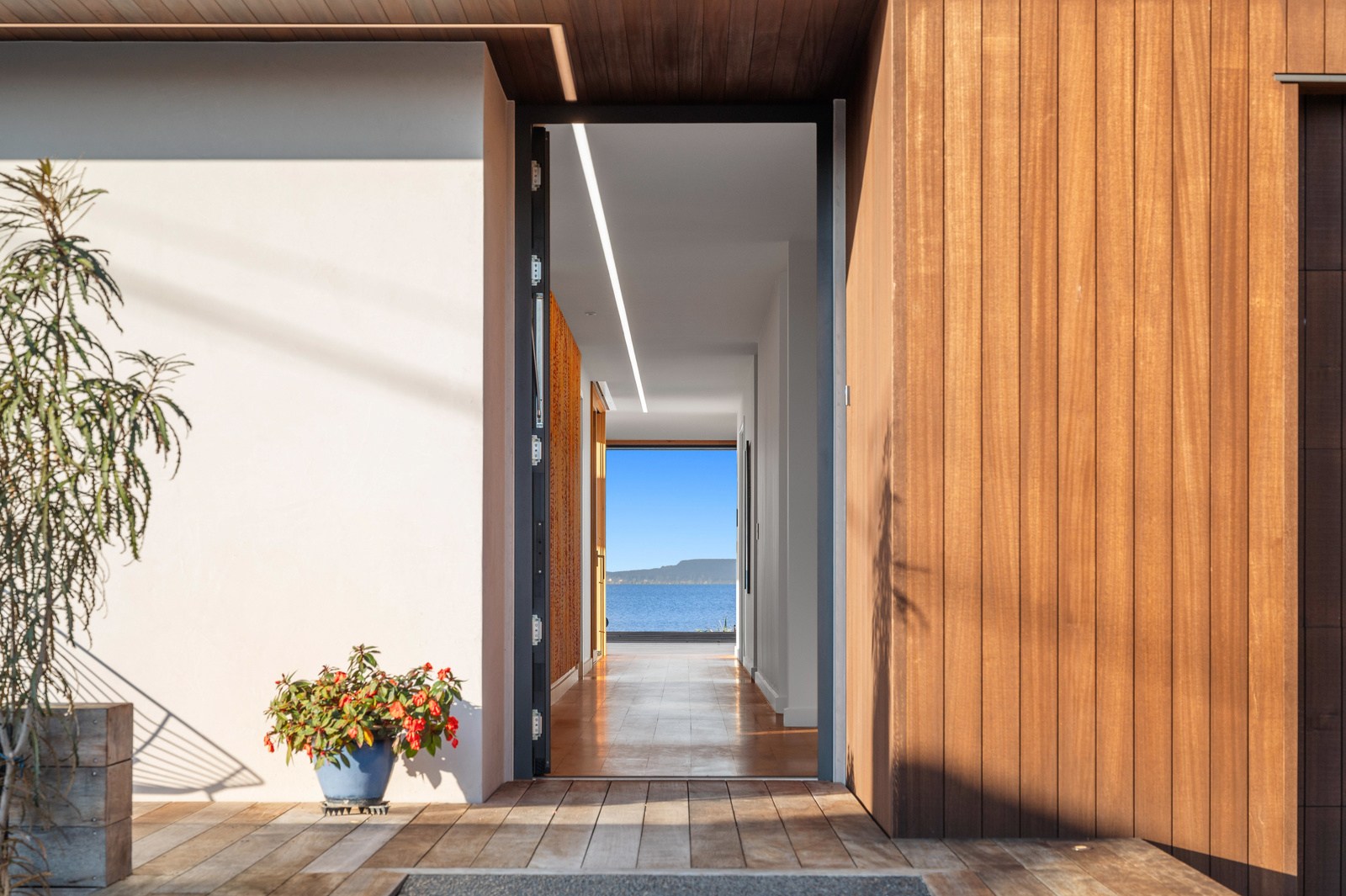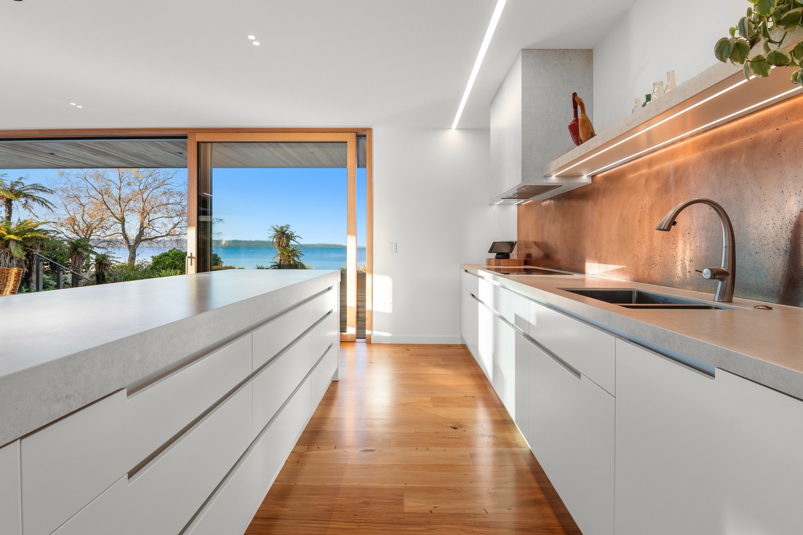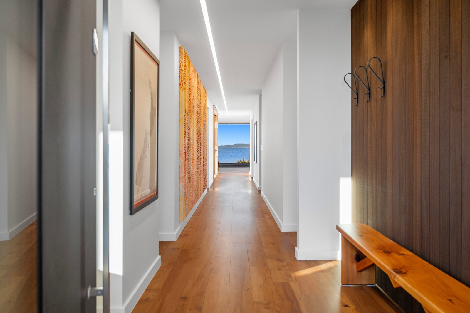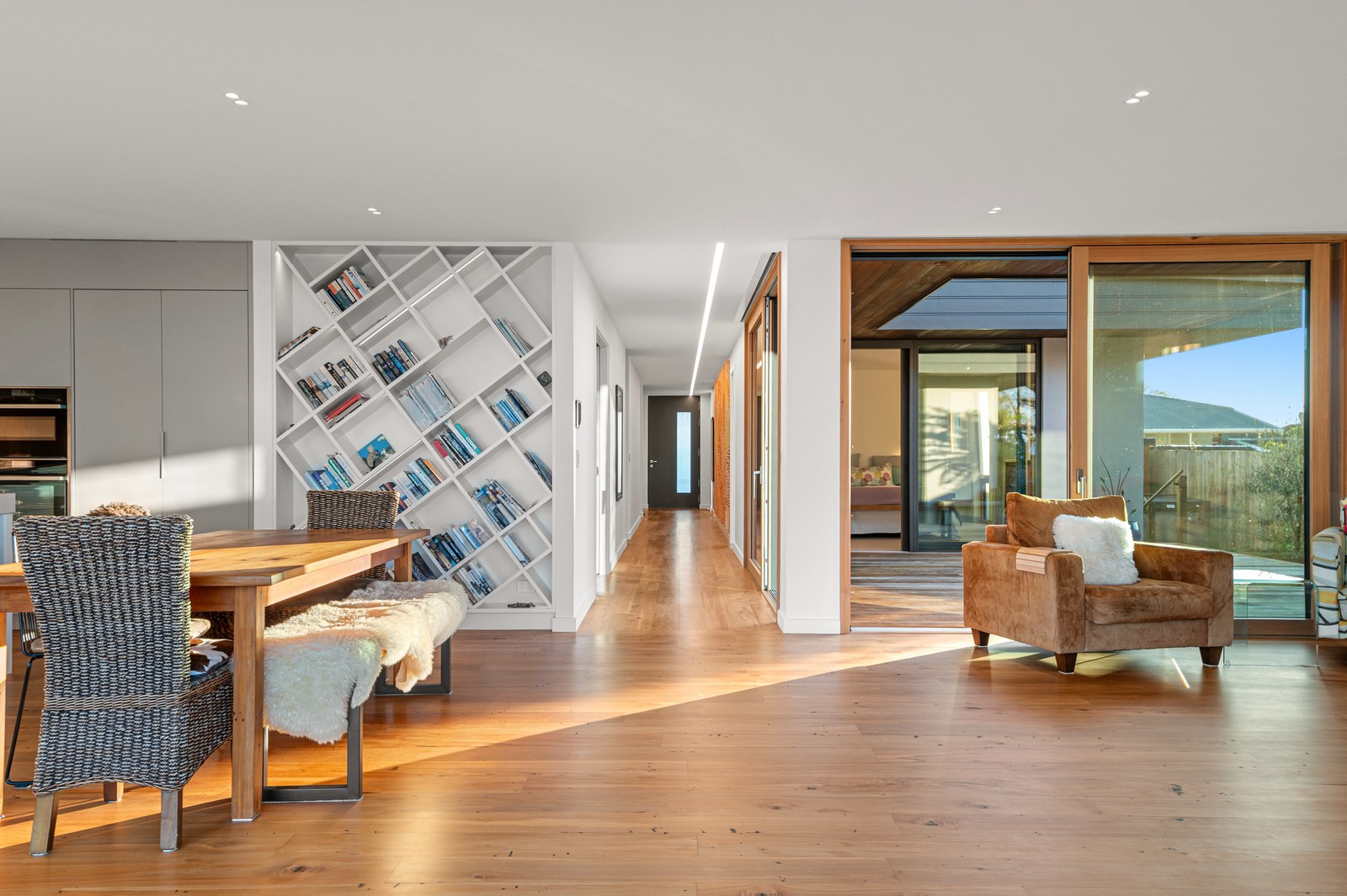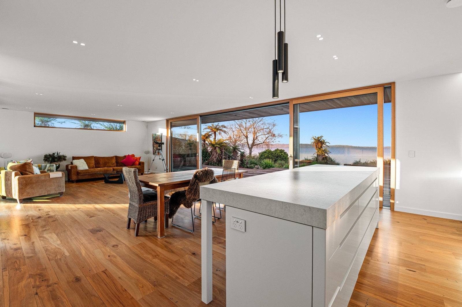 Inside, the design is contemporary and inviting. Built-in bookshelves, a copper-toned splashback and natural finishes add depth and character. The main bedroom, which also opens to that view, becomes a front-row seat to watch the shifting light. Sustainability is built in, with eHaus Euro standard, airtight construction, heat-recovery ventilation and high-performance joinery. Solar capability and smart-home integration add future-proof functionality. With its resilient materials and enduring sense of place, this home offers year-round comfort and strong design credentials in an exceptional lakeside setting.