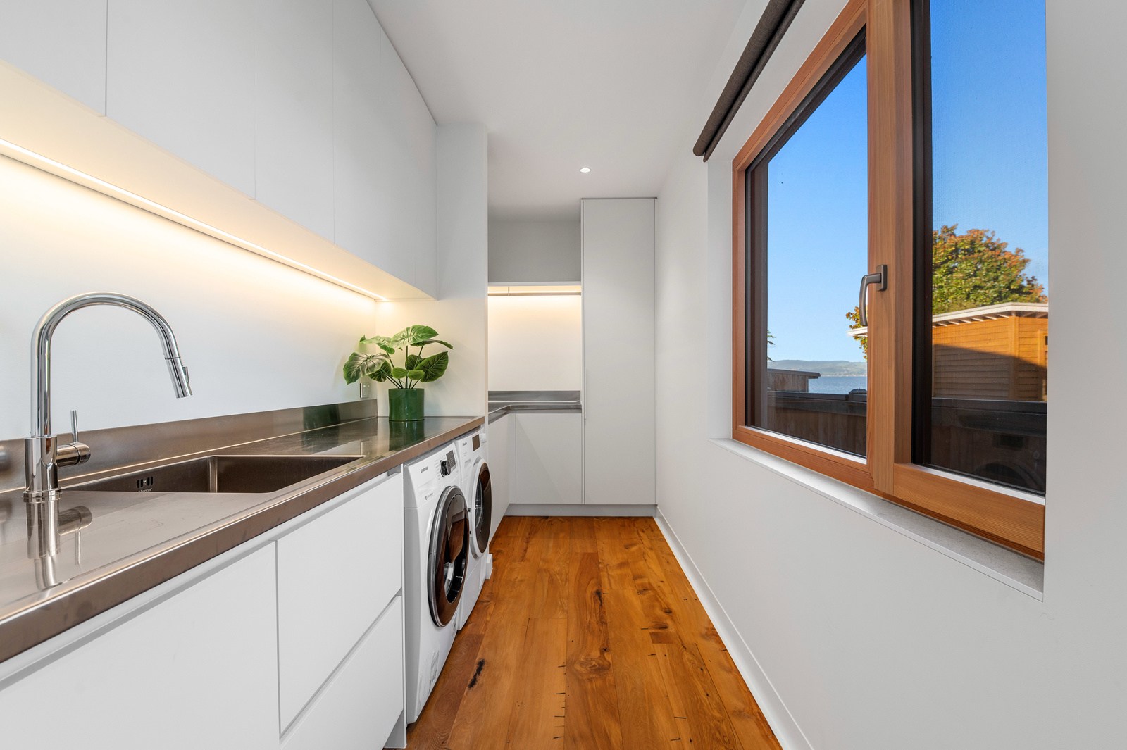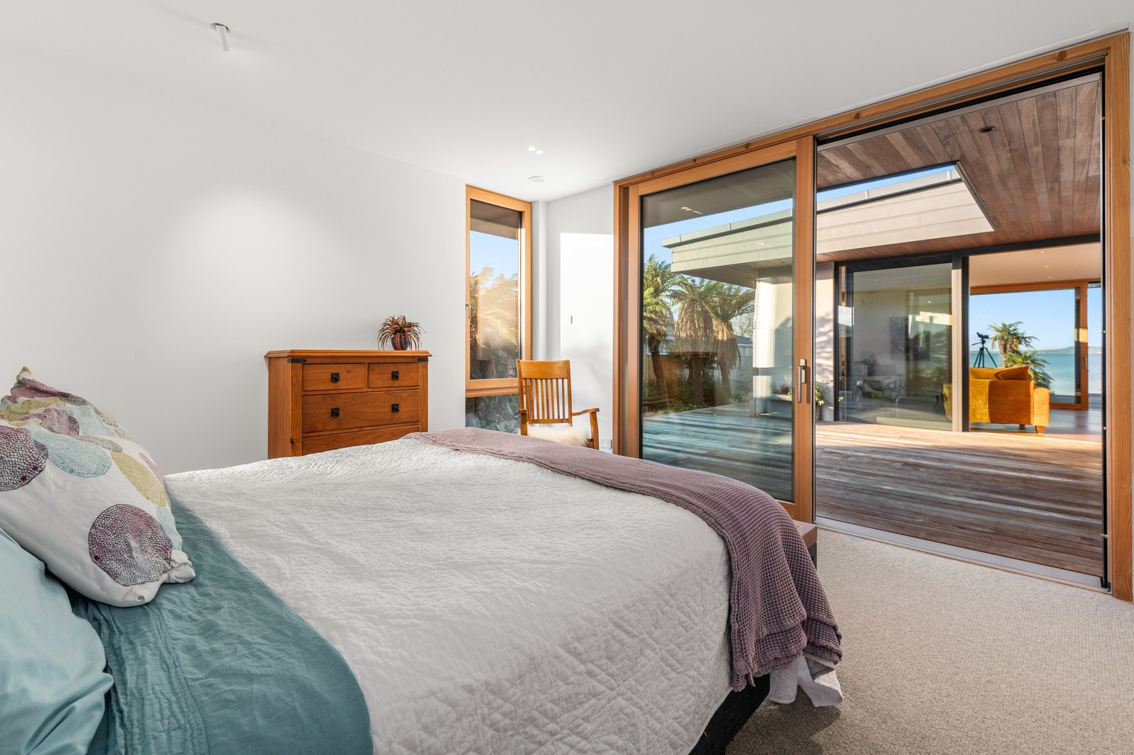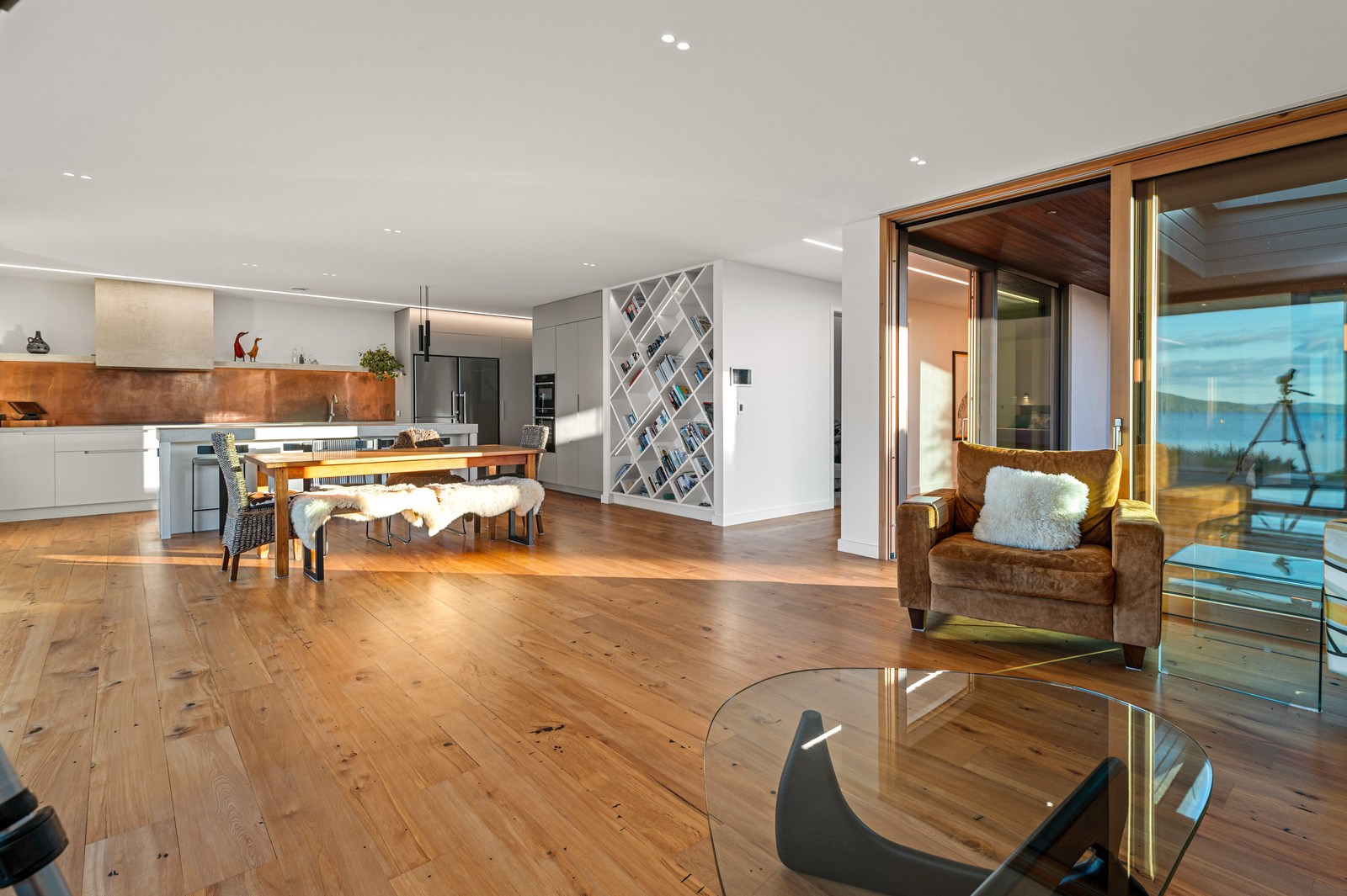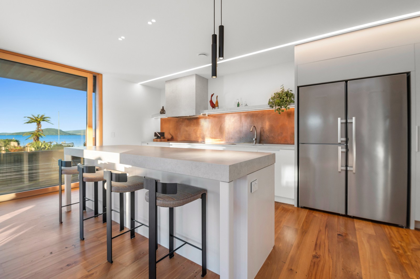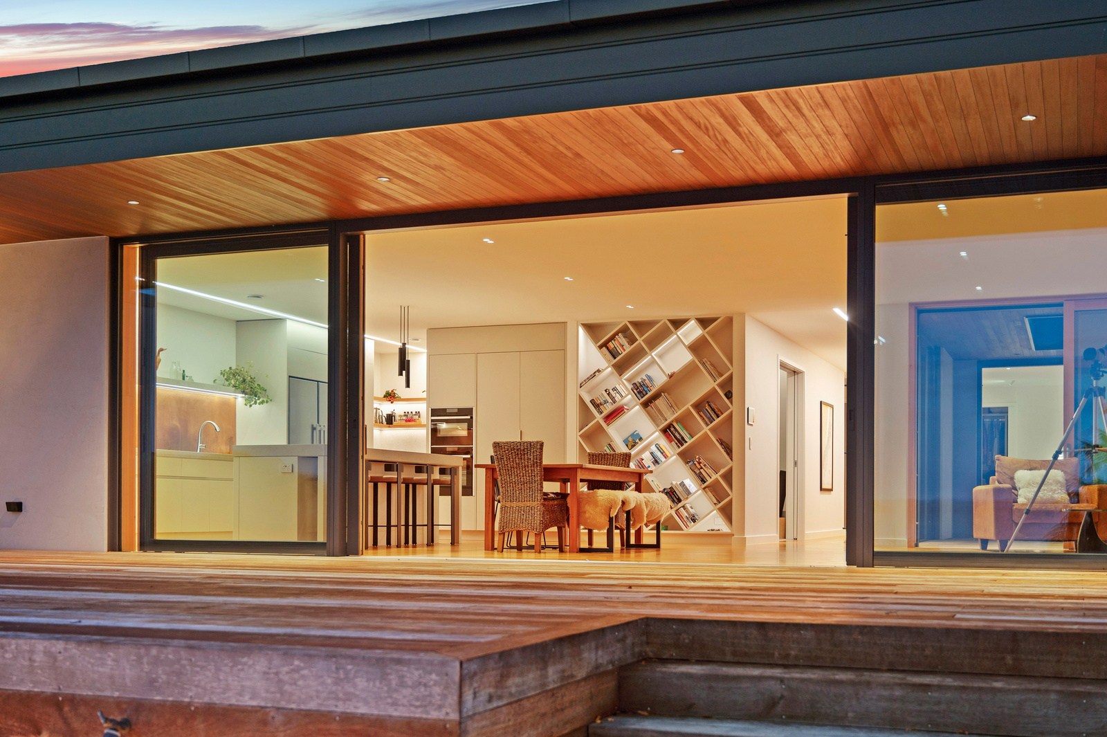 Inside, the design is contemporary and inviting. Built-in bookshelves, a copper-toned splashback and natural finishes add depth and character. The main bedroom, which also opens to that view, becomes a front-row seat to watch the shifting light. Sustainability is built in, with eHaus Euro standard, airtight construction, heat-recovery ventilation and high-performance joinery. Solar capability and smart-home integration add future-proof functionality. With its resilient materials and enduring sense of place, this home offers year-round comfort and strong design credentials in an exceptional lakeside setting.
