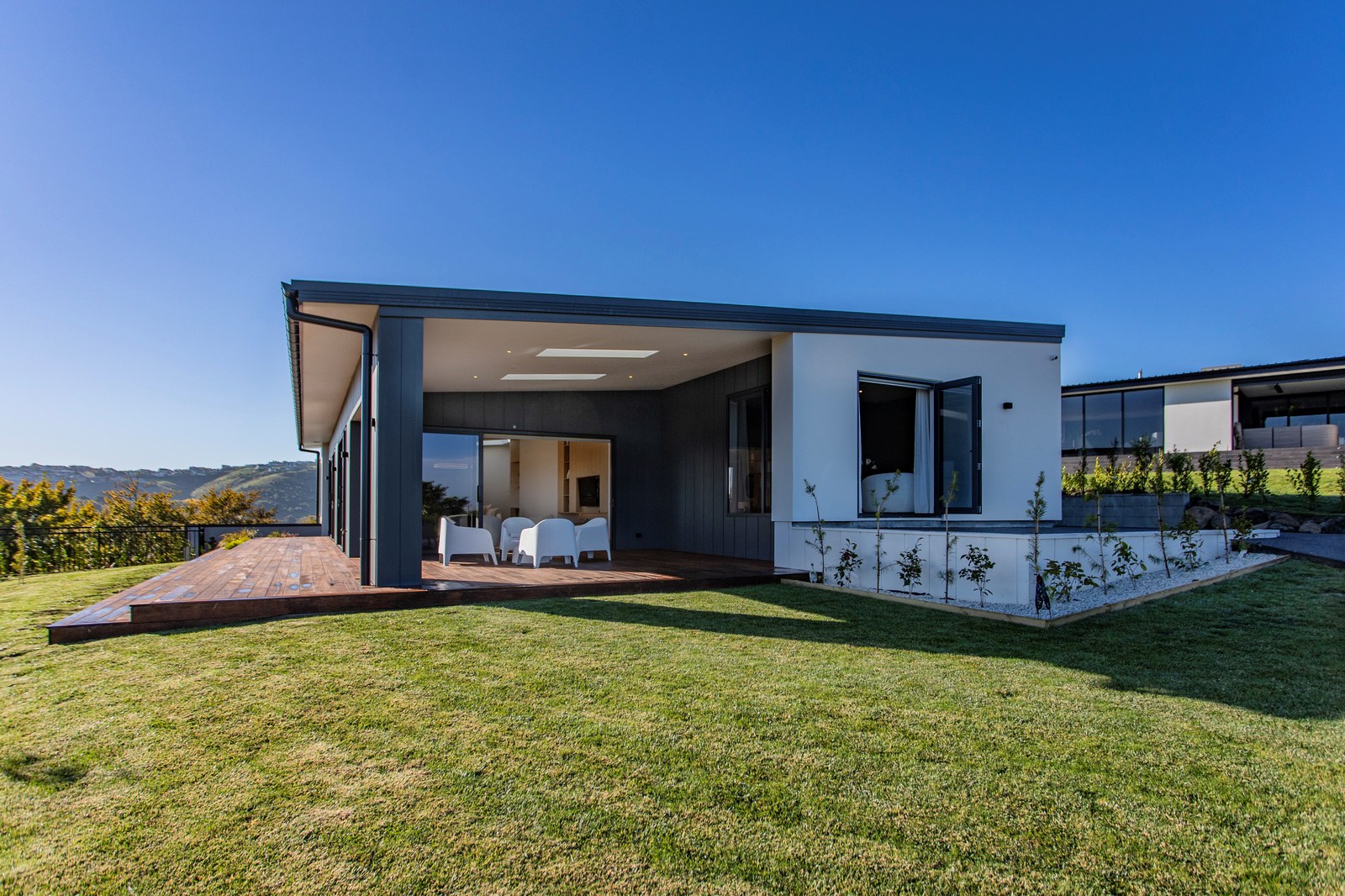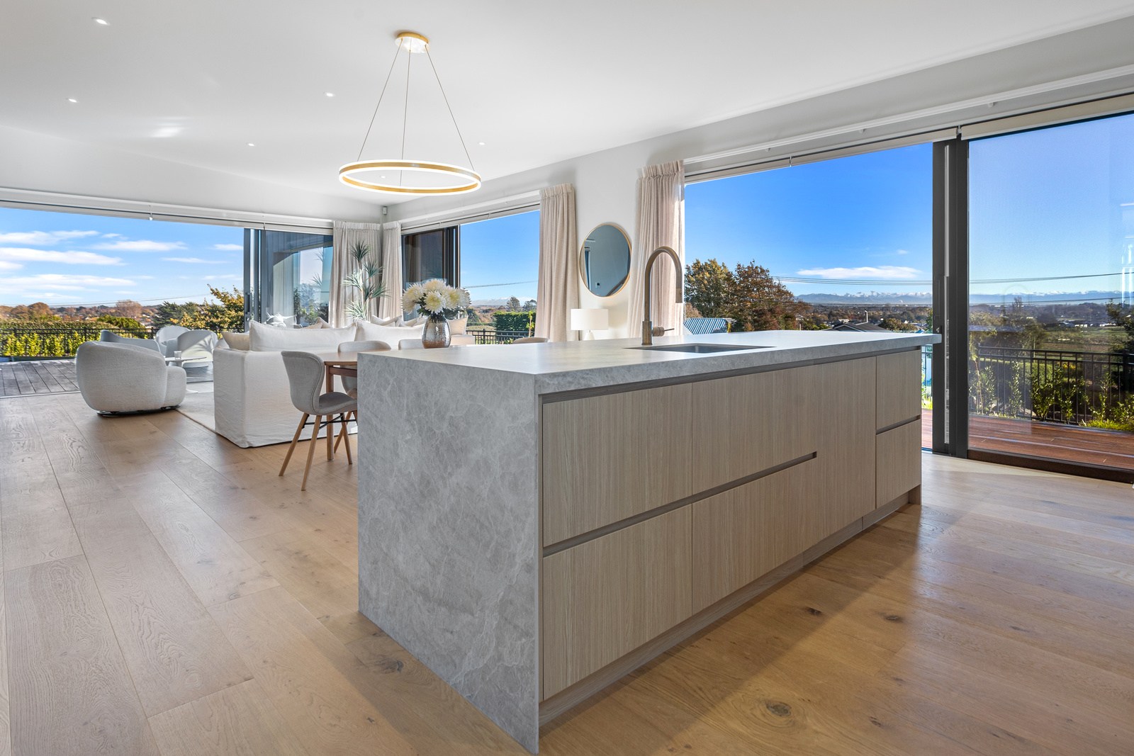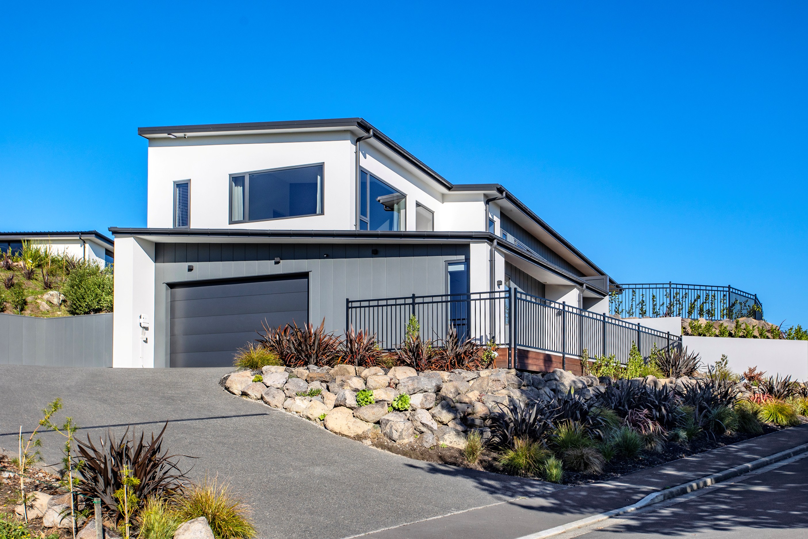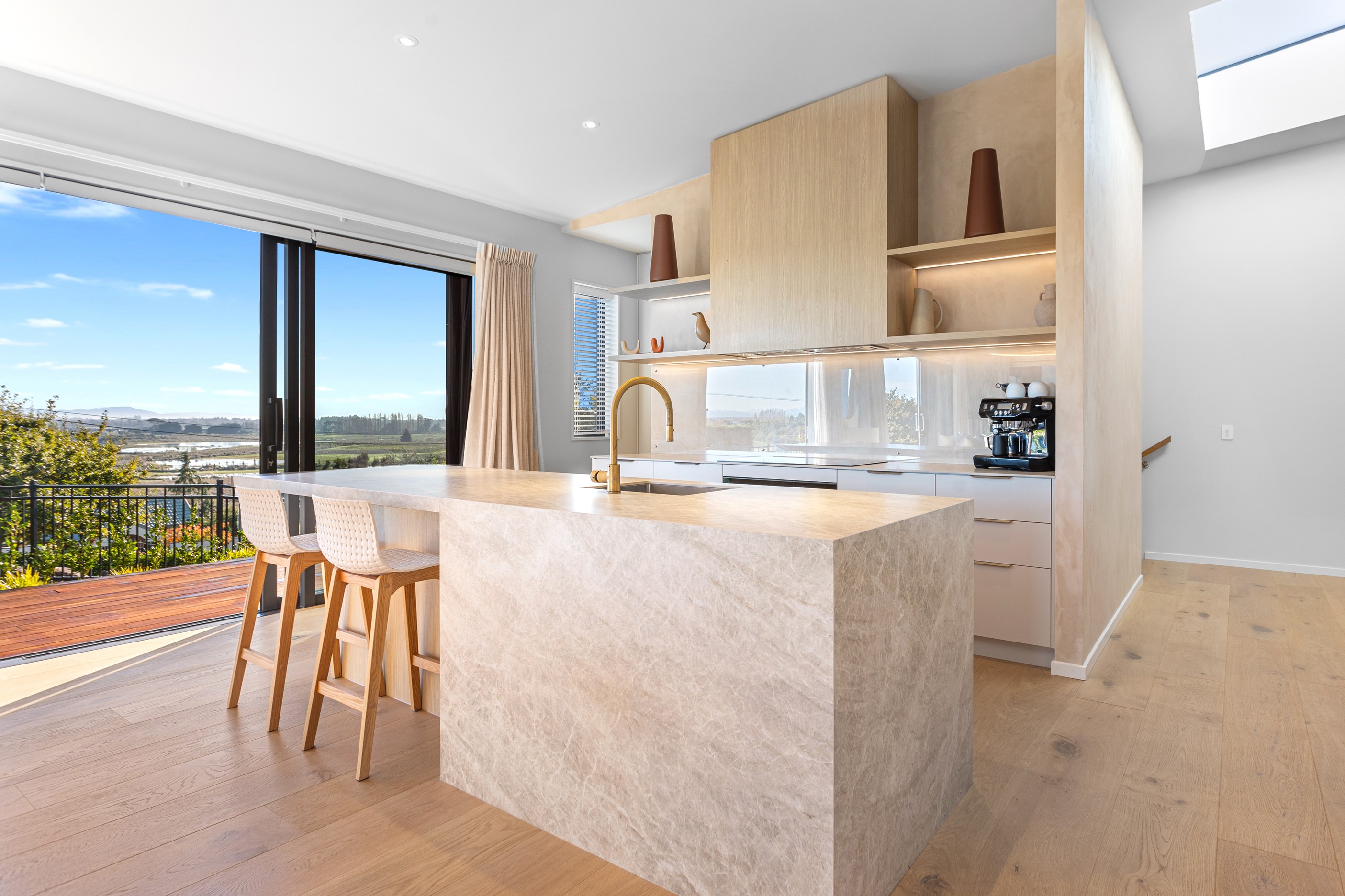 On a difficult site, chosen for its safe cul-de-sac location and breathtaking views of Te Kuru Wetlands and the Southern Alps, this fourbedroom, three-bathroom home is a refined balance of function and elegance. Careful excavation, including the removal of a significant amount of rock, was required to transform the sloping 1776sqm section into a workable foundation that now provides ample space for both children and adults to play in this private paradise. The well-considered 332sqm floorplan places living and entertaining at the heart of family life.