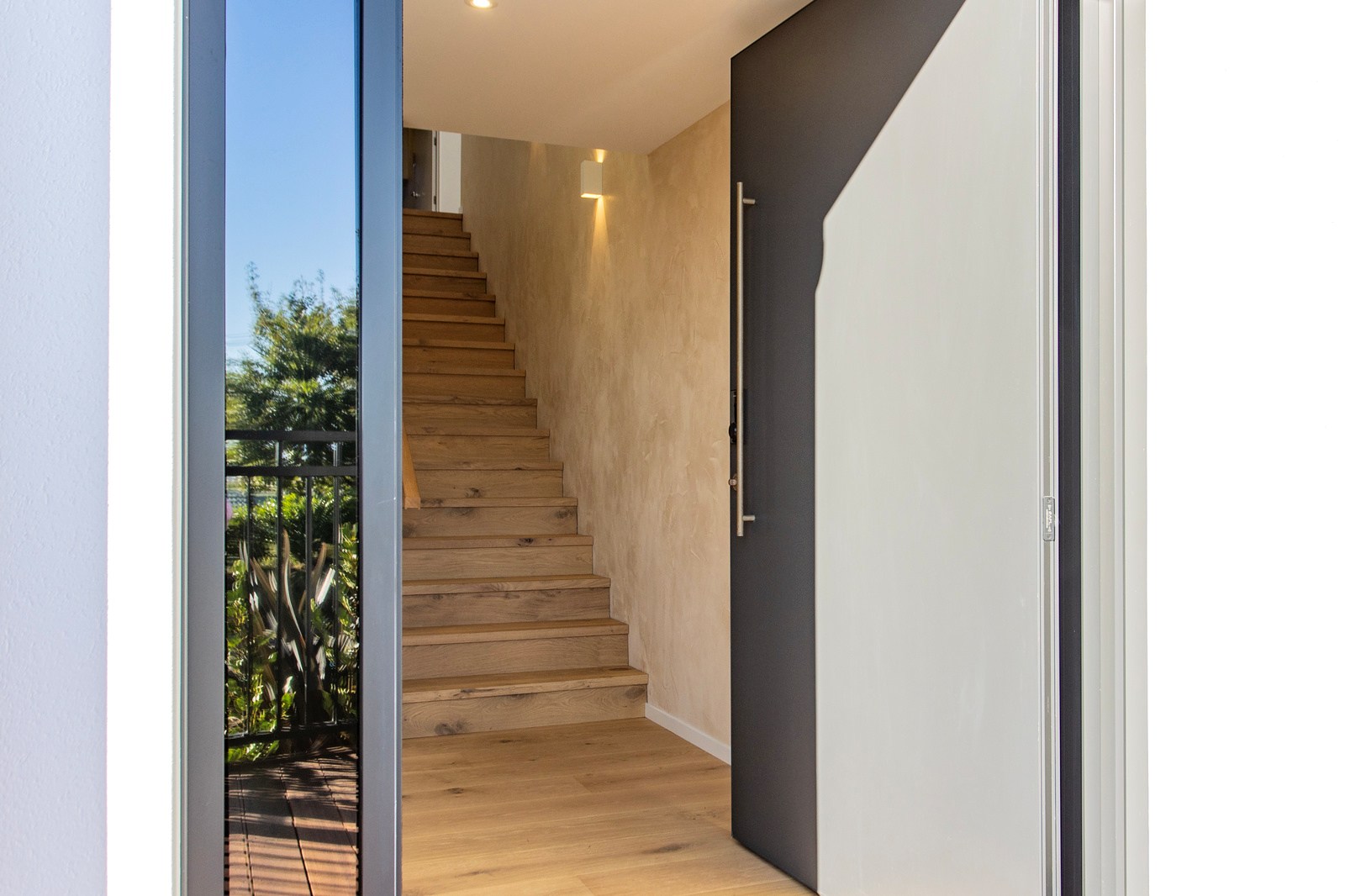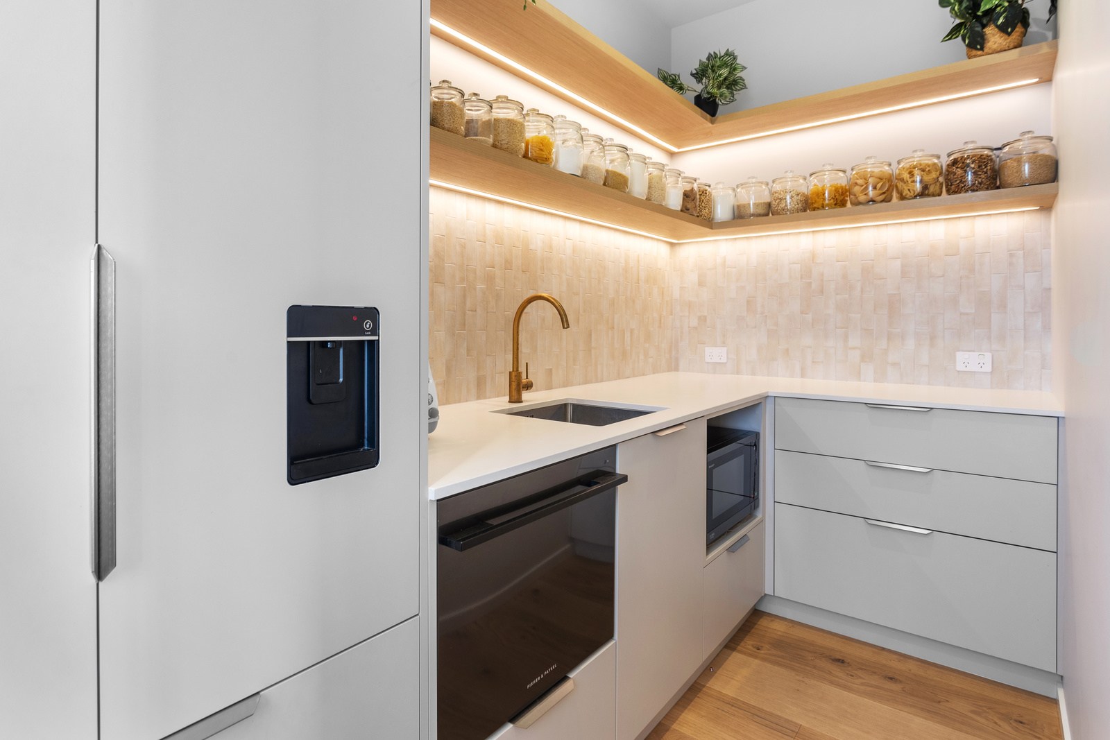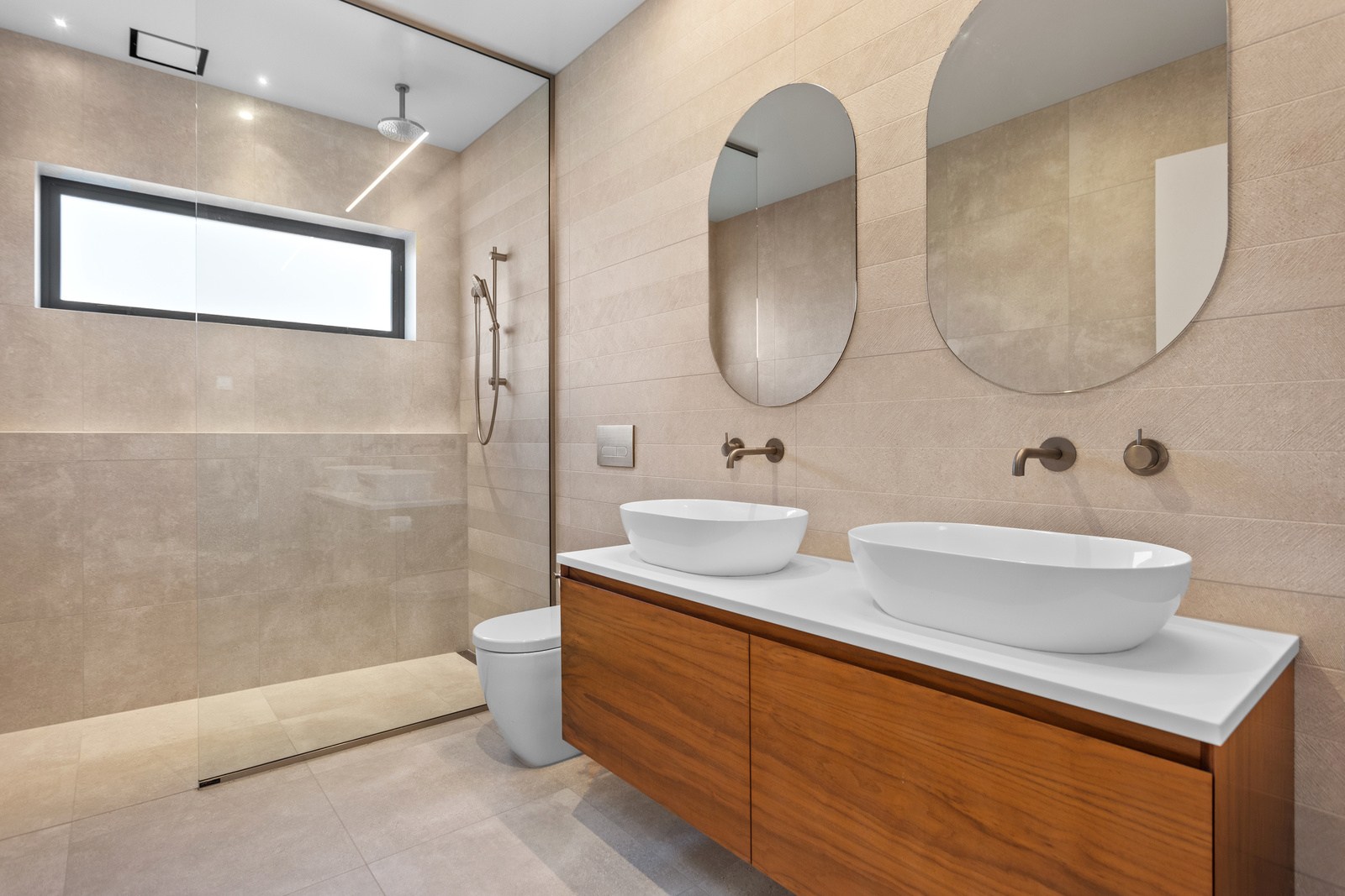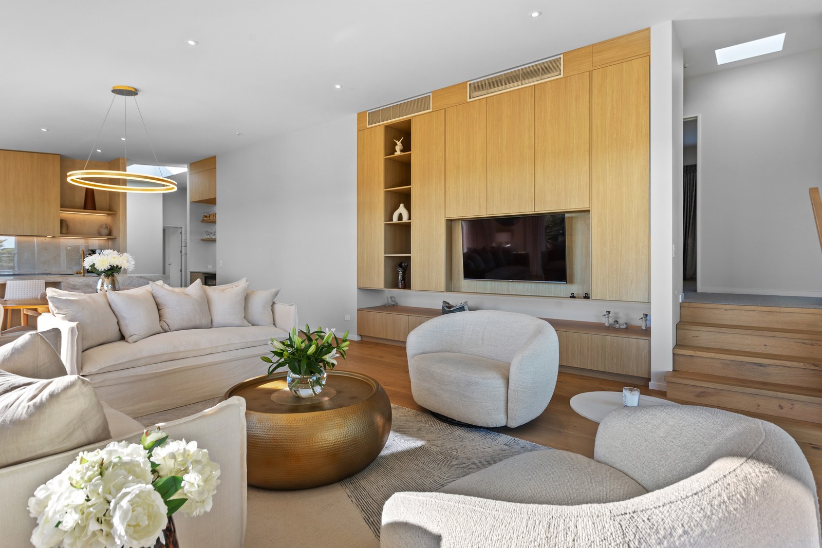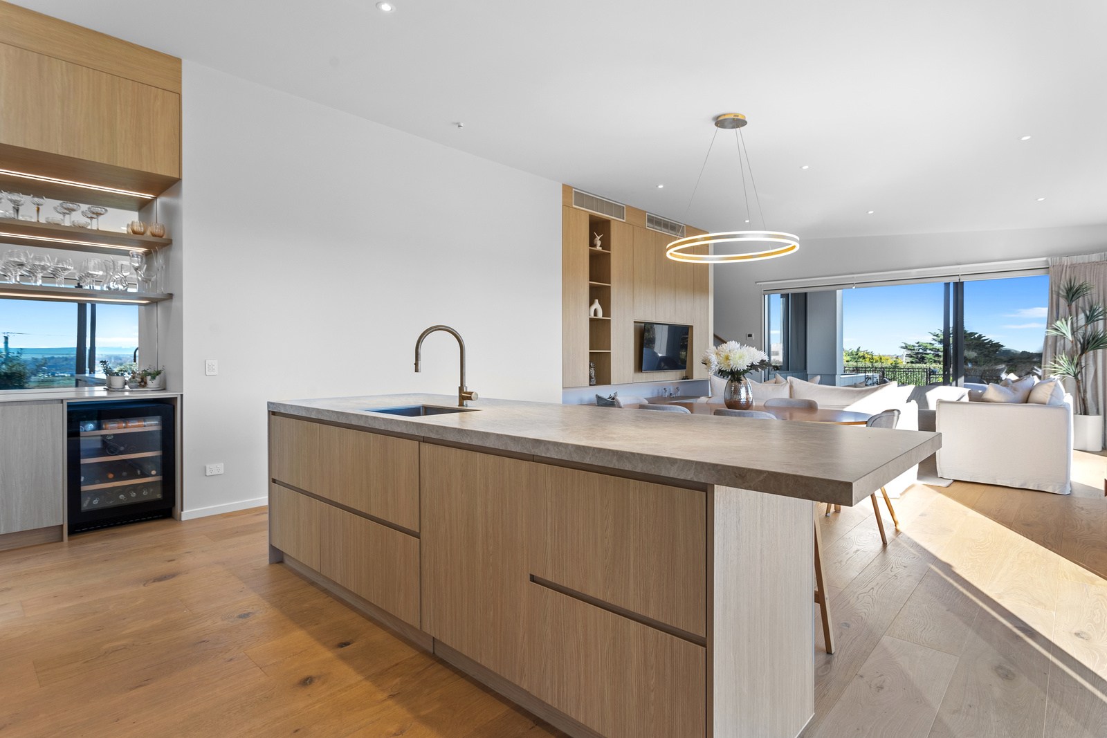 The central kitchen, with its porcelain benchtops and sleek fixtures, connects seamlessly with dining and lounge areas. Flow continues with multiple living spaces across both levels, including a generous office that caters to modern work-from-home lifestyles. Natural textures and earthy tones ground the home in its surroundings. Exterior cladding provides a timeless façade, while interior finishes create a cohesive and calming environment. While the site’s steep gradient presented early challenges, the resulting design turns these into strengths — elevating the home for sweeping views and sun-soaked interiors. Despite the complexities of building on sloping terrain, the result is a home that feels effortlessly grounded in its environment.