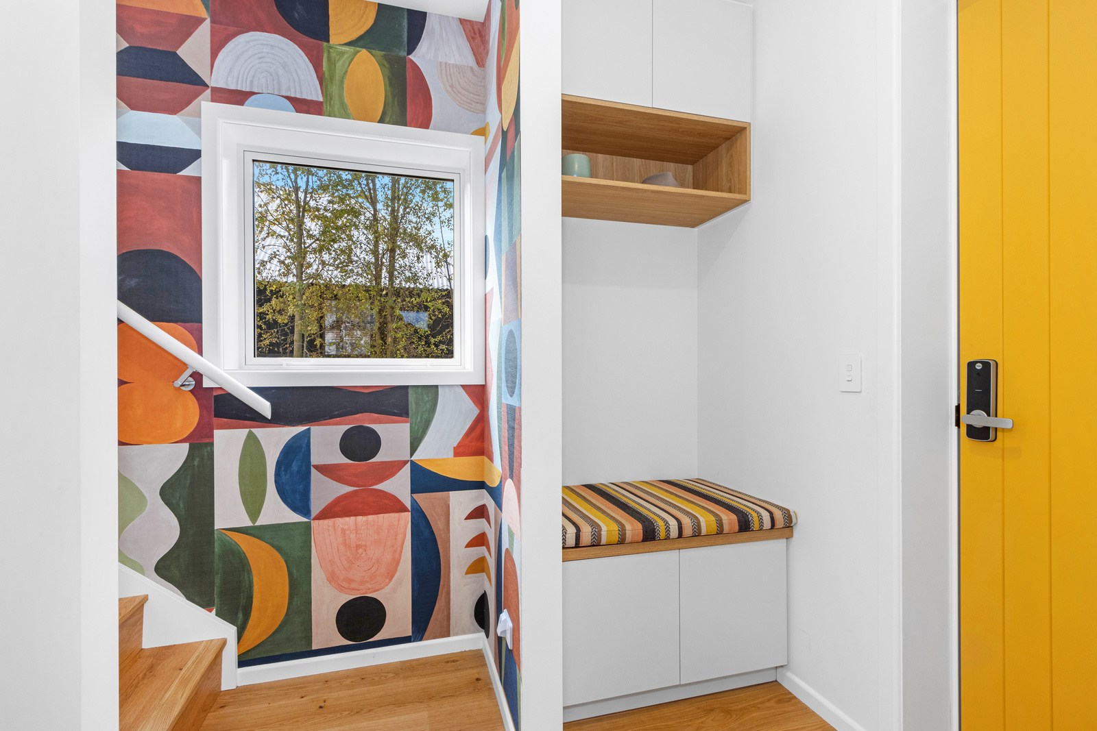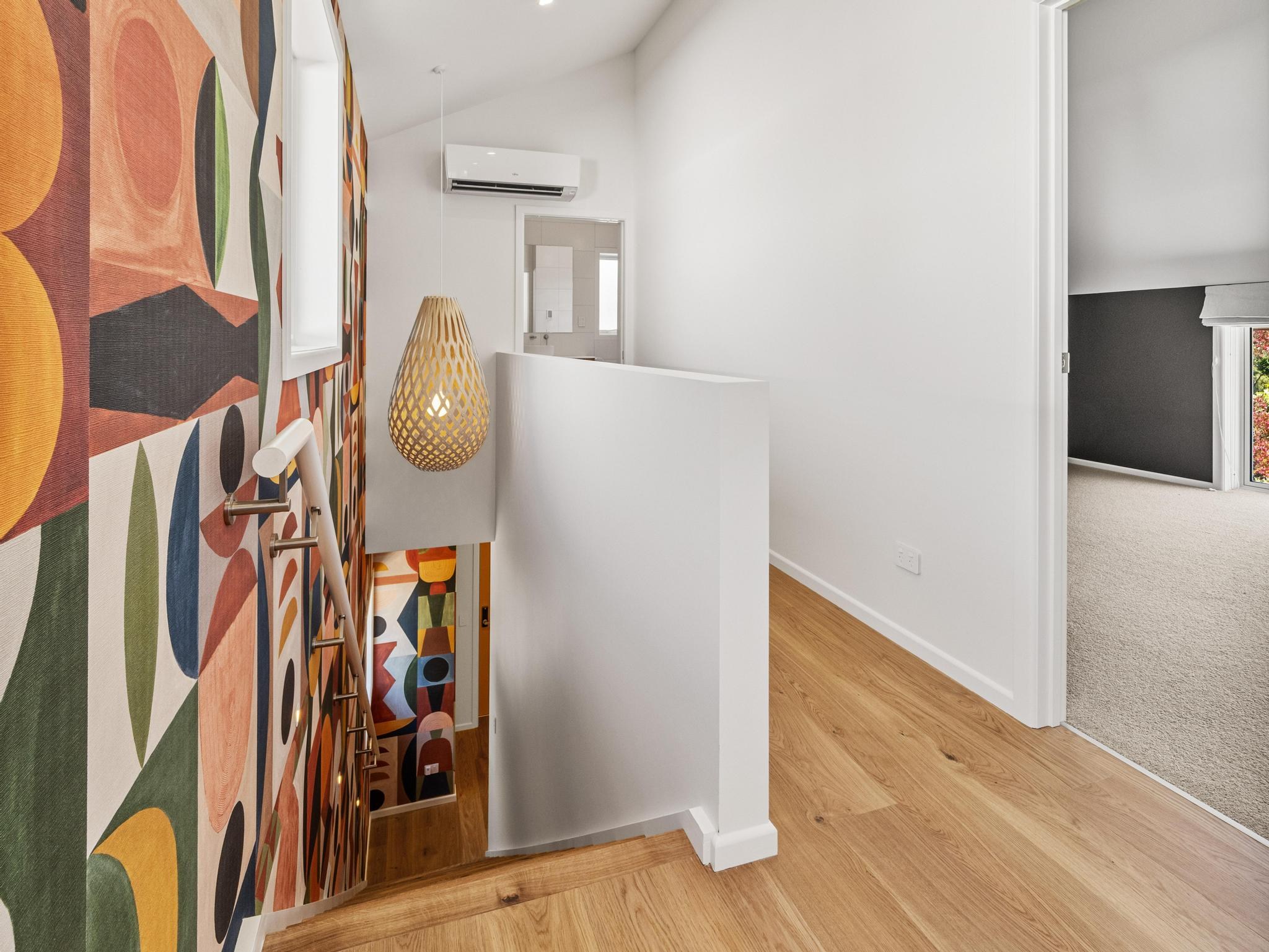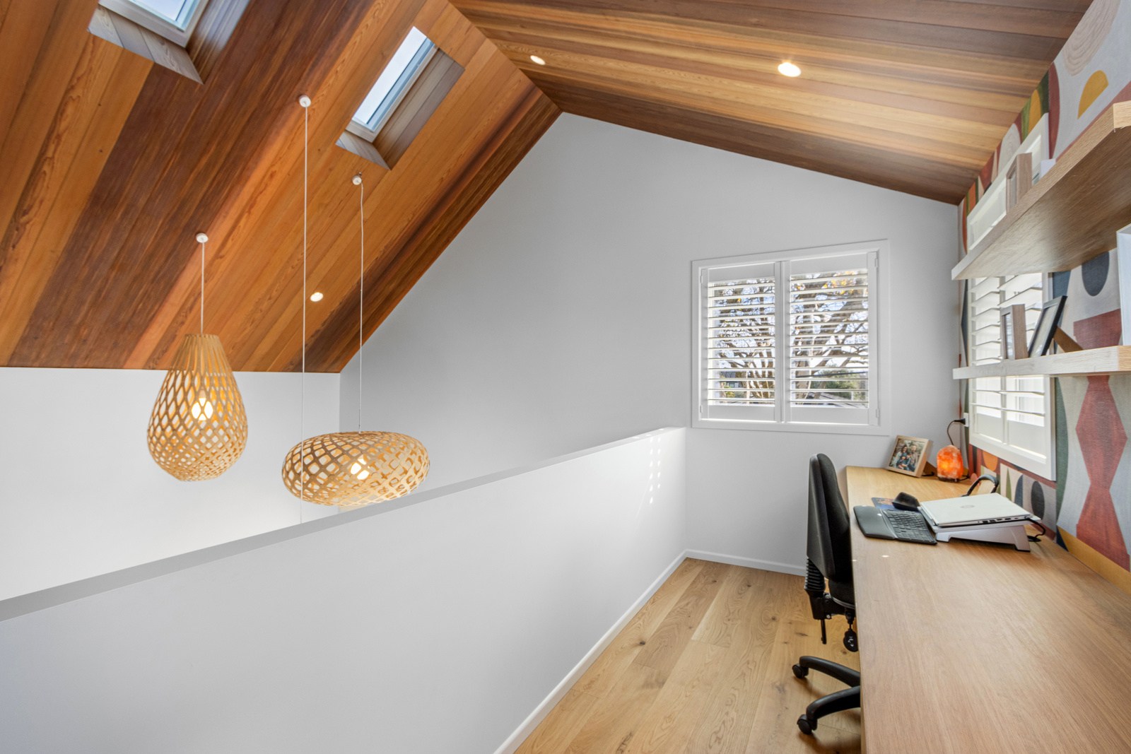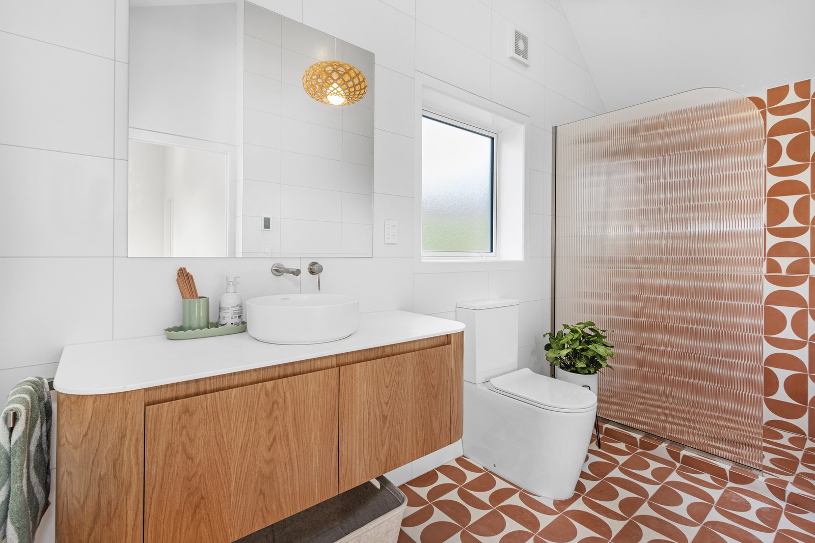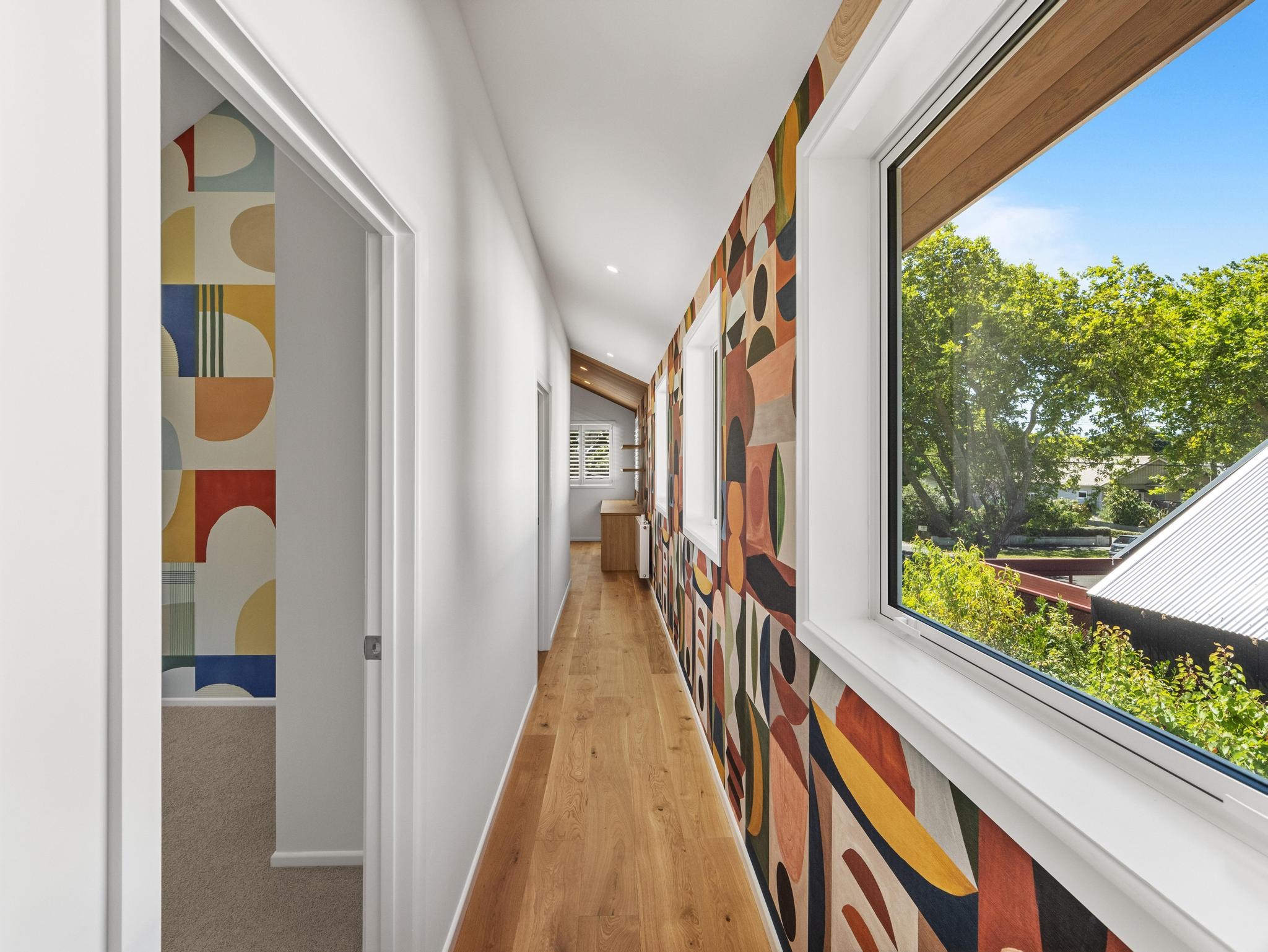 Step inside to see a white-and-wood interior where detail is king. Each space has been carefully curated and given its own personality. On the ground floor, the main living area features a soaring ceiling lined with cedar, a kitchen with blue finger-tiles and a trio of tangerine light shades hovering over the dining table. The main bedroom has lime-washed walls and a timber-panel feature wall. The stairwell is a showstopper. Bold geometric wallpaper leads residents up the staircase along the hall and into rooms that sing with colour — rust coloured tiles, blue and slate-grey feature walls and another geometric-patterned multi-coloured wallpaper. Overhead, timber ceilings add warmth and texture; skylights flood the areas with natural light. Up here you’ll find two more bedrooms, a second living room, another bathroom and a study. This house is a template for how to do striking and sophisticated in one skilfully built design.