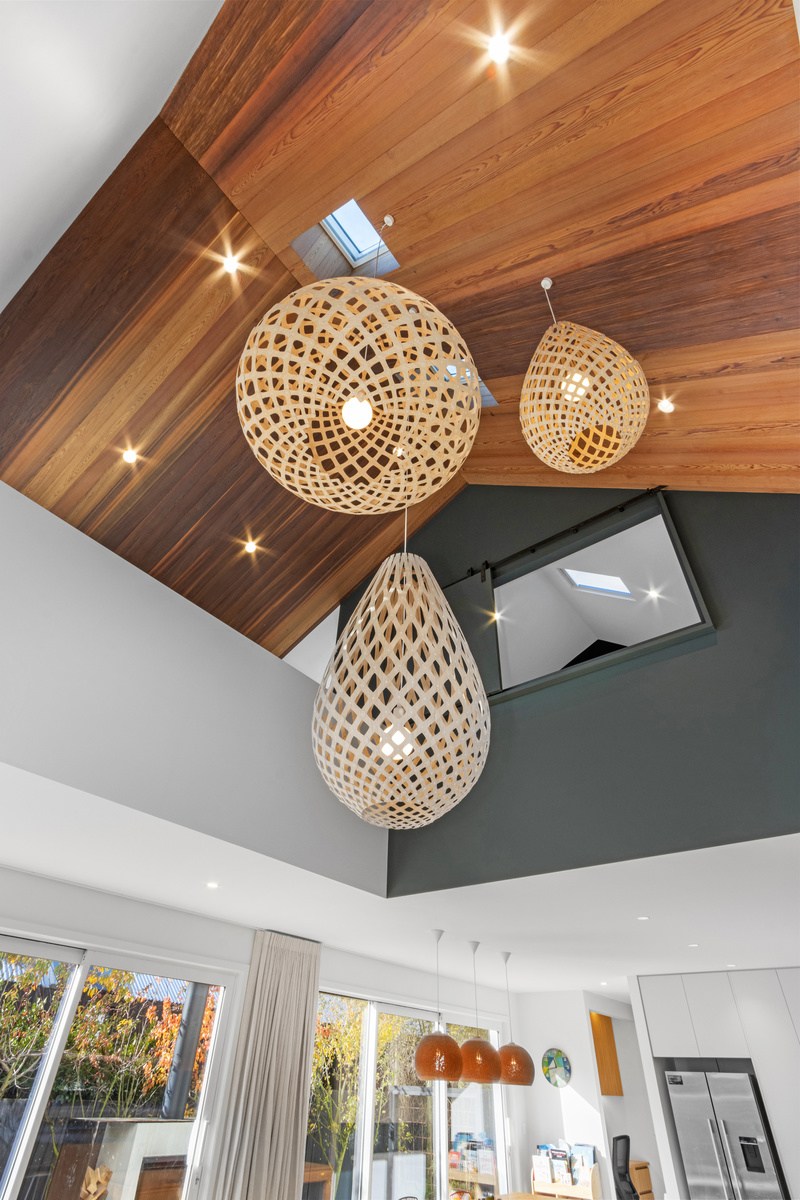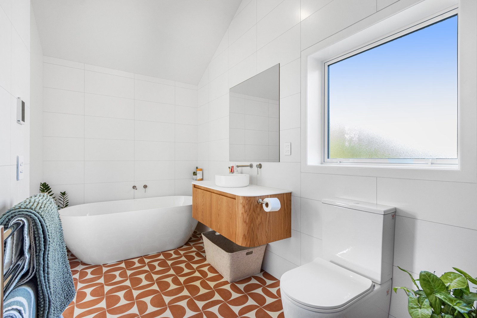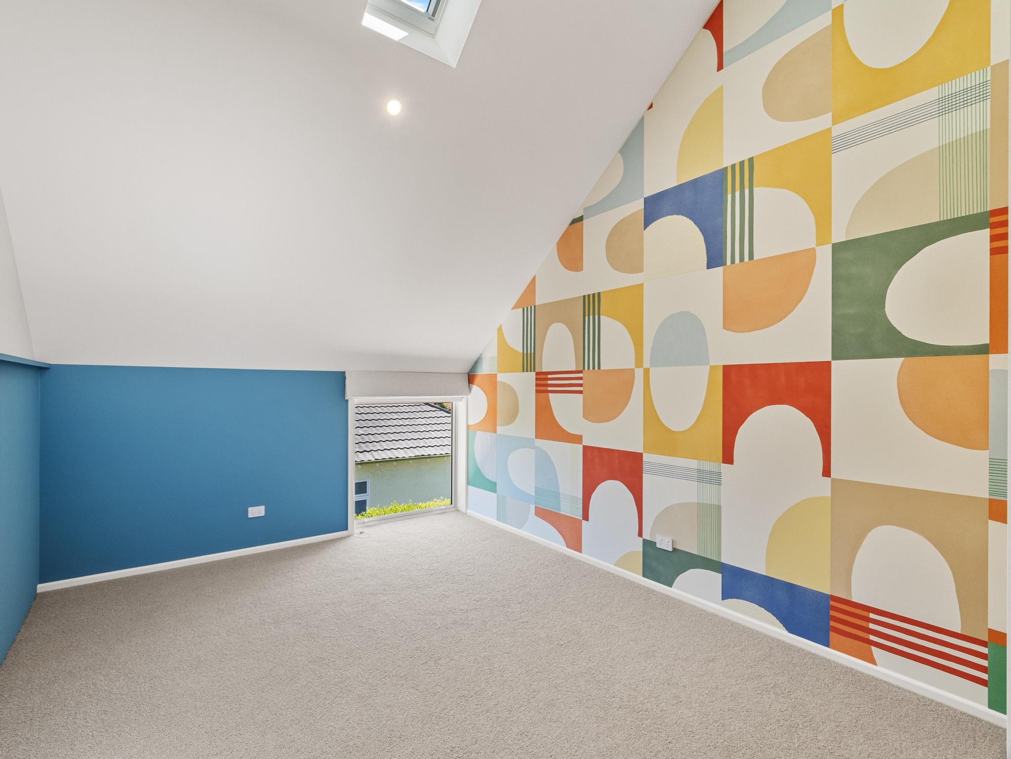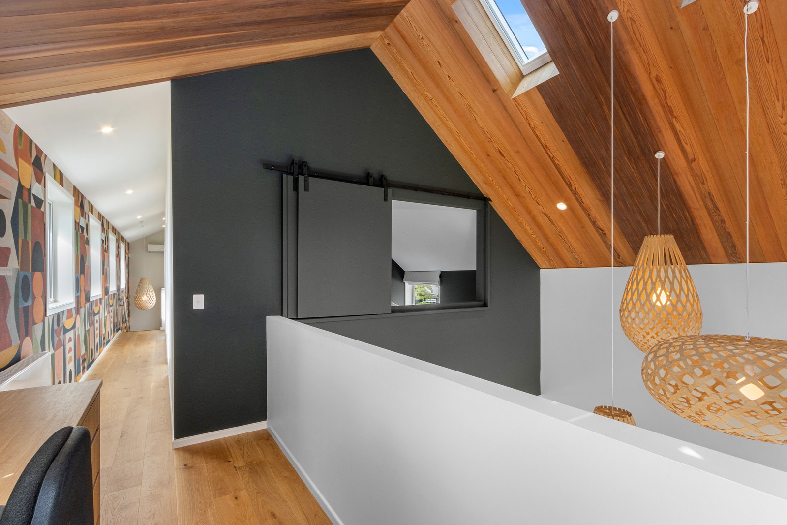 Step inside to see a white-and-wood interior where detail is king. Each space has been carefully curated and given its own personality. On the ground floor, the main living area features a soaring ceiling lined with cedar, a kitchen with blue finger-tiles and a trio of tangerine light shades hovering over the dining table. The main bedroom has lime-washed walls and a timber-panel feature wall. The stairwell is a showstopper. Bold geometric wallpaper leads residents up the staircase along the hall and into rooms that sing with colour — rust coloured tiles, blue and slate-grey feature walls and another geometric-patterned multi-coloured wallpaper. Overhead, timber ceilings add warmth and texture; skylights flood the areas with natural light. Up here you’ll find two more bedrooms, a second living room, another bathroom and a study. This house is a template for how to do striking and sophisticated in one skilfully built design.