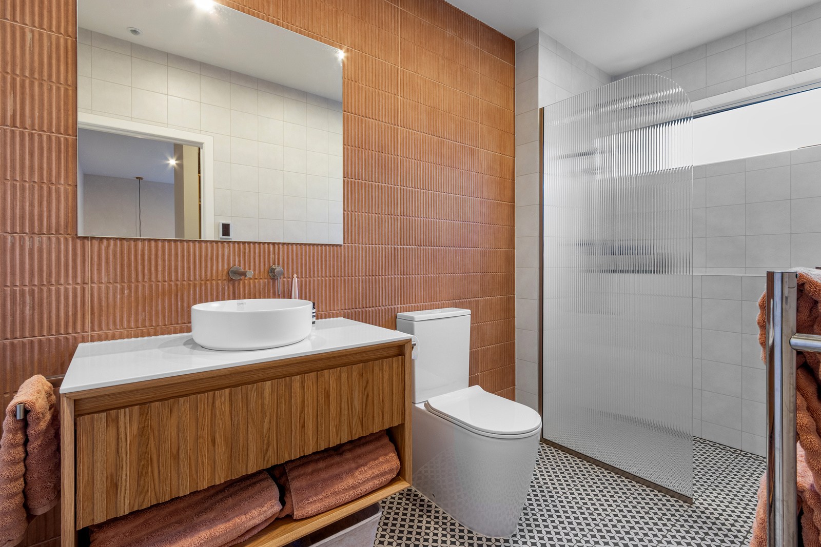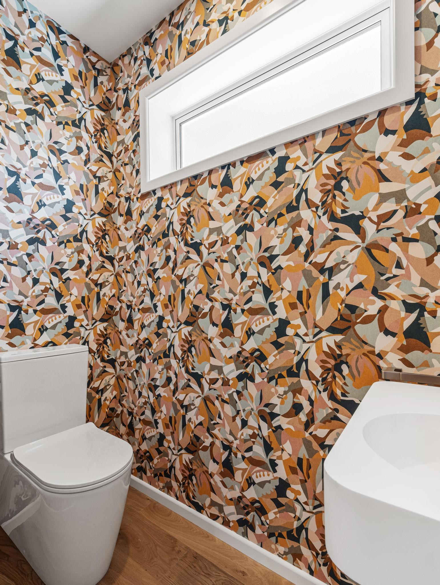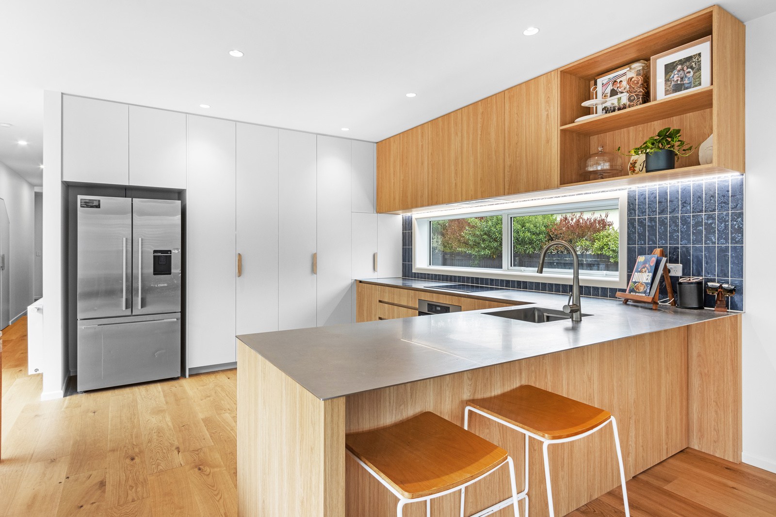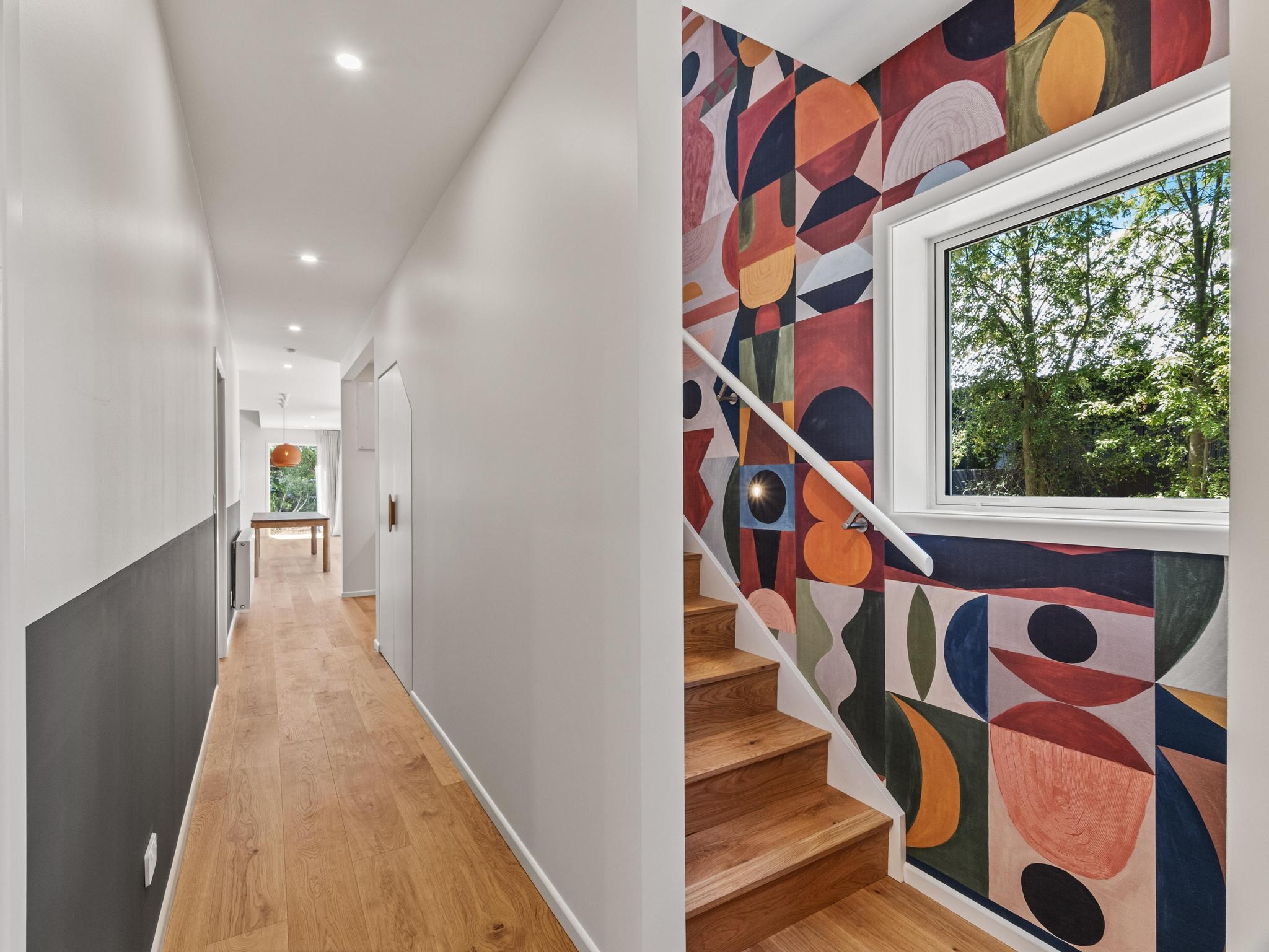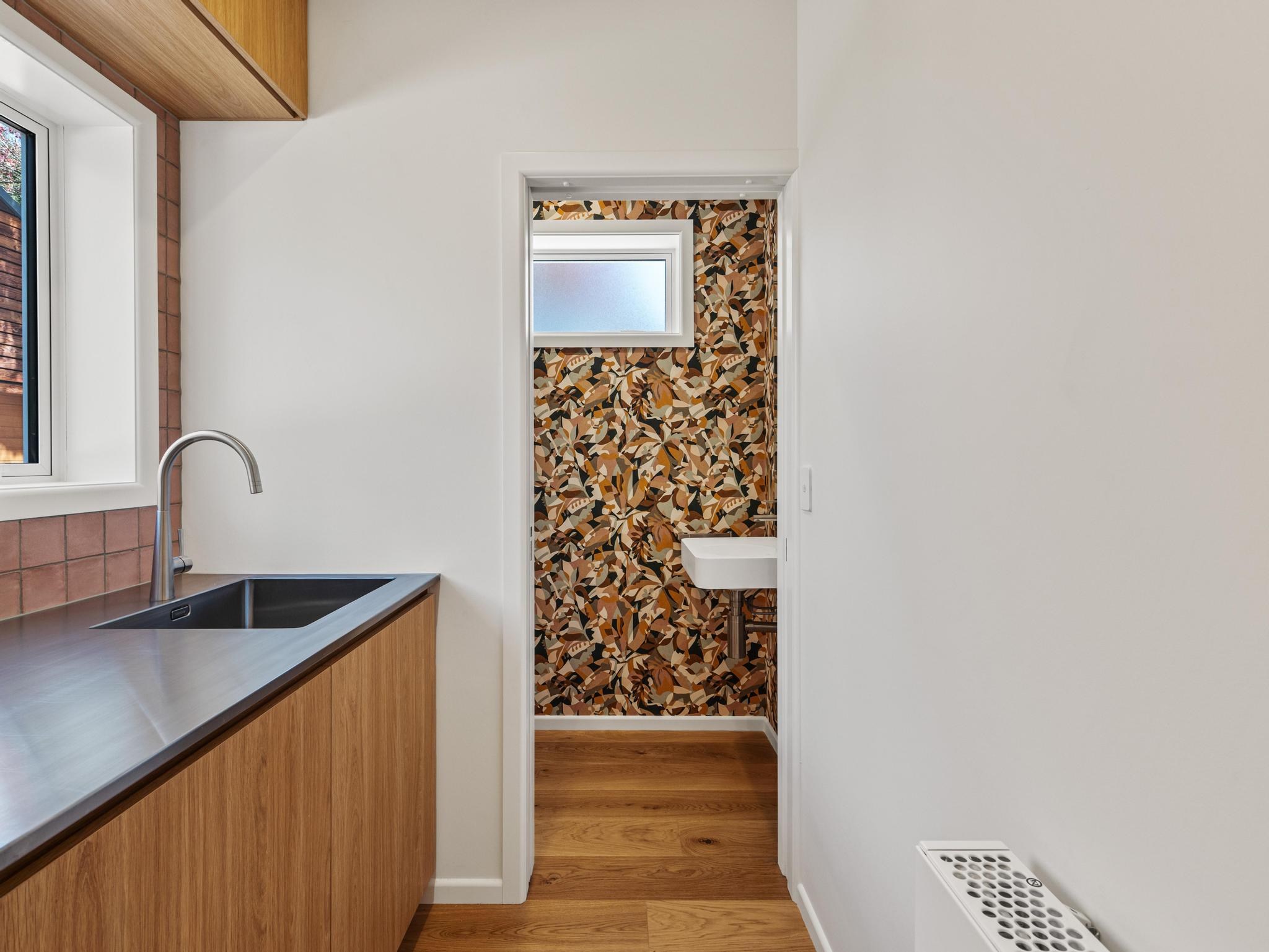 Step inside to see a white-and-wood interior where detail is king. Each space has been carefully curated and given its own personality. On the ground floor, the main living area features a soaring ceiling lined with cedar, a kitchen with blue finger-tiles and a trio of tangerine light shades hovering over the dining table. The main bedroom has lime-washed walls and a timber-panel feature wall. The stairwell is a showstopper. Bold geometric wallpaper leads residents up the staircase along the hall and into rooms that sing with colour — rust coloured tiles, blue and slate-grey feature walls and another geometric-patterned multi-coloured wallpaper. Overhead, timber ceilings add warmth and texture; skylights flood the areas with natural light. Up here you’ll find two more bedrooms, a second living room, another bathroom and a study. This house is a template for how to do striking and sophisticated in one skilfully built design.
