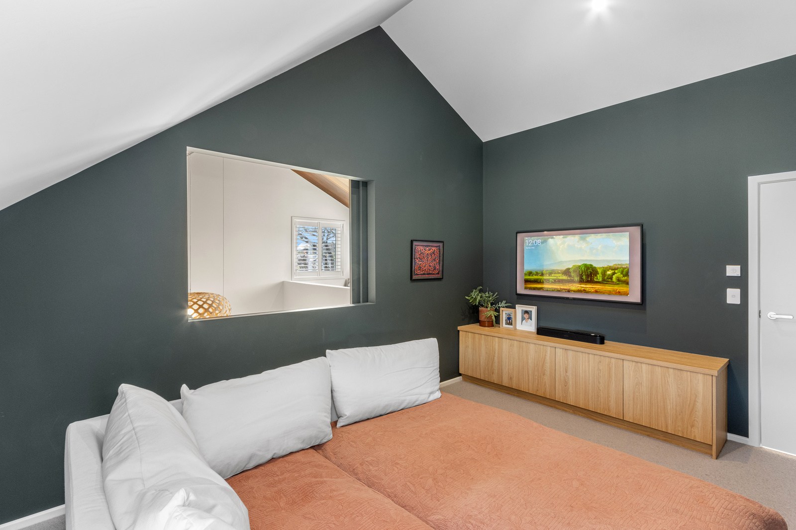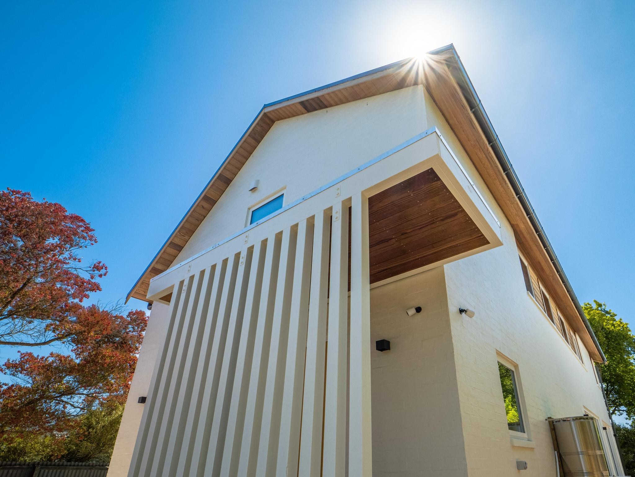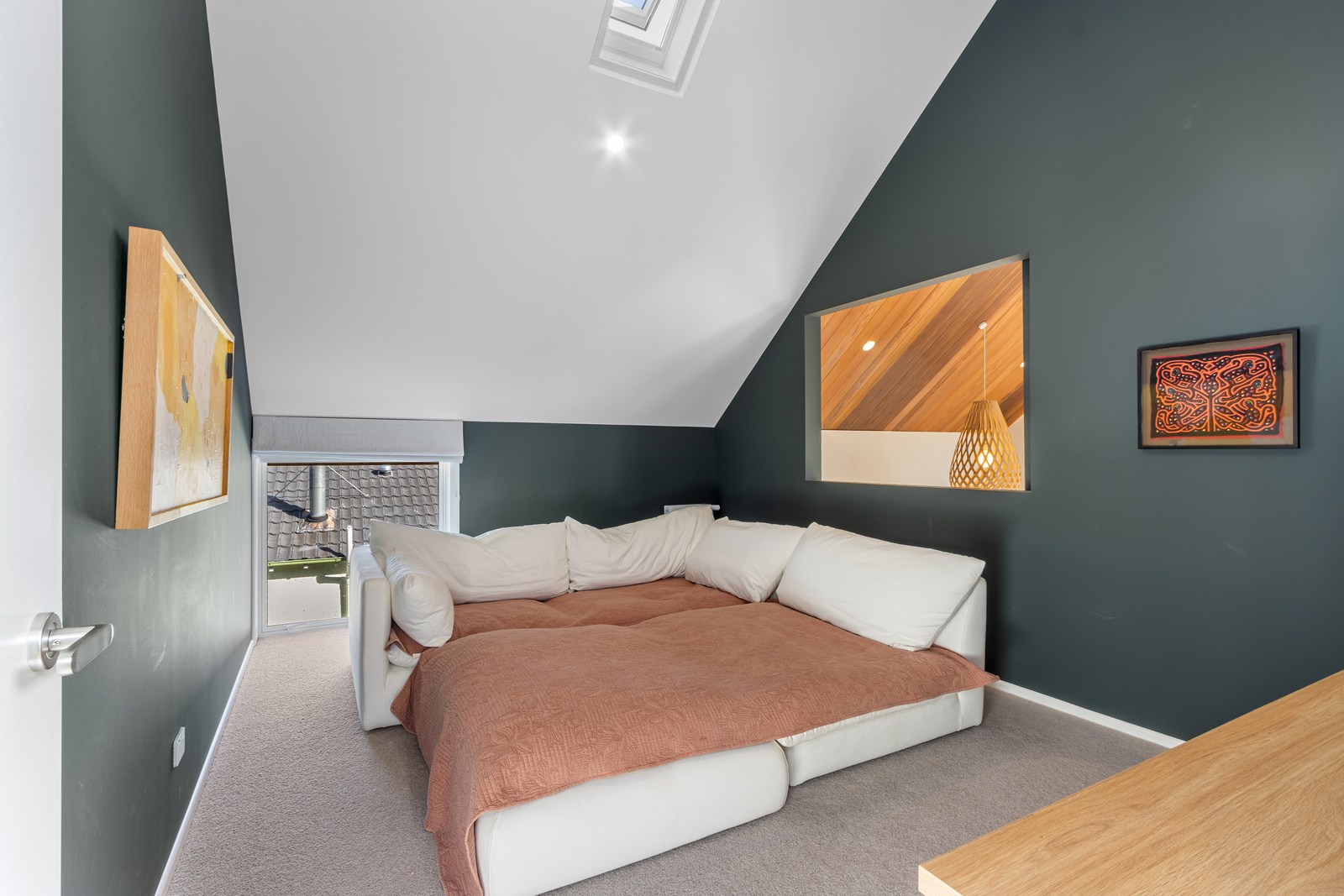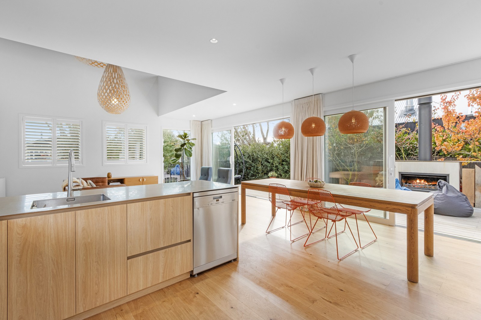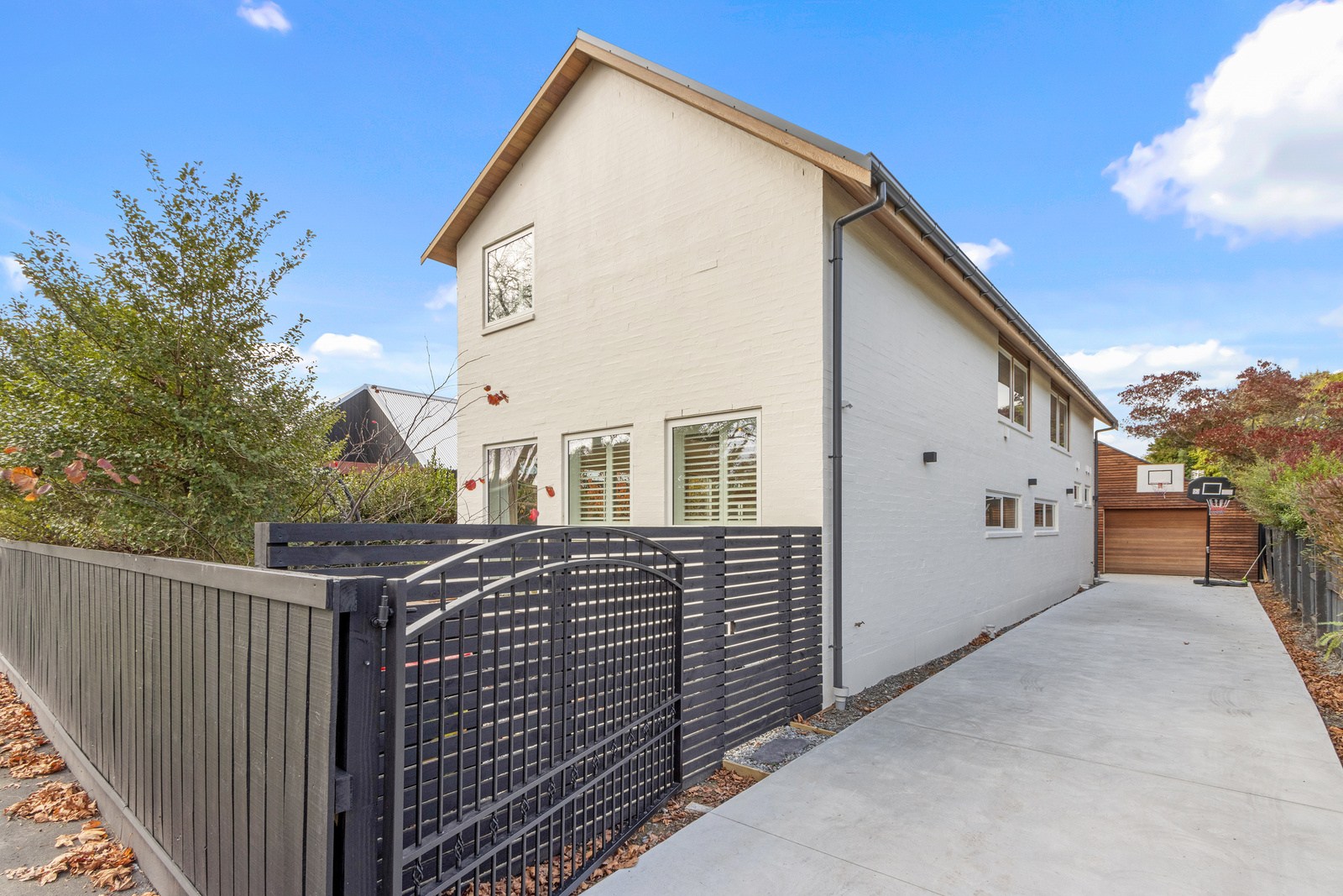 Step inside to see a white-and-wood interior where detail is king. Each space has been carefully curated and given its own personality. On the ground floor, the main living area features a soaring ceiling lined with cedar, a kitchen with blue finger-tiles and a trio of tangerine light shades hovering over the dining table. The main bedroom has lime-washed walls and a timber-panel feature wall. The stairwell is a showstopper. Bold geometric wallpaper leads residents up the staircase along the hall and into rooms that sing with colour — rust coloured tiles, blue and slate-grey feature walls and another geometric-patterned multi-coloured wallpaper. Overhead, timber ceilings add warmth and texture; skylights flood the areas with natural light. Up here you’ll find two more bedrooms, a second living room, another bathroom and a study. This house is a template for how to do striking and sophisticated in one skilfully built design.